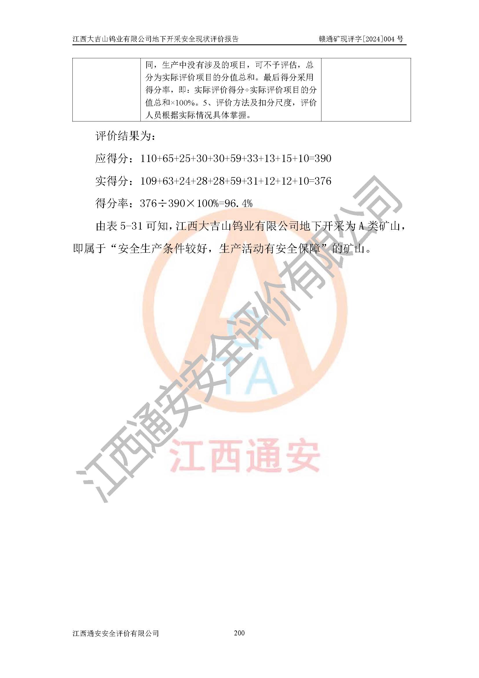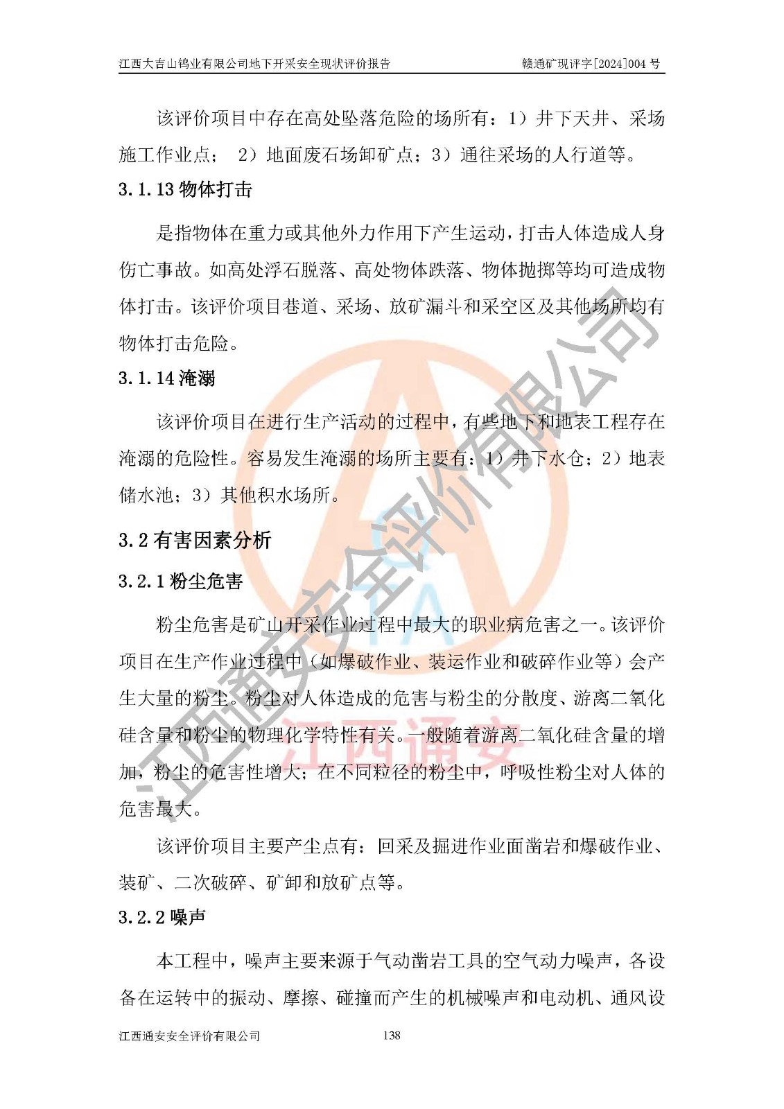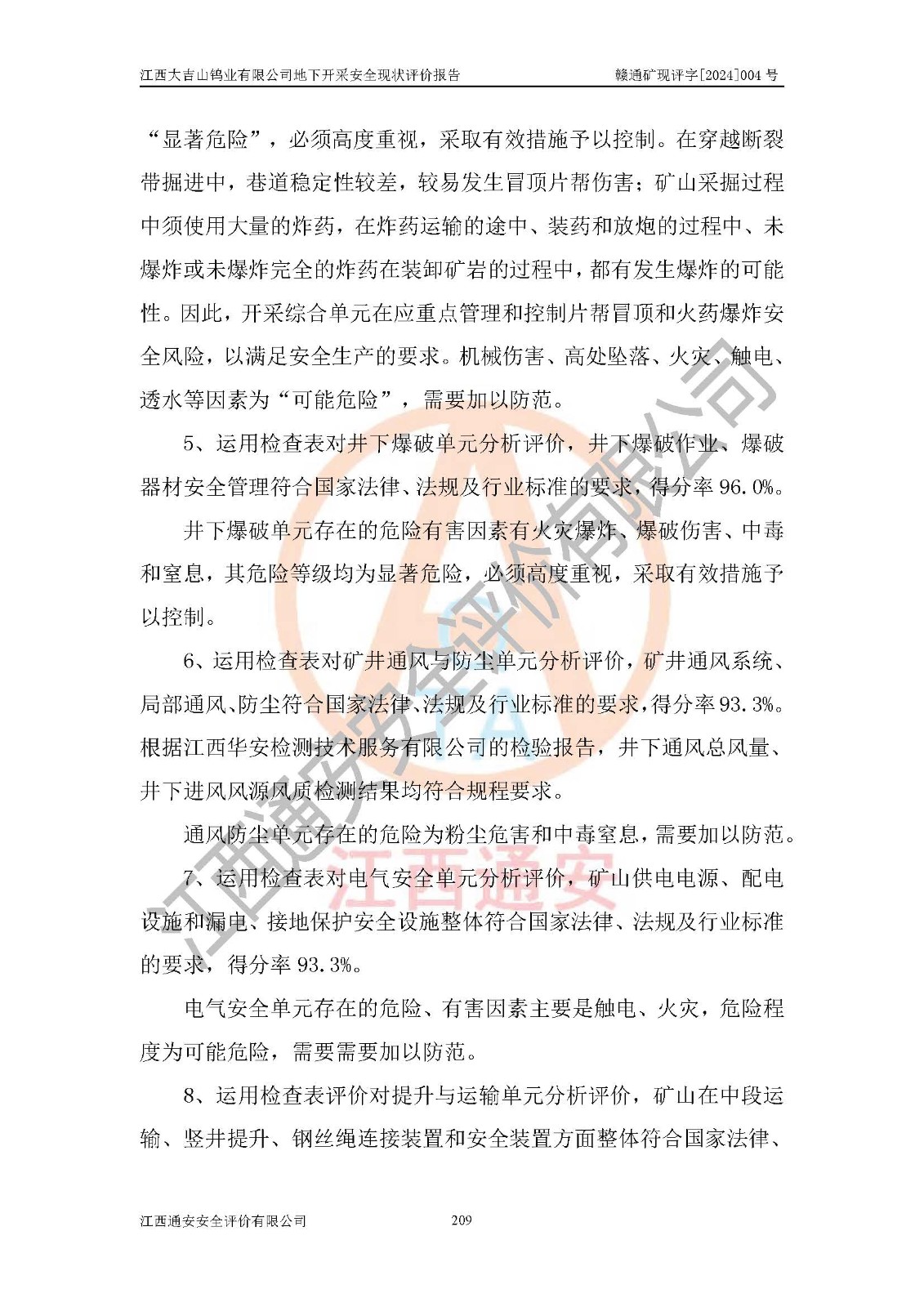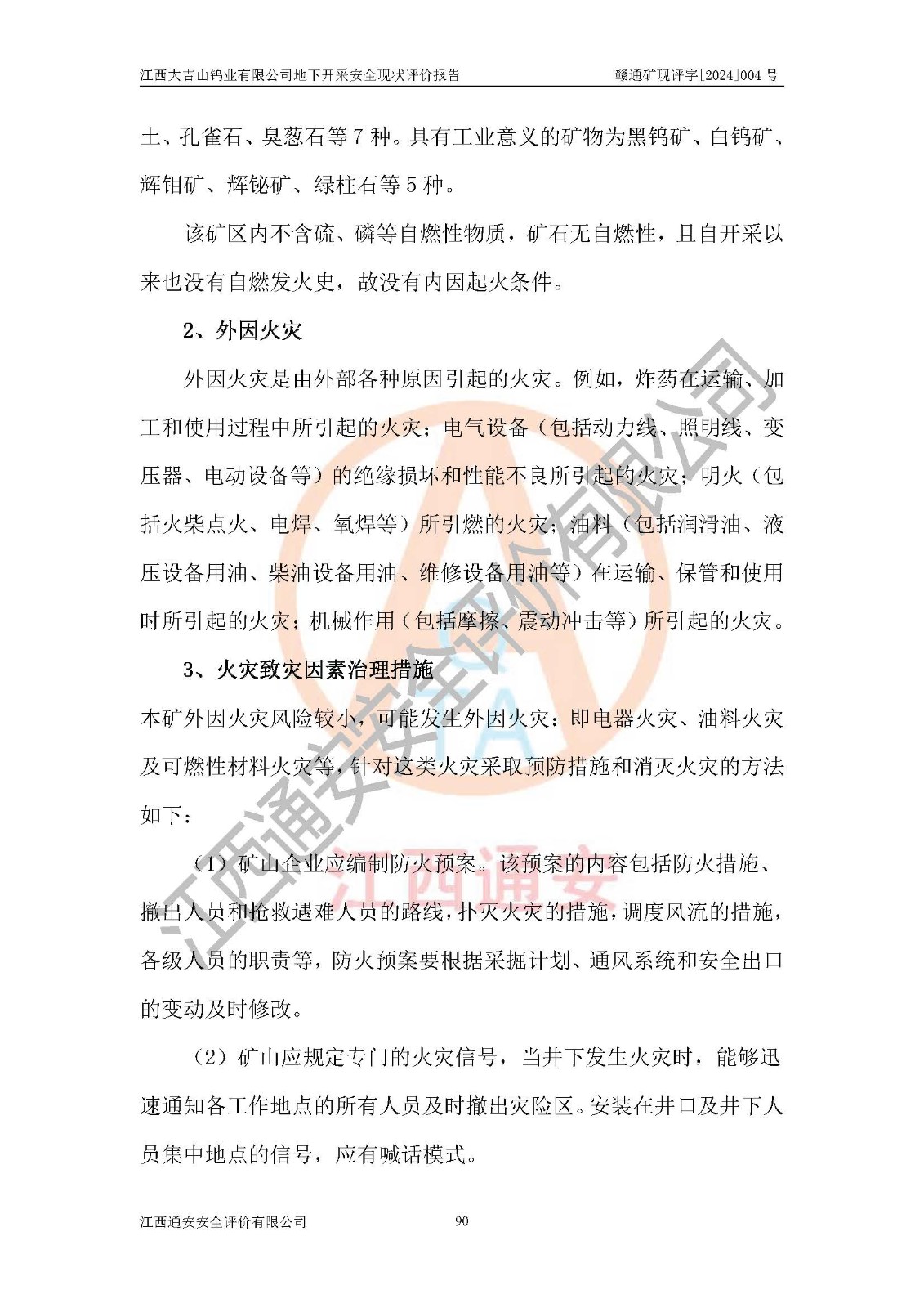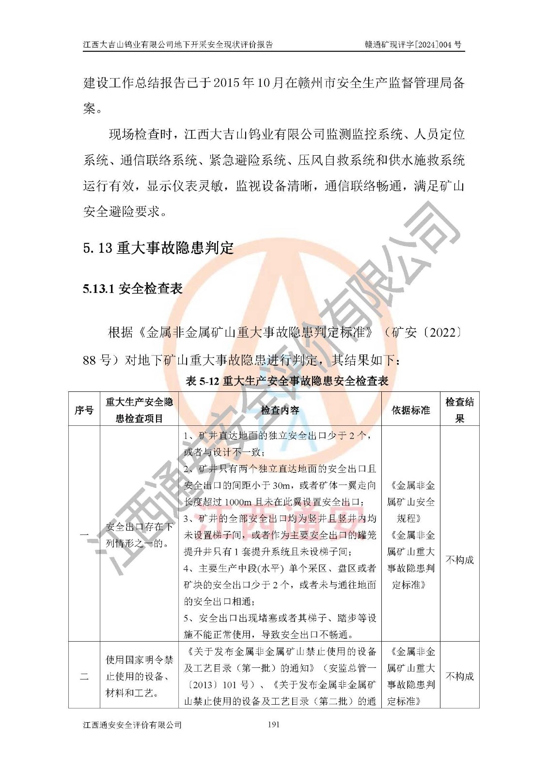 其它 | 江西大吉山鎢業(yè)有限公司地下開采在生產(chǎn)過程中存在的危險(xiǎn)、有害因素有:冒頂片幫、透水、淹溺、火災(zāi)、觸電、火藥爆炸、爆破(放炮)、容器爆炸、中毒和窒息、機(jī)械傷害、高處墜落、物體打擊、起重傷害、提升運(yùn)輸、**傷害、粉塵、噪聲、振動(dòng)等。地下開采有4個(gè)危險(xiǎn)、有害因素為災(zāi)難性的Ⅳ級(jí),有4個(gè)危險(xiǎn)、有害因素的危險(xiǎn)等級(jí)屬危險(xiǎn)的Ⅲ級(jí);有6個(gè)危險(xiǎn)、有害因素的危險(xiǎn)等級(jí)屬臨界的Ⅱ級(jí);有8個(gè)危險(xiǎn)、有害因素的危險(xiǎn)等級(jí)屬安全的Ⅰ級(jí)。 采用《江西省非煤礦山安全現(xiàn)狀評(píng)價(jià)指南》中的檢查表評(píng)價(jià)結(jié)果為:得分率96.4%, A類礦山,即屬于“安全生產(chǎn)條件較好,生產(chǎn)活動(dòng)有安全保障”的礦山江西大吉山鎢業(yè)有限公司地下開采為A類礦山。 江西大吉山鎢業(yè)有限公司地下開采的主要生產(chǎn)及輔助系統(tǒng):提升運(yùn)輸、排水、供配電、通風(fēng)、供風(fēng)、采掘、安全避險(xiǎn)“六大系統(tǒng)”等符合法律法規(guī)要求和規(guī)程、規(guī)范要求;各種危險(xiǎn)有害因素及不可接受的風(fēng)險(xiǎn)在運(yùn)行中認(rèn)真落實(shí)行之**的技術(shù)措施或管理措施,嚴(yán)格按規(guī)程,按要求加強(qiáng)管理,可以避免和控制各類事故,**安全生產(chǎn)。現(xiàn)階段礦山設(shè)備、設(shè)施和場所符合**安全生產(chǎn)有關(guān)法律、法規(guī)、標(biāo)準(zhǔn)及規(guī)范的規(guī)定。礦山采用平硐+豎井聯(lián)合開拓方式,安全生產(chǎn)條件較好;安全管理能滿足法規(guī)要求,礦山地下開采符合**規(guī)定的安全生產(chǎn)條件。 | ||||