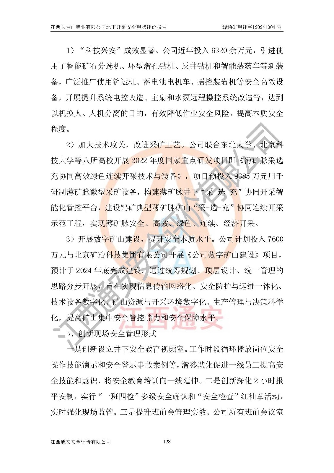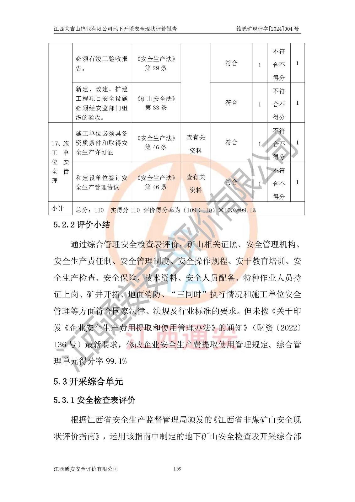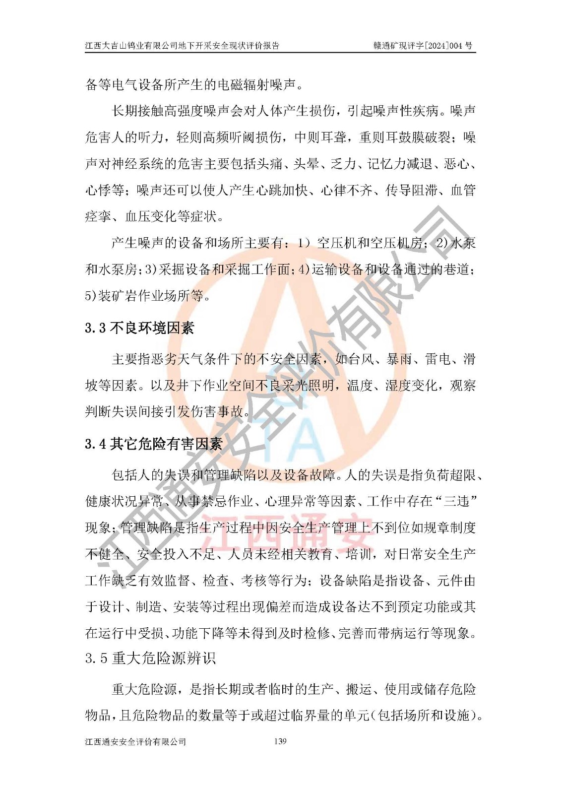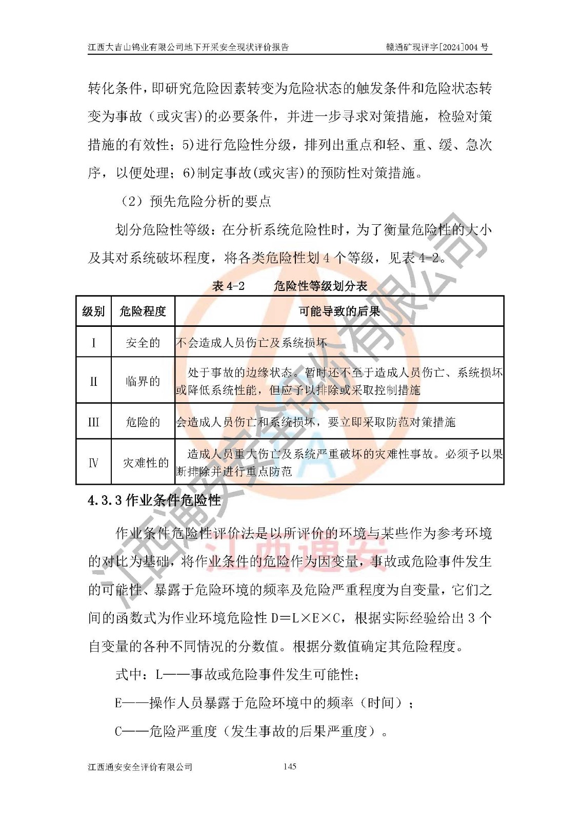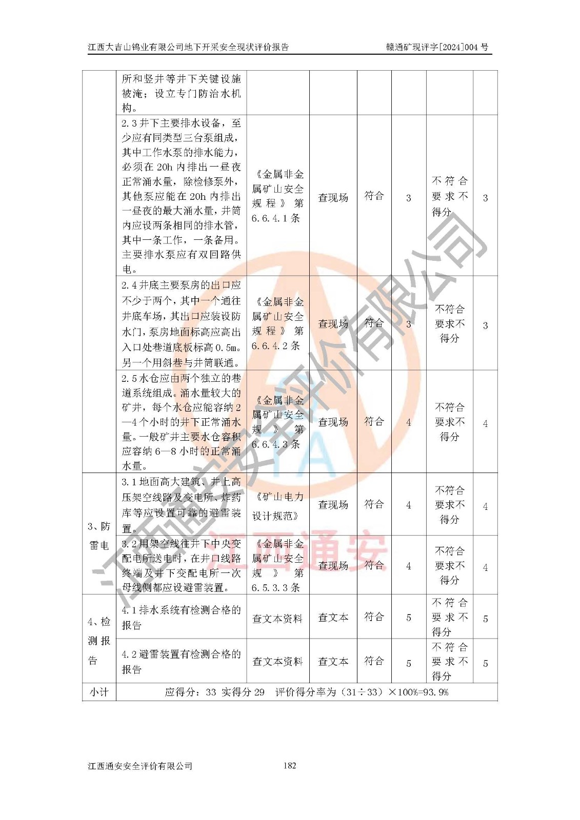 其它 | 江西大吉山鎢業(yè)有限公司地下開采在生產(chǎn)過程中存在的危險(xiǎn)、有害因素有:冒頂片幫、透水、淹溺、火災(zāi)、觸電、火藥爆炸、爆破(放炮)、容器爆炸、中毒和窒息、機(jī)械傷害、高處墜落、物體打擊、起重傷害、提升運(yùn)輸、**傷害、粉塵、噪聲、振動(dòng)等。地下開采有4個(gè)危險(xiǎn)、有害因素為災(zāi)難性的Ⅳ級(jí),有4個(gè)危險(xiǎn)、有害因素的危險(xiǎn)等級(jí)屬危險(xiǎn)的Ⅲ級(jí);有6個(gè)危險(xiǎn)、有害因素的危險(xiǎn)等級(jí)屬臨界的Ⅱ級(jí);有8個(gè)危險(xiǎn)、有害因素的危險(xiǎn)等級(jí)屬安全的Ⅰ級(jí)。 采用《江西省非煤礦山安全現(xiàn)狀評(píng)價(jià)指南》中的檢查表評(píng)價(jià)結(jié)果為:得分率96.4%, A類礦山,即屬于“安全生產(chǎn)條件較好,生產(chǎn)活動(dòng)有安全保障”的礦山江西大吉山鎢業(yè)有限公司地下開采為A類礦山。 江西大吉山鎢業(yè)有限公司地下開采的主要生產(chǎn)及輔助系統(tǒng):提升運(yùn)輸、排水、供配電、通風(fēng)、供風(fēng)、采掘、安全避險(xiǎn)“六大系統(tǒng)”等符合法律法規(guī)要求和規(guī)程、規(guī)范要求;各種危險(xiǎn)有害因素及不可接受的風(fēng)險(xiǎn)在運(yùn)行中認(rèn)真落實(shí)行之**的技術(shù)措施或管理措施,嚴(yán)格按規(guī)程,按要求加強(qiáng)管理,可以避免和控制各類事故,**安全生產(chǎn)。現(xiàn)階段礦山設(shè)備、設(shè)施和場所符合**安全生產(chǎn)有關(guān)法律、法規(guī)、標(biāo)準(zhǔn)及規(guī)范的規(guī)定。礦山采用平硐+豎井聯(lián)合開拓方式,安全生產(chǎn)條件較好;安全管理能滿足法規(guī)要求,礦山地下開采符合**規(guī)定的安全生產(chǎn)條件。 | ||||