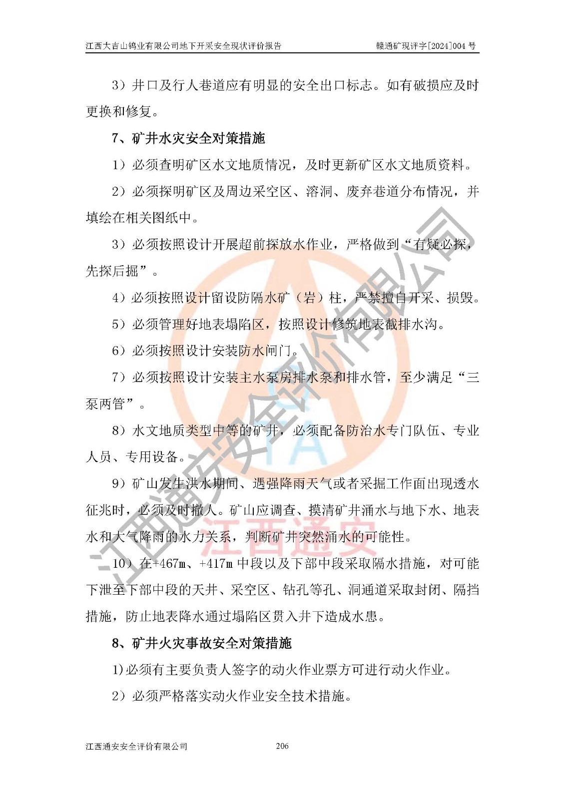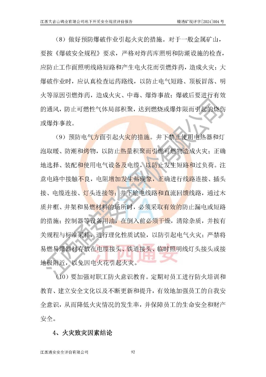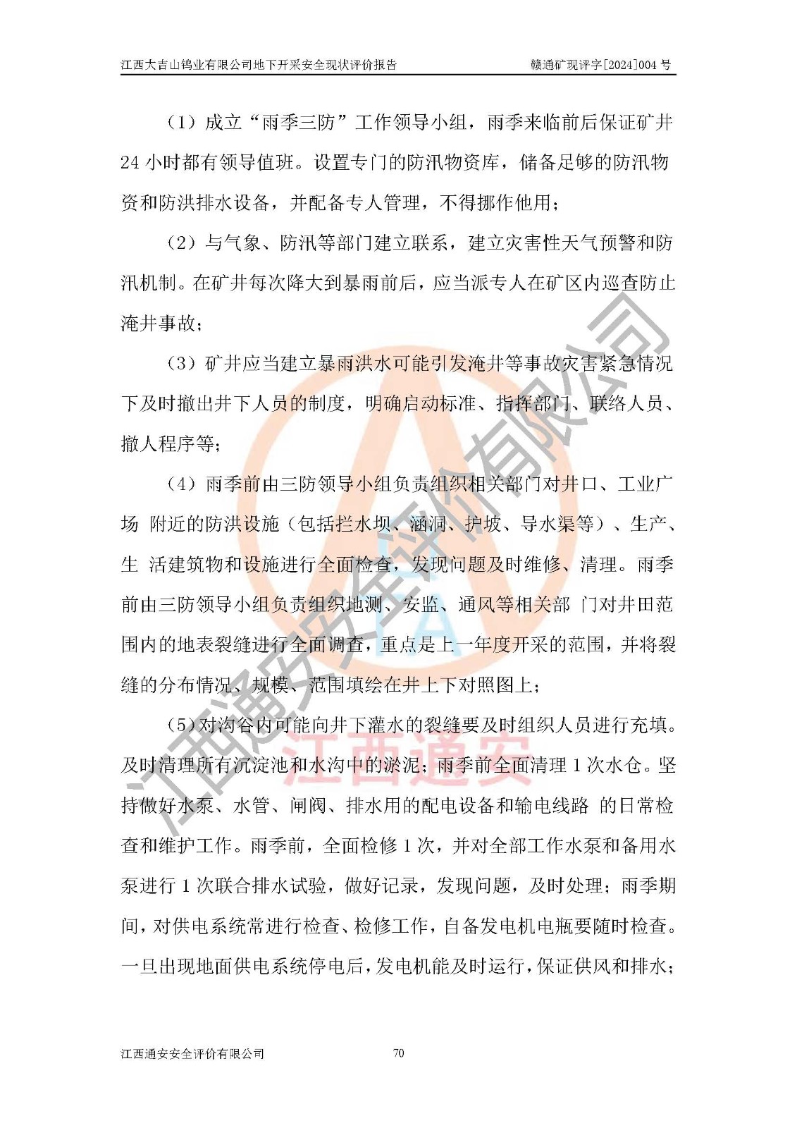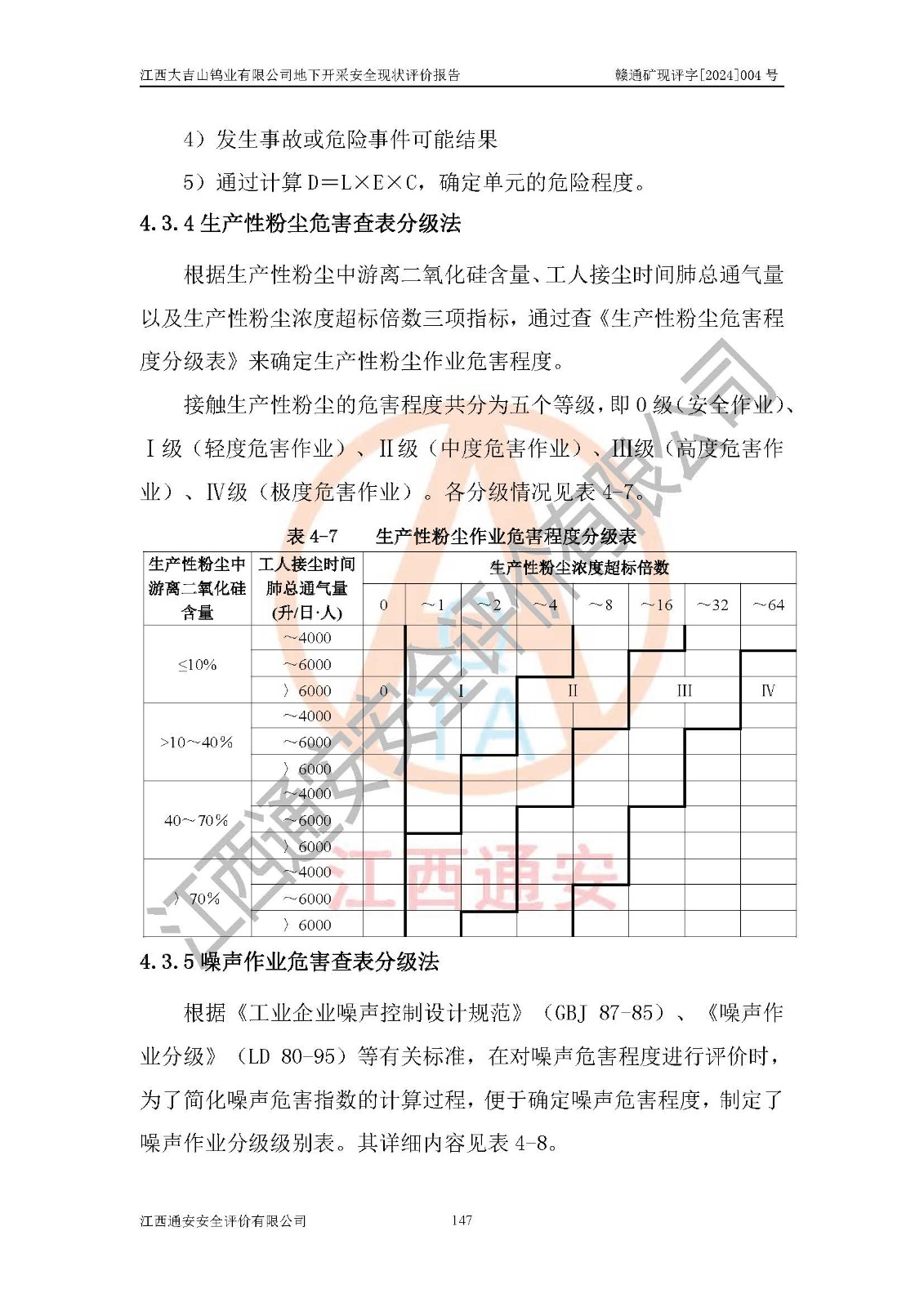 其它 | 江西大吉山鎢業(yè)有限公司地下開采在生產(chǎn)過程中存在的危險(xiǎn)、有害因素有:冒頂片幫、透水、淹溺、火災(zāi)、觸電、火藥爆炸、爆破(放炮)、容器爆炸、中毒和窒息、機(jī)械傷害、高處墜落、物體打擊、起重傷害、提升運(yùn)輸、**傷害、粉塵、噪聲、振動(dòng)等。地下開采有4個(gè)危險(xiǎn)、有害因素為災(zāi)難性的Ⅳ級(jí),有4個(gè)危險(xiǎn)、有害因素的危險(xiǎn)等級(jí)屬危險(xiǎn)的Ⅲ級(jí);有6個(gè)危險(xiǎn)、有害因素的危險(xiǎn)等級(jí)屬臨界的Ⅱ級(jí);有8個(gè)危險(xiǎn)、有害因素的危險(xiǎn)等級(jí)屬安全的Ⅰ級(jí)。 采用《江西省非煤礦山安全現(xiàn)狀評(píng)價(jià)指南》中的檢查表評(píng)價(jià)結(jié)果為:得分率96.4%, A類礦山,即屬于“安全生產(chǎn)條件較好,生產(chǎn)活動(dòng)有安全保障”的礦山江西大吉山鎢業(yè)有限公司地下開采為A類礦山。 江西大吉山鎢業(yè)有限公司地下開采的主要生產(chǎn)及輔助系統(tǒng):提升運(yùn)輸、排水、供配電、通風(fēng)、供風(fēng)、采掘、安全避險(xiǎn)“六大系統(tǒng)”等符合法律法規(guī)要求和規(guī)程、規(guī)范要求;各種危險(xiǎn)有害因素及不可接受的風(fēng)險(xiǎn)在運(yùn)行中認(rèn)真落實(shí)行之**的技術(shù)措施或管理措施,嚴(yán)格按規(guī)程,按要求加強(qiáng)管理,可以避免和控制各類事故,**安全生產(chǎn)。現(xiàn)階段礦山設(shè)備、設(shè)施和場所符合**安全生產(chǎn)有關(guān)法律、法規(guī)、標(biāo)準(zhǔn)及規(guī)范的規(guī)定。礦山采用平硐+豎井聯(lián)合開拓方式,安全生產(chǎn)條件較好;安全管理能滿足法規(guī)要求,礦山地下開采符合**規(guī)定的安全生產(chǎn)條件。 | ||||