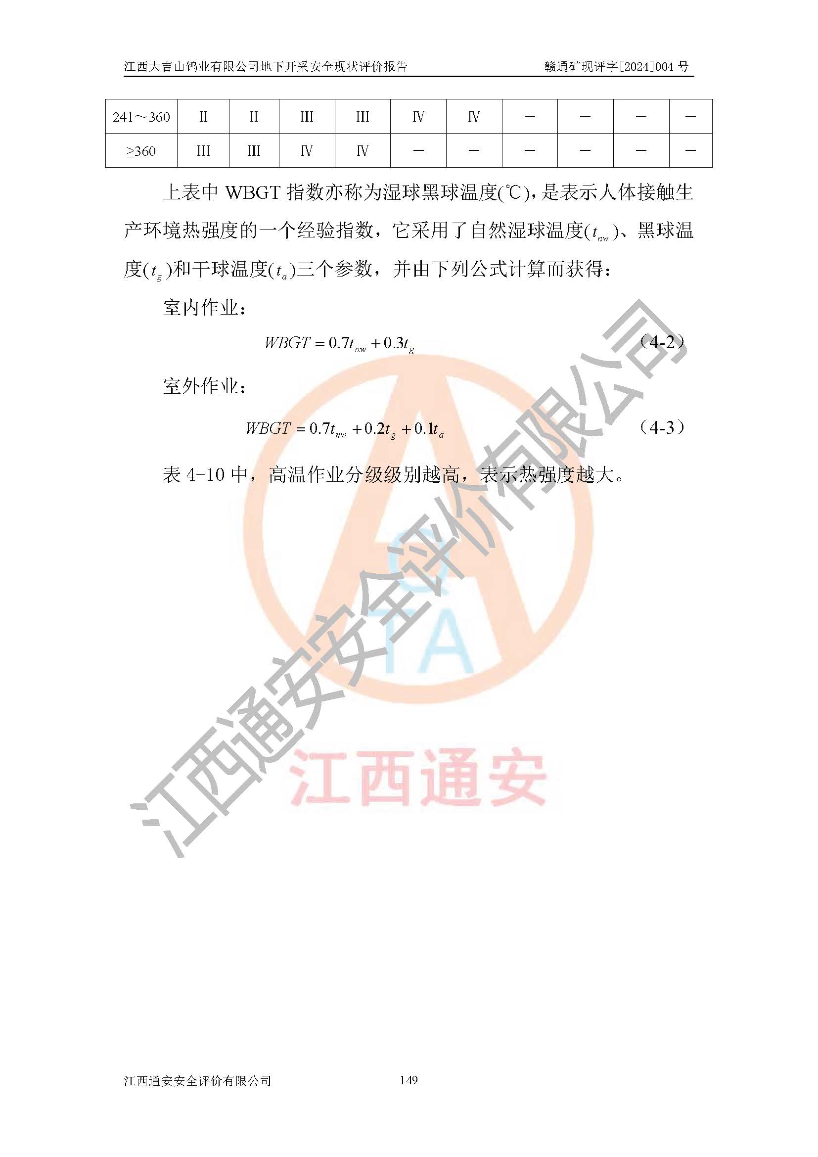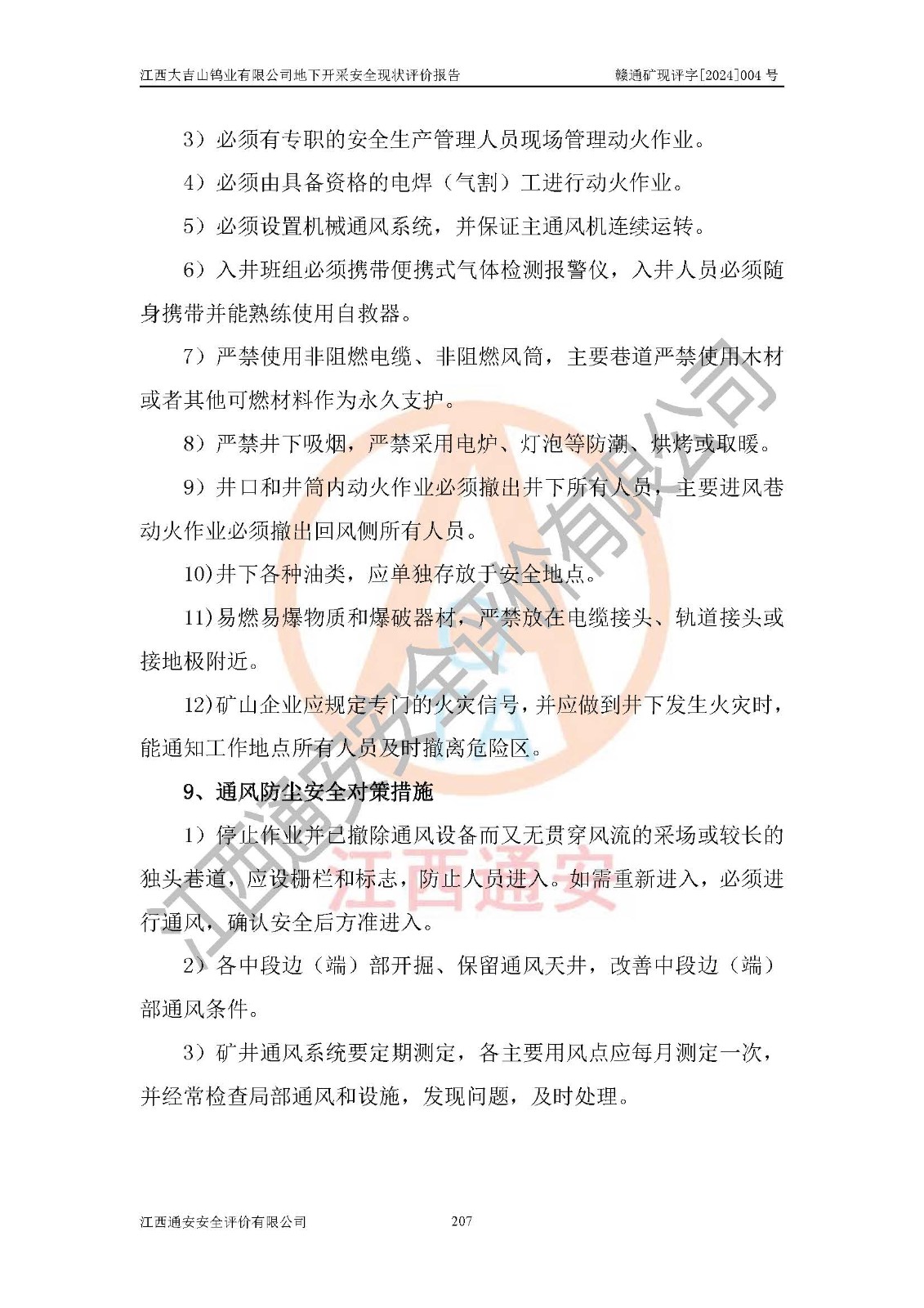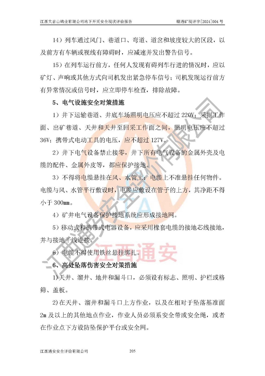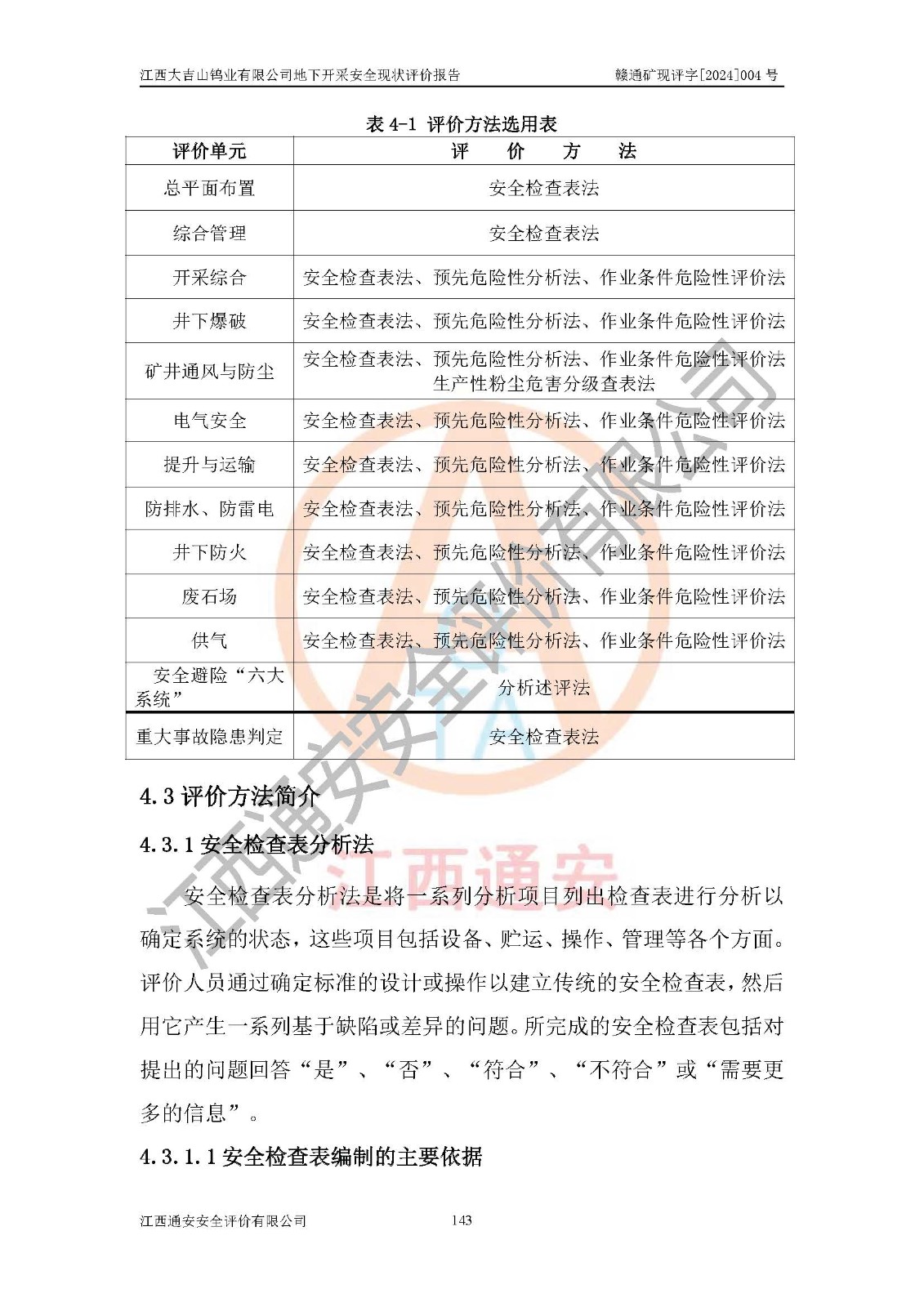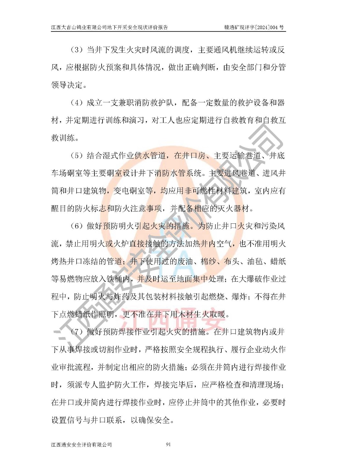 其它 | 江西大吉山鎢業(yè)有限公司地下開采在生產(chǎn)過程中存在的危險(xiǎn)、有害因素有:冒頂片幫、透水、淹溺、火災(zāi)、觸電、火藥爆炸、爆破(放炮)、容器爆炸、中毒和窒息、機(jī)械傷害、高處墜落、物體打擊、起重傷害、提升運(yùn)輸、**傷害、粉塵、噪聲、振動(dòng)等。地下開采有4個(gè)危險(xiǎn)、有害因素為災(zāi)難性的Ⅳ級(jí),有4個(gè)危險(xiǎn)、有害因素的危險(xiǎn)等級(jí)屬危險(xiǎn)的Ⅲ級(jí);有6個(gè)危險(xiǎn)、有害因素的危險(xiǎn)等級(jí)屬臨界的Ⅱ級(jí);有8個(gè)危險(xiǎn)、有害因素的危險(xiǎn)等級(jí)屬安全的Ⅰ級(jí)。 采用《江西省非煤礦山安全現(xiàn)狀評(píng)價(jià)指南》中的檢查表評(píng)價(jià)結(jié)果為:得分率96.4%, A類礦山,即屬于“安全生產(chǎn)條件較好,生產(chǎn)活動(dòng)有安全保障”的礦山江西大吉山鎢業(yè)有限公司地下開采為A類礦山。 江西大吉山鎢業(yè)有限公司地下開采的主要生產(chǎn)及輔助系統(tǒng):提升運(yùn)輸、排水、供配電、通風(fēng)、供風(fēng)、采掘、安全避險(xiǎn)“六大系統(tǒng)”等符合法律法規(guī)要求和規(guī)程、規(guī)范要求;各種危險(xiǎn)有害因素及不可接受的風(fēng)險(xiǎn)在運(yùn)行中認(rèn)真落實(shí)行之**的技術(shù)措施或管理措施,嚴(yán)格按規(guī)程,按要求加強(qiáng)管理,可以避免和控制各類事故,**安全生產(chǎn)。現(xiàn)階段礦山設(shè)備、設(shè)施和場所符合**安全生產(chǎn)有關(guān)法律、法規(guī)、標(biāo)準(zhǔn)及規(guī)范的規(guī)定。礦山采用平硐+豎井聯(lián)合開拓方式,安全生產(chǎn)條件較好;安全管理能滿足法規(guī)要求,礦山地下開采符合**規(guī)定的安全生產(chǎn)條件。 | ||||