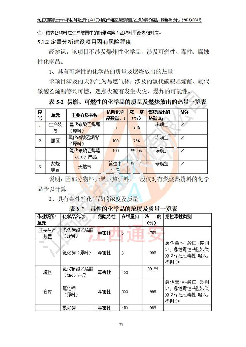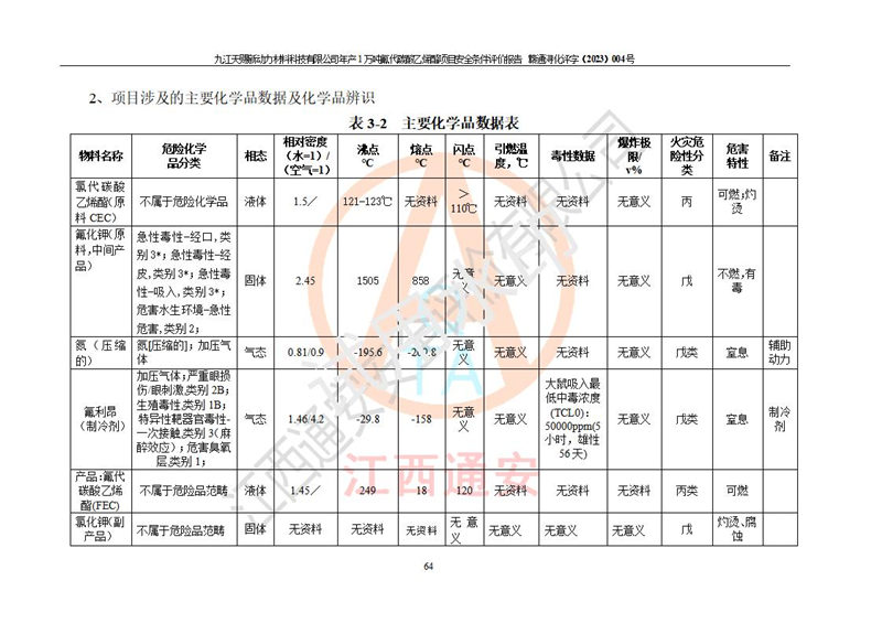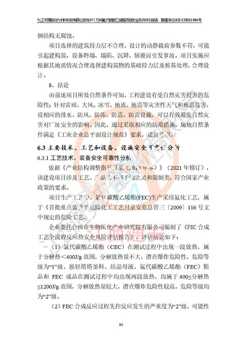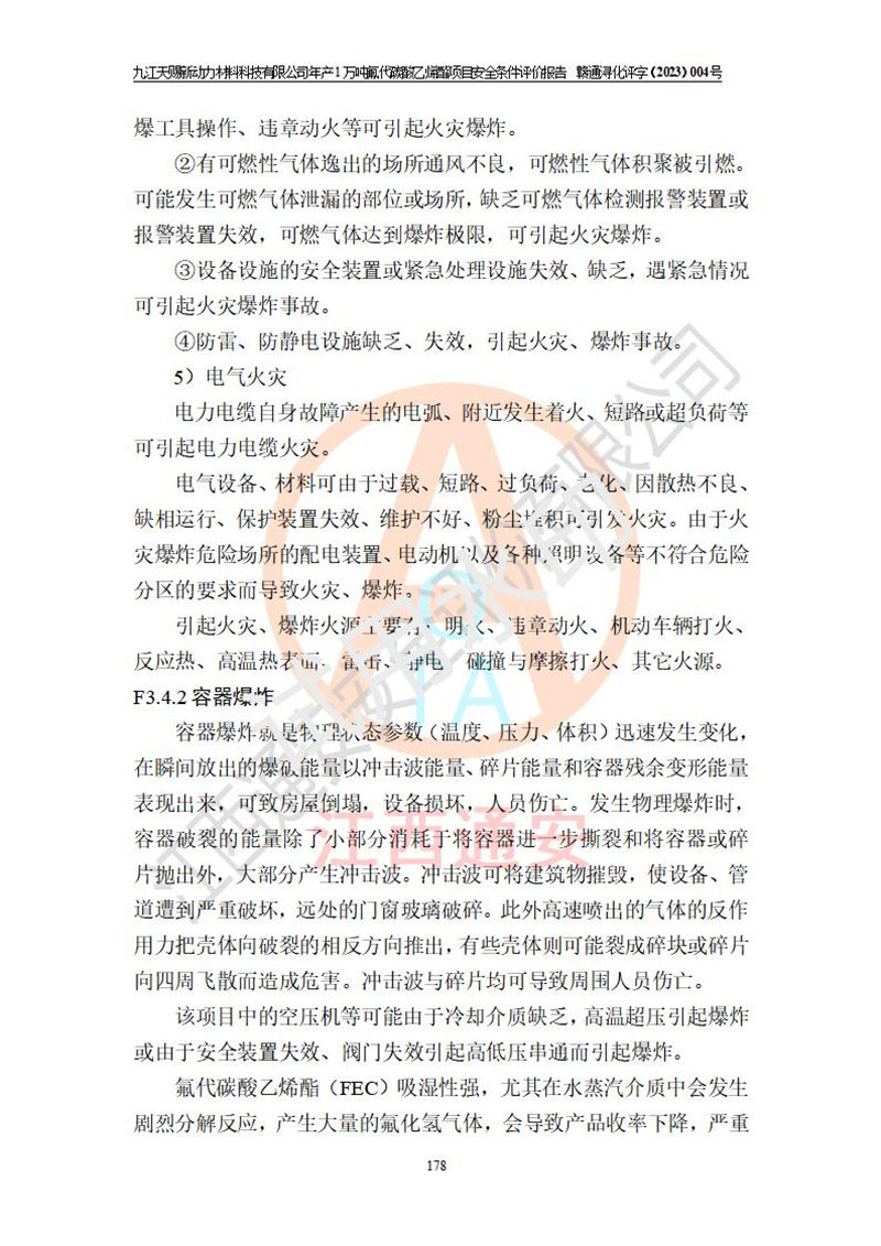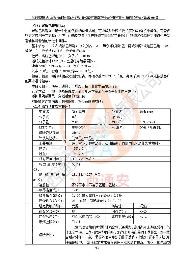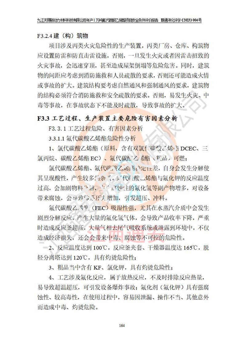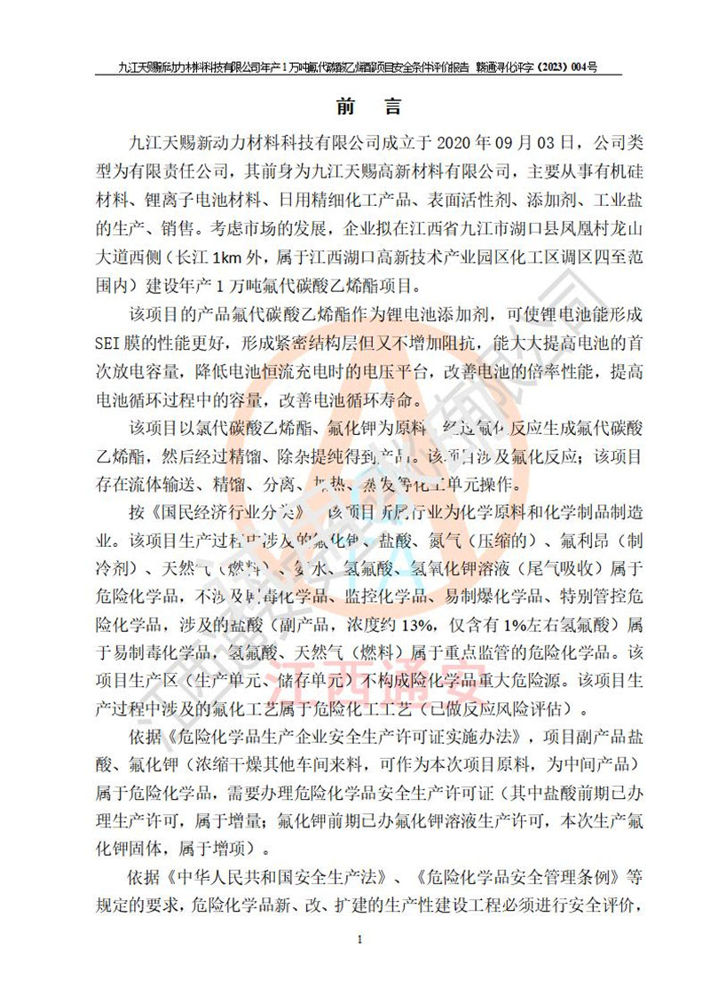 評價報告名稱 | 九江天賜新動力材料科技有限公司年產(chǎn)1萬噸氟代碳酸乙烯酯項目安全條件評價報告 | ||||