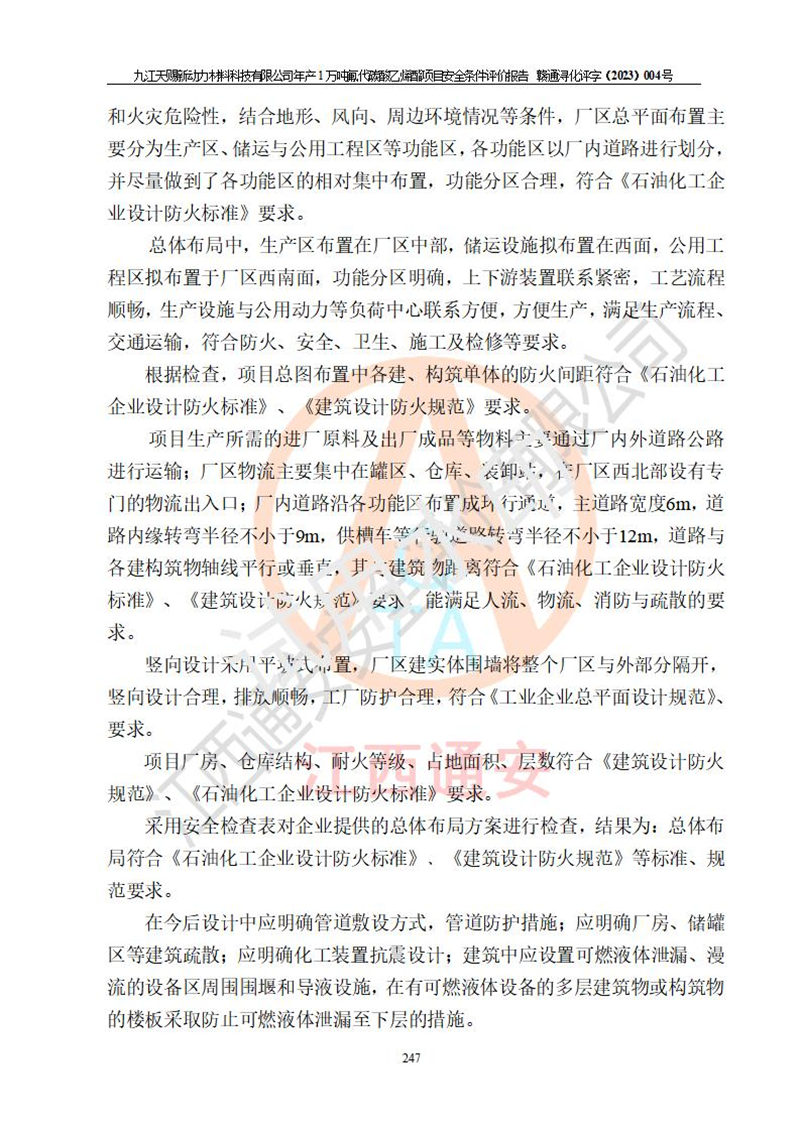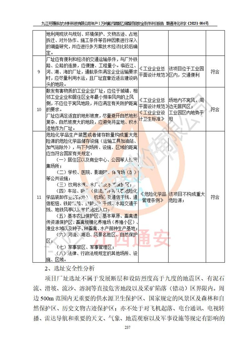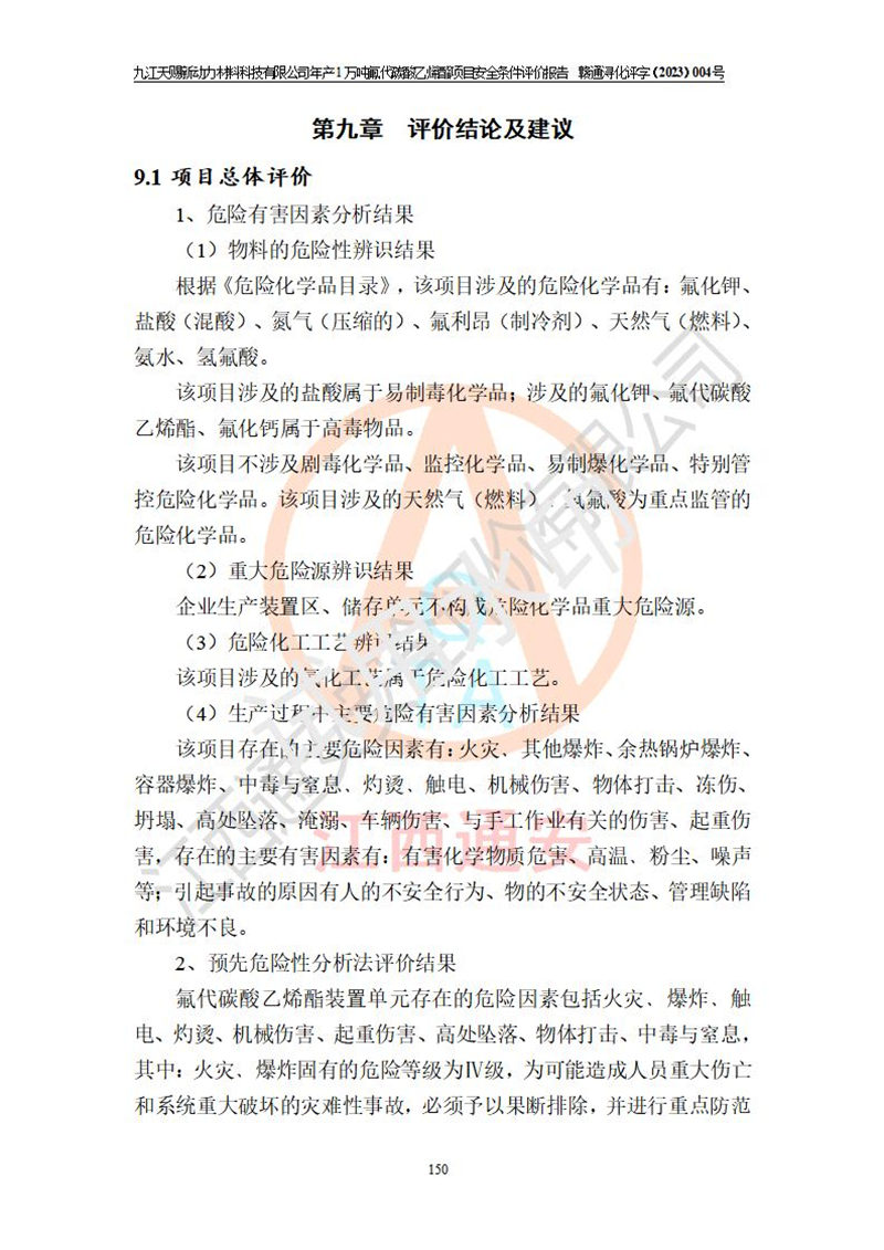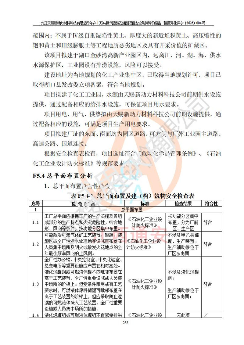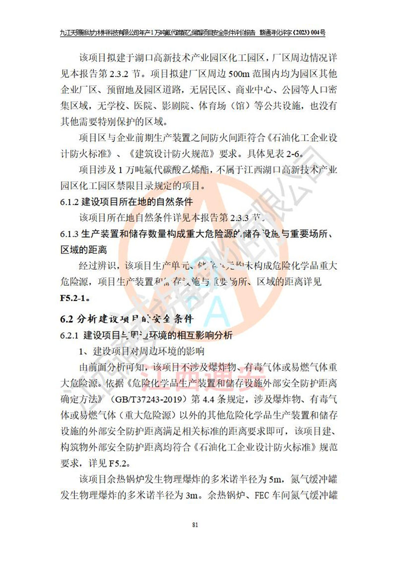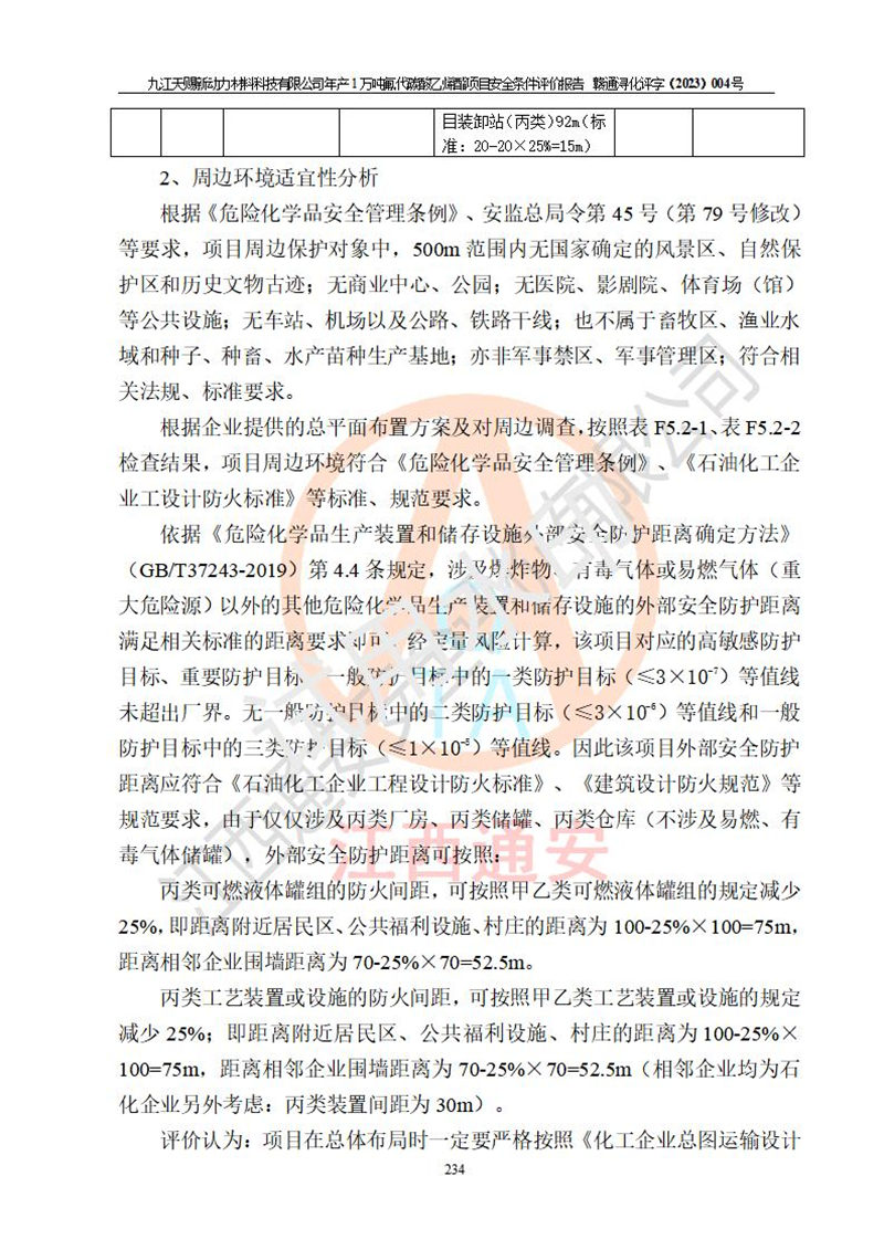 評價結(jié)論 | 九江天賜新動力材料科技有限公司年產(chǎn)1萬噸氟代碳酸乙烯酯項目安全條件、廠址、總體布局、主要技術(shù)和工藝、裝置、設(shè)施、配套和輔助工程、安全管理等均滿足安全生產(chǎn)相關(guān)法律法規(guī)、標(biāo)準(zhǔn)規(guī)范的要求。該建設(shè)項目的危險、有害因素可得到**控制,風(fēng)險在可接受范圍內(nèi),具有**的本質(zhì)安 全水平。企業(yè)應(yīng)認(rèn)真落實本報告提出的安全對策與建議,在下一步設(shè)計、建設(shè)施工過程中嚴(yán)把質(zhì)量關(guān)、嚴(yán)格施工安全管理和檢查,使各項安全措施落實到實處,且嚴(yán)格執(zhí)行建設(shè)項目安全設(shè)施“三同時”的規(guī)定,建立**的事故應(yīng)急體系和措施。 | ||||