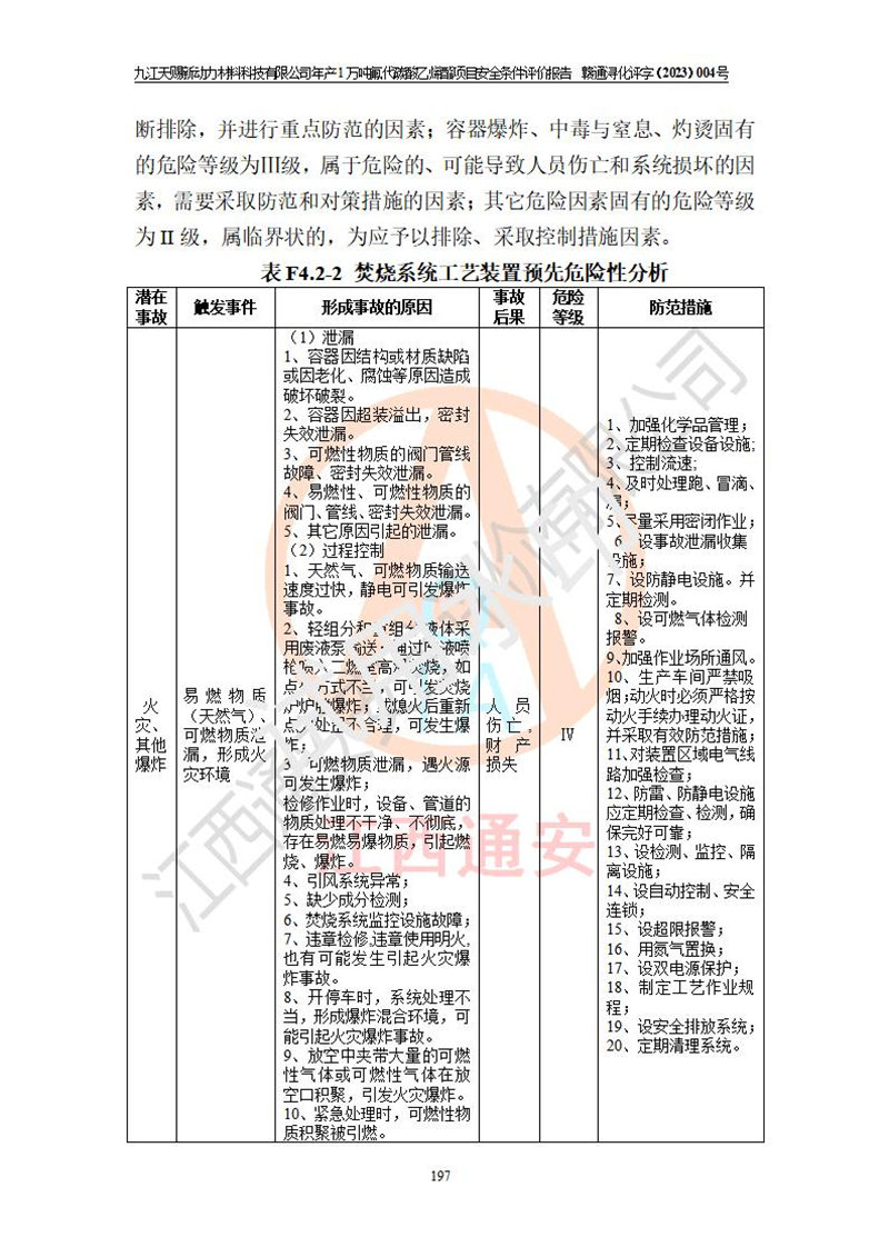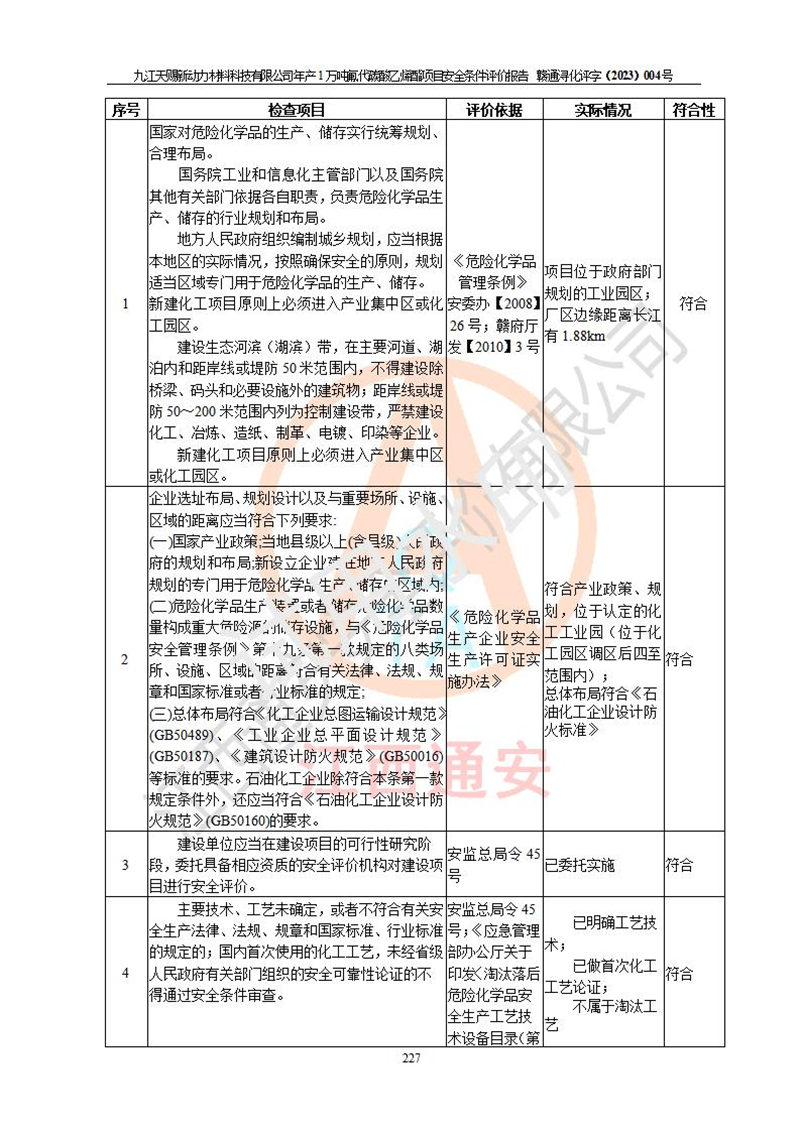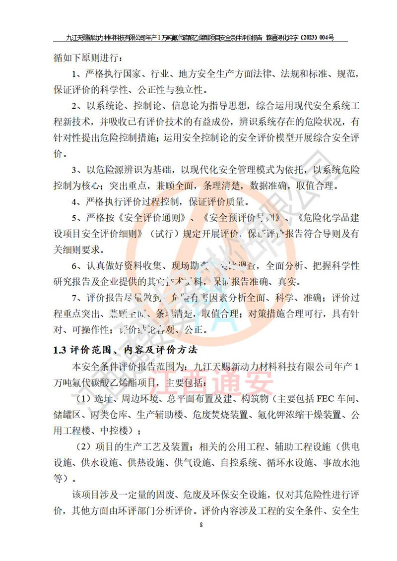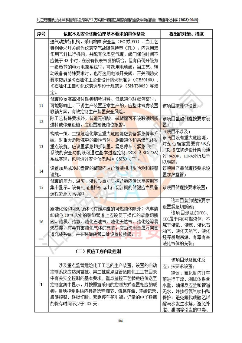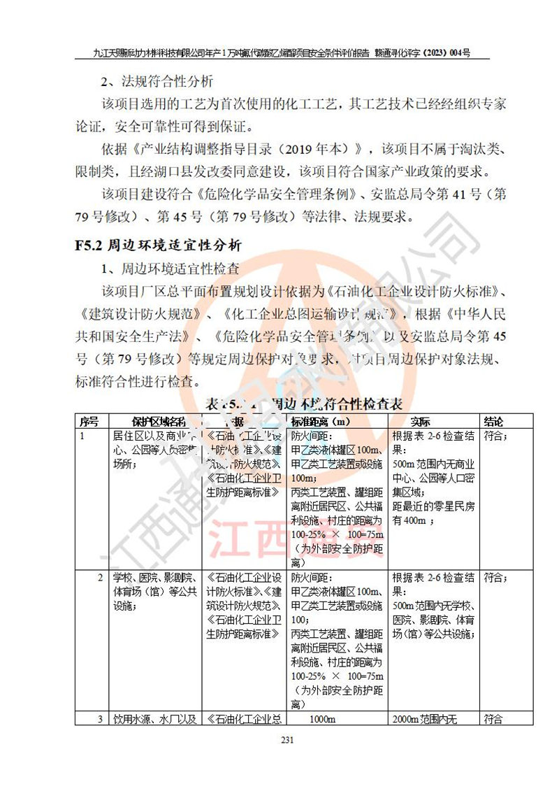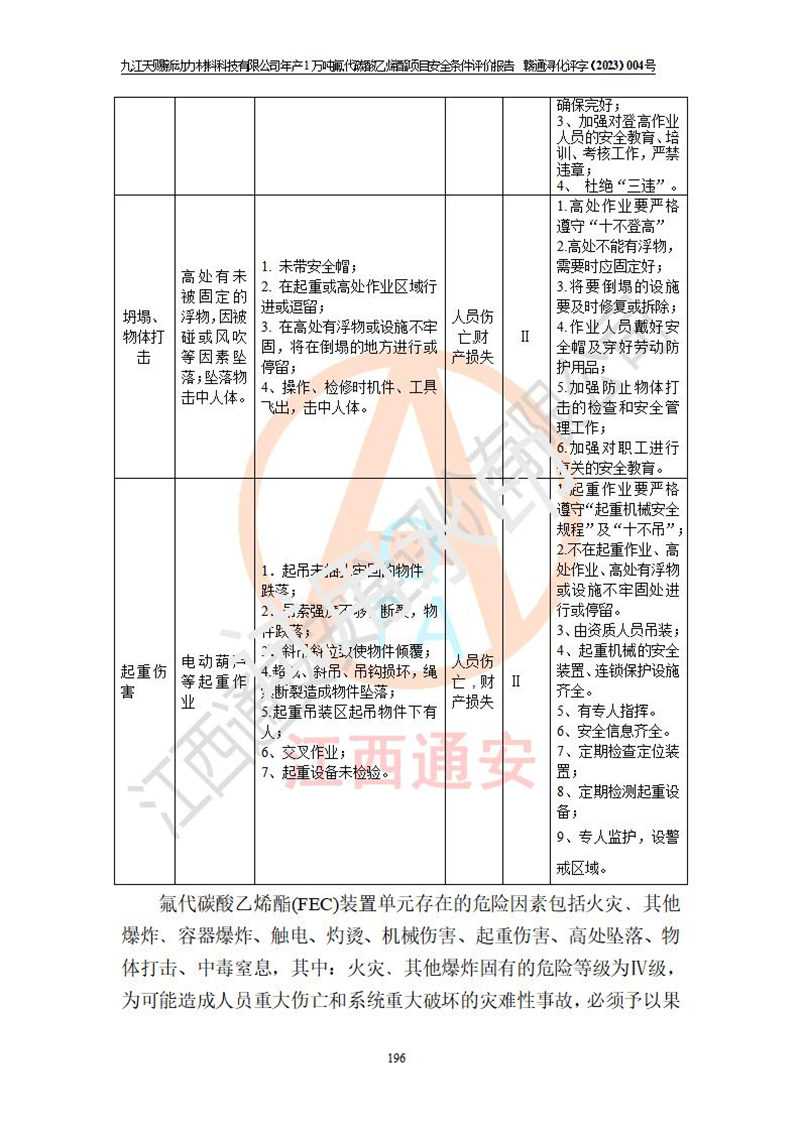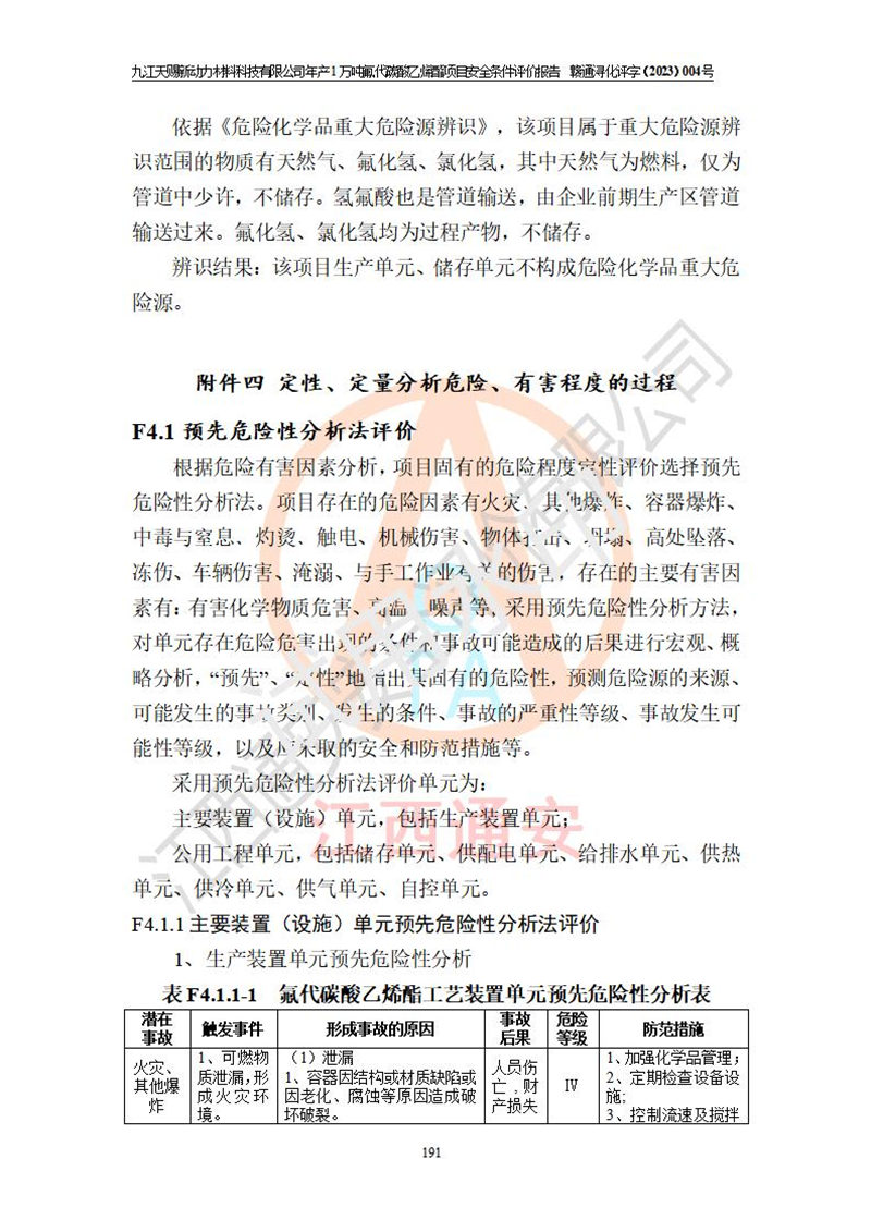 評價結(jié)論 | 九江天賜新動力材料科技有限公司年產(chǎn)1萬噸氟代碳酸乙烯酯項目安全條件、廠址、總體布局、主要技術(shù)和工藝、裝置、設(shè)施、配套和輔助工程、安全管理等均滿足安全生產(chǎn)相關(guān)法律法規(guī)、標(biāo)準(zhǔn)規(guī)范的要求。該建設(shè)項目的危險、有害因素可得到**控制,風(fēng)險在可接受范圍內(nèi),具有**的本質(zhì)安 全水平。企業(yè)應(yīng)認(rèn)真落實本報告提出的安全對策與建議,在下一步設(shè)計、建設(shè)施工過程中嚴(yán)把質(zhì)量關(guān)、嚴(yán)格施工安全管理和檢查,使各項安全措施落實到實處,且嚴(yán)格執(zhí)行建設(shè)項目安全設(shè)施“三同時”的規(guī)定,建立**的事故應(yīng)急體系和措施。 | ||||
