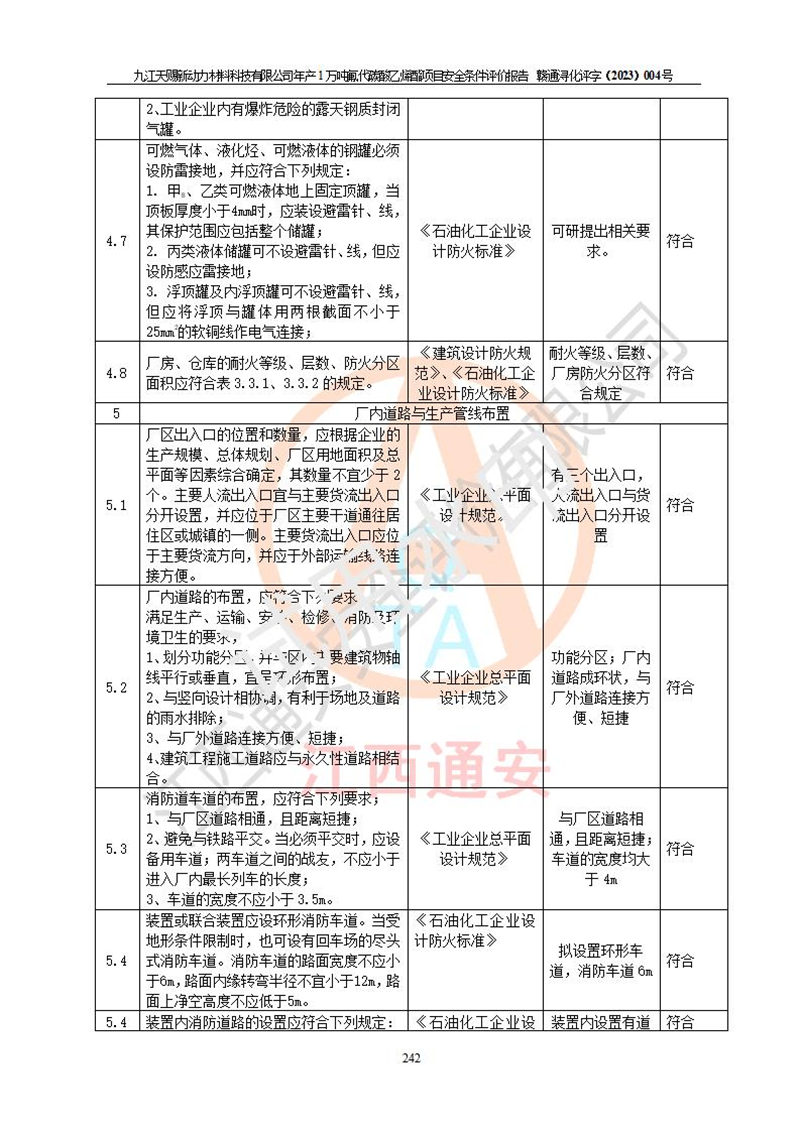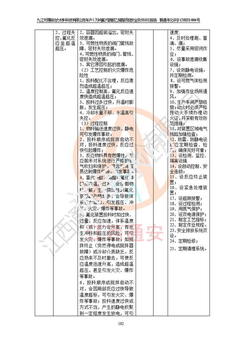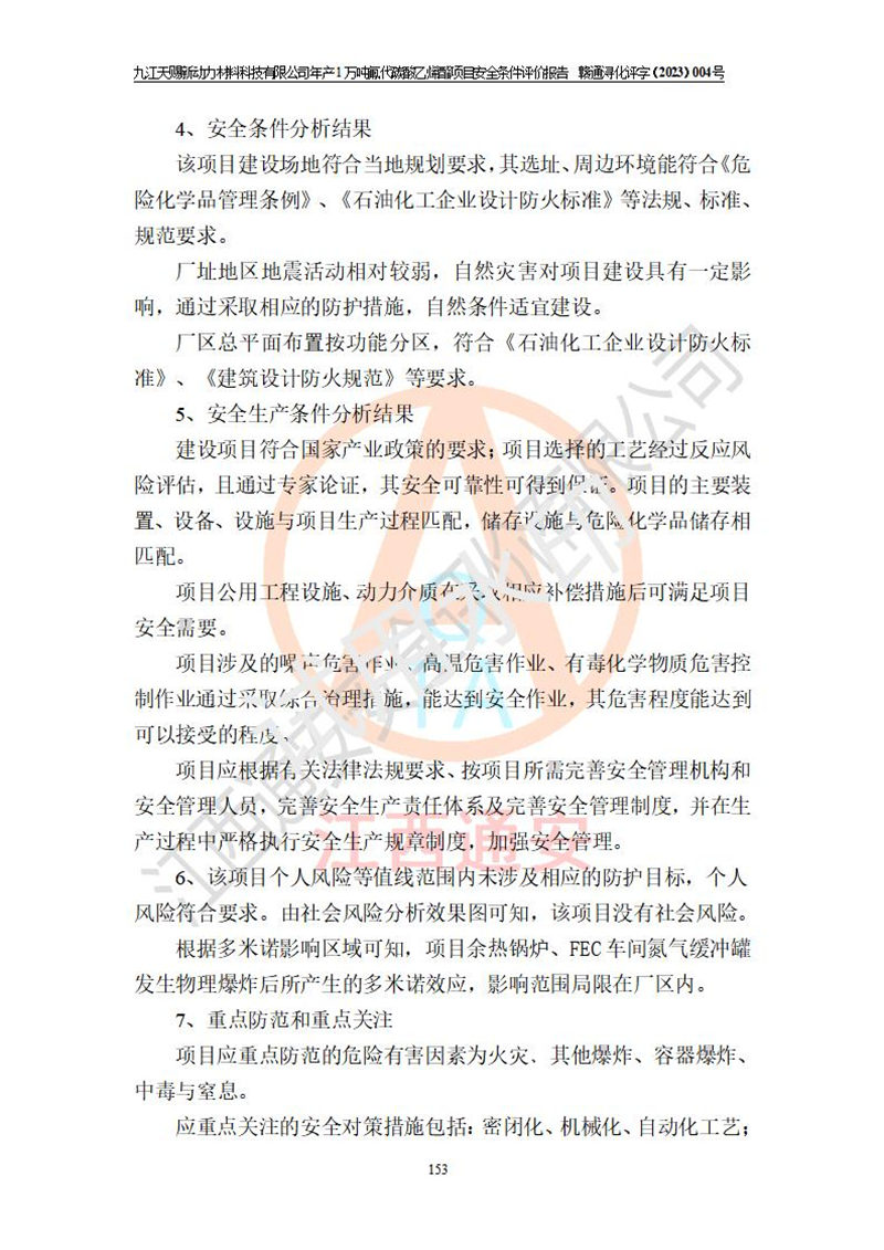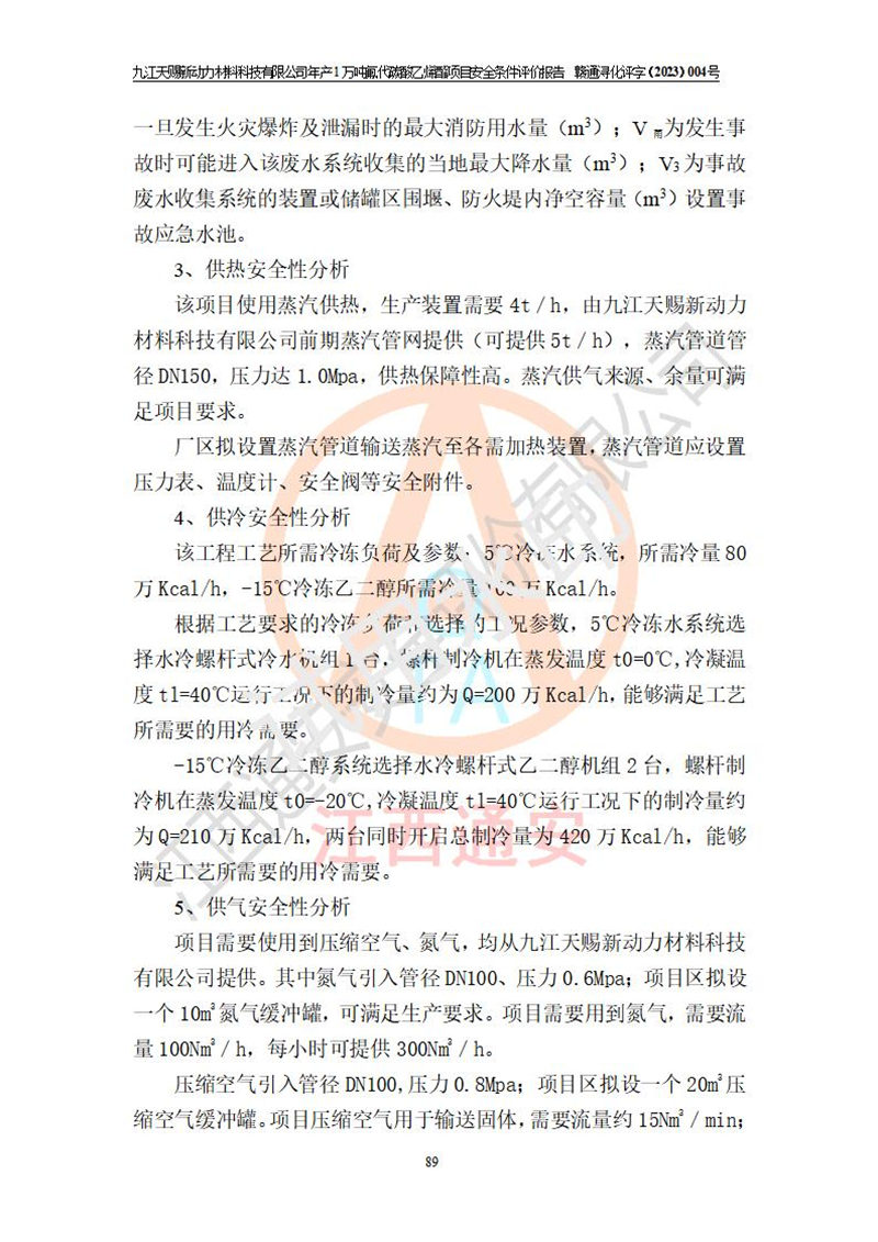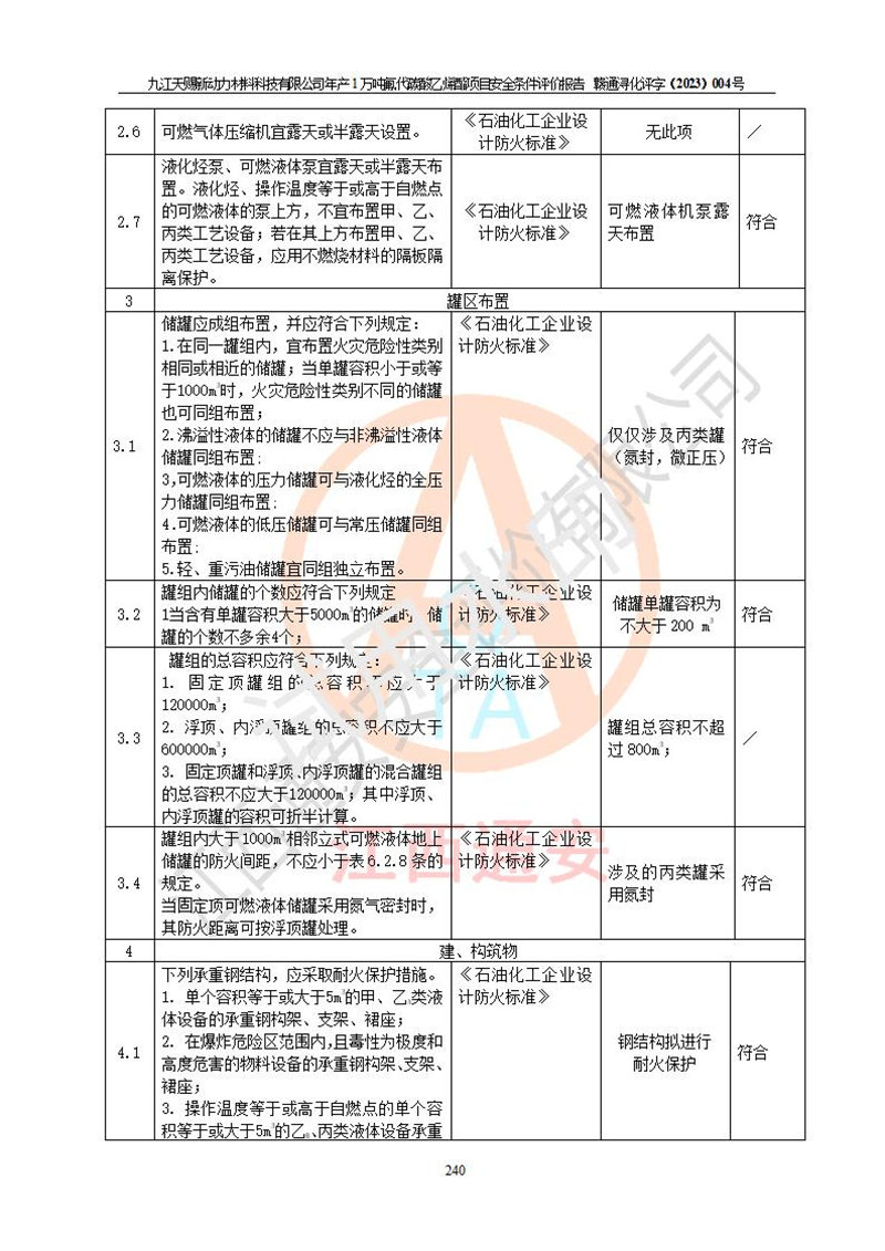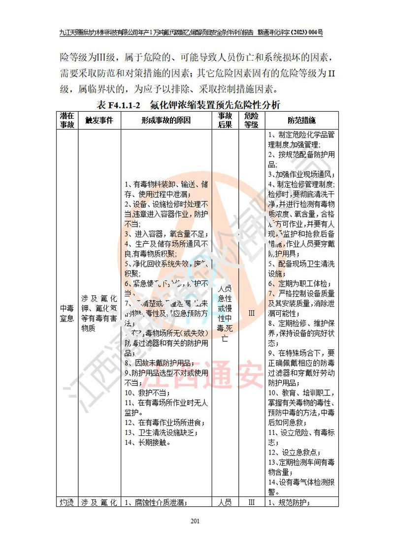 評價結(jié)論 | 九江天賜新動力材料科技有限公司年產(chǎn)1萬噸氟代碳酸乙烯酯項目安全條件、廠址、總體布局、主要技術(shù)和工藝、裝置、設(shè)施、配套和輔助工程、安全管理等均滿足安全生產(chǎn)相關(guān)法律法規(guī)、標(biāo)準(zhǔn)規(guī)范的要求。該建設(shè)項目的危險、有害因素可得到**控制,風(fēng)險在可接受范圍內(nèi),具有**的本質(zhì)安 全水平。企業(yè)應(yīng)認(rèn)真落實本報告提出的安全對策與建議,在下一步設(shè)計、建設(shè)施工過程中嚴(yán)把質(zhì)量關(guān)、嚴(yán)格施工安全管理和檢查,使各項安全措施落實到實處,且嚴(yán)格執(zhí)行建設(shè)項目安全設(shè)施“三同時”的規(guī)定,建立**的事故應(yīng)急體系和措施。 | ||||
