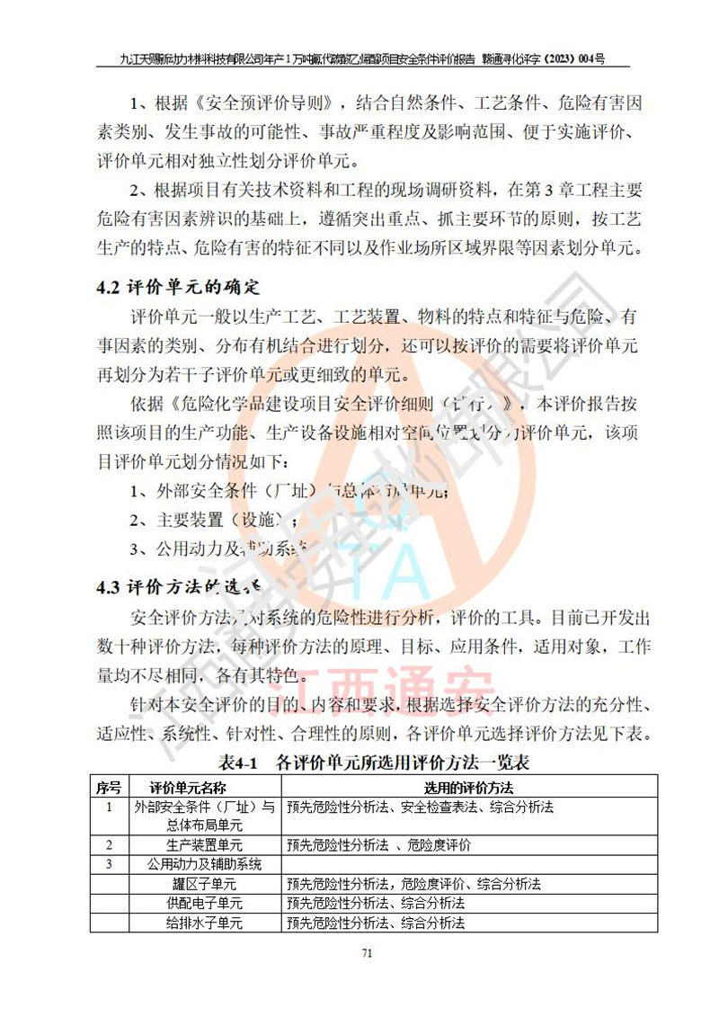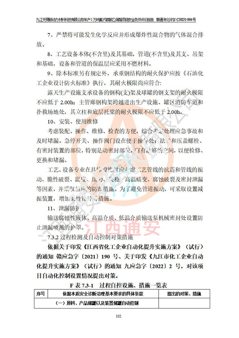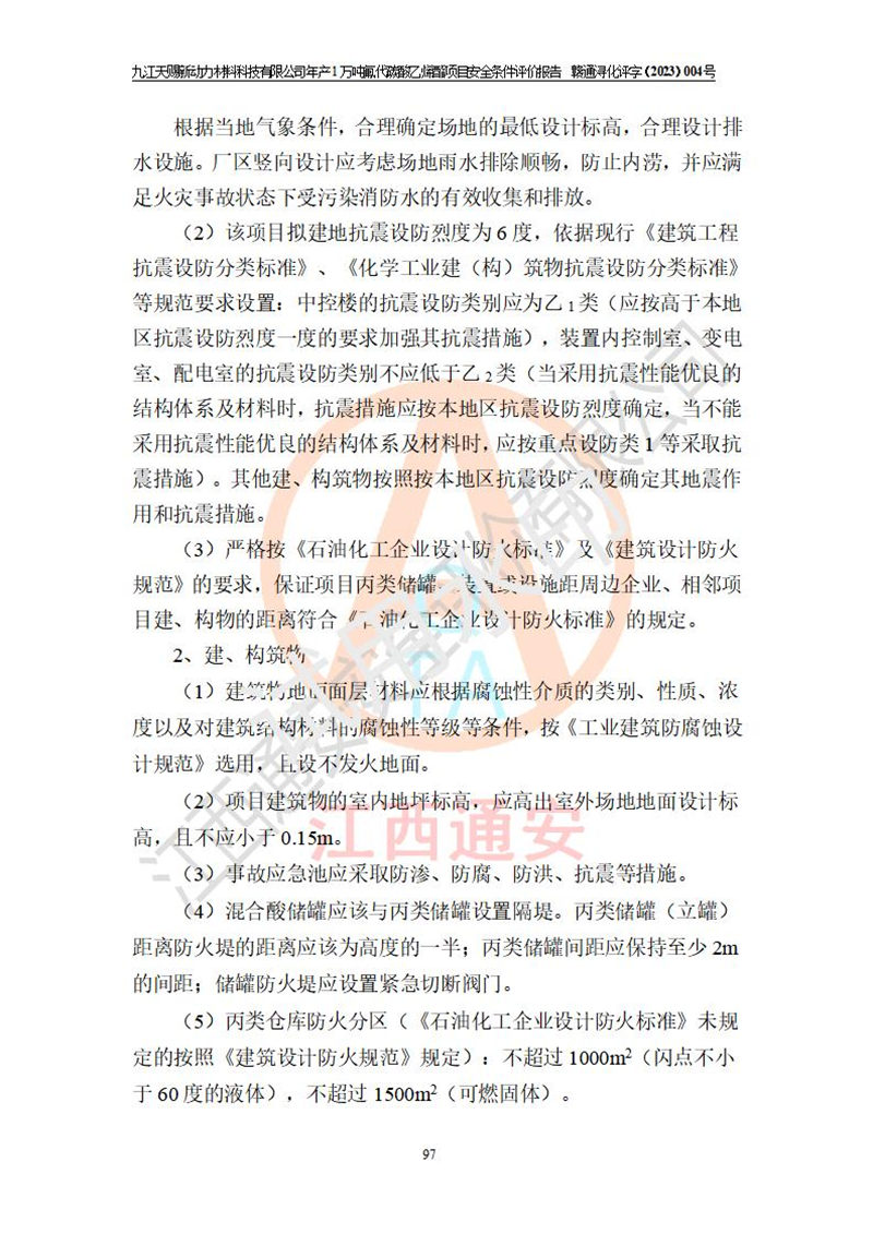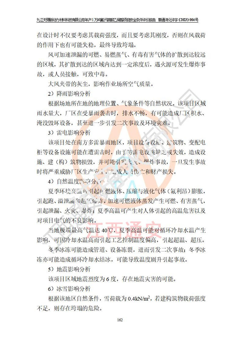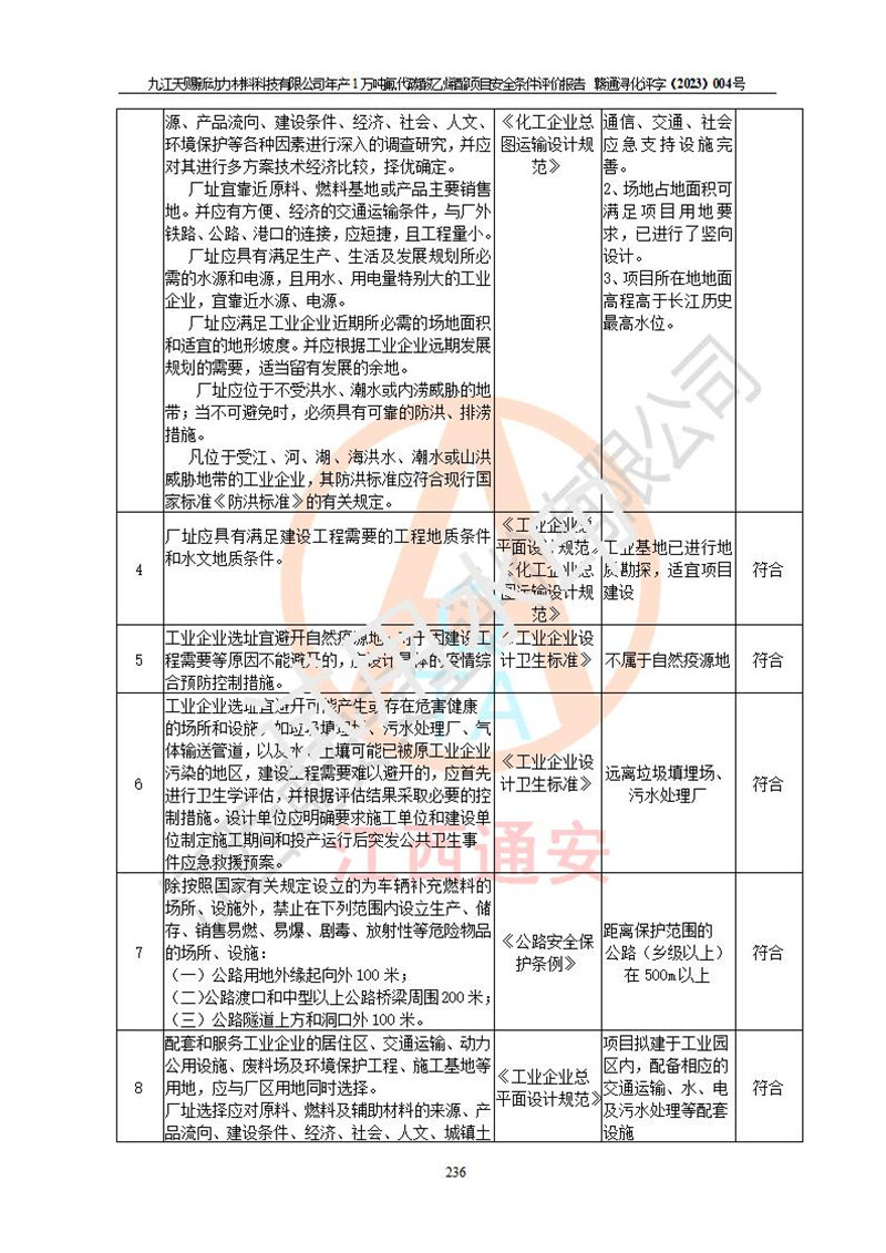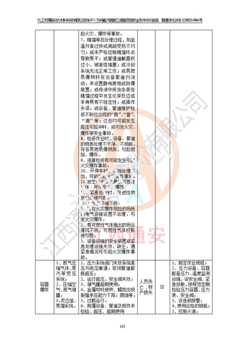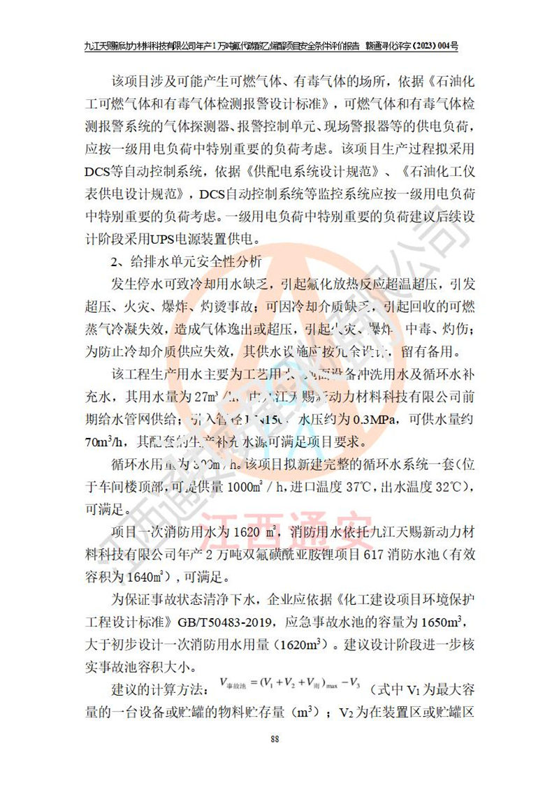 評價結(jié)論 | 九江天賜新動力材料科技有限公司年產(chǎn)1萬噸氟代碳酸乙烯酯項目安全條件、廠址、總體布局、主要技術(shù)和工藝、裝置、設(shè)施、配套和輔助工程、安全管理等均滿足安全生產(chǎn)相關(guān)法律法規(guī)、標(biāo)準(zhǔn)規(guī)范的要求。該建設(shè)項目的危險、有害因素可得到**控制,風(fēng)險在可接受范圍內(nèi),具有**的本質(zhì)安 全水平。企業(yè)應(yīng)認(rèn)真落實本報告提出的安全對策與建議,在下一步設(shè)計、建設(shè)施工過程中嚴(yán)把質(zhì)量關(guān)、嚴(yán)格施工安全管理和檢查,使各項安全措施落實到實處,且嚴(yán)格執(zhí)行建設(shè)項目安全設(shè)施“三同時”的規(guī)定,建立**的事故應(yīng)急體系和措施。 | ||||