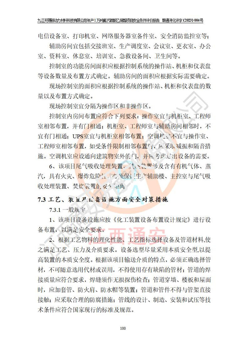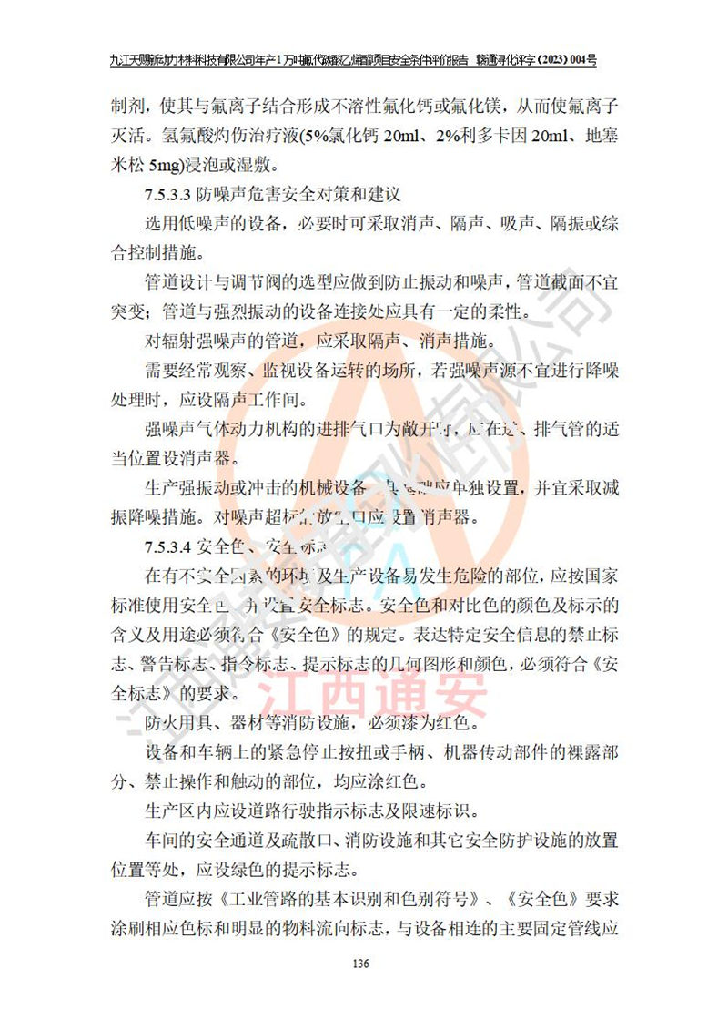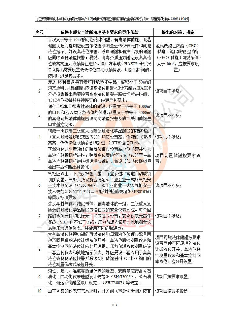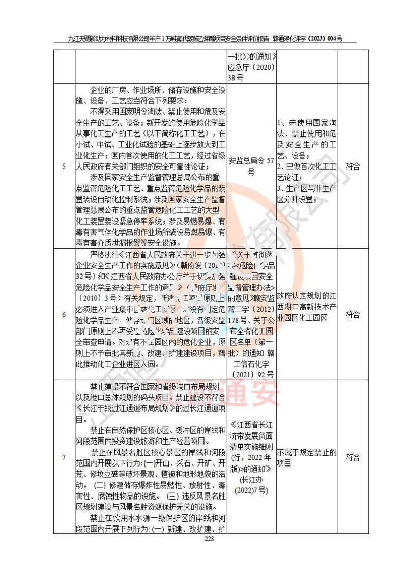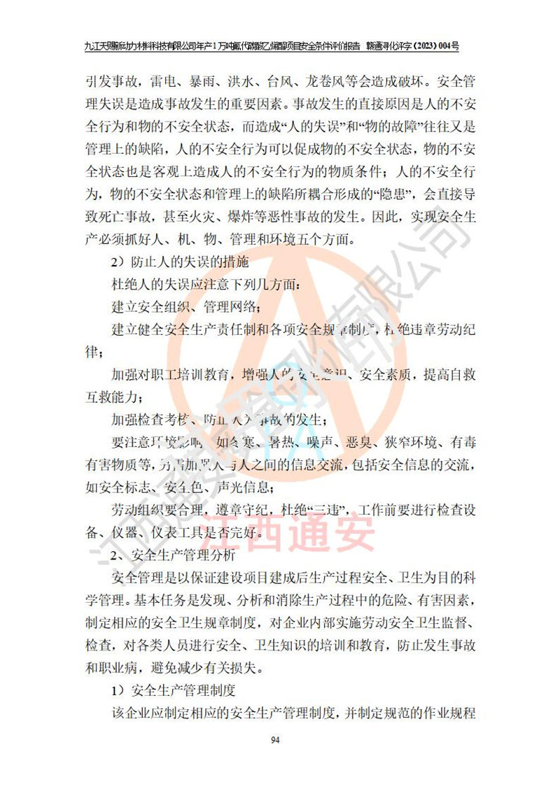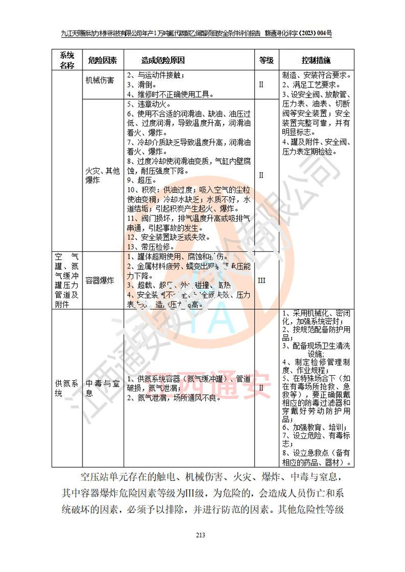 評價結(jié)論 | 九江天賜新動力材料科技有限公司年產(chǎn)1萬噸氟代碳酸乙烯酯項目安全條件、廠址、總體布局、主要技術(shù)和工藝、裝置、設(shè)施、配套和輔助工程、安全管理等均滿足安全生產(chǎn)相關(guān)法律法規(guī)、標(biāo)準(zhǔn)規(guī)范的要求。該建設(shè)項目的危險、有害因素可得到**控制,風(fēng)險在可接受范圍內(nèi),具有**的本質(zhì)安 全水平。企業(yè)應(yīng)認(rèn)真落實本報告提出的安全對策與建議,在下一步設(shè)計、建設(shè)施工過程中嚴(yán)把質(zhì)量關(guān)、嚴(yán)格施工安全管理和檢查,使各項安全措施落實到實處,且嚴(yán)格執(zhí)行建設(shè)項目安全設(shè)施“三同時”的規(guī)定,建立**的事故應(yīng)急體系和措施。 | ||||