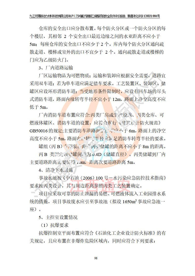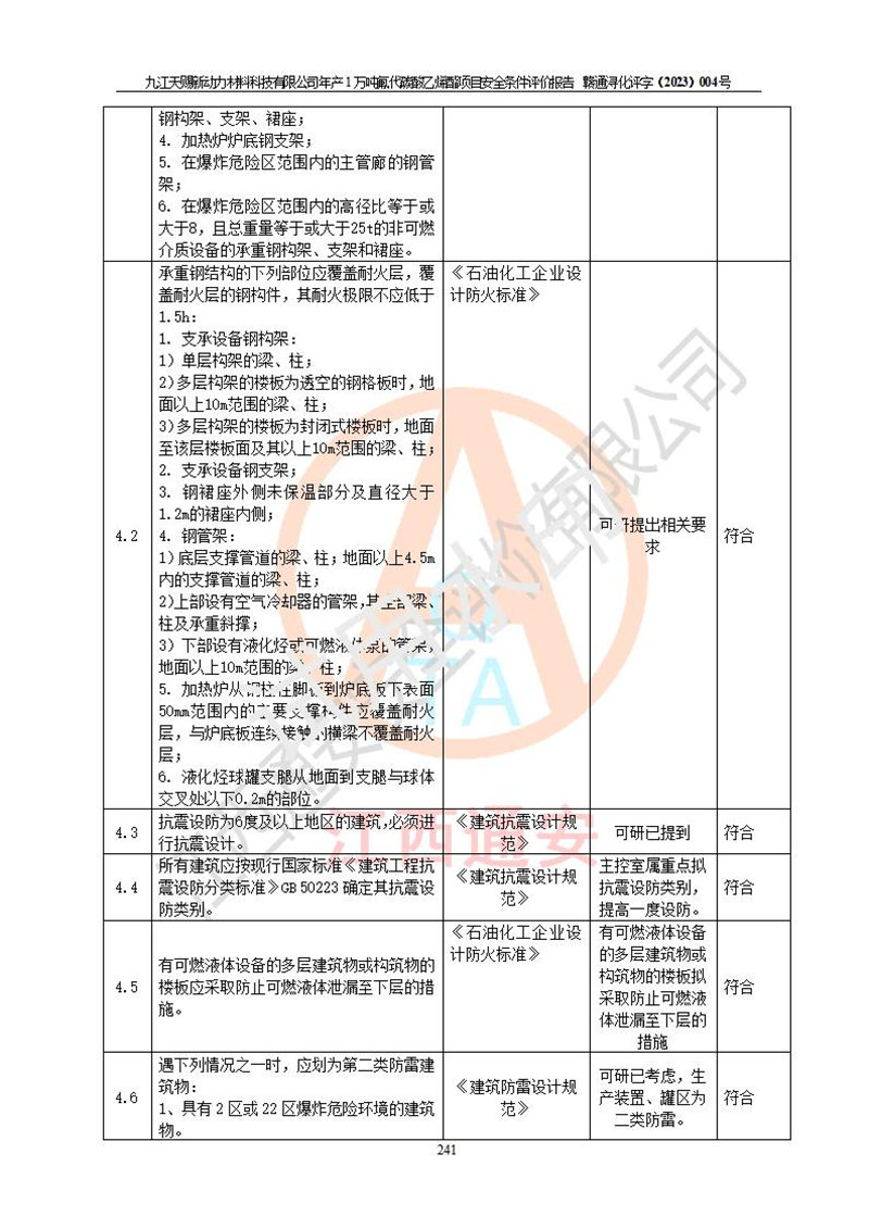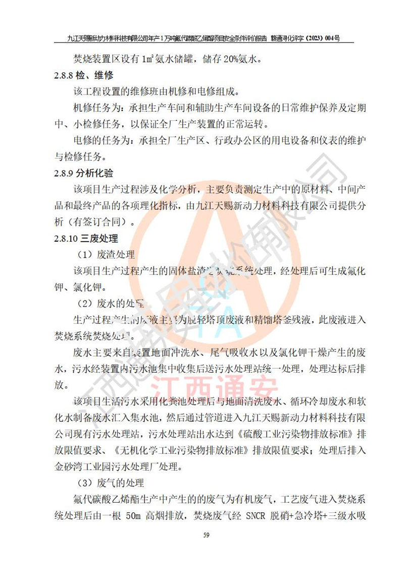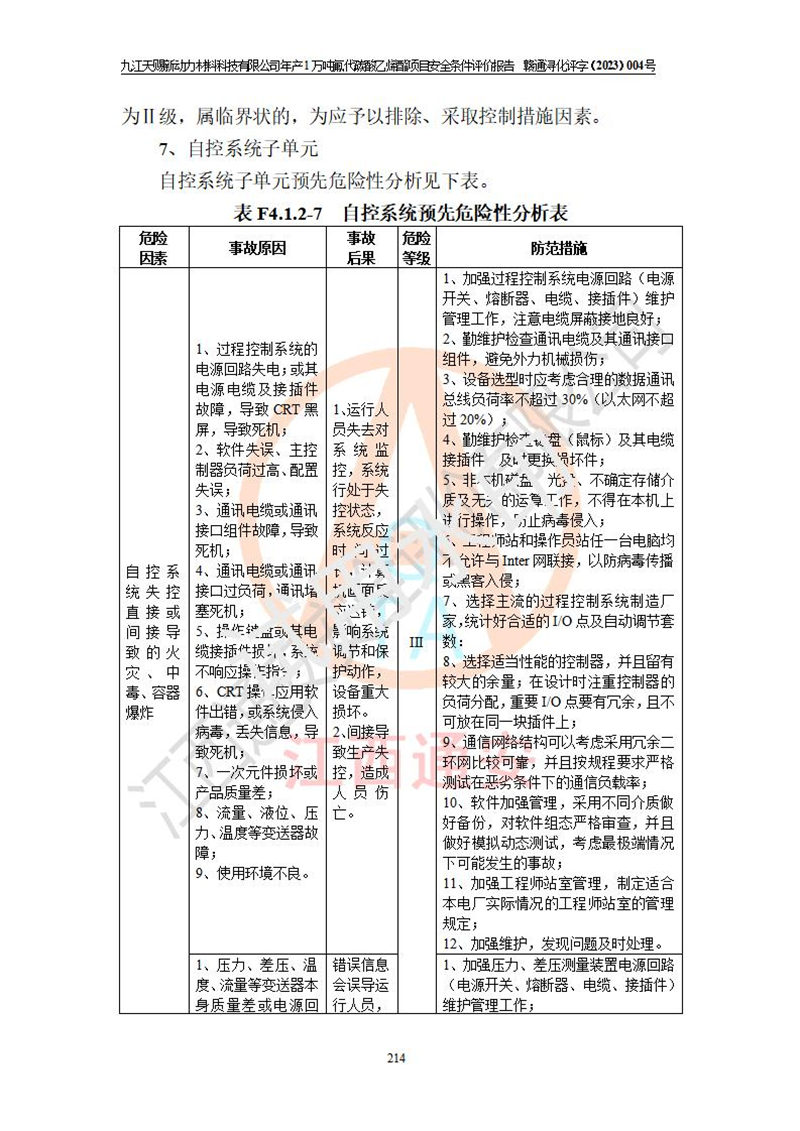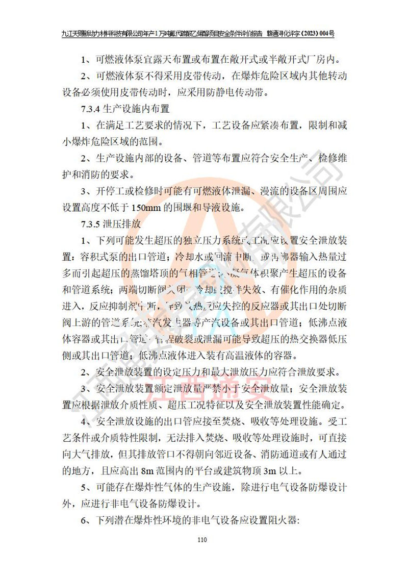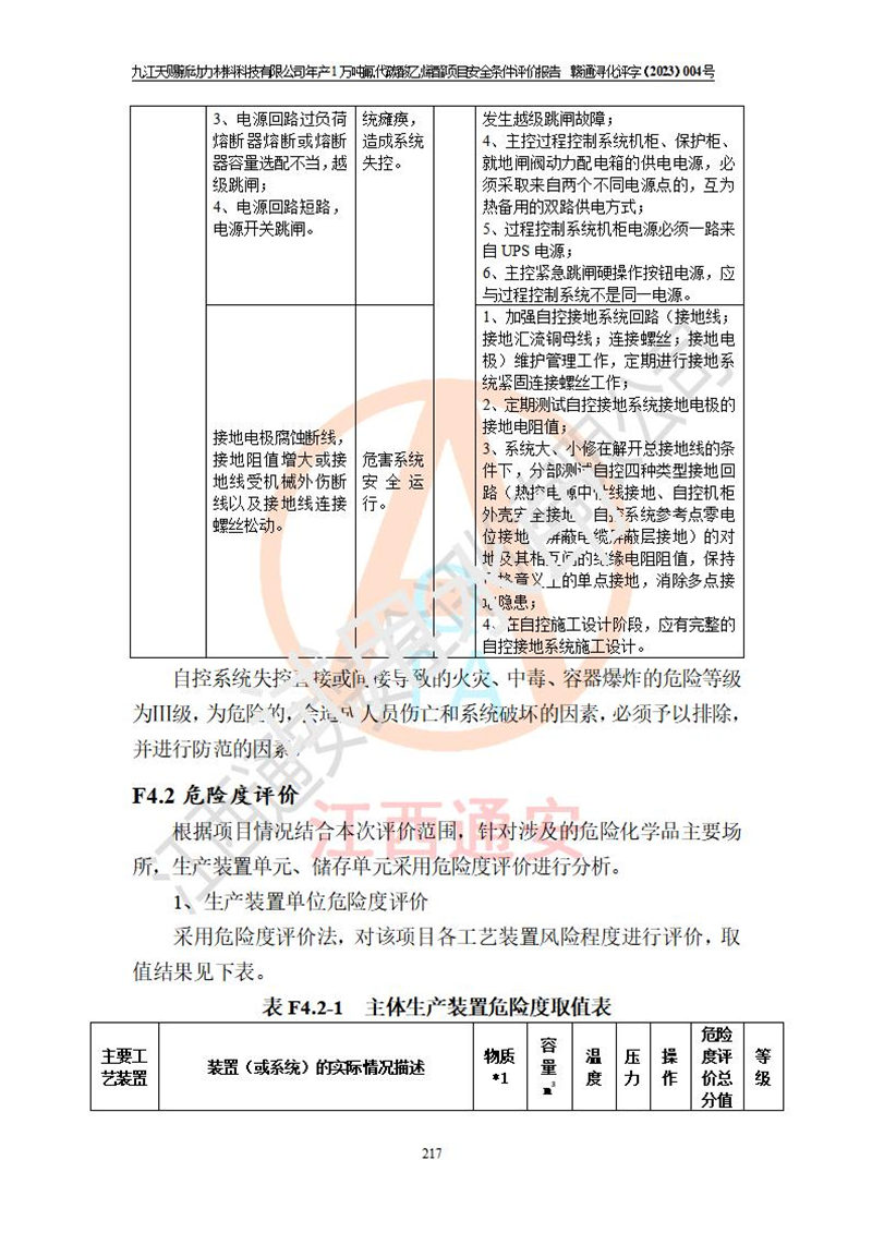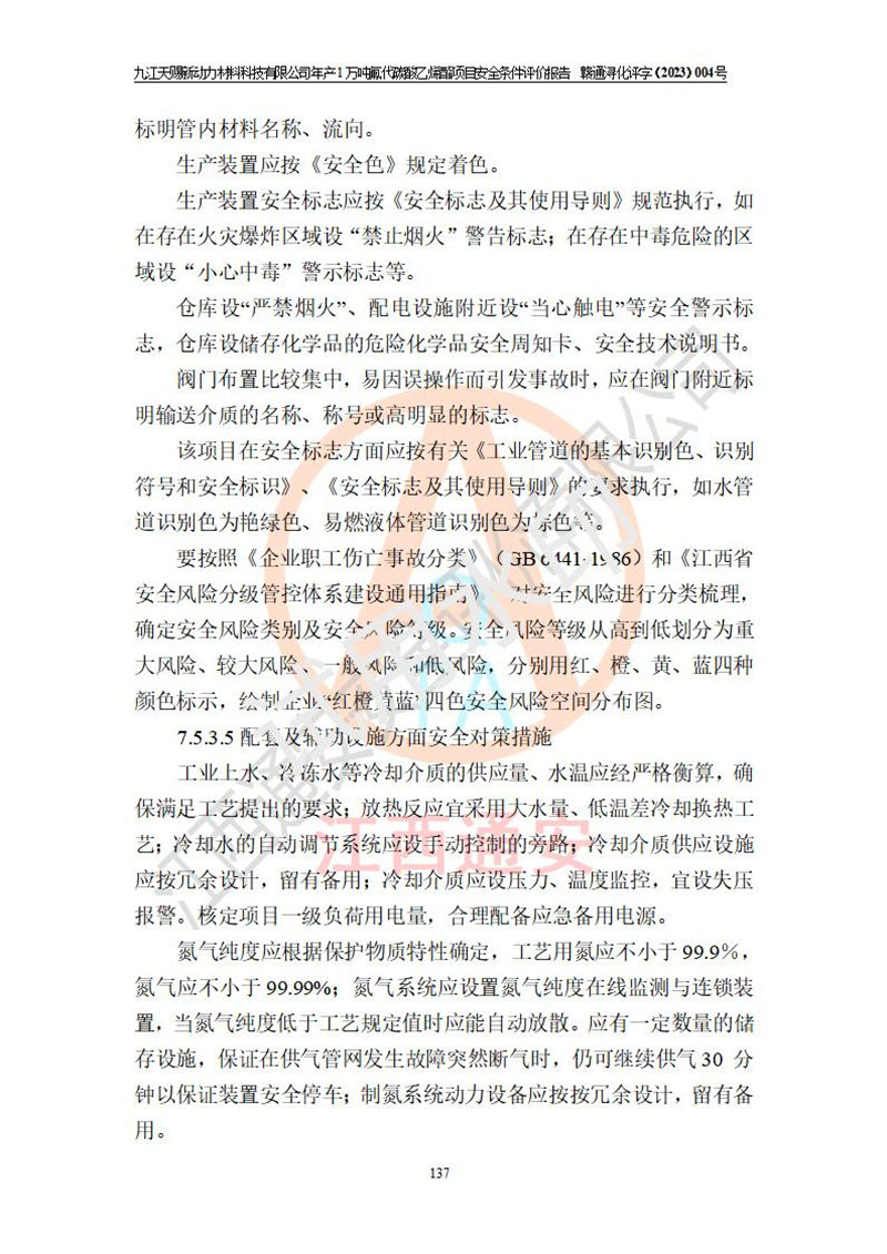 評價結(jié)論 | 九江天賜新動力材料科技有限公司年產(chǎn)1萬噸氟代碳酸乙烯酯項目安全條件、廠址、總體布局、主要技術(shù)和工藝、裝置、設(shè)施、配套和輔助工程、安全管理等均滿足安全生產(chǎn)相關(guān)法律法規(guī)、標(biāo)準(zhǔn)規(guī)范的要求。該建設(shè)項目的危險、有害因素可得到**控制,風(fēng)險在可接受范圍內(nèi),具有**的本質(zhì)安 全水平。企業(yè)應(yīng)認(rèn)真落實本報告提出的安全對策與建議,在下一步設(shè)計、建設(shè)施工過程中嚴(yán)把質(zhì)量關(guān)、嚴(yán)格施工安全管理和檢查,使各項安全措施落實到實處,且嚴(yán)格執(zhí)行建設(shè)項目安全設(shè)施“三同時”的規(guī)定,建立**的事故應(yīng)急體系和措施。 | ||||