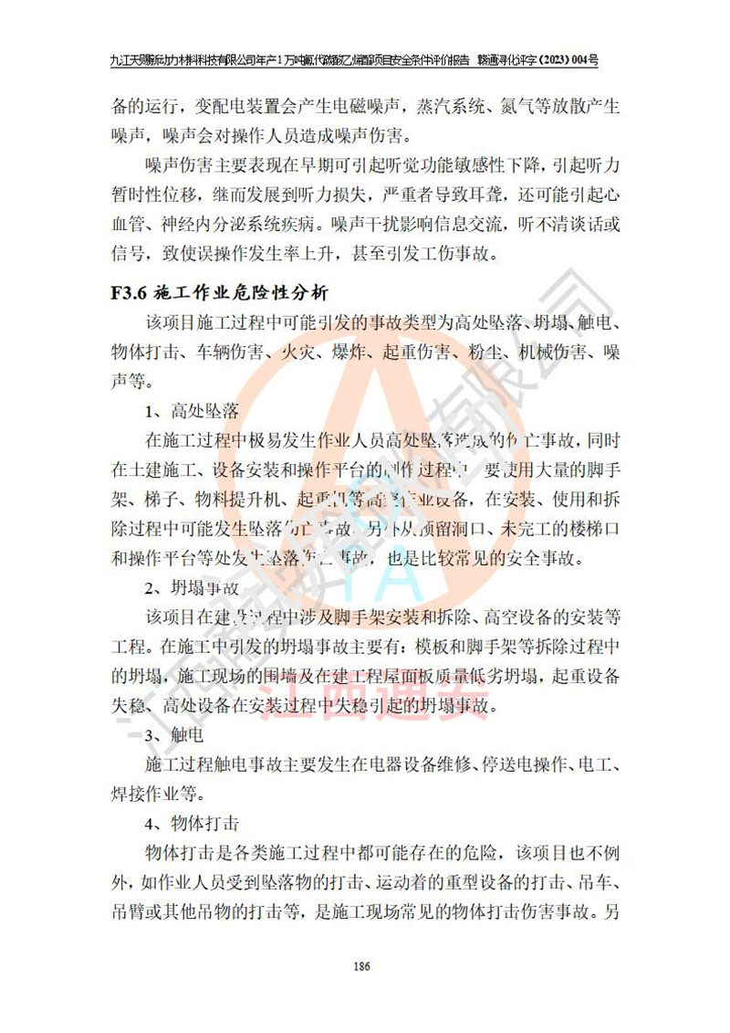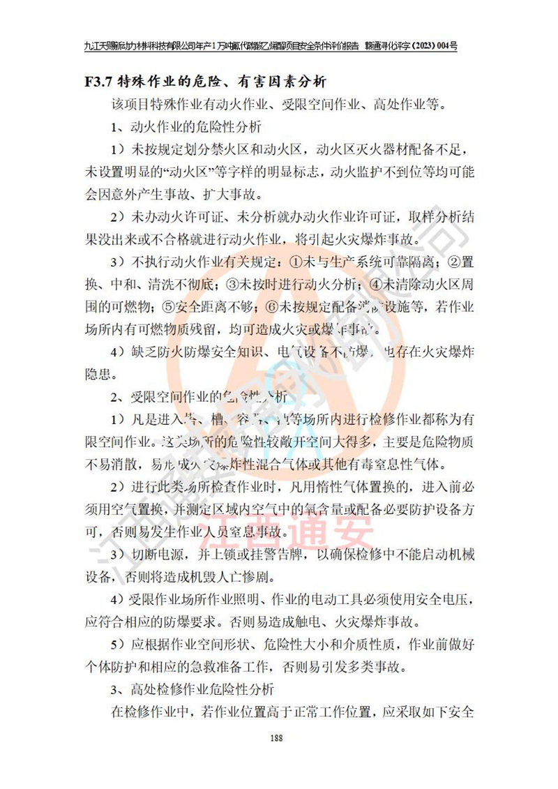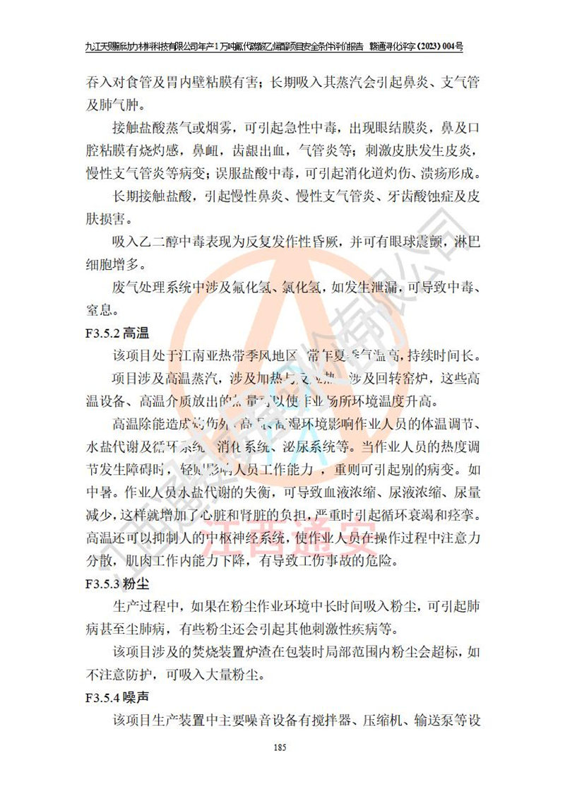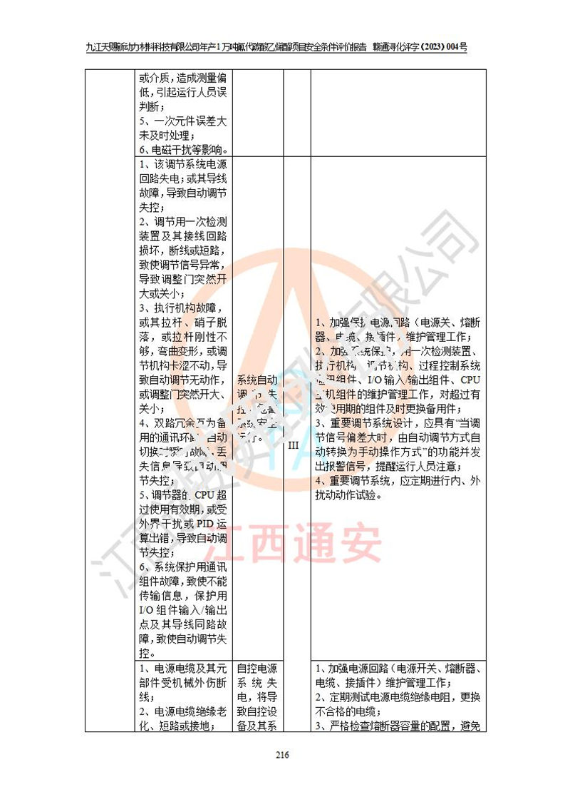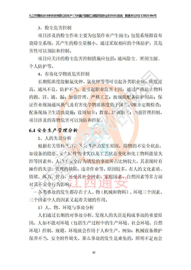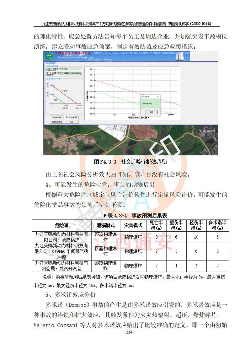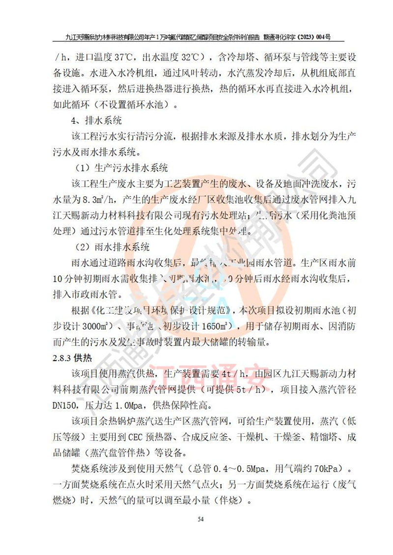 評價結(jié)論 | 九江天賜新動力材料科技有限公司年產(chǎn)1萬噸氟代碳酸乙烯酯項目安全條件、廠址、總體布局、主要技術(shù)和工藝、裝置、設(shè)施、配套和輔助工程、安全管理等均滿足安全生產(chǎn)相關(guān)法律法規(guī)、標(biāo)準(zhǔn)規(guī)范的要求。該建設(shè)項目的危險、有害因素可得到**控制,風(fēng)險在可接受范圍內(nèi),具有**的本質(zhì)安 全水平。企業(yè)應(yīng)認(rèn)真落實本報告提出的安全對策與建議,在下一步設(shè)計、建設(shè)施工過程中嚴(yán)把質(zhì)量關(guān)、嚴(yán)格施工安全管理和檢查,使各項安全措施落實到實處,且嚴(yán)格執(zhí)行建設(shè)項目安全設(shè)施“三同時”的規(guī)定,建立**的事故應(yīng)急體系和措施。 | ||||