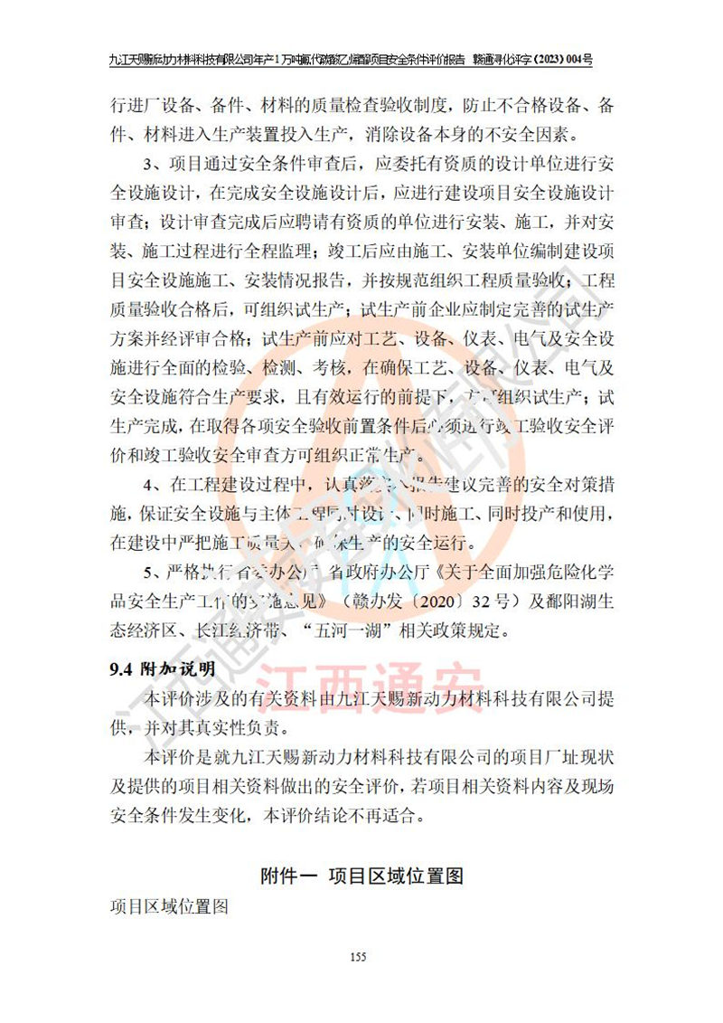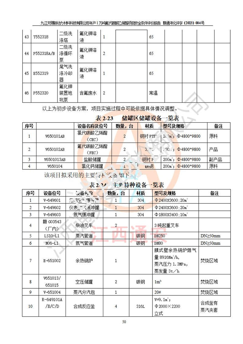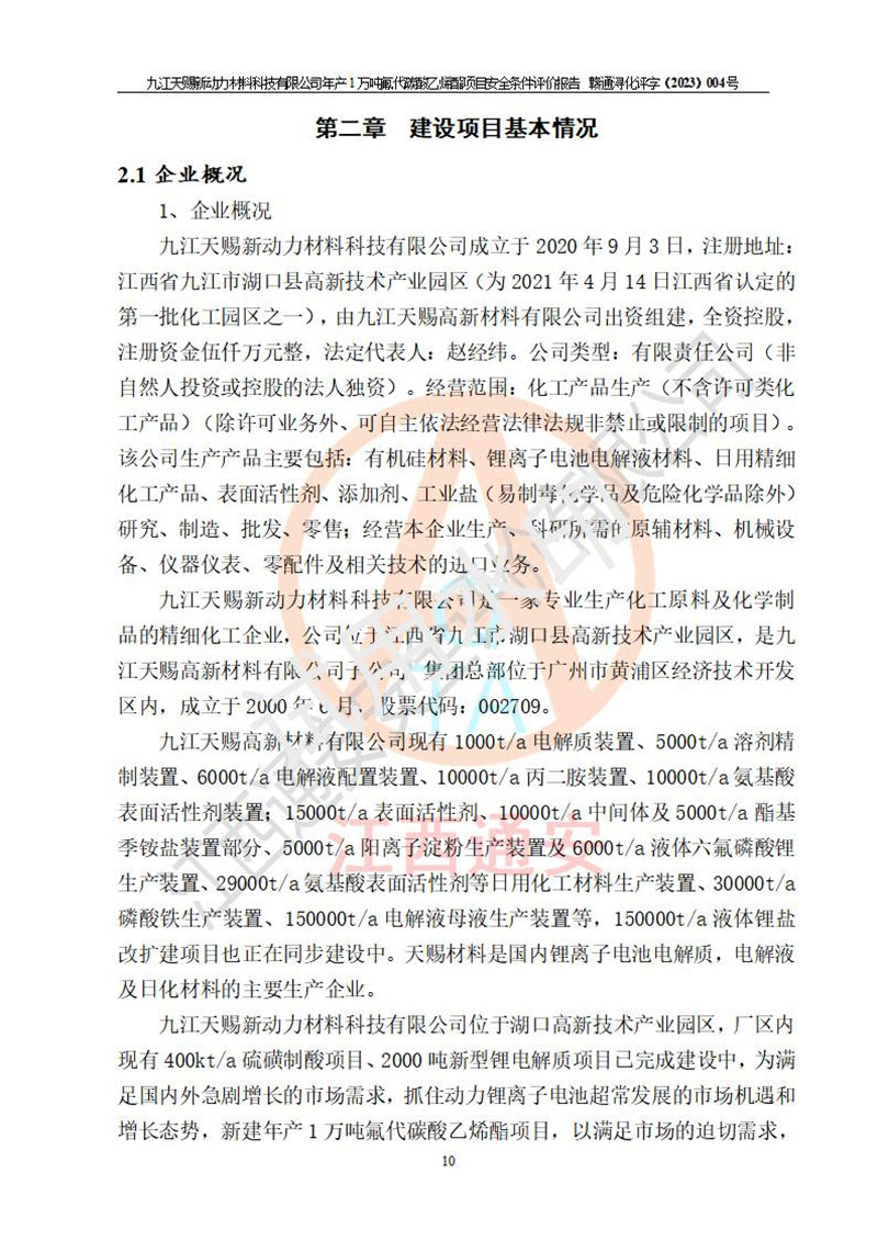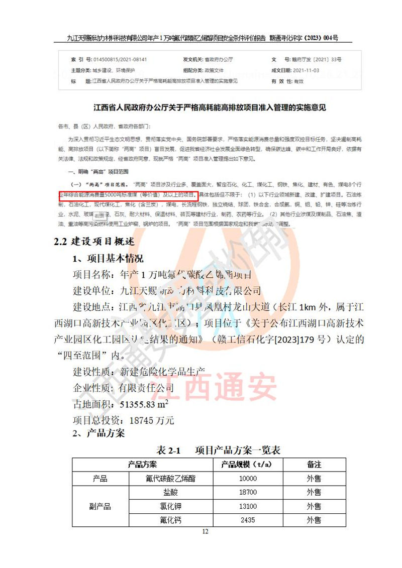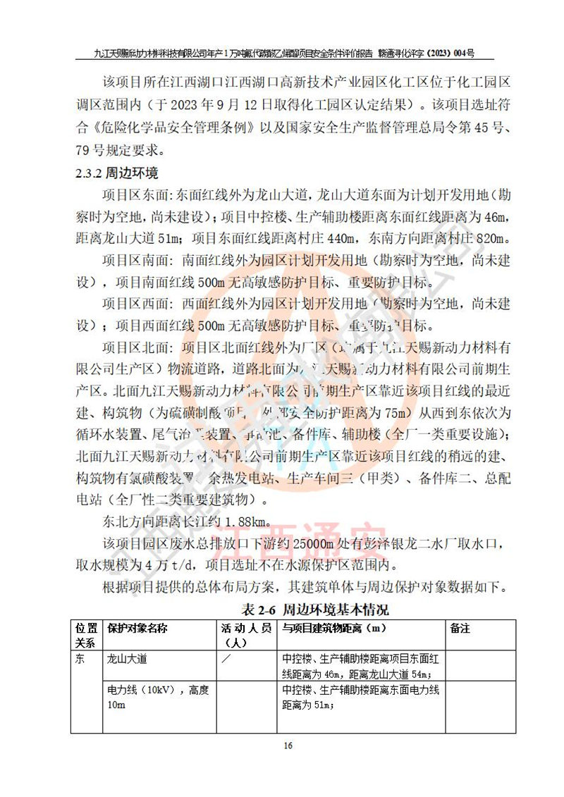 項目簡介 | 項目名稱:年產(chǎn)1萬噸氟代碳酸乙烯酯項目 建設(shè)單位:九江天賜新動力材料科技有限公司 建設(shè)地點:江西省九江市湖口縣鳳凰村龍山大道(長江1km外,屬于江西湖口****產(chǎn)業(yè)園區(qū)化工區(qū));項目位于《關(guān)于公布江西湖口****產(chǎn)業(yè)園區(qū)化工園區(qū)認(rèn)定結(jié)果的通知》(贛工信石化字[2023]179號)認(rèn)定的“四至范圍”內(nèi)。 建設(shè)性質(zhì):新建危險化學(xué)品生產(chǎn) 占地面積:51355.83 m2 項目總投資:18745萬元 | ||||