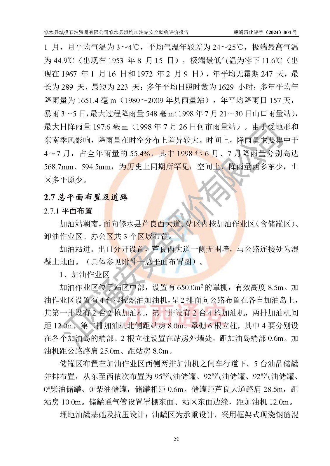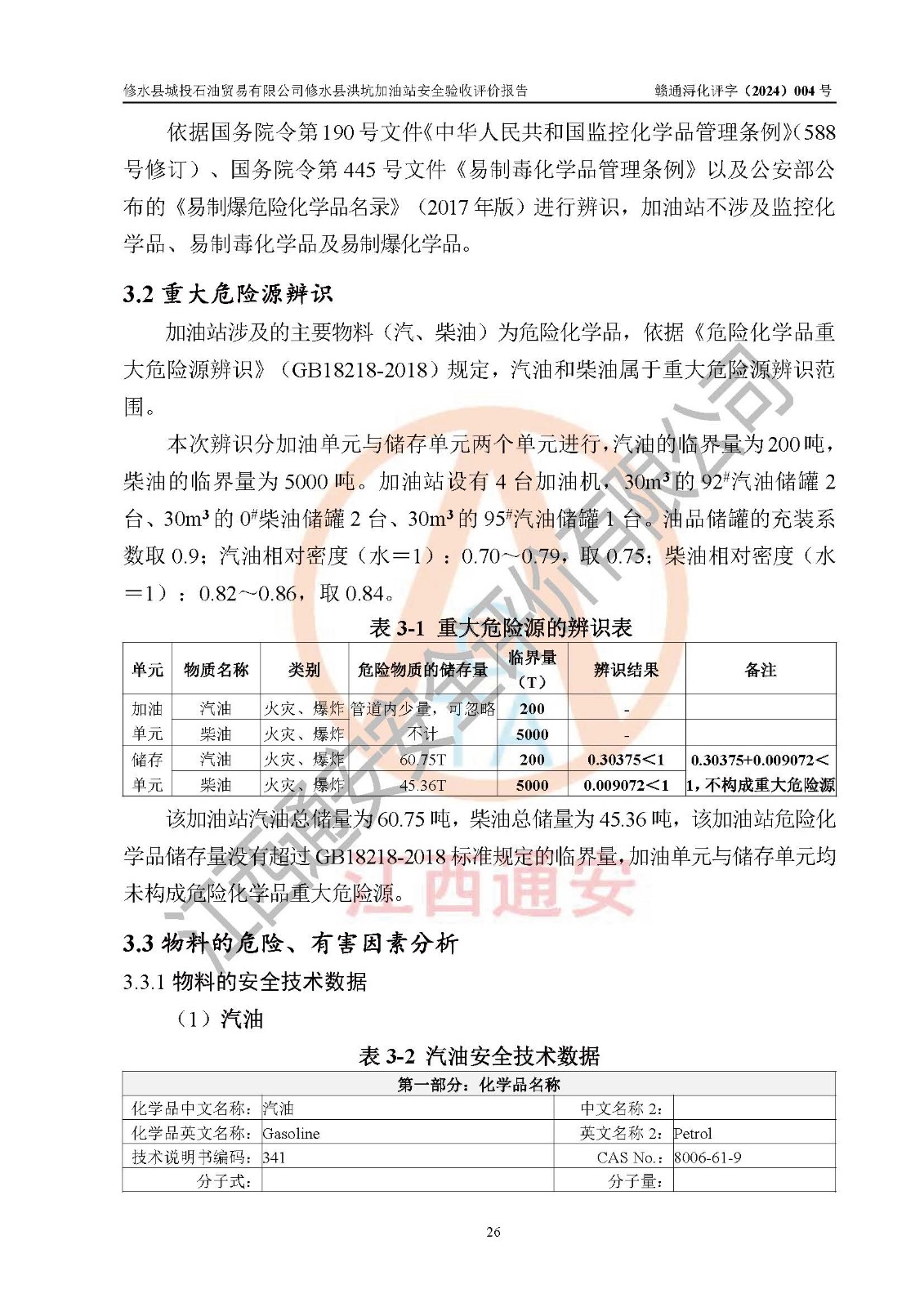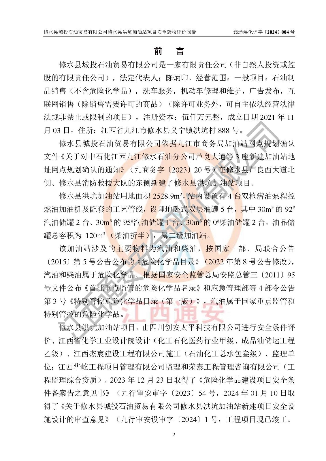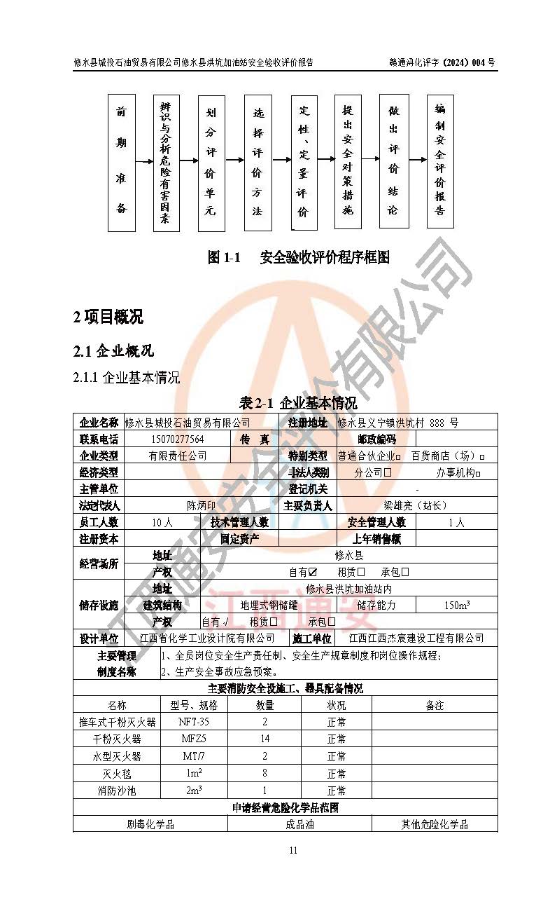 項(xiàng)目簡介 | 修水縣城投石油貿(mào)易有限公司是一家有限責(zé)任公司(非自然人投資或控股的有限責(zé)任公司),法定**人:陳炳印,經(jīng)營范圍:一般項(xiàng)目:石油制品銷售(不含危險(xiǎn)化學(xué)品),洗車服務(wù),機(jī)動(dòng)車修理和維護(hù),廣告發(fā)布,互聯(lián)網(wǎng)銷售(除銷售需要許可的商品)(除許可業(yè)務(wù)外,可自主依法經(jīng)營法律法規(guī)非禁止或限制的項(xiàng)目),注冊資本:伍仟萬元整,成立日期2021年11月03日,住所:江西省九江市修水縣義寧鎮(zhèn)洪坑村888號(hào)。 修水縣城投石油貿(mào)易有限公司依據(jù)九江市商務(wù)局加油站網(wǎng)點(diǎn)規(guī)劃確認(rèn)文件《關(guān)于對(duì)中石化江西九江修水石油分公司蘆良大道等3座新建加油站地址網(wǎng)點(diǎn)規(guī)劃確認(rèn)的通知》(九商務(wù)字〔2023〕20號(hào))在修水縣蘆良西大道北側(cè)、修水縣消防救援大隊(duì)的東側(cè)新建了修水縣洪坑加油站項(xiàng)目。 修水縣洪坑加油站用地面積2528.9m2,站內(nèi)設(shè)置有4臺(tái)雙槍潛油泵程控燃油加油機(jī)及配套的工藝管線,設(shè)埋地臥式雙層油罐5臺(tái),其中30m3的92#汽油儲(chǔ)罐2臺(tái)、30m3的95#汽油儲(chǔ)罐1臺(tái)、30m3的0#柴油儲(chǔ)罐2臺(tái),油品儲(chǔ)罐總?cè)莘e為 120m3(柴油折半),屬二級(jí)加油站。 該加油站涉及的主要物料為汽油和柴油,按**十部、局聯(lián)合公告〔2015〕第5號(hào)公告公布的《危險(xiǎn)化學(xué)品目錄》(2022年第8號(hào)公告修改),汽油和柴油屬于危險(xiǎn)化學(xué)品。根據(jù)**安全監(jiān)管總局安監(jiān)總管三〔2011〕95號(hào)文件公布《首批重點(diǎn)監(jiān)管的危險(xiǎn)化學(xué)品名錄》和應(yīng)急管理部等4部令公告第3號(hào)《特別管控危險(xiǎn)化學(xué)品目錄(**版)》,汽油屬于**重點(diǎn)監(jiān)管和特別管控的危險(xiǎn)化學(xué)品。 修水縣洪坑加油站項(xiàng)目,由四川創(chuàng)安太平科技有限公司進(jìn)行安全條件評(píng)價(jià)、江西省化學(xué)工業(yè)設(shè)計(jì)院設(shè)計(jì)(化工石化醫(yī)藥行業(yè)**、成品油儲(chǔ)運(yùn)工程乙級(jí))、江西杰宸建設(shè)工程有限公司施工(石油化工總承包叁級(jí))、監(jiān)理單位:江西華屹工程項(xiàng)目管理有限公司監(jiān)理和榮泰工程管理咨詢有限公司(工程監(jiān)理綜合資質(zhì))。2023年12月23日取得了《危險(xiǎn)化學(xué)品建設(shè)項(xiàng)目安全條件備案告之意見書》(九行審安審字〔2023〕54號(hào),2024年01月10日取得了《關(guān)于修水縣城投石油貿(mào)易有限公司修水縣洪坑加油站新建項(xiàng)目安全設(shè)施設(shè)計(jì)的審查意見》(九行審安設(shè)審字〔2024〕1號(hào),工程項(xiàng)目現(xiàn)已竣工。 依據(jù)《中華人民共和國安全生產(chǎn)法》、《危險(xiǎn)化學(xué)品建設(shè)項(xiàng)目安全監(jiān)督管理辦法〔2015年修訂〕(安監(jiān)總局令第45號(hào))、《危險(xiǎn)化學(xué)品經(jīng)營許可證管理辦法》(安監(jiān)總局第55號(hào)令)等規(guī)定的要求,新建、改建、擴(kuò)建危險(xiǎn)化學(xué)品安全設(shè)施應(yīng)與主體工程同時(shí)設(shè)計(jì)、同時(shí)施工、同時(shí)投入使用。為檢查加油站新建項(xiàng)目的安全設(shè)施與主體工程是否“三同時(shí)”和在安全經(jīng)營及安全管理方面是否符合**及行業(yè)有關(guān)法律法規(guī)及標(biāo)準(zhǔn)。為**工程項(xiàng)目在安全生產(chǎn)及安全管理方面符合**及行業(yè)有關(guān)法律法規(guī)及標(biāo)準(zhǔn),修水縣洪坑加油站委托江西通安安全評(píng)價(jià)有限公司承擔(dān)該項(xiàng)目的安全驗(yàn)收評(píng)價(jià),為加油站新建項(xiàng)目竣工驗(yàn)收做安全技術(shù)準(zhǔn)備。 江西通安安全評(píng)價(jià)有限公司接受委托后,組織了評(píng)價(jià)組;依據(jù)《安全評(píng)價(jià)通則》(AQ8001-2007)和《安全驗(yàn)收評(píng)價(jià)導(dǎo)則》(AQ8003-2007)的要求,在收集項(xiàng)目相關(guān)的安全對(duì)策措施的具體設(shè)計(jì)、安裝施工情況等資料的基礎(chǔ)上,評(píng)價(jià)組于2023年11月進(jìn)行了現(xiàn)場勘查,對(duì)該項(xiàng)目在設(shè)計(jì)中安全生產(chǎn)保障等內(nèi)容的實(shí)施情況和相關(guān)對(duì)策措施建議的落實(shí)情況和安全設(shè)施、設(shè)備、裝置投入運(yùn)營和使用的情況、安全生產(chǎn)管理措施到位情況、安全生產(chǎn)規(guī)章制度建立健全情況、事故應(yīng)急預(yù)案建立等情況進(jìn)行了檢查,提出加油站現(xiàn)場存在的安全隱患及整改建議。根據(jù)企業(yè)提供的資料,在危險(xiǎn)、有害因素分析基礎(chǔ)上,根據(jù)加油站加油作業(yè)工藝程序、站區(qū)內(nèi)功能區(qū)域特點(diǎn),劃分了評(píng)價(jià)單元;對(duì)劃分的評(píng)價(jià)單元及單元內(nèi)的危險(xiǎn)、有害因素選擇了相應(yīng)的安全評(píng)價(jià)方法逐項(xiàng)進(jìn)行分析、評(píng)價(jià),提出相應(yīng)的預(yù)防和控制對(duì)策措施;在與企業(yè)溝通后編制完成了安全驗(yàn)收評(píng)價(jià)報(bào)告,經(jīng)評(píng)價(jià)公司內(nèi)部五級(jí)審核程序,及加油站現(xiàn)場存在的安全隱患**落實(shí)整改后出具《修水縣洪坑加油站安全驗(yàn)收評(pí