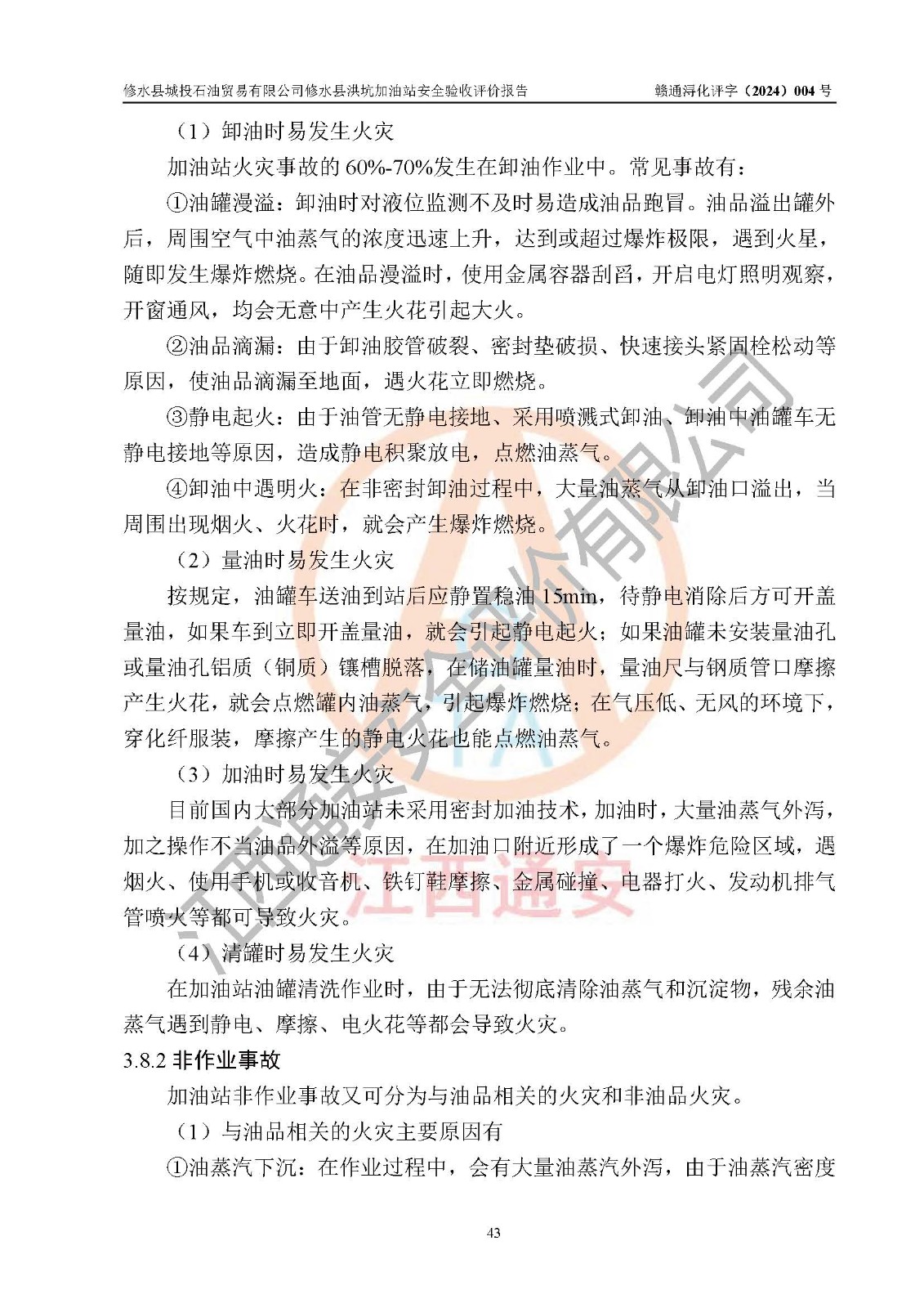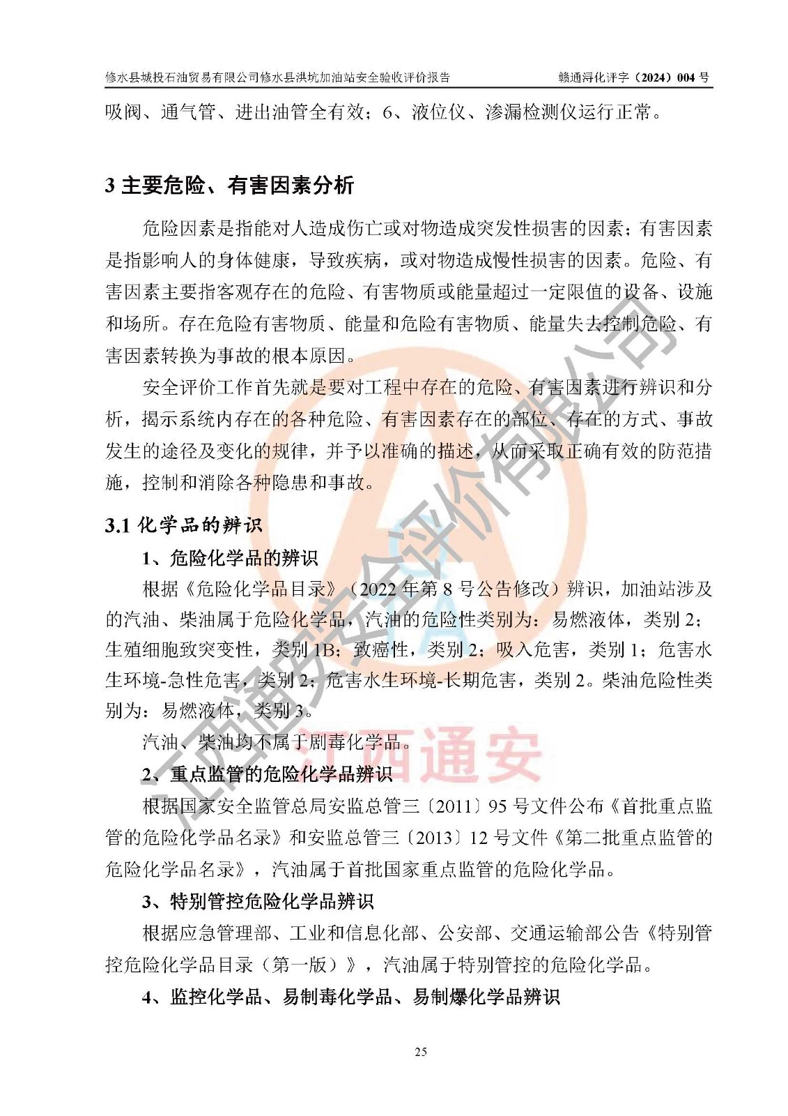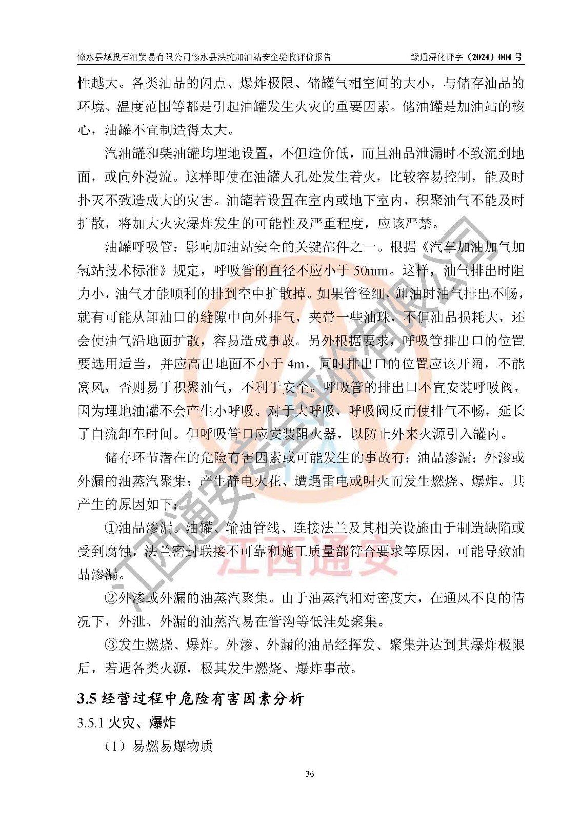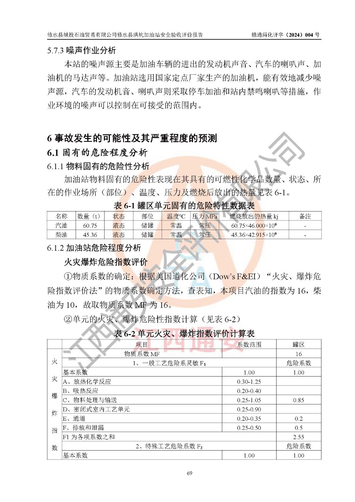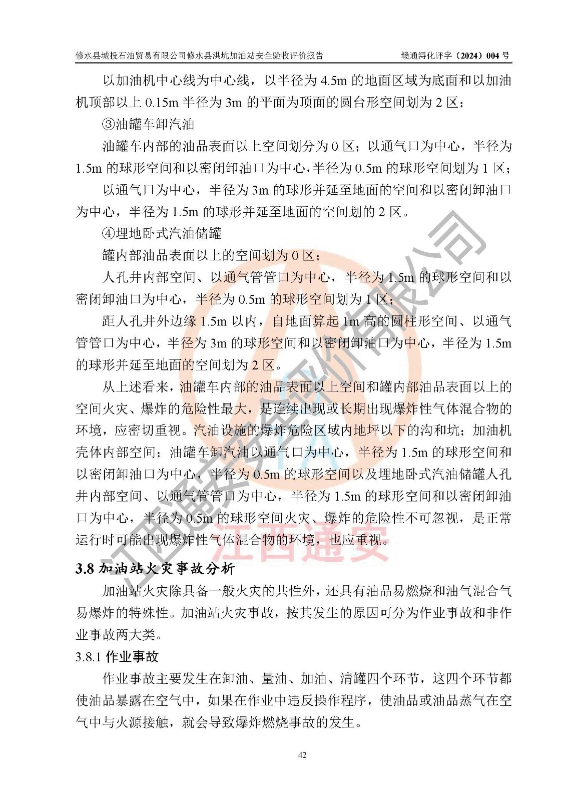 項(xiàng)目簡介 | 修水縣城投石油貿(mào)易有限公司是一家有限責(zé)任公司(非自然人投資或控股的有限責(zé)任公司),法定**人:陳炳印,經(jīng)營范圍:一般項(xiàng)目:石油制品銷售(不含危險(xiǎn)化學(xué)品),洗車服務(wù),機(jī)動(dòng)車修理和維護(hù),廣告發(fā)布,互聯(lián)網(wǎng)銷售(除銷售需要許可的商品)(除許可業(yè)務(wù)外,可自主依法經(jīng)營法律法規(guī)非禁止或限制的項(xiàng)目),注冊資本:伍仟萬元整,成立日期2021年11月03日,住所:江西省九江市修水縣義寧鎮(zhèn)洪坑村888號(hào)。 修水縣城投石油貿(mào)易有限公司依據(jù)九江市商務(wù)局加油站網(wǎng)點(diǎn)規(guī)劃確認(rèn)文件《關(guān)于對(duì)中石化江西九江修水石油分公司蘆良大道等3座新建加油站地址網(wǎng)點(diǎn)規(guī)劃確認(rèn)的通知》(九商務(wù)字〔2023〕20號(hào))在修水縣蘆良西大道北側(cè)、修水縣消防救援大隊(duì)的東側(cè)新建了修水縣洪坑加油站項(xiàng)目。 修水縣洪坑加油站用地面積2528.9m2,站內(nèi)設(shè)置有4臺(tái)雙槍潛油泵程控燃油加油機(jī)及配套的工藝管線,設(shè)埋地臥式雙層油罐5臺(tái),其中30m3的92#汽油儲(chǔ)罐2臺(tái)、30m3的95#汽油儲(chǔ)罐1臺(tái)、30m3的0#柴油儲(chǔ)罐2臺(tái),油品儲(chǔ)罐總?cè)莘e為 120m3(柴油折半),屬二級(jí)加油站。 該加油站涉及的主要物料為汽油和柴油,按**十部、局聯(lián)合公告〔2015〕第5號(hào)公告公布的《危險(xiǎn)化學(xué)品目錄》(2022年第8號(hào)公告修改),汽油和柴油屬于危險(xiǎn)化學(xué)品。根據(jù)**安全監(jiān)管總局安監(jiān)總管三〔2011〕95號(hào)文件公布《首批重點(diǎn)監(jiān)管的危險(xiǎn)化學(xué)品名錄》和應(yīng)急管理部等4部令公告第3號(hào)《特別管控危險(xiǎn)化學(xué)品目錄(**版)》,汽油屬于**重點(diǎn)監(jiān)管和特別管控的危險(xiǎn)化學(xué)品。 修水縣洪坑加油站項(xiàng)目,由四川創(chuàng)安太平科技有限公司進(jìn)行安全條件評(píng)價(jià)、江西省化學(xué)工業(yè)設(shè)計(jì)院設(shè)計(jì)(化工石化醫(yī)藥行業(yè)**、成品油儲(chǔ)運(yùn)工程乙級(jí))、江西杰宸建設(shè)工程有限公司施工(石油化工總承包叁級(jí))、監(jiān)理單位:江西華屹工程項(xiàng)目管理有限公司監(jiān)理和榮泰工程管理咨詢有限公司(工程監(jiān)理綜合資質(zhì))。2023年12月23日取得了《危險(xiǎn)化學(xué)品建設(shè)項(xiàng)目安全條件備案告之意見書》(九行審安審字〔2023〕54號(hào),2024年01月10日取得了《關(guān)于修水縣城投石油貿(mào)易有限公司修水縣洪坑加油站新建項(xiàng)目安全設(shè)施設(shè)計(jì)的審查意見》(九行審安設(shè)審字〔2024〕1號(hào),工程項(xiàng)目現(xiàn)已竣工。 依據(jù)《中華人民共和國安全生產(chǎn)法》、《危險(xiǎn)化學(xué)品建設(shè)項(xiàng)目安全監(jiān)督管理辦法〔2015年修訂〕(安監(jiān)總局令第45號(hào))、《危險(xiǎn)化學(xué)品經(jīng)營許可證管理辦法》(安監(jiān)總局第55號(hào)令)等規(guī)定的要求,新建、改建、擴(kuò)建危險(xiǎn)化學(xué)品安全設(shè)施應(yīng)與主體工程同時(shí)設(shè)計(jì)、同時(shí)施工、同時(shí)投入使用。為檢查加油站新建項(xiàng)目的安全設(shè)施與主體工程是否“三同時(shí)”和在安全經(jīng)營及安全管理方面是否符合**及行業(yè)有關(guān)法律法規(guī)及標(biāo)準(zhǔn)。為**工程項(xiàng)目在安全生產(chǎn)及安全管理方面符合**及行業(yè)有關(guān)法律法規(guī)及標(biāo)準(zhǔn),修水縣洪坑加油站委托江西通安安全評(píng)價(jià)有限公司承擔(dān)該項(xiàng)目的安全驗(yàn)收評(píng)價(jià),為加油站新建項(xiàng)目竣工驗(yàn)收做安全技術(shù)準(zhǔn)備。 江西通安安全評(píng)價(jià)有限公司接受委托后,組織了評(píng)價(jià)組;依據(jù)《安全評(píng)價(jià)通則》(AQ8001-2007)和《安全驗(yàn)收評(píng)價(jià)導(dǎo)則》(AQ8003-2007)的要求,在收集項(xiàng)目相關(guān)的安全對(duì)策措施的具體設(shè)計(jì)、安裝施工情況等資料的基礎(chǔ)上,評(píng)價(jià)組于2023年11月進(jìn)行了現(xiàn)場勘查,對(duì)該項(xiàng)目在設(shè)計(jì)中安全生產(chǎn)保障等內(nèi)容的實(shí)施情況和相關(guān)對(duì)策措施建議的落實(shí)情況和安全設(shè)施、設(shè)備、裝置投入運(yùn)營和使用的情況、安全生產(chǎn)管理措施到位情況、安全生產(chǎn)規(guī)章制度建立健全情況、事故應(yīng)急預(yù)案建立等情況進(jìn)行了檢查,提出加油站現(xiàn)場存在的安全隱患及整改建議。根據(jù)企業(yè)提供的資料,在危險(xiǎn)、有害因素分析基礎(chǔ)上,根據(jù)加油站加油作業(yè)工藝程序、站區(qū)內(nèi)功能區(qū)域特點(diǎn),劃分了評(píng)價(jià)單元;對(duì)劃分的評(píng)價(jià)單元及單元內(nèi)的危險(xiǎn)、有害因素選擇了相應(yīng)的安全評(píng)價(jià)方法逐項(xiàng)進(jìn)行分析、評(píng)價(jià),提出相應(yīng)的預(yù)防和控制對(duì)策措施;在與企業(yè)溝通后編制完成了安全驗(yàn)收評(píng)價(jià)報(bào)告,經(jīng)評(píng)價(jià)公司內(nèi)部五級(jí)審核程序,及加油站現(xiàn)場存在的安全隱患**落實(shí)整改后出具《修水縣洪坑加油站安全驗(yàn)收評(pí