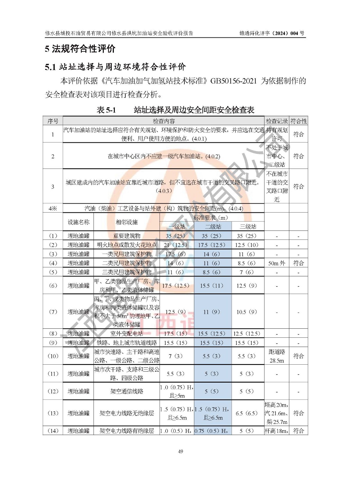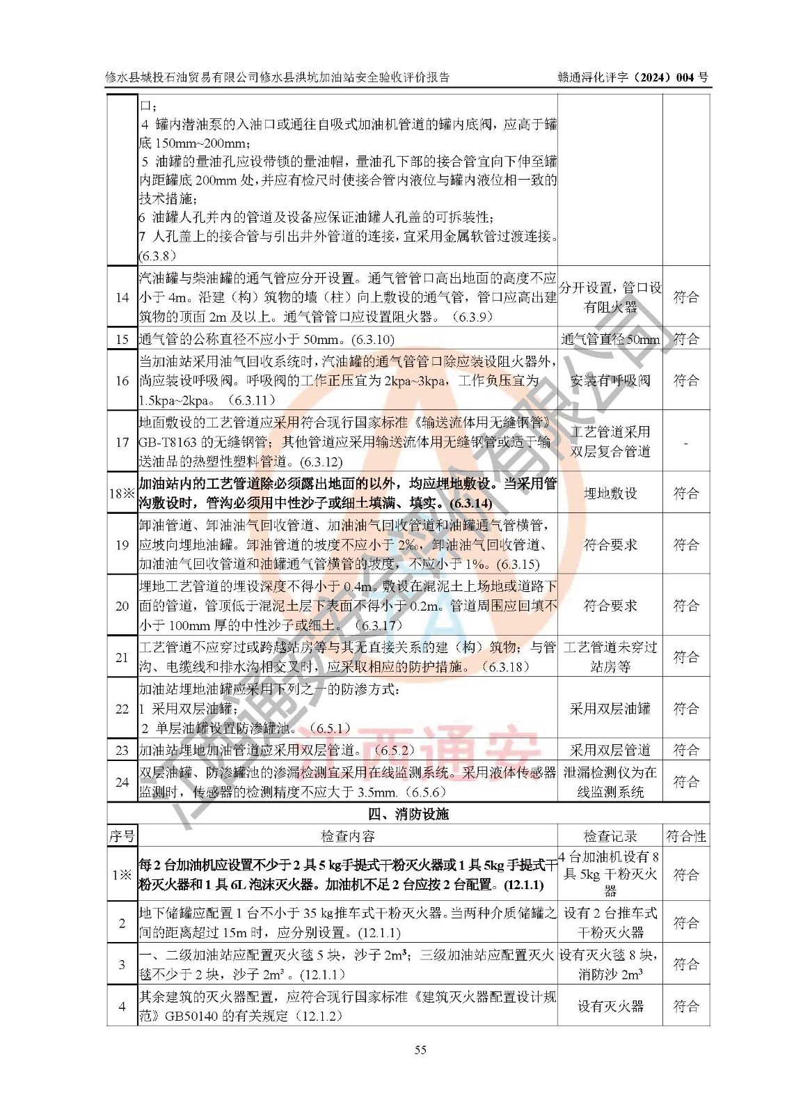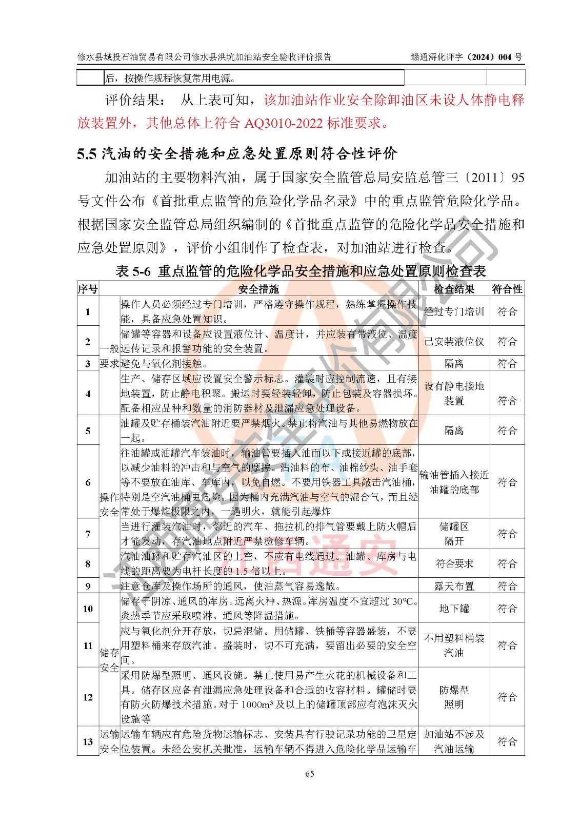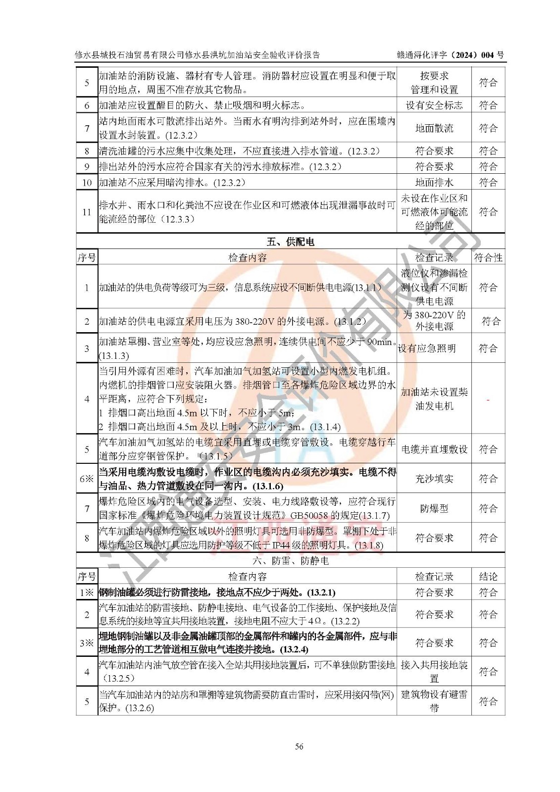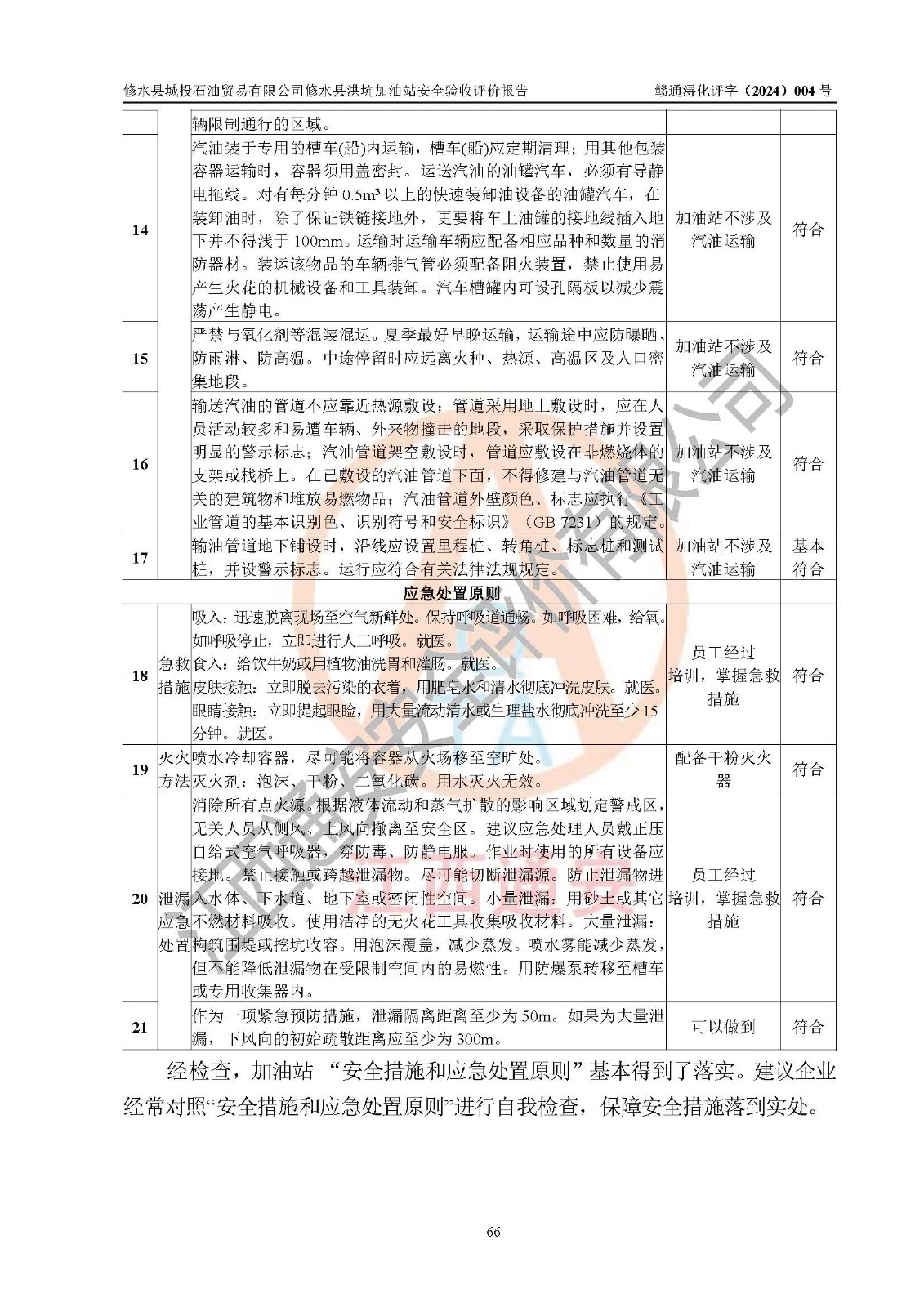 評(píng)價(jià)結(jié)論 | 綜上所述:修水縣城投石油貿(mào)易有限公司修水縣洪坑加油站涉及的安全條件、安全經(jīng)營條件、安全生產(chǎn)管理符合《危險(xiǎn)化學(xué)品經(jīng)營許可證管理辦法》、《汽車加油加氣加氫站技術(shù)標(biāo)準(zhǔn)》等**有關(guān)法規(guī)、標(biāo)準(zhǔn)、規(guī)范要求,能滿足危險(xiǎn)化學(xué)品經(jīng)營安全條件。 | ||||||