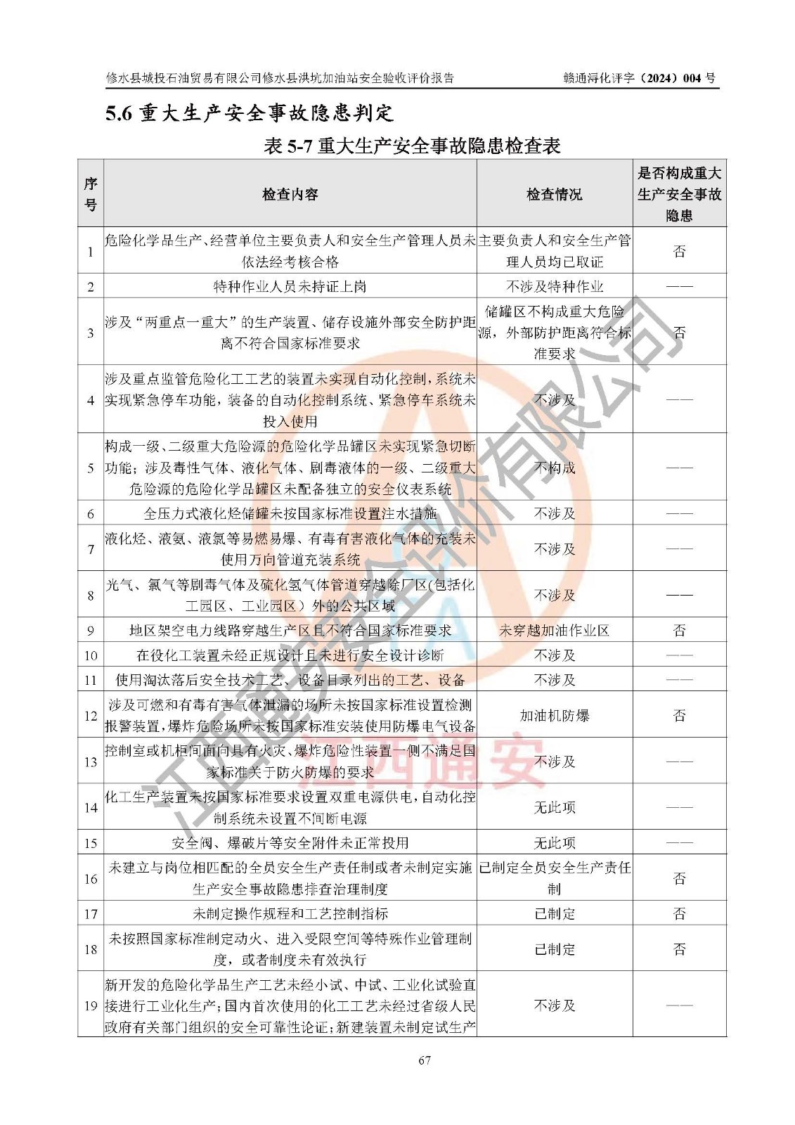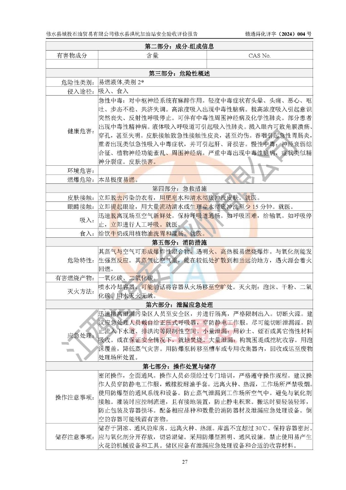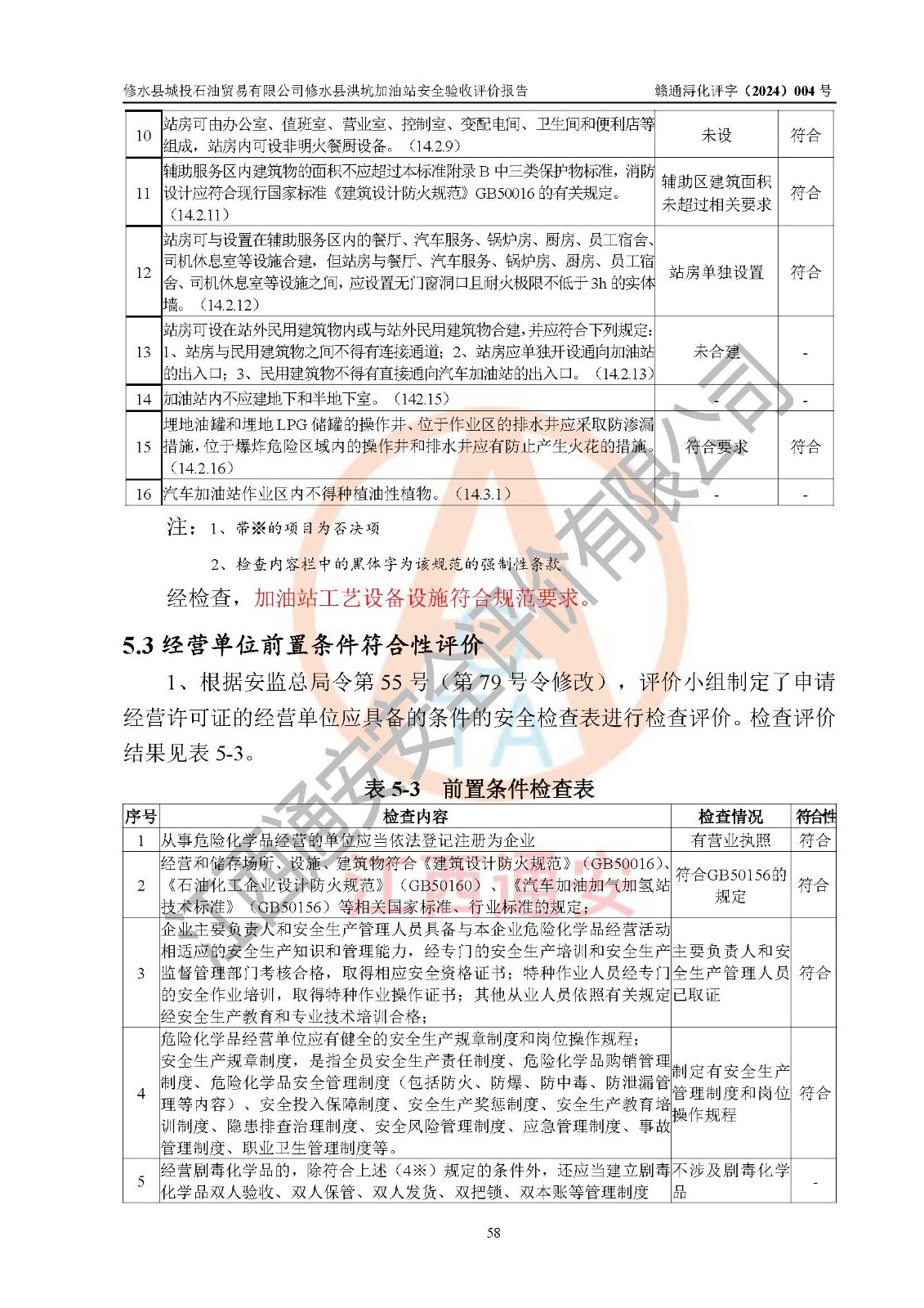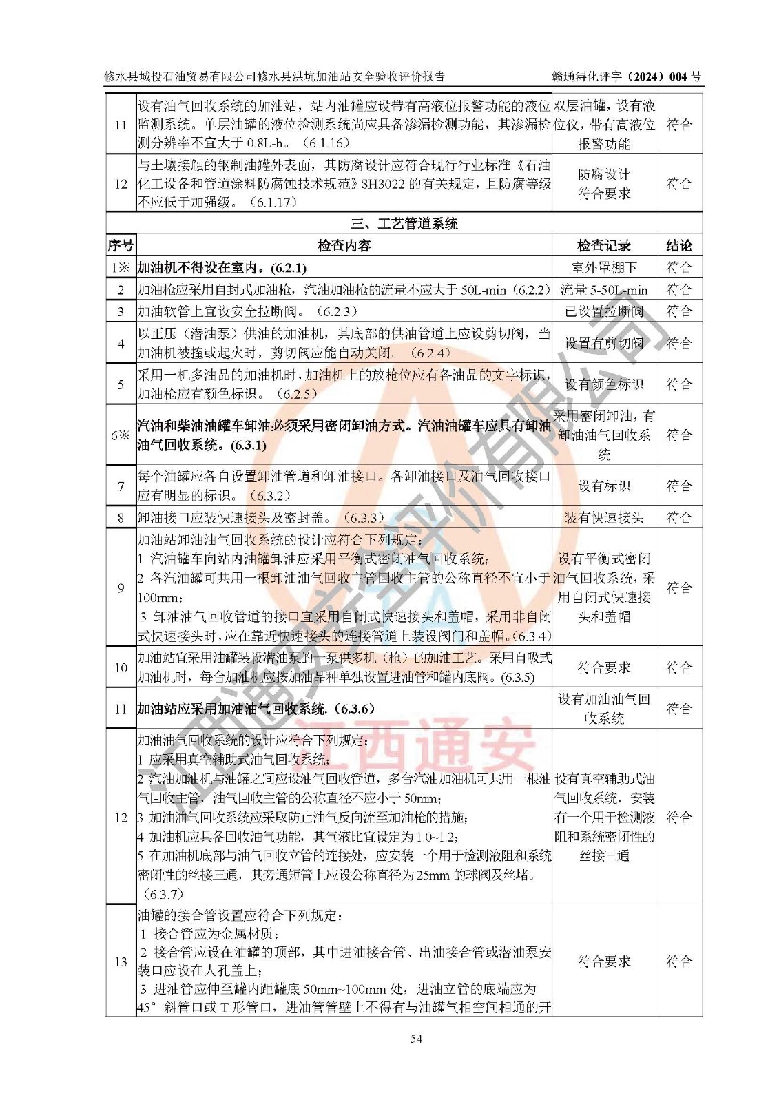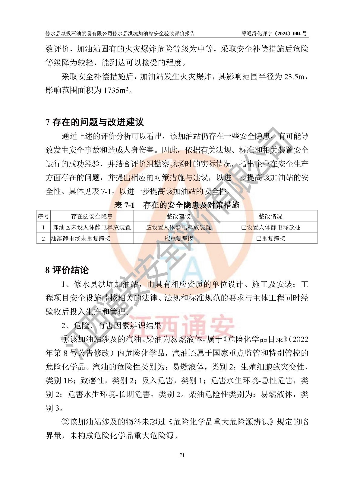 評(píng)價(jià)結(jié)論 | 綜上所述:修水縣城投石油貿(mào)易有限公司修水縣洪坑加油站涉及的安全條件、安全經(jīng)營條件、安全生產(chǎn)管理符合《危險(xiǎn)化學(xué)品經(jīng)營許可證管理辦法》、《汽車加油加氣加氫站技術(shù)標(biāo)準(zhǔn)》等**有關(guān)法規(guī)、標(biāo)準(zhǔn)、規(guī)范要求,能滿足危險(xiǎn)化學(xué)品經(jīng)營安全條件。 | ||||||