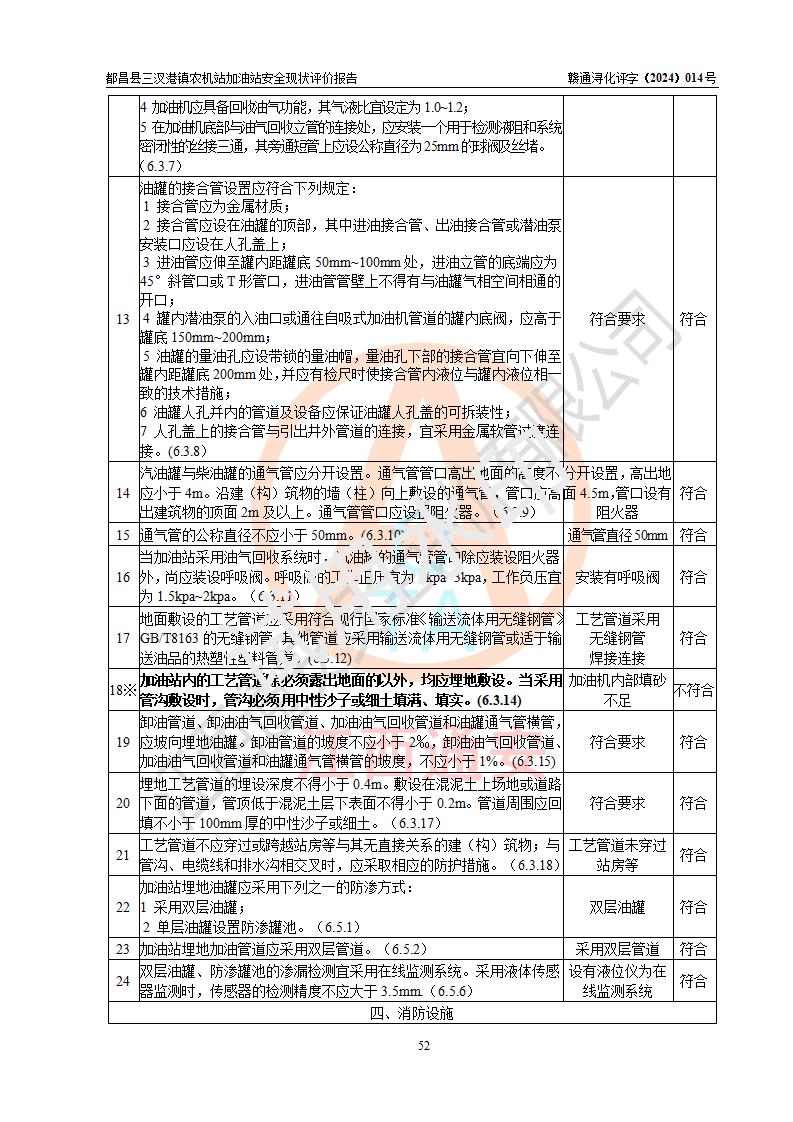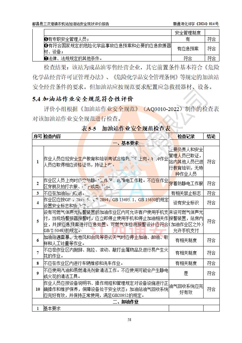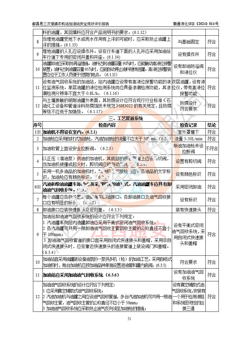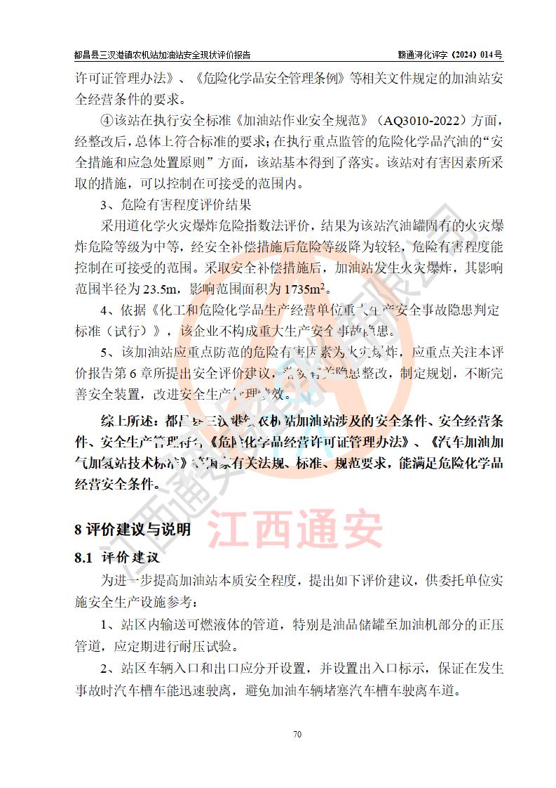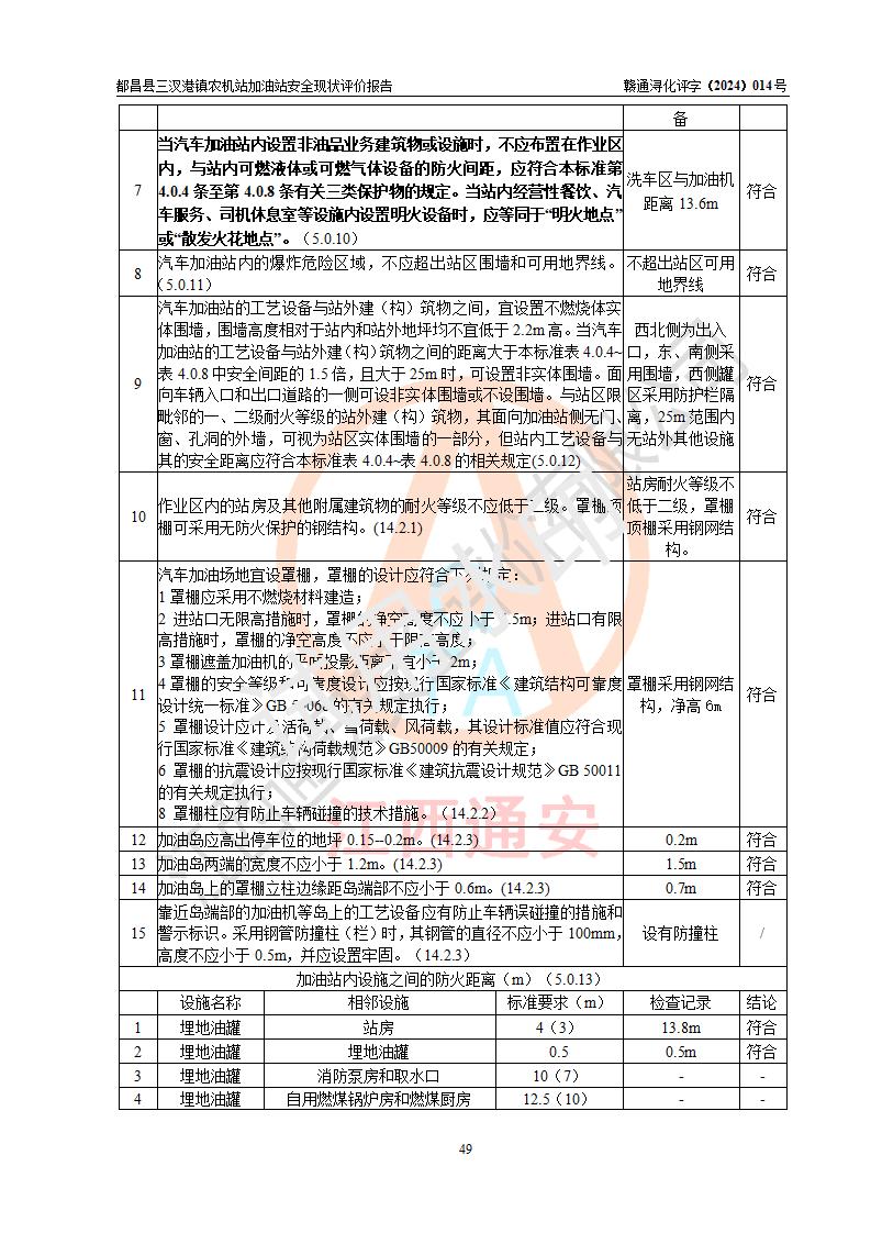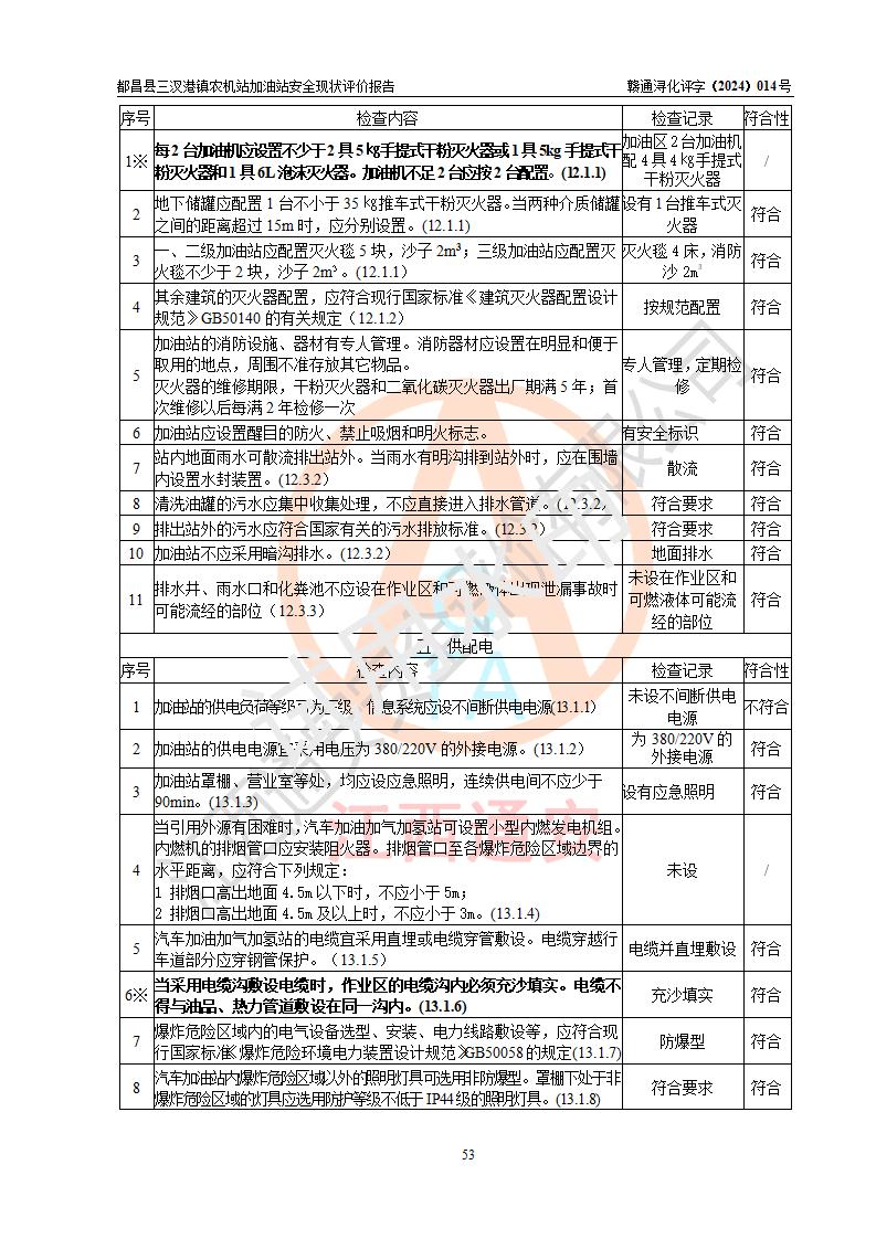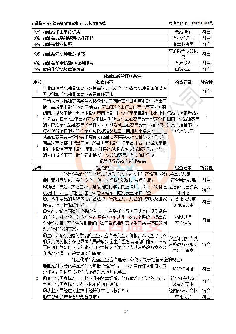 評價結論 | 都昌縣三汊港鎮(zhèn)農機站加油站涉及的安全條件、安全經(jīng)營條件、安全生產(chǎn)管理符合《危險化學品經(jīng)營許可證管理辦法》、《汽車加油加氣加氫站技術標準》等**有關法規(guī)、標準、規(guī)范要求,能滿足危險化學品經(jīng)營安全條件。 | |||