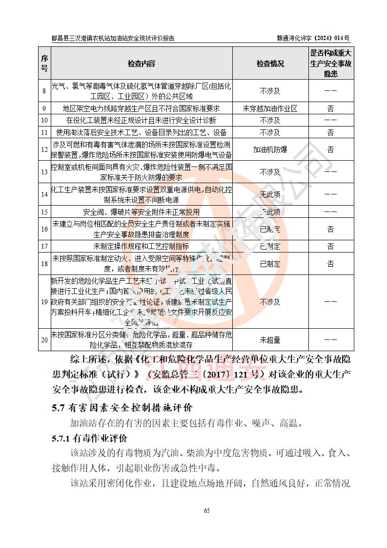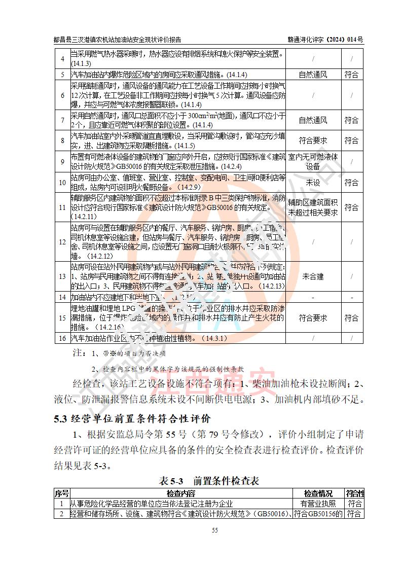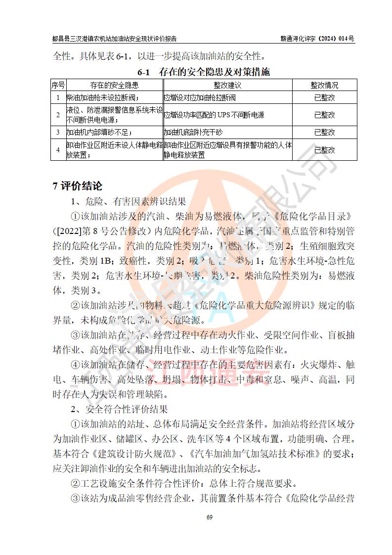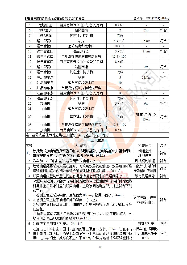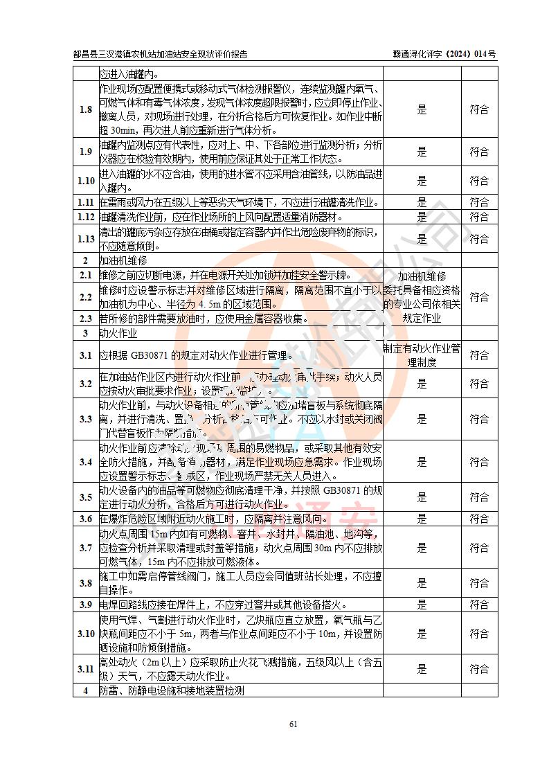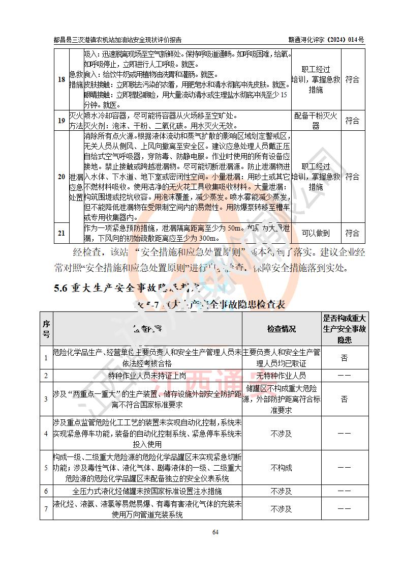 評價結論 | 都昌縣三汊港鎮(zhèn)農機站加油站涉及的安全條件、安全經(jīng)營條件、安全生產(chǎn)管理符合《危險化學品經(jīng)營許可證管理辦法》、《汽車加油加氣加氫站技術標準》等**有關法規(guī)、標準、規(guī)范要求,能滿足危險化學品經(jīng)營安全條件。 | |||