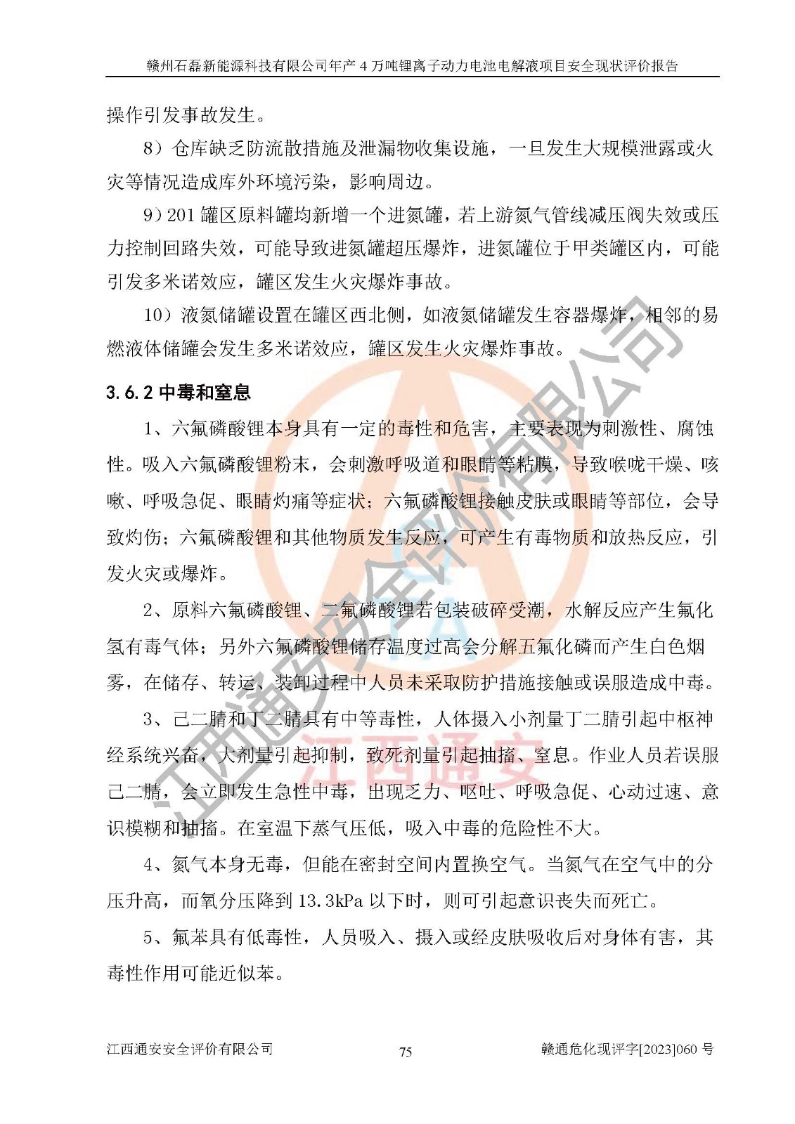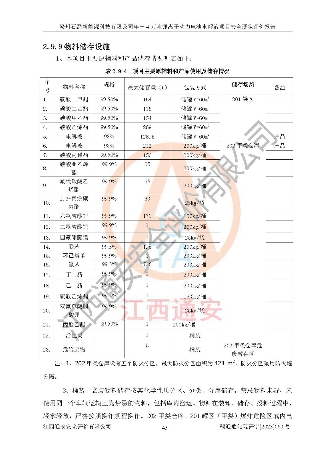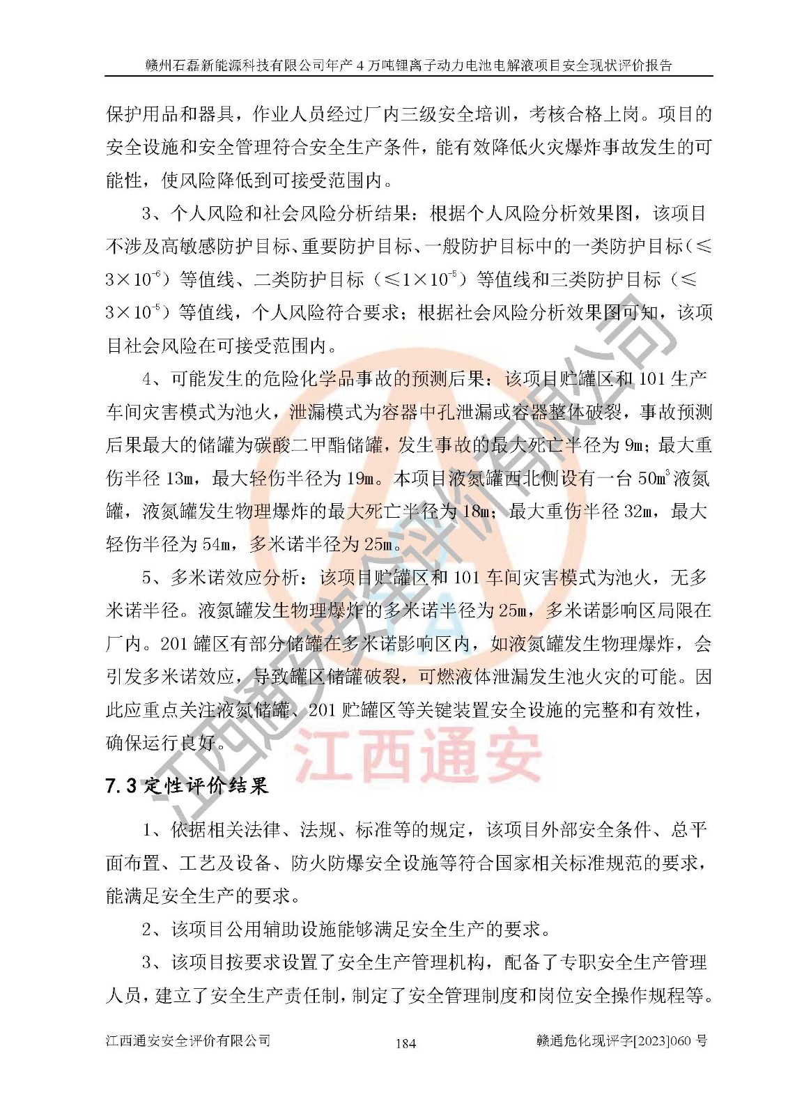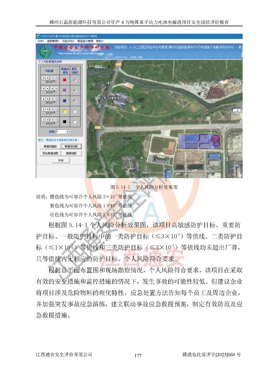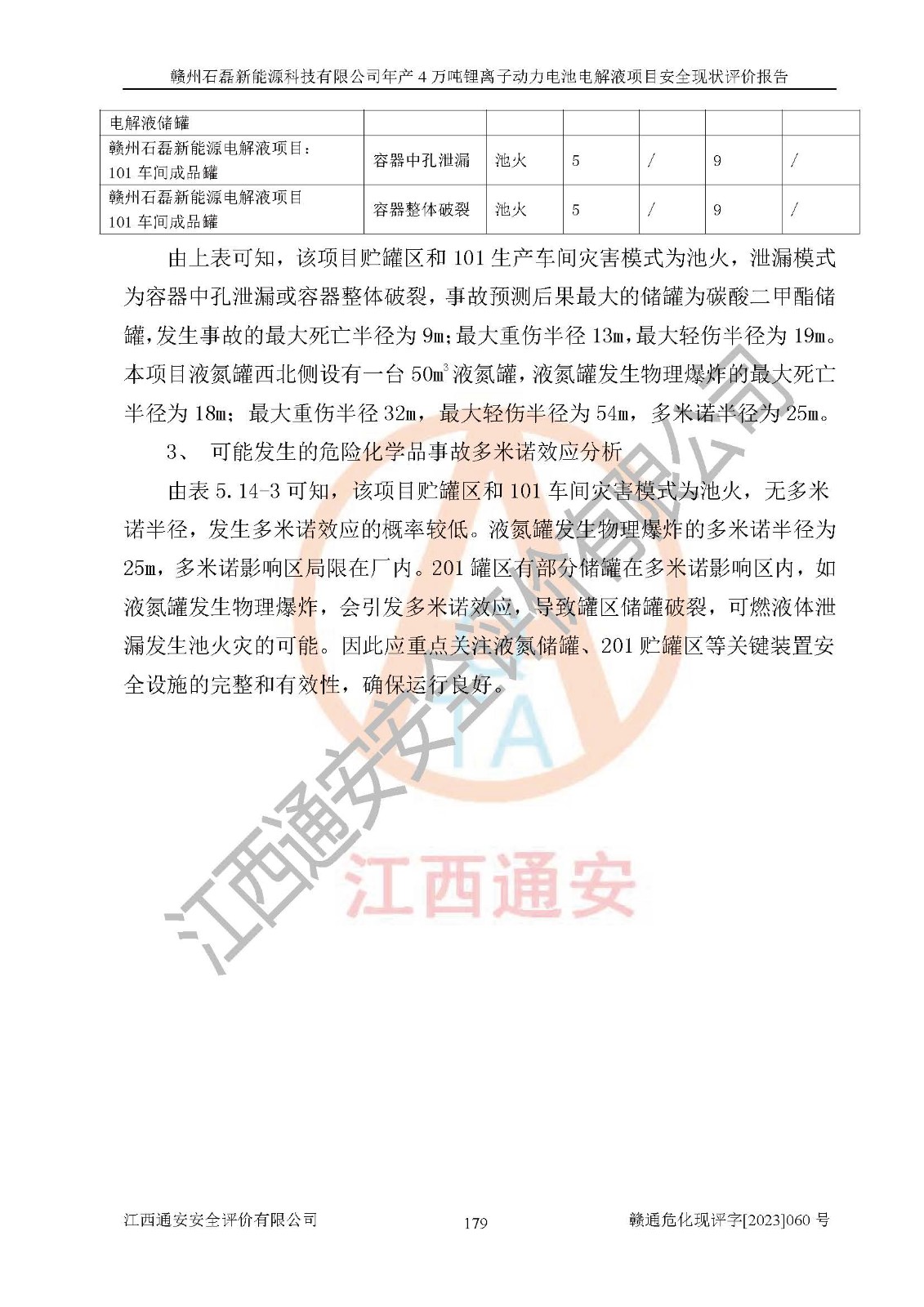 一、安全狀況綜合評(píng)述 1、該項(xiàng)目涉及的原輔材料中碳酸二乙酯、碳酸二甲酯、碳酸甲乙酯、丙酸乙酯、氟苯、丁二腈、己二腈、氮?dú)狻⒙?lián)苯及R22屬于危險(xiǎn)化學(xué)品,產(chǎn)品鋰離子電解液屬于危險(xiǎn)化學(xué)品。 2、該項(xiàng)目生產(chǎn)過(guò)程中存在的危險(xiǎn)、有害因素有:火災(zāi)與爆炸、觸電、中毒與窒息、灼燙、機(jī)械傷害、**傷害、高處墜落、物體打擊和其他傷害等危險(xiǎn)有害因素,其中*主要的危險(xiǎn)有害因素是火災(zāi)與爆炸、中毒與窒息。 3、該項(xiàng)目不涉及監(jiān)控化學(xué)品、易制毒化學(xué)品、易制爆危險(xiǎn)化學(xué)品、劇毒化學(xué)品、重點(diǎn)監(jiān)管危險(xiǎn)化學(xué)品和特別管控的危險(xiǎn)化學(xué)品。 4、該項(xiàng)目不涉及重點(diǎn)監(jiān)管的危險(xiǎn)化工工藝。 5、按照《危險(xiǎn)化學(xué)品重大危險(xiǎn)源辨識(shí)》(GB18218-2018)進(jìn)行辨識(shí),該項(xiàng)目生產(chǎn)單元和儲(chǔ)存單元均不構(gòu)成危險(xiǎn)化學(xué)品重大危險(xiǎn)源。 二、定量評(píng)價(jià)結(jié)果 1、作業(yè)條件危險(xiǎn)性評(píng)價(jià)結(jié)果:在選定的9個(gè)評(píng)價(jià)單元的作業(yè)危險(xiǎn)程度為“一般危險(xiǎn),需要注意”或以下,作業(yè)條件相對(duì)安全。 2、危險(xiǎn)度評(píng)價(jià)結(jié)果:101甲類車間、202甲類倉(cāng)庫(kù)、貯罐區(qū)的危險(xiǎn)程度均為**危險(xiǎn),甲類車間、甲類倉(cāng)庫(kù)和甲類貯罐區(qū)內(nèi)均設(shè)置了可燃?xì)怏w檢測(cè)報(bào)警裝置,并定期進(jìn)行校驗(yàn)**其正常工作。廠內(nèi)建構(gòu)筑物按設(shè)計(jì)要求設(shè)置了防雷防靜電接地裝置,并定期檢驗(yàn);爆炸危險(xiǎn)區(qū)域內(nèi)的電氣設(shè)備采用防爆電機(jī),消防設(shè)施通過(guò)了消防驗(yàn)收,車間生產(chǎn)裝置和儲(chǔ)罐采用密閉化、機(jī)械化和自動(dòng)化,設(shè)備本質(zhì)安全度高,并且應(yīng)在各作業(yè)場(chǎng)所為作業(yè)人員配置了勞動(dòng)保護(hù)用品和器具,作業(yè)人員經(jīng)過(guò)廠內(nèi)三級(jí)安全培訓(xùn),考核合格上崗。項(xiàng)目的安全設(shè)施和安全管理符合安全生產(chǎn)條件,能**降低火災(zāi)爆炸事故發(fā)生的可能性,使風(fēng)險(xiǎn)降低到可接受范圍內(nèi)。 3、個(gè)人風(fēng)險(xiǎn)和社會(huì)風(fēng)險(xiǎn)分析結(jié)果:根據(jù)個(gè)人風(fēng)險(xiǎn)分析效果圖,該項(xiàng)目不涉及高敏感防護(hù)目標(biāo)、重要防護(hù)目標(biāo)、一般防護(hù)目標(biāo)中的一類防護(hù)目標(biāo)(≤3×10-6)等值線、二類防護(hù)目標(biāo)(≤1×10-5)等值線和三類防護(hù)目標(biāo)(≤3×10-5)等值線,個(gè)人風(fēng)險(xiǎn)符合要求;根據(jù)社會(huì)風(fēng)險(xiǎn)分析效果圖可知,該項(xiàng)目社會(huì)風(fēng)險(xiǎn)在可接受范圍內(nèi)。 4、可能發(fā)生的危險(xiǎn)化學(xué)品事故的預(yù)測(cè)后果:該項(xiàng)目貯罐區(qū)和101生產(chǎn)車間災(zāi)害模式為池火,泄漏模式為容器中孔泄漏或容器整體破裂,事故預(yù)測(cè)后果*大的儲(chǔ)罐為碳酸二甲酯儲(chǔ)罐,發(fā)生事故的*大死亡半徑為9m;*大重傷半徑13m,*大輕傷半徑為19m。本項(xiàng)目液氮罐西北側(cè)設(shè)有一臺(tái)50m3液氮罐,液氮罐發(fā)生物理爆炸的*大死亡半徑為18m;*大重傷半徑32m,*大輕傷半徑為54m,多米諾半徑為25m。 5、多米諾效應(yīng)分析:該項(xiàng)目貯罐區(qū)和101車間災(zāi)害模式為池火,無(wú)多米諾半徑。液氮罐發(fā)生物理爆炸的多米諾半徑為25m,多米諾影響區(qū)局限在廠內(nèi)。201罐區(qū)有部分儲(chǔ)罐在多米諾影響區(qū)內(nèi),如液氮罐發(fā)生物理爆炸,會(huì)引發(fā)多米諾效應(yīng),導(dǎo)致罐區(qū)儲(chǔ)罐破裂,可燃液體泄漏發(fā)生池火災(zāi)的可能。因此應(yīng)重點(diǎn)關(guān)注液氮儲(chǔ)罐、201貯罐區(qū)等關(guān)鍵裝置安全設(shè)施的完整和**性,**運(yùn)行良好。 三、定性評(píng)價(jià)結(jié)果 1、依據(jù)相關(guān)法律、法規(guī)、標(biāo)準(zhǔn)等的規(guī)定,該項(xiàng)目外部安全條件、總平面布置、工藝及設(shè)備、防火防爆安全設(shè)施等符合**相關(guān)標(biāo)準(zhǔn)規(guī)范的要求,能滿足安全生產(chǎn)的要求。 2、該項(xiàng)目公用輔助設(shè)施能夠滿足安全生產(chǎn)的要求。 3、該項(xiàng)目按要求設(shè)置了安全生產(chǎn)管理機(jī)構(gòu),配備了專職安全生產(chǎn)管理人員,建立了安全生產(chǎn)責(zé)任制,制定了安全管理制度和崗位安全操作規(guī)程等。該公司修訂了生產(chǎn)安全事故應(yīng)急預(yù)案,配備了應(yīng)急救援器材,按要求定期進(jìn)行相關(guān)培訓(xùn)及演練。 4、該項(xiàng)目不涉及“兩重點(diǎn)一重大”,公司主要負(fù)責(zé)人、安全管理人員經(jīng)培訓(xùn)考核取得了相應(yīng)的安全資格證書。主要負(fù)責(zé)人的專業(yè)和學(xué)歷符合要求,公司任命了許惠彬和王佛金為專職安全管理人員,許惠彬的學(xué)歷和專業(yè)均符合要求,王佛金于2021年9月報(bào)名參加了大專應(yīng)用化工技術(shù)專業(yè)學(xué)歷提升,預(yù)計(jì)2024年1月畢業(yè),屆時(shí)可滿足危險(xiǎn)化學(xué)品企業(yè)重點(diǎn)人員安