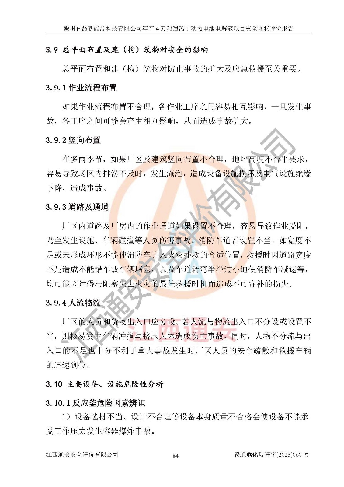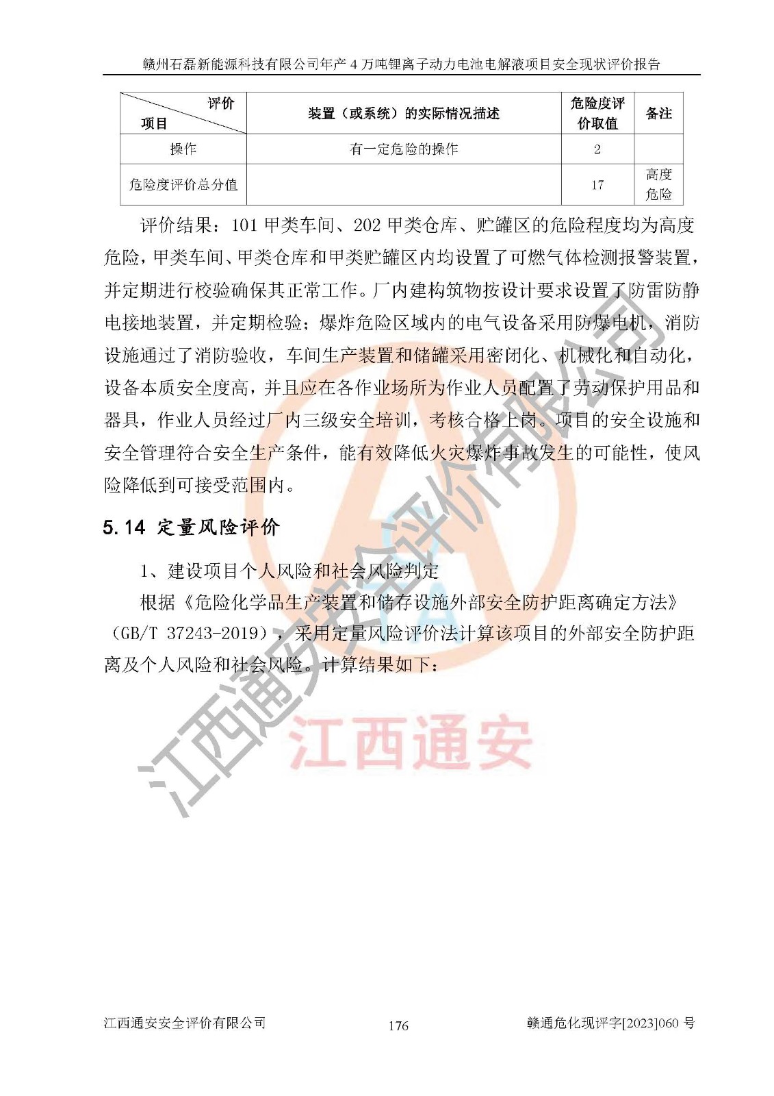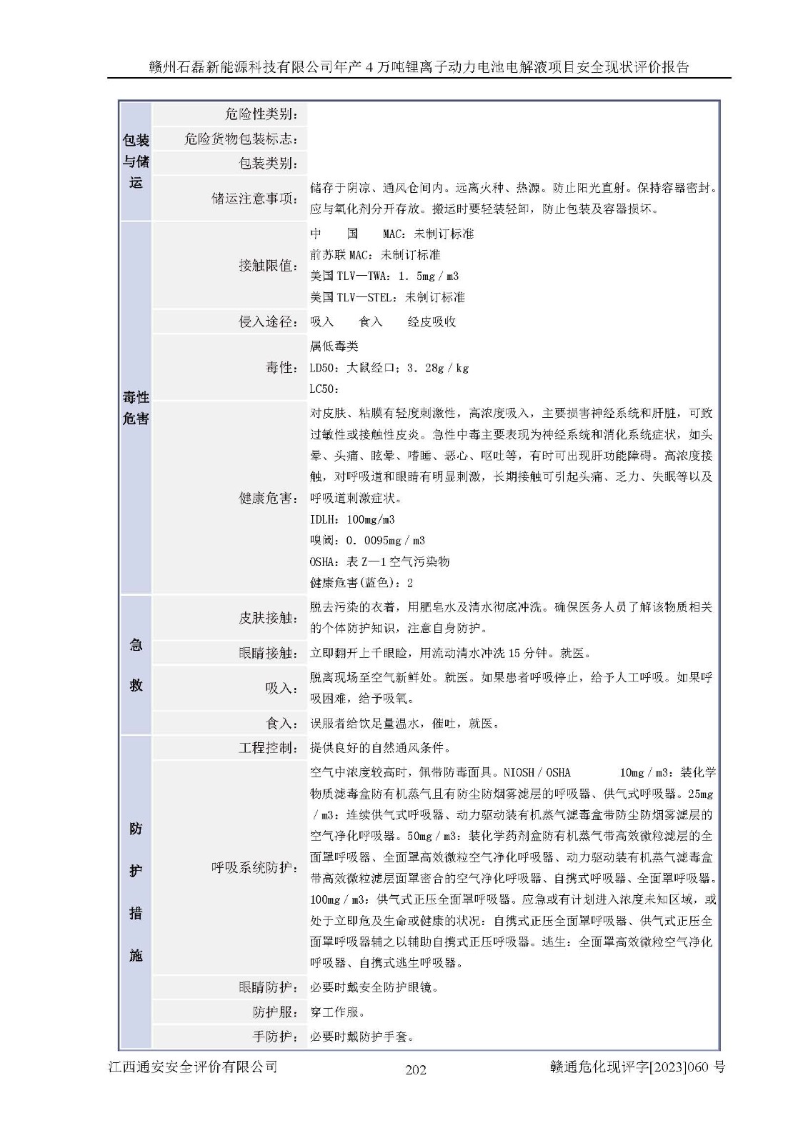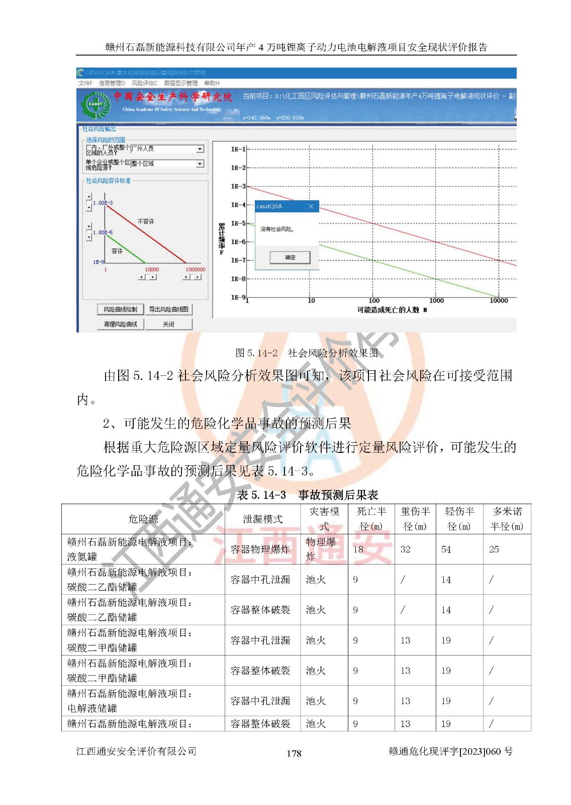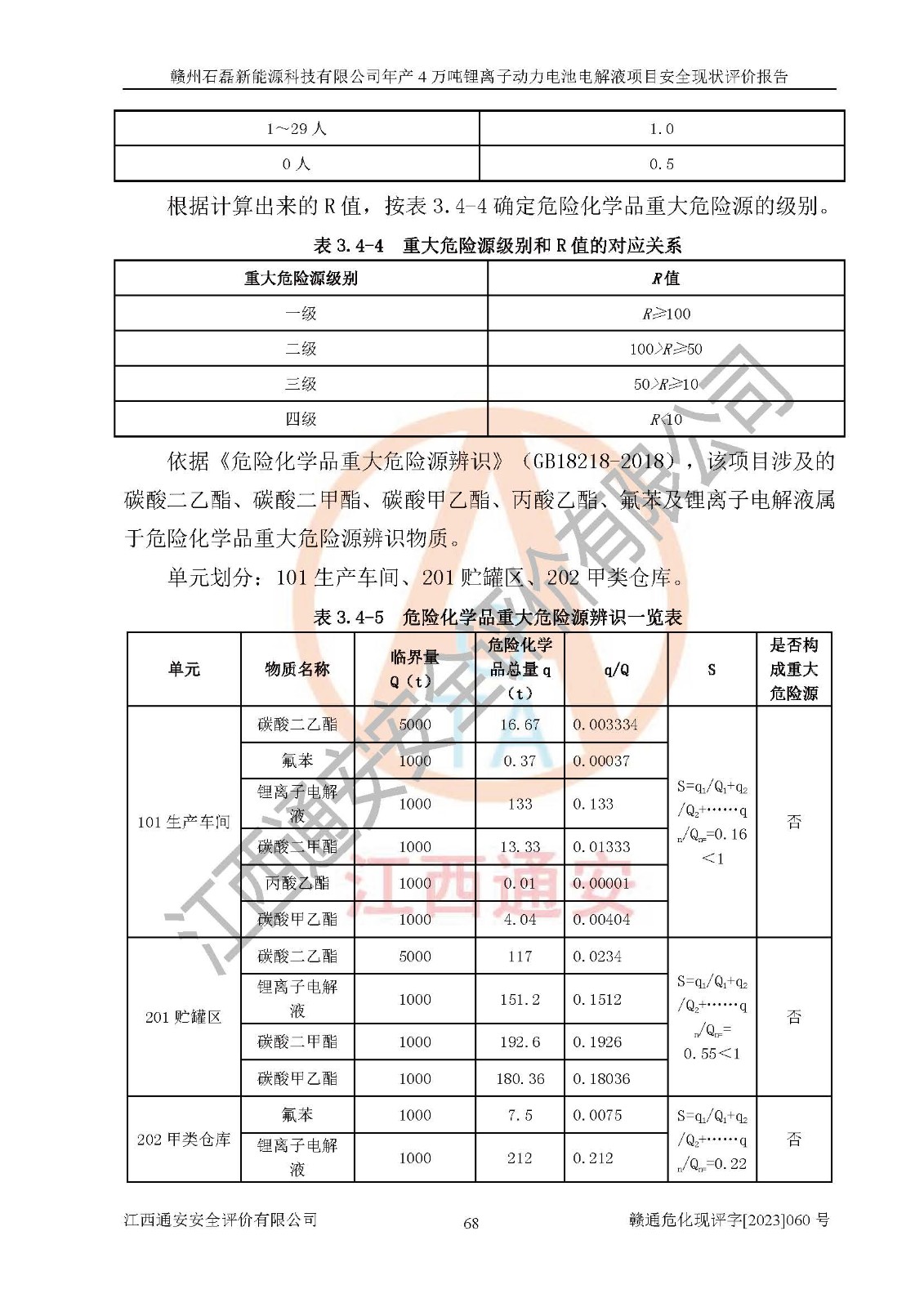 一、安全狀況綜合評(píng)述 1、該項(xiàng)目涉及的原輔材料中碳酸二乙酯、碳酸二甲酯、碳酸甲乙酯、丙酸乙酯、氟苯、丁二腈、己二腈、氮?dú)狻⒙?lián)苯及R22屬于危險(xiǎn)化學(xué)品,產(chǎn)品鋰離子電解液屬于危險(xiǎn)化學(xué)品。 2、該項(xiàng)目生產(chǎn)過(guò)程中存在的危險(xiǎn)、有害因素有:火災(zāi)與爆炸、觸電、中毒與窒息、灼燙、機(jī)械傷害、**傷害、高處墜落、物體打擊和其他傷害等危險(xiǎn)有害因素,其中*主要的危險(xiǎn)有害因素是火災(zāi)與爆炸、中毒與窒息。 3、該項(xiàng)目不涉及監(jiān)控化學(xué)品、易制毒化學(xué)品、易制爆危險(xiǎn)化學(xué)品、劇毒化學(xué)品、重點(diǎn)監(jiān)管危險(xiǎn)化學(xué)品和特別管控的危險(xiǎn)化學(xué)品。 4、該項(xiàng)目不涉及重點(diǎn)監(jiān)管的危險(xiǎn)化工工藝。 5、按照《危險(xiǎn)化學(xué)品重大危險(xiǎn)源辨識(shí)》(GB18218-2018)進(jìn)行辨識(shí),該項(xiàng)目生產(chǎn)單元和儲(chǔ)存單元均不構(gòu)成危險(xiǎn)化學(xué)品重大危險(xiǎn)源。 二、定量評(píng)價(jià)結(jié)果 1、作業(yè)條件危險(xiǎn)性評(píng)價(jià)結(jié)果:在選定的9個(gè)評(píng)價(jià)單元的作業(yè)危險(xiǎn)程度為“一般危險(xiǎn),需要注意”或以下,作業(yè)條件相對(duì)安全。 2、危險(xiǎn)度評(píng)價(jià)結(jié)果:101甲類車間、202甲類倉(cāng)庫(kù)、貯罐區(qū)的危險(xiǎn)程度均為**危險(xiǎn),甲類車間、甲類倉(cāng)庫(kù)和甲類貯罐區(qū)內(nèi)均設(shè)置了可燃?xì)怏w檢測(cè)報(bào)警裝置,并定期進(jìn)行校驗(yàn)**其正常工作。廠內(nèi)建構(gòu)筑物按設(shè)計(jì)要求設(shè)置了防雷防靜電接地裝置,并定期檢驗(yàn);爆炸危險(xiǎn)區(qū)域內(nèi)的電氣設(shè)備采用防爆電機(jī),消防設(shè)施通過(guò)了消防驗(yàn)收,車間生產(chǎn)裝置和儲(chǔ)罐采用密閉化、機(jī)械化和自動(dòng)化,設(shè)備本質(zhì)安全度高,并且應(yīng)在各作業(yè)場(chǎng)所為作業(yè)人員配置了勞動(dòng)保護(hù)用品和器具,作業(yè)人員經(jīng)過(guò)廠內(nèi)三級(jí)安全培訓(xùn),考核合格上崗。項(xiàng)目的安全設(shè)施和安全管理符合安全生產(chǎn)條件,能**降低火災(zāi)爆炸事故發(fā)生的可能性,使風(fēng)險(xiǎn)降低到可接受范圍內(nèi)。 3、個(gè)人風(fēng)險(xiǎn)和社會(huì)風(fēng)險(xiǎn)分析結(jié)果:根據(jù)個(gè)人風(fēng)險(xiǎn)分析效果圖,該項(xiàng)目不涉及高敏感防護(hù)目標(biāo)、重要防護(hù)目標(biāo)、一般防護(hù)目標(biāo)中的一類防護(hù)目標(biāo)(≤3×10-6)等值線、二類防護(hù)目標(biāo)(≤1×10-5)等值線和三類防護(hù)目標(biāo)(≤3×10-5)等值線,個(gè)人風(fēng)險(xiǎn)符合要求;根據(jù)社會(huì)風(fēng)險(xiǎn)分析效果圖可知,該項(xiàng)目社會(huì)風(fēng)險(xiǎn)在可接受范圍內(nèi)。 4、可能發(fā)生的危險(xiǎn)化學(xué)品事故的預(yù)測(cè)后果:該項(xiàng)目貯罐區(qū)和101生產(chǎn)車間災(zāi)害模式為池火,泄漏模式為容器中孔泄漏或容器整體破裂,事故預(yù)測(cè)后果*大的儲(chǔ)罐為碳酸二甲酯儲(chǔ)罐,發(fā)生事故的*大死亡半徑為9m;*大重傷半徑13m,*大輕傷半徑為19m。本項(xiàng)目液氮罐西北側(cè)設(shè)有一臺(tái)50m3液氮罐,液氮罐發(fā)生物理爆炸的*大死亡半徑為18m;*大重傷半徑32m,*大輕傷半徑為54m,多米諾半徑為25m。 5、多米諾效應(yīng)分析:該項(xiàng)目貯罐區(qū)和101車間災(zāi)害模式為池火,無(wú)多米諾半徑。液氮罐發(fā)生物理爆炸的多米諾半徑為25m,多米諾影響區(qū)局限在廠內(nèi)。201罐區(qū)有部分儲(chǔ)罐在多米諾影響區(qū)內(nèi),如液氮罐發(fā)生物理爆炸,會(huì)引發(fā)多米諾效應(yīng),導(dǎo)致罐區(qū)儲(chǔ)罐破裂,可燃液體泄漏發(fā)生池火災(zāi)的可能。因此應(yīng)重點(diǎn)關(guān)注液氮儲(chǔ)罐、201貯罐區(qū)等關(guān)鍵裝置安全設(shè)施的完整和**性,**運(yùn)行良好。 三、定性評(píng)價(jià)結(jié)果 1、依據(jù)相關(guān)法律、法規(guī)、標(biāo)準(zhǔn)等的規(guī)定,該項(xiàng)目外部安全條件、總平面布置、工藝及設(shè)備、防火防爆安全設(shè)施等符合**相關(guān)標(biāo)準(zhǔn)規(guī)范的要求,能滿足安全生產(chǎn)的要求。 2、該項(xiàng)目公用輔助設(shè)施能夠滿足安全生產(chǎn)的要求。 3、該項(xiàng)目按要求設(shè)置了安全生產(chǎn)管理機(jī)構(gòu),配備了專職安全生產(chǎn)管理人員,建立了安全生產(chǎn)責(zé)任制,制定了安全管理制度和崗位安全操作規(guī)程等。該公司修訂了生產(chǎn)安全事故應(yīng)急預(yù)案,配備了應(yīng)急救援器材,按要求定期進(jìn)行相關(guān)培訓(xùn)及演練。 4、該項(xiàng)目不涉及“兩重點(diǎn)一重大”,公司主要負(fù)責(zé)人、安全管理人員經(jīng)培訓(xùn)考核取得了相應(yīng)的安全資格證書。主要負(fù)責(zé)人的專業(yè)和學(xué)歷符合要求,公司任命了許惠彬和王佛金為專職安全管理人員,許惠彬的學(xué)歷和專業(yè)均符合要求,王佛金于2021年9月報(bào)名參加了大專應(yīng)用化工技術(shù)專業(yè)學(xué)歷提升,預(yù)計(jì)2024年1月畢業(yè),屆時(shí)可滿足危險(xiǎn)化學(xué)品企業(yè)重點(diǎn)人員安