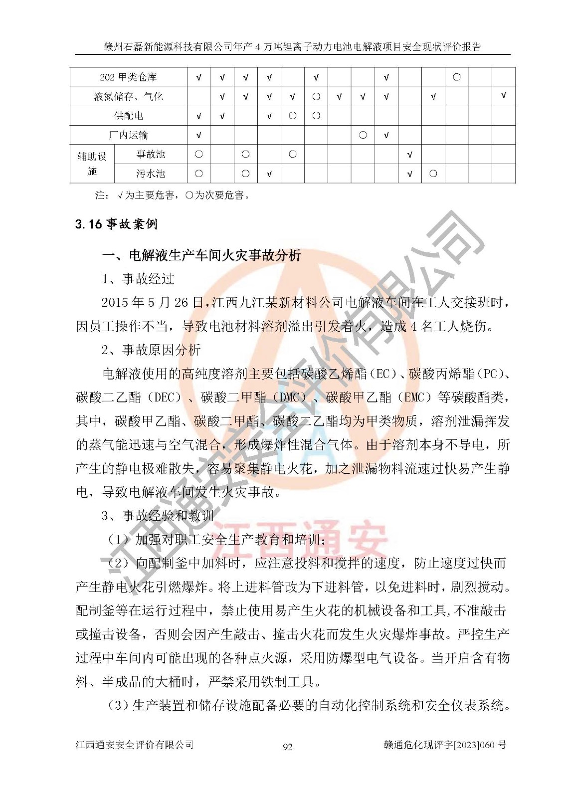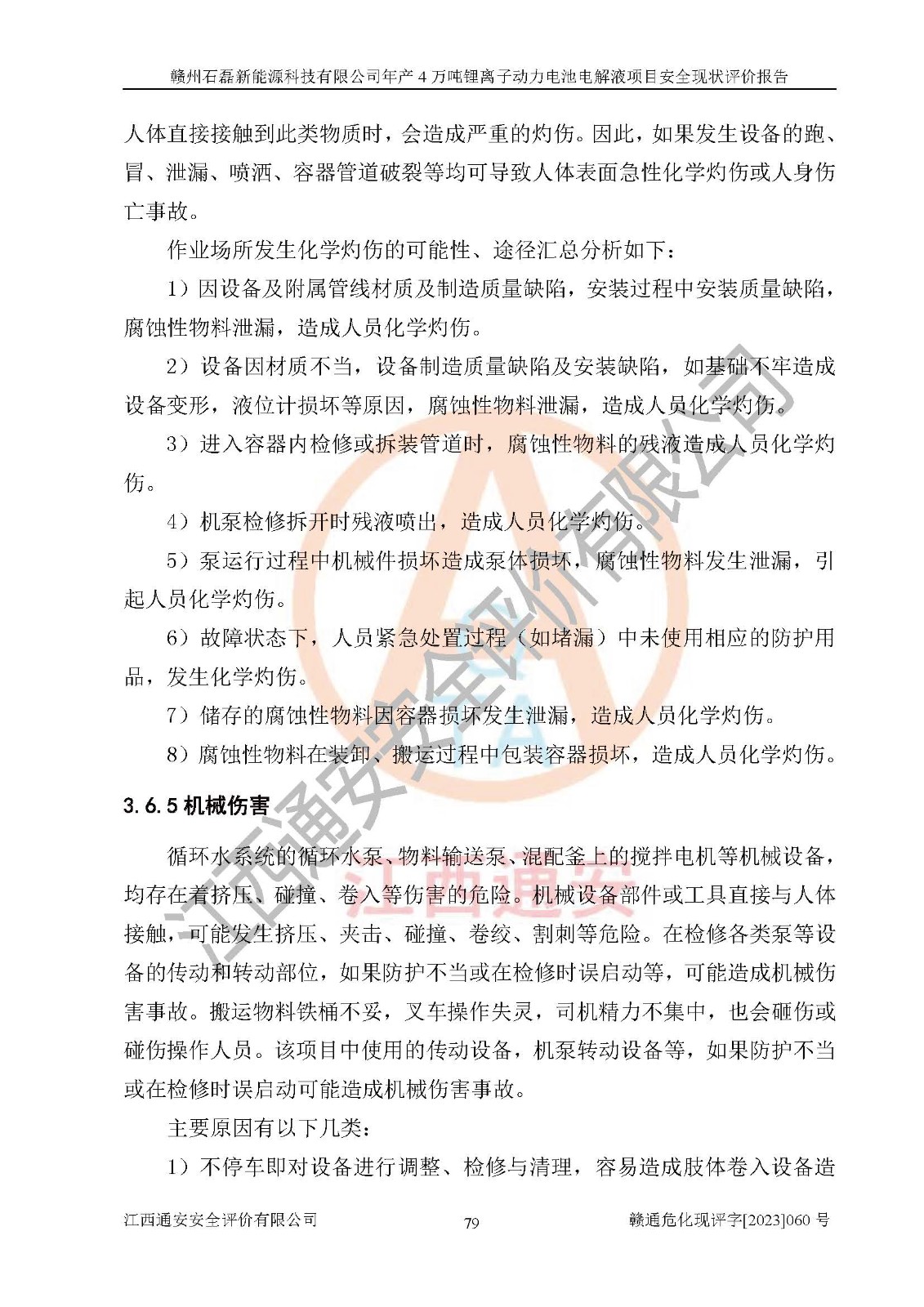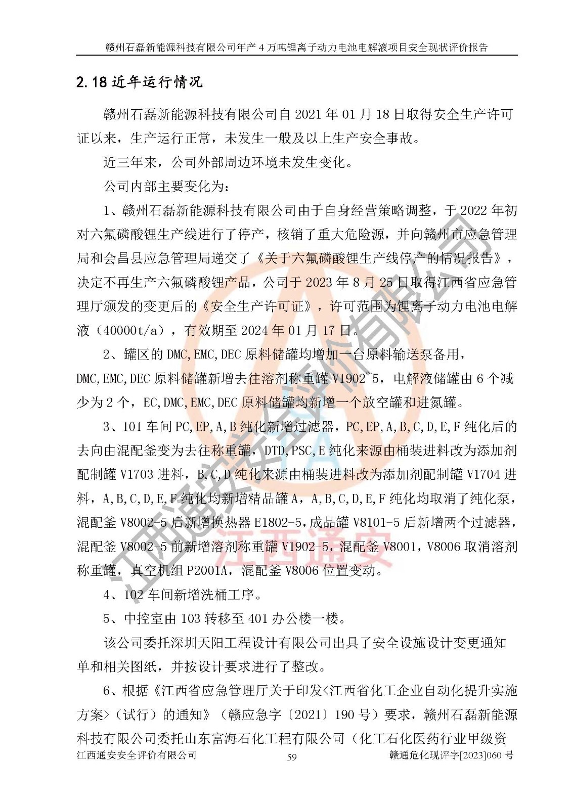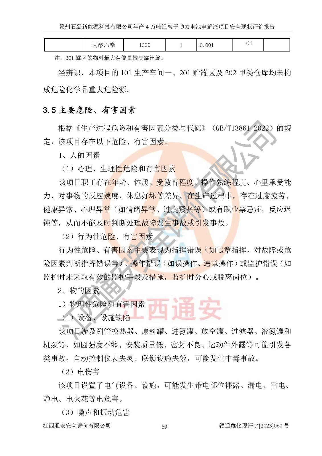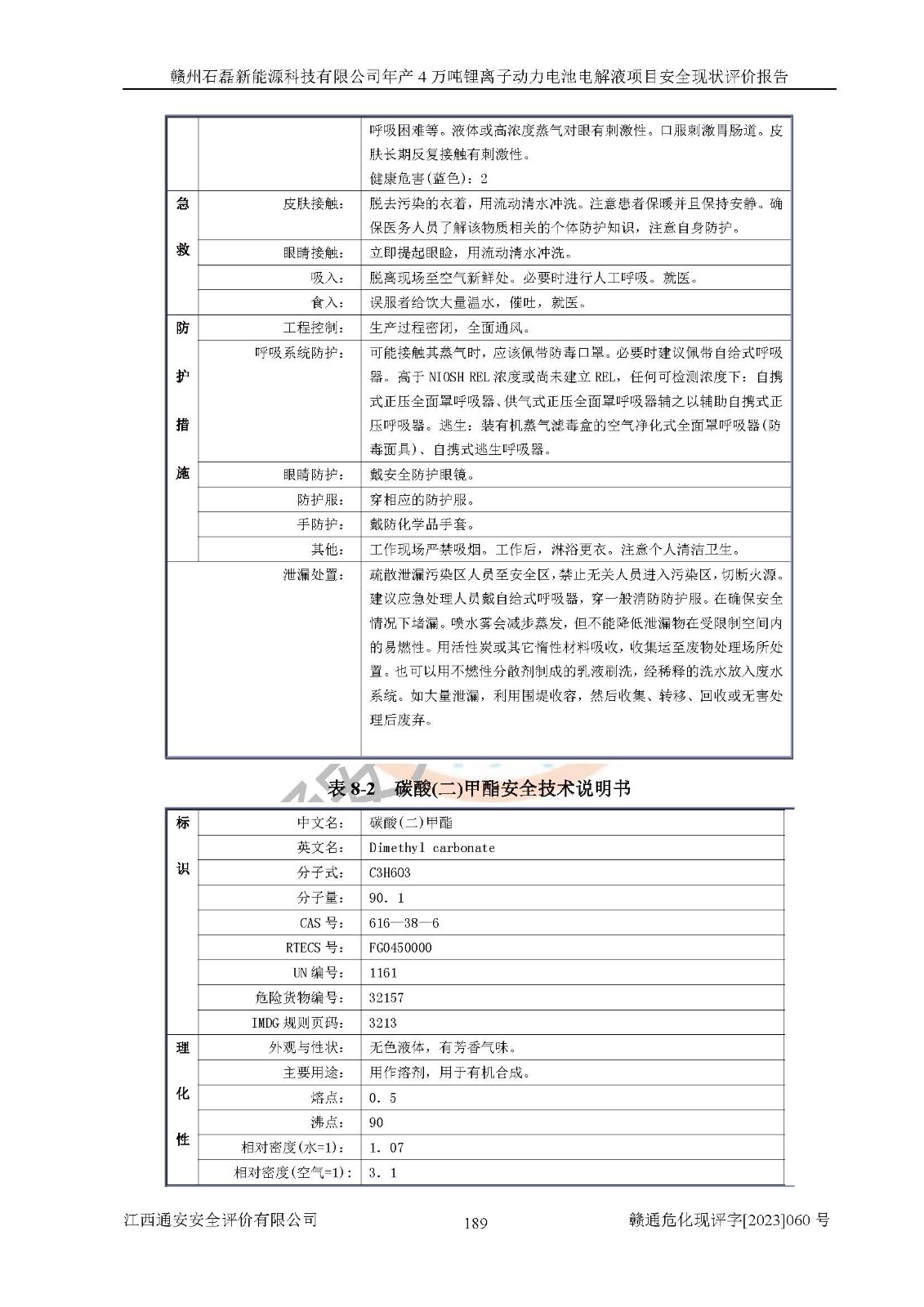 一、安全狀況綜合評(píng)述 1、該項(xiàng)目涉及的原輔材料中碳酸二乙酯、碳酸二甲酯、碳酸甲乙酯、丙酸乙酯、氟苯、丁二腈、己二腈、氮?dú)狻⒙?lián)苯及R22屬于危險(xiǎn)化學(xué)品,產(chǎn)品鋰離子電解液屬于危險(xiǎn)化學(xué)品。 2、該項(xiàng)目生產(chǎn)過(guò)程中存在的危險(xiǎn)、有害因素有:火災(zāi)與爆炸、觸電、中毒與窒息、灼燙、機(jī)械傷害、**傷害、高處墜落、物體打擊和其他傷害等危險(xiǎn)有害因素,其中*主要的危險(xiǎn)有害因素是火災(zāi)與爆炸、中毒與窒息。 3、該項(xiàng)目不涉及監(jiān)控化學(xué)品、易制毒化學(xué)品、易制爆危險(xiǎn)化學(xué)品、劇毒化學(xué)品、重點(diǎn)監(jiān)管危險(xiǎn)化學(xué)品和特別管控的危險(xiǎn)化學(xué)品。 4、該項(xiàng)目不涉及重點(diǎn)監(jiān)管的危險(xiǎn)化工工藝。 5、按照《危險(xiǎn)化學(xué)品重大危險(xiǎn)源辨識(shí)》(GB18218-2018)進(jìn)行辨識(shí),該項(xiàng)目生產(chǎn)單元和儲(chǔ)存單元均不構(gòu)成危險(xiǎn)化學(xué)品重大危險(xiǎn)源。 二、定量評(píng)價(jià)結(jié)果 1、作業(yè)條件危險(xiǎn)性評(píng)價(jià)結(jié)果:在選定的9個(gè)評(píng)價(jià)單元的作業(yè)危險(xiǎn)程度為“一般危險(xiǎn),需要注意”或以下,作業(yè)條件相對(duì)安全。 2、危險(xiǎn)度評(píng)價(jià)結(jié)果:101甲類車間、202甲類倉(cāng)庫(kù)、貯罐區(qū)的危險(xiǎn)程度均為**危險(xiǎn),甲類車間、甲類倉(cāng)庫(kù)和甲類貯罐區(qū)內(nèi)均設(shè)置了可燃?xì)怏w檢測(cè)報(bào)警裝置,并定期進(jìn)行校驗(yàn)**其正常工作。廠內(nèi)建構(gòu)筑物按設(shè)計(jì)要求設(shè)置了防雷防靜電接地裝置,并定期檢驗(yàn);爆炸危險(xiǎn)區(qū)域內(nèi)的電氣設(shè)備采用防爆電機(jī),消防設(shè)施通過(guò)了消防驗(yàn)收,車間生產(chǎn)裝置和儲(chǔ)罐采用密閉化、機(jī)械化和自動(dòng)化,設(shè)備本質(zhì)安全度高,并且應(yīng)在各作業(yè)場(chǎng)所為作業(yè)人員配置了勞動(dòng)保護(hù)用品和器具,作業(yè)人員經(jīng)過(guò)廠內(nèi)三級(jí)安全培訓(xùn),考核合格上崗。項(xiàng)目的安全設(shè)施和安全管理符合安全生產(chǎn)條件,能**降低火災(zāi)爆炸事故發(fā)生的可能性,使風(fēng)險(xiǎn)降低到可接受范圍內(nèi)。 3、個(gè)人風(fēng)險(xiǎn)和社會(huì)風(fēng)險(xiǎn)分析結(jié)果:根據(jù)個(gè)人風(fēng)險(xiǎn)分析效果圖,該項(xiàng)目不涉及高敏感防護(hù)目標(biāo)、重要防護(hù)目標(biāo)、一般防護(hù)目標(biāo)中的一類防護(hù)目標(biāo)(≤3×10-6)等值線、二類防護(hù)目標(biāo)(≤1×10-5)等值線和三類防護(hù)目標(biāo)(≤3×10-5)等值線,個(gè)人風(fēng)險(xiǎn)符合要求;根據(jù)社會(huì)風(fēng)險(xiǎn)分析效果圖可知,該項(xiàng)目社會(huì)風(fēng)險(xiǎn)在可接受范圍內(nèi)。 4、可能發(fā)生的危險(xiǎn)化學(xué)品事故的預(yù)測(cè)后果:該項(xiàng)目貯罐區(qū)和101生產(chǎn)車間災(zāi)害模式為池火,泄漏模式為容器中孔泄漏或容器整體破裂,事故預(yù)測(cè)后果*大的儲(chǔ)罐為碳酸二甲酯儲(chǔ)罐,發(fā)生事故的*大死亡半徑為9m;*大重傷半徑13m,*大輕傷半徑為19m。本項(xiàng)目液氮罐西北側(cè)設(shè)有一臺(tái)50m3液氮罐,液氮罐發(fā)生物理爆炸的*大死亡半徑為18m;*大重傷半徑32m,*大輕傷半徑為54m,多米諾半徑為25m。 5、多米諾效應(yīng)分析:該項(xiàng)目貯罐區(qū)和101車間災(zāi)害模式為池火,無(wú)多米諾半徑。液氮罐發(fā)生物理爆炸的多米諾半徑為25m,多米諾影響區(qū)局限在廠內(nèi)。201罐區(qū)有部分儲(chǔ)罐在多米諾影響區(qū)內(nèi),如液氮罐發(fā)生物理爆炸,會(huì)引發(fā)多米諾效應(yīng),導(dǎo)致罐區(qū)儲(chǔ)罐破裂,可燃液體泄漏發(fā)生池火災(zāi)的可能。因此應(yīng)重點(diǎn)關(guān)注液氮儲(chǔ)罐、201貯罐區(qū)等關(guān)鍵裝置安全設(shè)施的完整和**性,**運(yùn)行良好。 三、定性評(píng)價(jià)結(jié)果 1、依據(jù)相關(guān)法律、法規(guī)、標(biāo)準(zhǔn)等的規(guī)定,該項(xiàng)目外部安全條件、總平面布置、工藝及設(shè)備、防火防爆安全設(shè)施等符合**相關(guān)標(biāo)準(zhǔn)規(guī)范的要求,能滿足安全生產(chǎn)的要求。 2、該項(xiàng)目公用輔助設(shè)施能夠滿足安全生產(chǎn)的要求。 3、該項(xiàng)目按要求設(shè)置了安全生產(chǎn)管理機(jī)構(gòu),配備了專職安全生產(chǎn)管理人員,建立了安全生產(chǎn)責(zé)任制,制定了安全管理制度和崗位安全操作規(guī)程等。該公司修訂了生產(chǎn)安全事故應(yīng)急預(yù)案,配備了應(yīng)急救援器材,按要求定期進(jìn)行相關(guān)培訓(xùn)及演練。 4、該項(xiàng)目不涉及“兩重點(diǎn)一重大”,公司主要負(fù)責(zé)人、安全管理人員經(jīng)培訓(xùn)考核取得了相應(yīng)的安全資格證書。主要負(fù)責(zé)人的專業(yè)和學(xué)歷符合要求,公司任命了許惠彬和王佛金為專職安全管理人員,許惠彬的學(xué)歷和專業(yè)均符合要求,王佛金于2021年9月報(bào)名參加了大專應(yīng)用化工技術(shù)專業(yè)學(xué)歷提升,預(yù)計(jì)2024年1月畢業(yè),屆時(shí)可滿足危險(xiǎn)化學(xué)品企業(yè)重點(diǎn)人員安