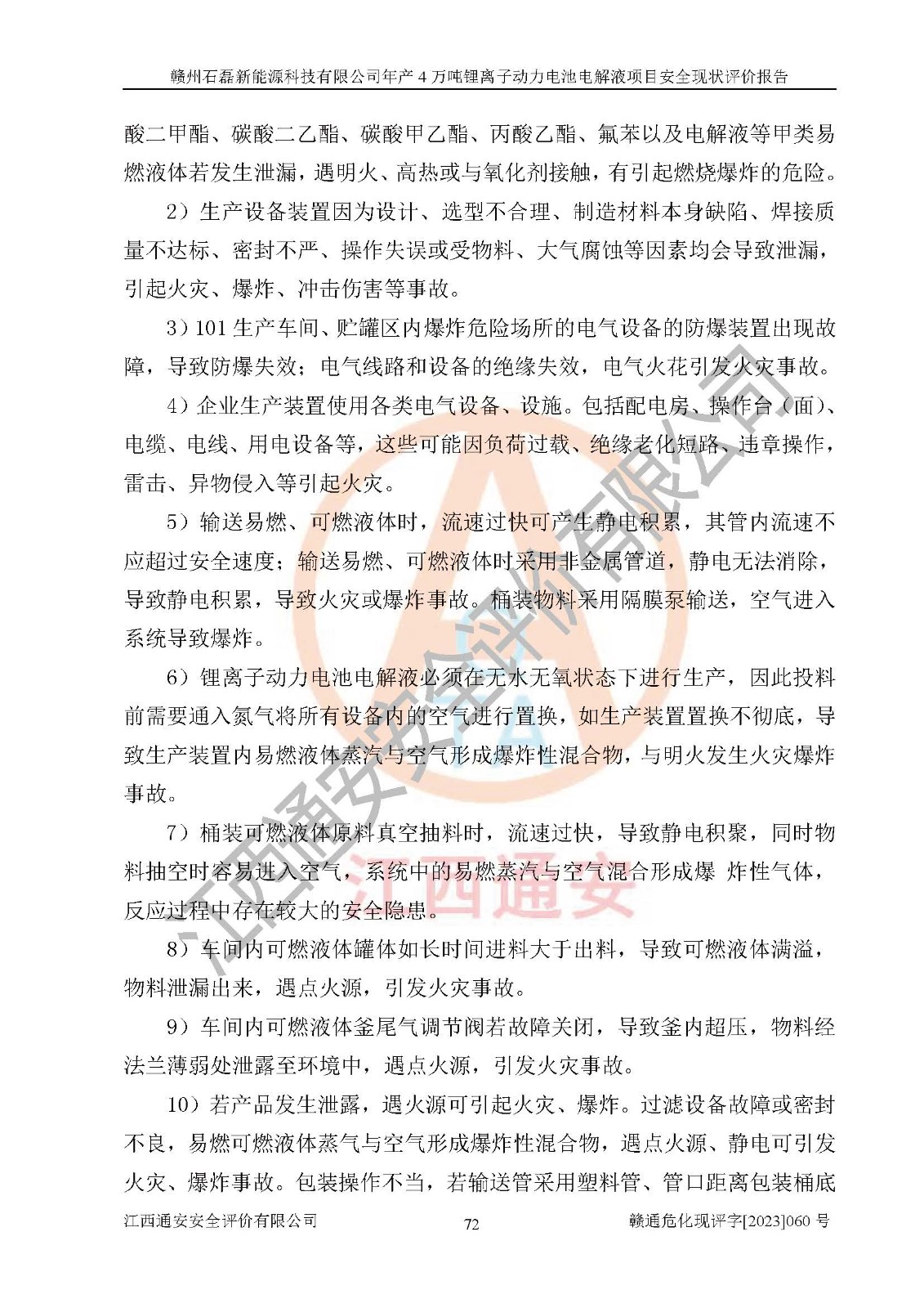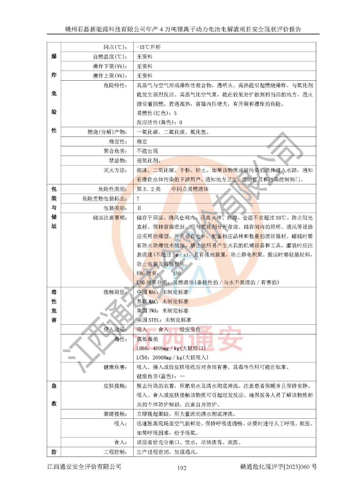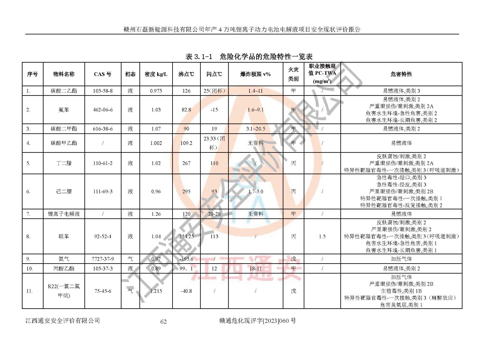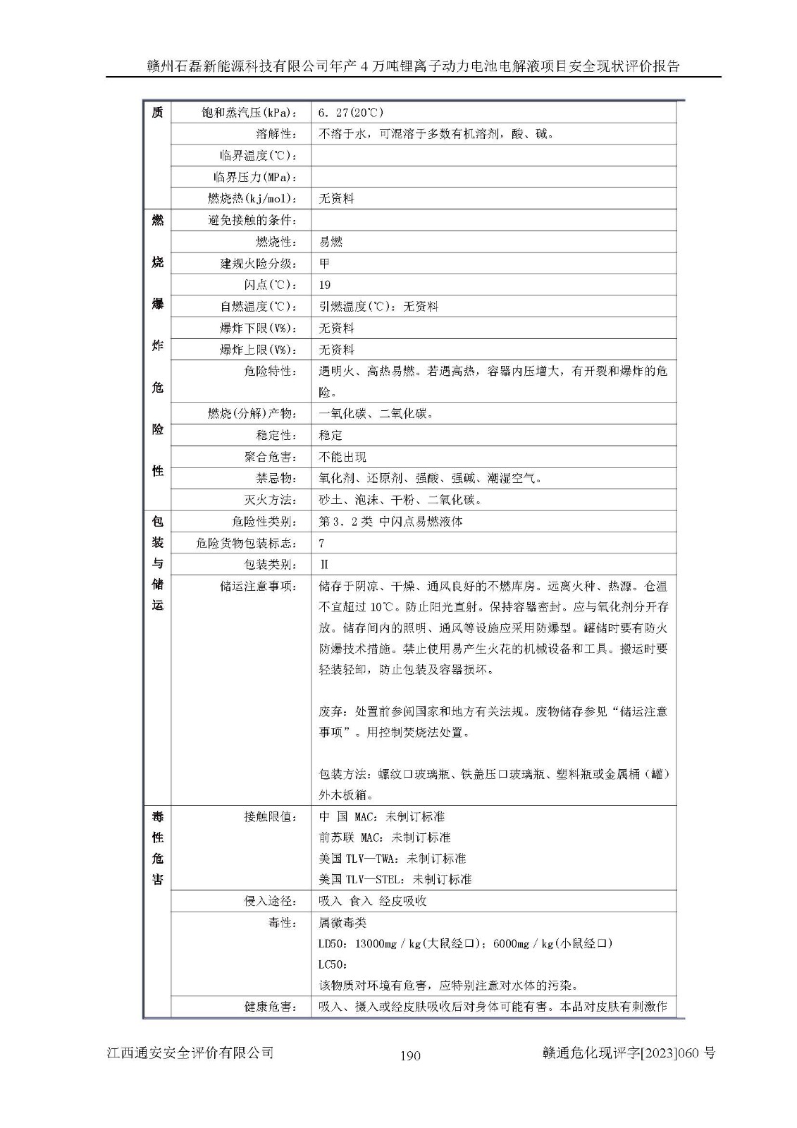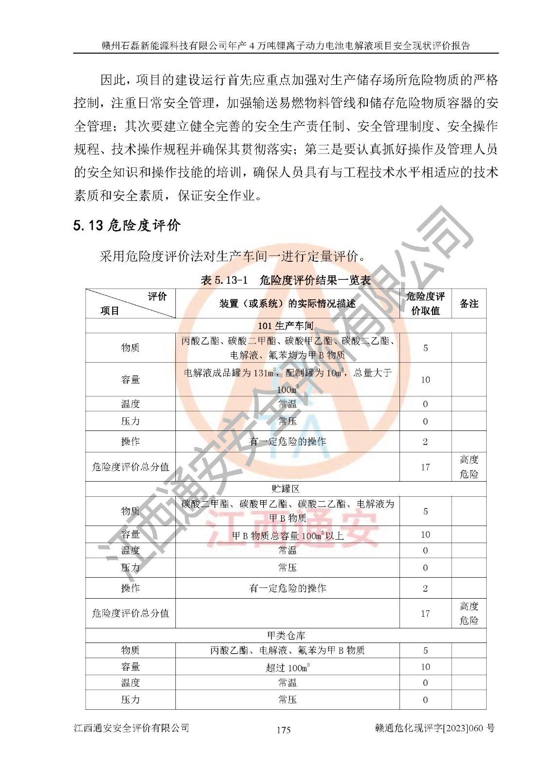 一、安全狀況綜合評(píng)述 1、該項(xiàng)目涉及的原輔材料中碳酸二乙酯、碳酸二甲酯、碳酸甲乙酯、丙酸乙酯、氟苯、丁二腈、己二腈、氮?dú)狻⒙?lián)苯及R22屬于危險(xiǎn)化學(xué)品,產(chǎn)品鋰離子電解液屬于危險(xiǎn)化學(xué)品。 2、該項(xiàng)目生產(chǎn)過(guò)程中存在的危險(xiǎn)、有害因素有:火災(zāi)與爆炸、觸電、中毒與窒息、灼燙、機(jī)械傷害、**傷害、高處墜落、物體打擊和其他傷害等危險(xiǎn)有害因素,其中*主要的危險(xiǎn)有害因素是火災(zāi)與爆炸、中毒與窒息。 3、該項(xiàng)目不涉及監(jiān)控化學(xué)品、易制毒化學(xué)品、易制爆危險(xiǎn)化學(xué)品、劇毒化學(xué)品、重點(diǎn)監(jiān)管危險(xiǎn)化學(xué)品和特別管控的危險(xiǎn)化學(xué)品。 4、該項(xiàng)目不涉及重點(diǎn)監(jiān)管的危險(xiǎn)化工工藝。 5、按照《危險(xiǎn)化學(xué)品重大危險(xiǎn)源辨識(shí)》(GB18218-2018)進(jìn)行辨識(shí),該項(xiàng)目生產(chǎn)單元和儲(chǔ)存單元均不構(gòu)成危險(xiǎn)化學(xué)品重大危險(xiǎn)源。 二、定量評(píng)價(jià)結(jié)果 1、作業(yè)條件危險(xiǎn)性評(píng)價(jià)結(jié)果:在選定的9個(gè)評(píng)價(jià)單元的作業(yè)危險(xiǎn)程度為“一般危險(xiǎn),需要注意”或以下,作業(yè)條件相對(duì)安全。 2、危險(xiǎn)度評(píng)價(jià)結(jié)果:101甲類車間、202甲類倉(cāng)庫(kù)、貯罐區(qū)的危險(xiǎn)程度均為**危險(xiǎn),甲類車間、甲類倉(cāng)庫(kù)和甲類貯罐區(qū)內(nèi)均設(shè)置了可燃?xì)怏w檢測(cè)報(bào)警裝置,并定期進(jìn)行校驗(yàn)**其正常工作。廠內(nèi)建構(gòu)筑物按設(shè)計(jì)要求設(shè)置了防雷防靜電接地裝置,并定期檢驗(yàn);爆炸危險(xiǎn)區(qū)域內(nèi)的電氣設(shè)備采用防爆電機(jī),消防設(shè)施通過(guò)了消防驗(yàn)收,車間生產(chǎn)裝置和儲(chǔ)罐采用密閉化、機(jī)械化和自動(dòng)化,設(shè)備本質(zhì)安全度高,并且應(yīng)在各作業(yè)場(chǎng)所為作業(yè)人員配置了勞動(dòng)保護(hù)用品和器具,作業(yè)人員經(jīng)過(guò)廠內(nèi)三級(jí)安全培訓(xùn),考核合格上崗。項(xiàng)目的安全設(shè)施和安全管理符合安全生產(chǎn)條件,能**降低火災(zāi)爆炸事故發(fā)生的可能性,使風(fēng)險(xiǎn)降低到可接受范圍內(nèi)。 3、個(gè)人風(fēng)險(xiǎn)和社會(huì)風(fēng)險(xiǎn)分析結(jié)果:根據(jù)個(gè)人風(fēng)險(xiǎn)分析效果圖,該項(xiàng)目不涉及高敏感防護(hù)目標(biāo)、重要防護(hù)目標(biāo)、一般防護(hù)目標(biāo)中的一類防護(hù)目標(biāo)(≤3×10-6)等值線、二類防護(hù)目標(biāo)(≤1×10-5)等值線和三類防護(hù)目標(biāo)(≤3×10-5)等值線,個(gè)人風(fēng)險(xiǎn)符合要求;根據(jù)社會(huì)風(fēng)險(xiǎn)分析效果圖可知,該項(xiàng)目社會(huì)風(fēng)險(xiǎn)在可接受范圍內(nèi)。 4、可能發(fā)生的危險(xiǎn)化學(xué)品事故的預(yù)測(cè)后果:該項(xiàng)目貯罐區(qū)和101生產(chǎn)車間災(zāi)害模式為池火,泄漏模式為容器中孔泄漏或容器整體破裂,事故預(yù)測(cè)后果*大的儲(chǔ)罐為碳酸二甲酯儲(chǔ)罐,發(fā)生事故的*大死亡半徑為9m;*大重傷半徑13m,*大輕傷半徑為19m。本項(xiàng)目液氮罐西北側(cè)設(shè)有一臺(tái)50m3液氮罐,液氮罐發(fā)生物理爆炸的*大死亡半徑為18m;*大重傷半徑32m,*大輕傷半徑為54m,多米諾半徑為25m。 5、多米諾效應(yīng)分析:該項(xiàng)目貯罐區(qū)和101車間災(zāi)害模式為池火,無(wú)多米諾半徑。液氮罐發(fā)生物理爆炸的多米諾半徑為25m,多米諾影響區(qū)局限在廠內(nèi)。201罐區(qū)有部分儲(chǔ)罐在多米諾影響區(qū)內(nèi),如液氮罐發(fā)生物理爆炸,會(huì)引發(fā)多米諾效應(yīng),導(dǎo)致罐區(qū)儲(chǔ)罐破裂,可燃液體泄漏發(fā)生池火災(zāi)的可能。因此應(yīng)重點(diǎn)關(guān)注液氮儲(chǔ)罐、201貯罐區(qū)等關(guān)鍵裝置安全設(shè)施的完整和**性,**運(yùn)行良好。 三、定性評(píng)價(jià)結(jié)果 1、依據(jù)相關(guān)法律、法規(guī)、標(biāo)準(zhǔn)等的規(guī)定,該項(xiàng)目外部安全條件、總平面布置、工藝及設(shè)備、防火防爆安全設(shè)施等符合**相關(guān)標(biāo)準(zhǔn)規(guī)范的要求,能滿足安全生產(chǎn)的要求。 2、該項(xiàng)目公用輔助設(shè)施能夠滿足安全生產(chǎn)的要求。 3、該項(xiàng)目按要求設(shè)置了安全生產(chǎn)管理機(jī)構(gòu),配備了專職安全生產(chǎn)管理人員,建立了安全生產(chǎn)責(zé)任制,制定了安全管理制度和崗位安全操作規(guī)程等。該公司修訂了生產(chǎn)安全事故應(yīng)急預(yù)案,配備了應(yīng)急救援器材,按要求定期進(jìn)行相關(guān)培訓(xùn)及演練。 4、該項(xiàng)目不涉及“兩重點(diǎn)一重大”,公司主要負(fù)責(zé)人、安全管理人員經(jīng)培訓(xùn)考核取得了相應(yīng)的安全資格證書。主要負(fù)責(zé)人的專業(yè)和學(xué)歷符合要求,公司任命了許惠彬和王佛金為專職安全管理人員,許惠彬的學(xué)歷和專業(yè)均符合要求,王佛金于2021年9月報(bào)名參加了大專應(yīng)用化工技術(shù)專業(yè)學(xué)歷提升,預(yù)計(jì)2024年1月畢業(yè),屆時(shí)可滿足危險(xiǎn)化學(xué)品企業(yè)重點(diǎn)人員安