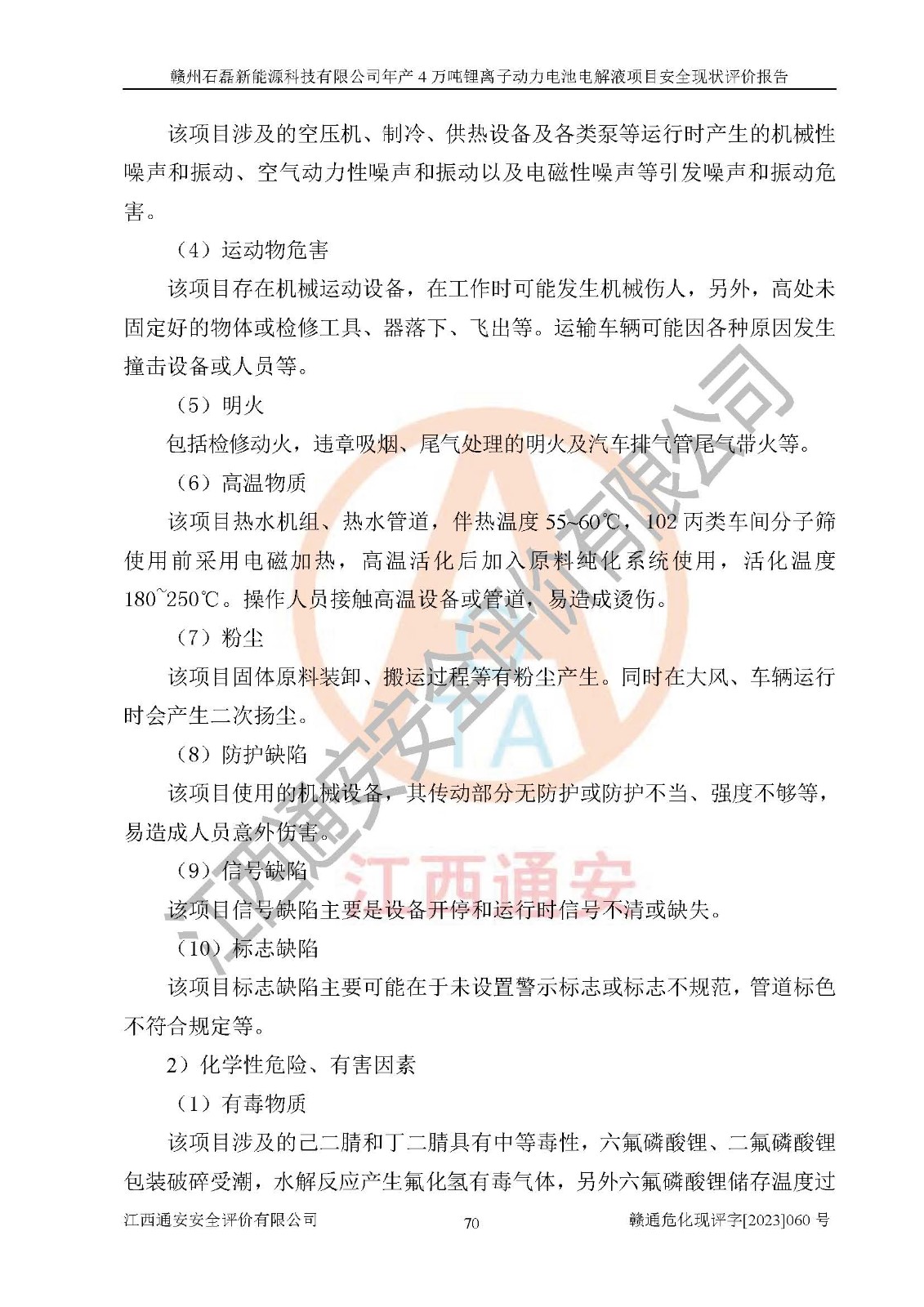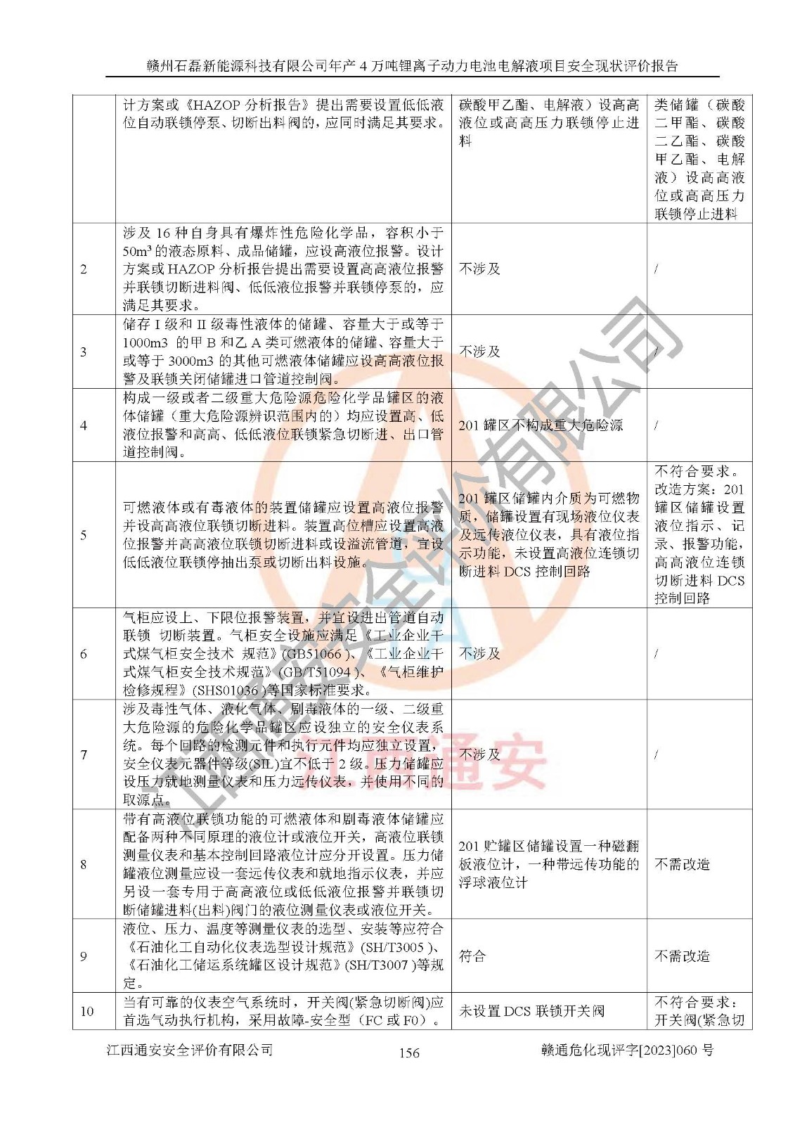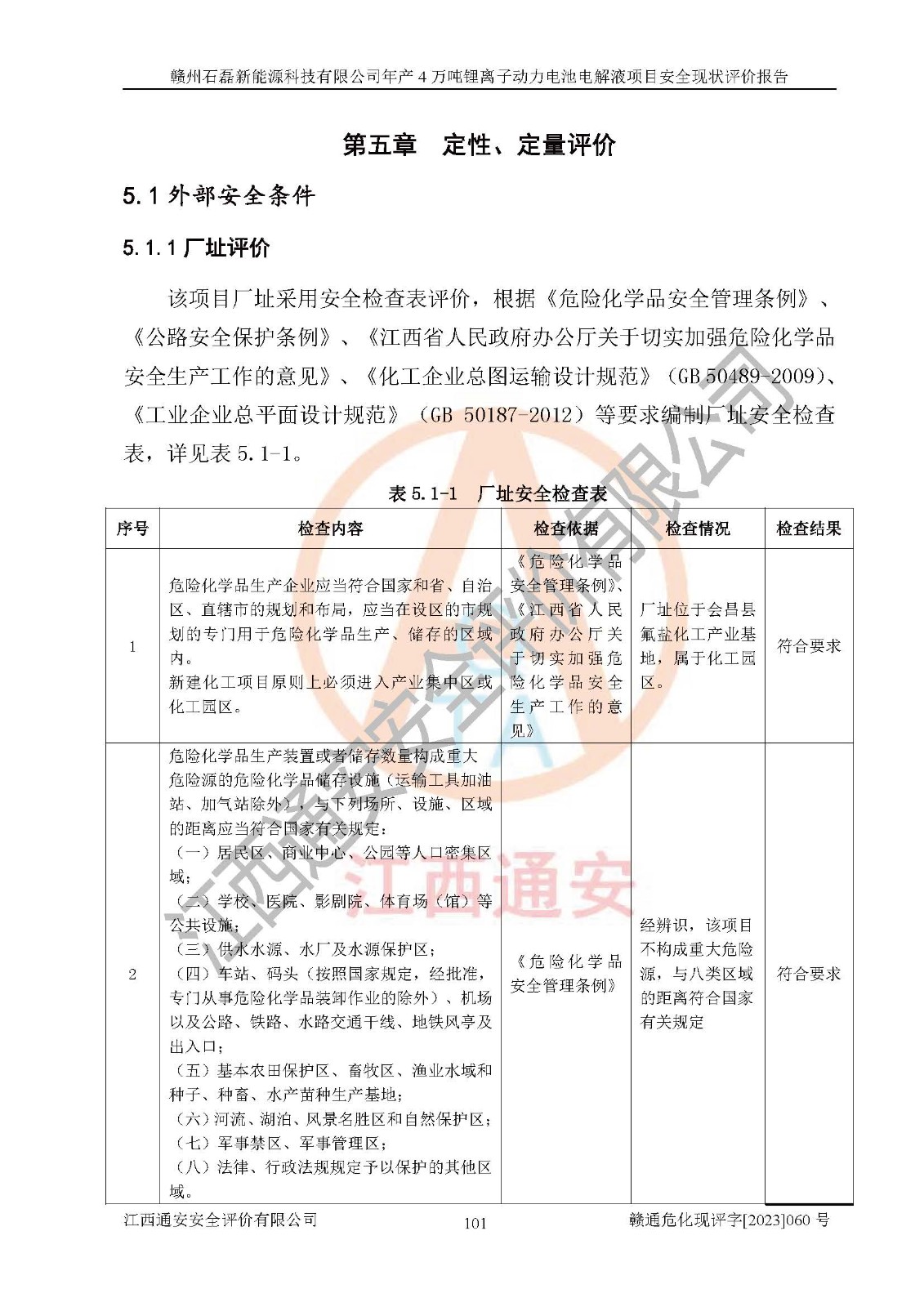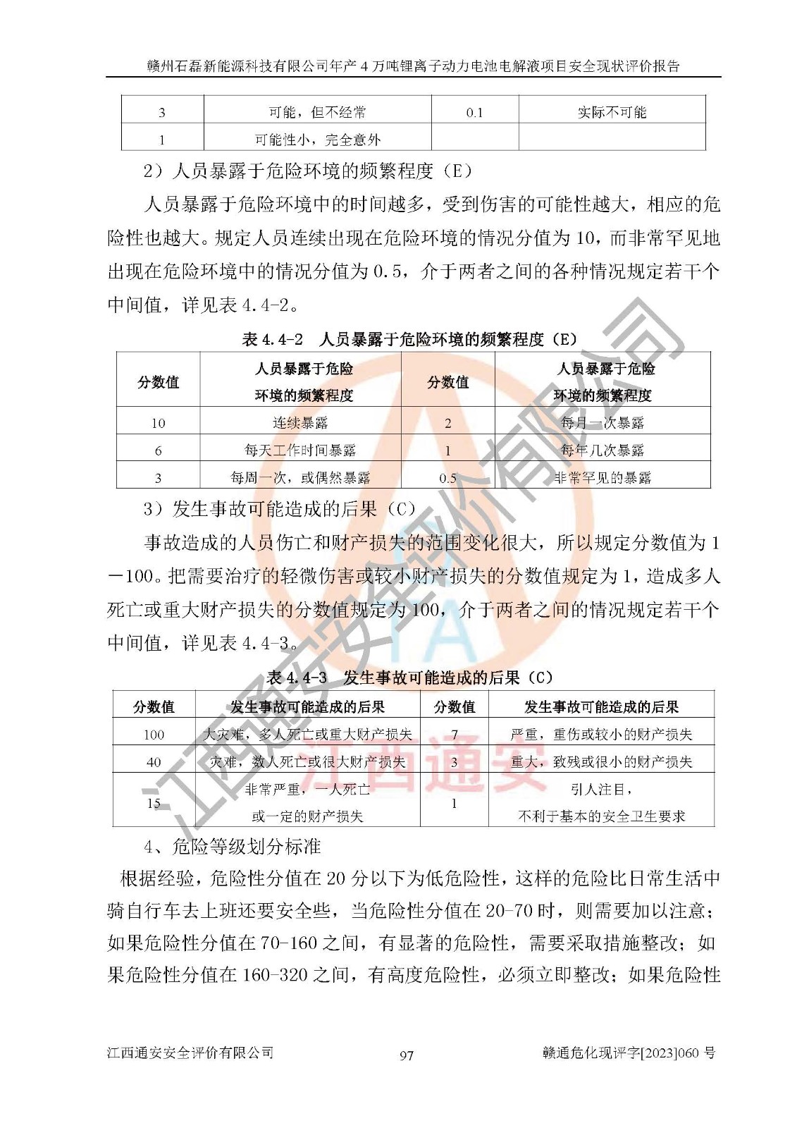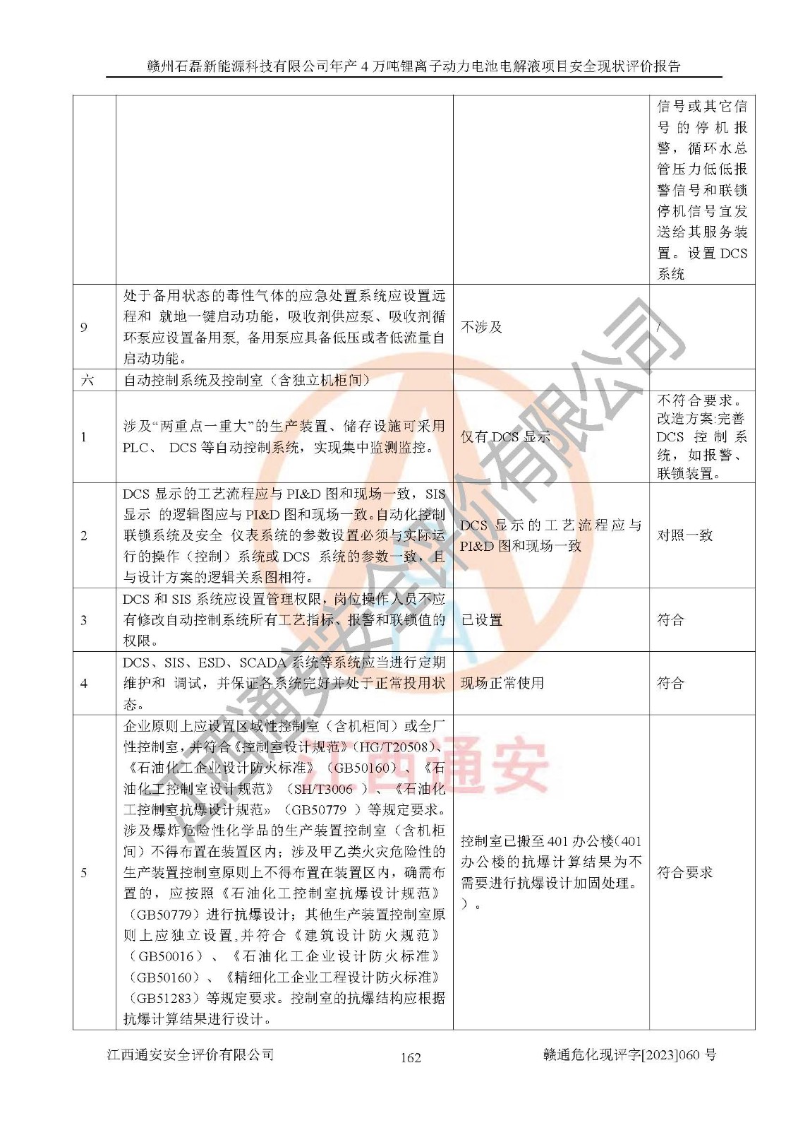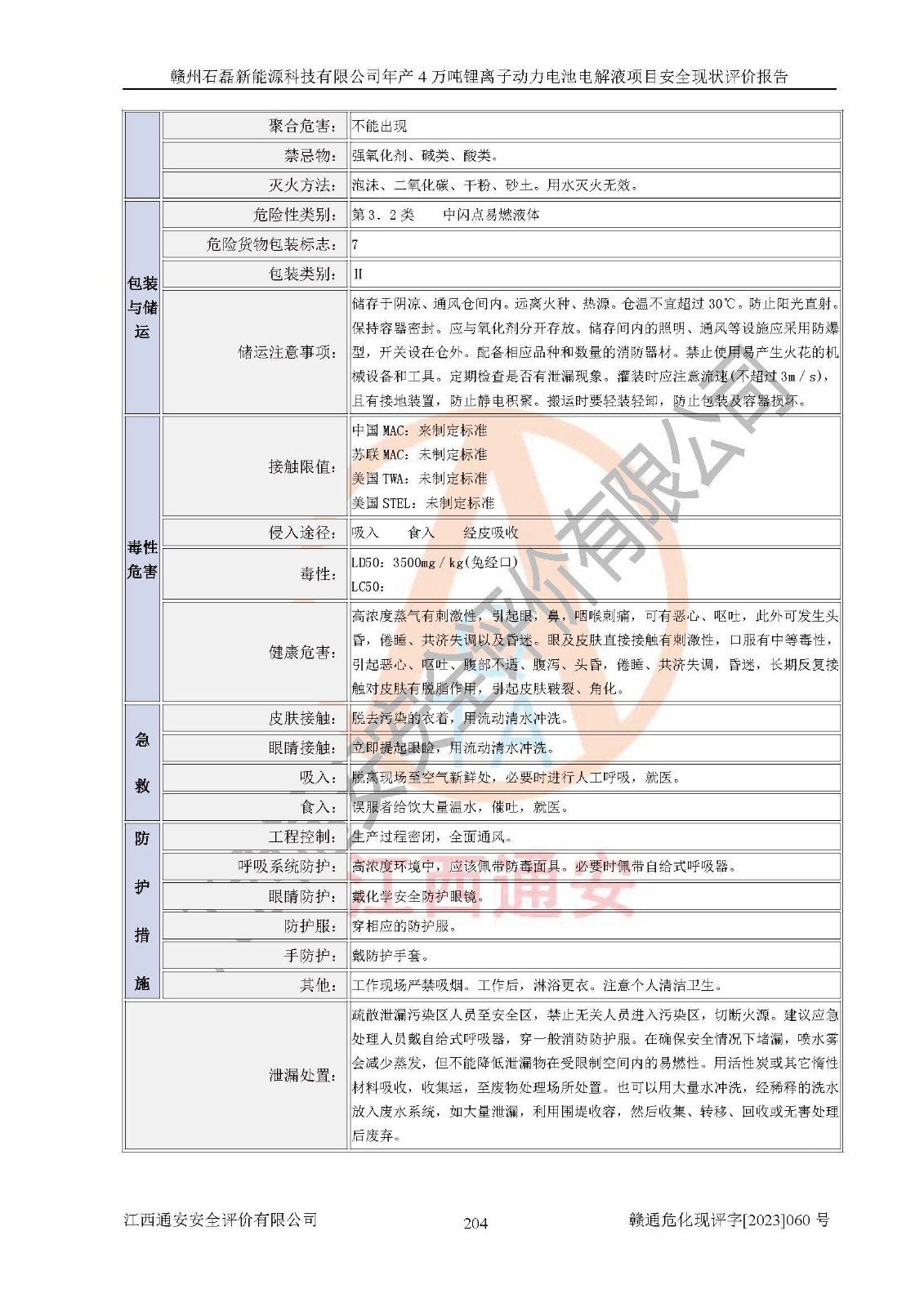 一、安全狀況綜合評(píng)述 1、該項(xiàng)目涉及的原輔材料中碳酸二乙酯、碳酸二甲酯、碳酸甲乙酯、丙酸乙酯、氟苯、丁二腈、己二腈、氮?dú)狻⒙?lián)苯及R22屬于危險(xiǎn)化學(xué)品,產(chǎn)品鋰離子電解液屬于危險(xiǎn)化學(xué)品。 2、該項(xiàng)目生產(chǎn)過(guò)程中存在的危險(xiǎn)、有害因素有:火災(zāi)與爆炸、觸電、中毒與窒息、灼燙、機(jī)械傷害、**傷害、高處墜落、物體打擊和其他傷害等危險(xiǎn)有害因素,其中*主要的危險(xiǎn)有害因素是火災(zāi)與爆炸、中毒與窒息。 3、該項(xiàng)目不涉及監(jiān)控化學(xué)品、易制毒化學(xué)品、易制爆危險(xiǎn)化學(xué)品、劇毒化學(xué)品、重點(diǎn)監(jiān)管危險(xiǎn)化學(xué)品和特別管控的危險(xiǎn)化學(xué)品。 4、該項(xiàng)目不涉及重點(diǎn)監(jiān)管的危險(xiǎn)化工工藝。 5、按照《危險(xiǎn)化學(xué)品重大危險(xiǎn)源辨識(shí)》(GB18218-2018)進(jìn)行辨識(shí),該項(xiàng)目生產(chǎn)單元和儲(chǔ)存單元均不構(gòu)成危險(xiǎn)化學(xué)品重大危險(xiǎn)源。 二、定量評(píng)價(jià)結(jié)果 1、作業(yè)條件危險(xiǎn)性評(píng)價(jià)結(jié)果:在選定的9個(gè)評(píng)價(jià)單元的作業(yè)危險(xiǎn)程度為“一般危險(xiǎn),需要注意”或以下,作業(yè)條件相對(duì)安全。 2、危險(xiǎn)度評(píng)價(jià)結(jié)果:101甲類車間、202甲類倉(cāng)庫(kù)、貯罐區(qū)的危險(xiǎn)程度均為**危險(xiǎn),甲類車間、甲類倉(cāng)庫(kù)和甲類貯罐區(qū)內(nèi)均設(shè)置了可燃?xì)怏w檢測(cè)報(bào)警裝置,并定期進(jìn)行校驗(yàn)**其正常工作。廠內(nèi)建構(gòu)筑物按設(shè)計(jì)要求設(shè)置了防雷防靜電接地裝置,并定期檢驗(yàn);爆炸危險(xiǎn)區(qū)域內(nèi)的電氣設(shè)備采用防爆電機(jī),消防設(shè)施通過(guò)了消防驗(yàn)收,車間生產(chǎn)裝置和儲(chǔ)罐采用密閉化、機(jī)械化和自動(dòng)化,設(shè)備本質(zhì)安全度高,并且應(yīng)在各作業(yè)場(chǎng)所為作業(yè)人員配置了勞動(dòng)保護(hù)用品和器具,作業(yè)人員經(jīng)過(guò)廠內(nèi)三級(jí)安全培訓(xùn),考核合格上崗。項(xiàng)目的安全設(shè)施和安全管理符合安全生產(chǎn)條件,能**降低火災(zāi)爆炸事故發(fā)生的可能性,使風(fēng)險(xiǎn)降低到可接受范圍內(nèi)。 3、個(gè)人風(fēng)險(xiǎn)和社會(huì)風(fēng)險(xiǎn)分析結(jié)果:根據(jù)個(gè)人風(fēng)險(xiǎn)分析效果圖,該項(xiàng)目不涉及高敏感防護(hù)目標(biāo)、重要防護(hù)目標(biāo)、一般防護(hù)目標(biāo)中的一類防護(hù)目標(biāo)(≤3×10-6)等值線、二類防護(hù)目標(biāo)(≤1×10-5)等值線和三類防護(hù)目標(biāo)(≤3×10-5)等值線,個(gè)人風(fēng)險(xiǎn)符合要求;根據(jù)社會(huì)風(fēng)險(xiǎn)分析效果圖可知,該項(xiàng)目社會(huì)風(fēng)險(xiǎn)在可接受范圍內(nèi)。 4、可能發(fā)生的危險(xiǎn)化學(xué)品事故的預(yù)測(cè)后果:該項(xiàng)目貯罐區(qū)和101生產(chǎn)車間災(zāi)害模式為池火,泄漏模式為容器中孔泄漏或容器整體破裂,事故預(yù)測(cè)后果*大的儲(chǔ)罐為碳酸二甲酯儲(chǔ)罐,發(fā)生事故的*大死亡半徑為9m;*大重傷半徑13m,*大輕傷半徑為19m。本項(xiàng)目液氮罐西北側(cè)設(shè)有一臺(tái)50m3液氮罐,液氮罐發(fā)生物理爆炸的*大死亡半徑為18m;*大重傷半徑32m,*大輕傷半徑為54m,多米諾半徑為25m。 5、多米諾效應(yīng)分析:該項(xiàng)目貯罐區(qū)和101車間災(zāi)害模式為池火,無(wú)多米諾半徑。液氮罐發(fā)生物理爆炸的多米諾半徑為25m,多米諾影響區(qū)局限在廠內(nèi)。201罐區(qū)有部分儲(chǔ)罐在多米諾影響區(qū)內(nèi),如液氮罐發(fā)生物理爆炸,會(huì)引發(fā)多米諾效應(yīng),導(dǎo)致罐區(qū)儲(chǔ)罐破裂,可燃液體泄漏發(fā)生池火災(zāi)的可能。因此應(yīng)重點(diǎn)關(guān)注液氮儲(chǔ)罐、201貯罐區(qū)等關(guān)鍵裝置安全設(shè)施的完整和**性,**運(yùn)行良好。 三、定性評(píng)價(jià)結(jié)果 1、依據(jù)相關(guān)法律、法規(guī)、標(biāo)準(zhǔn)等的規(guī)定,該項(xiàng)目外部安全條件、總平面布置、工藝及設(shè)備、防火防爆安全設(shè)施等符合**相關(guān)標(biāo)準(zhǔn)規(guī)范的要求,能滿足安全生產(chǎn)的要求。 2、該項(xiàng)目公用輔助設(shè)施能夠滿足安全生產(chǎn)的要求。 3、該項(xiàng)目按要求設(shè)置了安全生產(chǎn)管理機(jī)構(gòu),配備了專職安全生產(chǎn)管理人員,建立了安全生產(chǎn)責(zé)任制,制定了安全管理制度和崗位安全操作規(guī)程等。該公司修訂了生產(chǎn)安全事故應(yīng)急預(yù)案,配備了應(yīng)急救援器材,按要求定期進(jìn)行相關(guān)培訓(xùn)及演練。 4、該項(xiàng)目不涉及“兩重點(diǎn)一重大”,公司主要負(fù)責(zé)人、安全管理人員經(jīng)培訓(xùn)考核取得了相應(yīng)的安全資格證書。主要負(fù)責(zé)人的專業(yè)和學(xué)歷符合要求,公司任命了許惠彬和王佛金為專職安全管理人員,許惠彬的學(xué)歷和專業(yè)均符合要求,王佛金于2021年9月報(bào)名參加了大專應(yīng)用化工技術(shù)專業(yè)學(xué)歷提升,預(yù)計(jì)2024年1月畢業(yè),屆時(shí)可滿足危險(xiǎn)化學(xué)品企業(yè)重點(diǎn)人員安