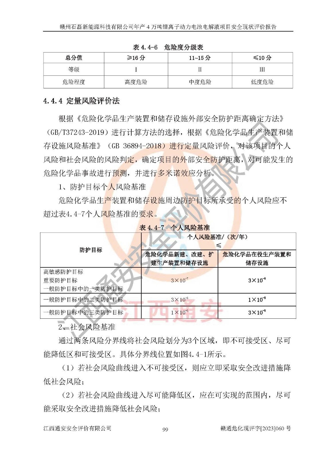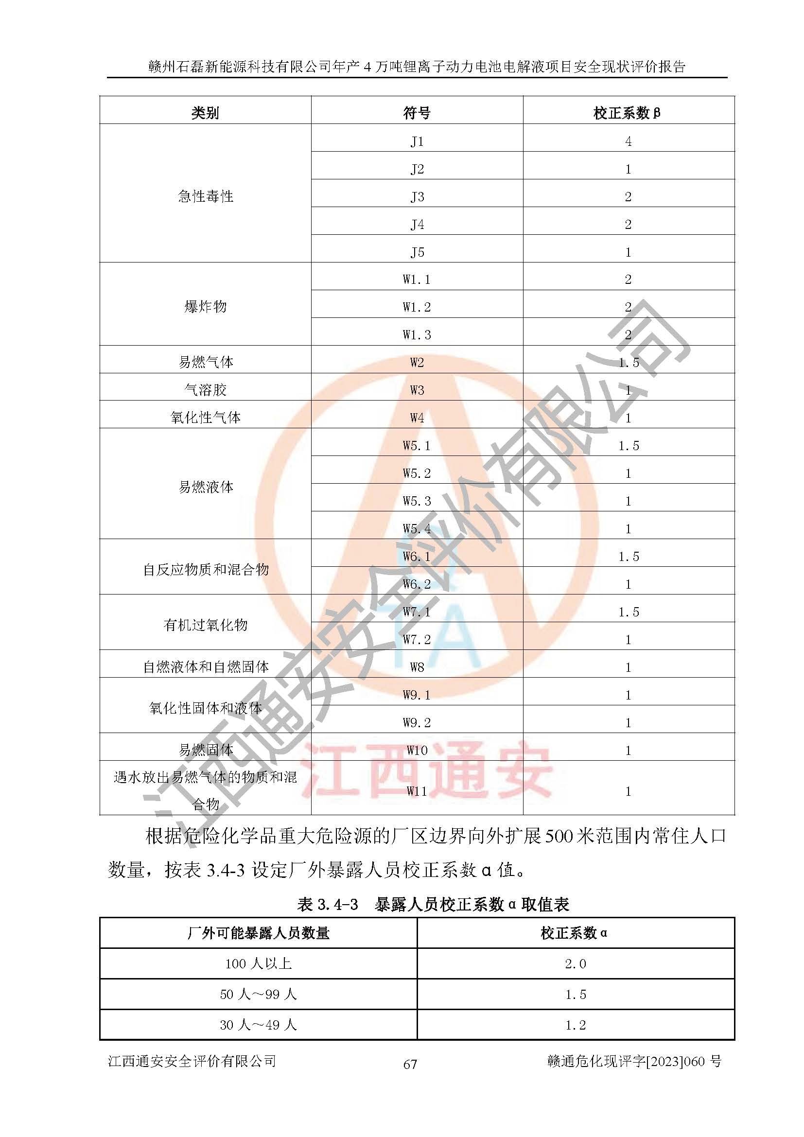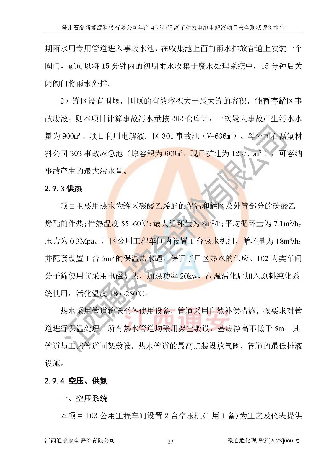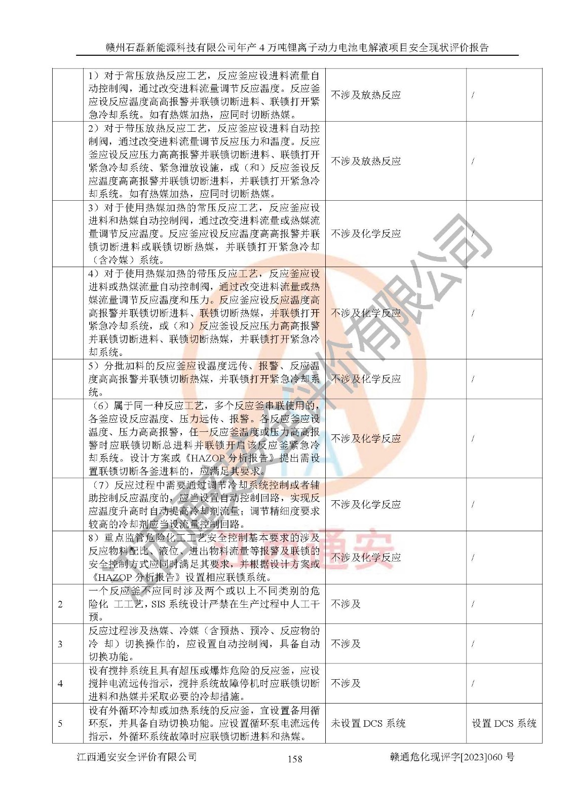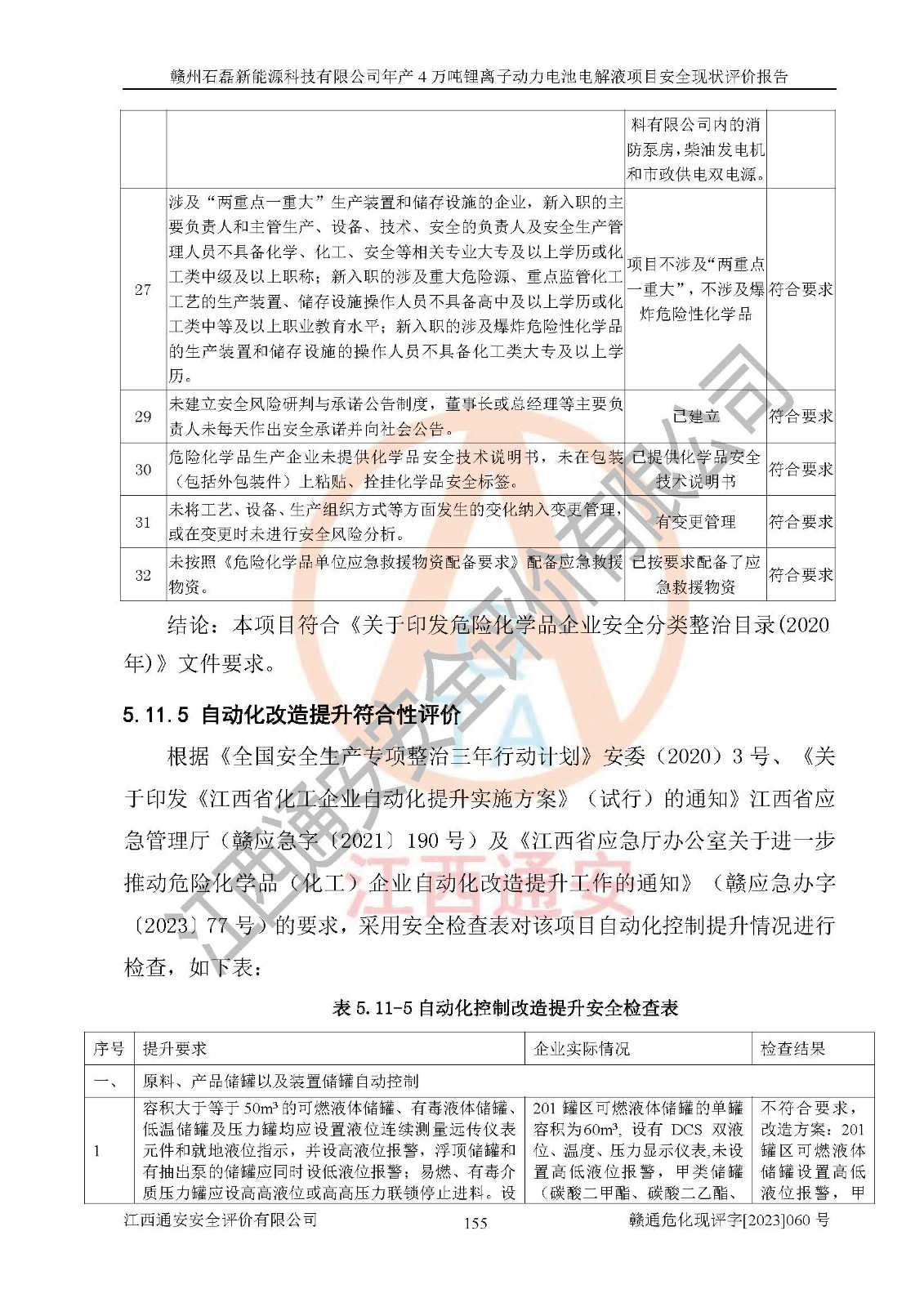 一、安全狀況綜合評(píng)述 1、該項(xiàng)目涉及的原輔材料中碳酸二乙酯、碳酸二甲酯、碳酸甲乙酯、丙酸乙酯、氟苯、丁二腈、己二腈、氮?dú)狻⒙?lián)苯及R22屬于危險(xiǎn)化學(xué)品,產(chǎn)品鋰離子電解液屬于危險(xiǎn)化學(xué)品。 2、該項(xiàng)目生產(chǎn)過(guò)程中存在的危險(xiǎn)、有害因素有:火災(zāi)與爆炸、觸電、中毒與窒息、灼燙、機(jī)械傷害、**傷害、高處墜落、物體打擊和其他傷害等危險(xiǎn)有害因素,其中*主要的危險(xiǎn)有害因素是火災(zāi)與爆炸、中毒與窒息。 3、該項(xiàng)目不涉及監(jiān)控化學(xué)品、易制毒化學(xué)品、易制爆危險(xiǎn)化學(xué)品、劇毒化學(xué)品、重點(diǎn)監(jiān)管危險(xiǎn)化學(xué)品和特別管控的危險(xiǎn)化學(xué)品。 4、該項(xiàng)目不涉及重點(diǎn)監(jiān)管的危險(xiǎn)化工工藝。 5、按照《危險(xiǎn)化學(xué)品重大危險(xiǎn)源辨識(shí)》(GB18218-2018)進(jìn)行辨識(shí),該項(xiàng)目生產(chǎn)單元和儲(chǔ)存單元均不構(gòu)成危險(xiǎn)化學(xué)品重大危險(xiǎn)源。 二、定量評(píng)價(jià)結(jié)果 1、作業(yè)條件危險(xiǎn)性評(píng)價(jià)結(jié)果:在選定的9個(gè)評(píng)價(jià)單元的作業(yè)危險(xiǎn)程度為“一般危險(xiǎn),需要注意”或以下,作業(yè)條件相對(duì)安全。 2、危險(xiǎn)度評(píng)價(jià)結(jié)果:101甲類車間、202甲類倉(cāng)庫(kù)、貯罐區(qū)的危險(xiǎn)程度均為**危險(xiǎn),甲類車間、甲類倉(cāng)庫(kù)和甲類貯罐區(qū)內(nèi)均設(shè)置了可燃?xì)怏w檢測(cè)報(bào)警裝置,并定期進(jìn)行校驗(yàn)**其正常工作。廠內(nèi)建構(gòu)筑物按設(shè)計(jì)要求設(shè)置了防雷防靜電接地裝置,并定期檢驗(yàn);爆炸危險(xiǎn)區(qū)域內(nèi)的電氣設(shè)備采用防爆電機(jī),消防設(shè)施通過(guò)了消防驗(yàn)收,車間生產(chǎn)裝置和儲(chǔ)罐采用密閉化、機(jī)械化和自動(dòng)化,設(shè)備本質(zhì)安全度高,并且應(yīng)在各作業(yè)場(chǎng)所為作業(yè)人員配置了勞動(dòng)保護(hù)用品和器具,作業(yè)人員經(jīng)過(guò)廠內(nèi)三級(jí)安全培訓(xùn),考核合格上崗。項(xiàng)目的安全設(shè)施和安全管理符合安全生產(chǎn)條件,能**降低火災(zāi)爆炸事故發(fā)生的可能性,使風(fēng)險(xiǎn)降低到可接受范圍內(nèi)。 3、個(gè)人風(fēng)險(xiǎn)和社會(huì)風(fēng)險(xiǎn)分析結(jié)果:根據(jù)個(gè)人風(fēng)險(xiǎn)分析效果圖,該項(xiàng)目不涉及高敏感防護(hù)目標(biāo)、重要防護(hù)目標(biāo)、一般防護(hù)目標(biāo)中的一類防護(hù)目標(biāo)(≤3×10-6)等值線、二類防護(hù)目標(biāo)(≤1×10-5)等值線和三類防護(hù)目標(biāo)(≤3×10-5)等值線,個(gè)人風(fēng)險(xiǎn)符合要求;根據(jù)社會(huì)風(fēng)險(xiǎn)分析效果圖可知,該項(xiàng)目社會(huì)風(fēng)險(xiǎn)在可接受范圍內(nèi)。 4、可能發(fā)生的危險(xiǎn)化學(xué)品事故的預(yù)測(cè)后果:該項(xiàng)目貯罐區(qū)和101生產(chǎn)車間災(zāi)害模式為池火,泄漏模式為容器中孔泄漏或容器整體破裂,事故預(yù)測(cè)后果*大的儲(chǔ)罐為碳酸二甲酯儲(chǔ)罐,發(fā)生事故的*大死亡半徑為9m;*大重傷半徑13m,*大輕傷半徑為19m。本項(xiàng)目液氮罐西北側(cè)設(shè)有一臺(tái)50m3液氮罐,液氮罐發(fā)生物理爆炸的*大死亡半徑為18m;*大重傷半徑32m,*大輕傷半徑為54m,多米諾半徑為25m。 5、多米諾效應(yīng)分析:該項(xiàng)目貯罐區(qū)和101車間災(zāi)害模式為池火,無(wú)多米諾半徑。液氮罐發(fā)生物理爆炸的多米諾半徑為25m,多米諾影響區(qū)局限在廠內(nèi)。201罐區(qū)有部分儲(chǔ)罐在多米諾影響區(qū)內(nèi),如液氮罐發(fā)生物理爆炸,會(huì)引發(fā)多米諾效應(yīng),導(dǎo)致罐區(qū)儲(chǔ)罐破裂,可燃液體泄漏發(fā)生池火災(zāi)的可能。因此應(yīng)重點(diǎn)關(guān)注液氮儲(chǔ)罐、201貯罐區(qū)等關(guān)鍵裝置安全設(shè)施的完整和**性,**運(yùn)行良好。 三、定性評(píng)價(jià)結(jié)果 1、依據(jù)相關(guān)法律、法規(guī)、標(biāo)準(zhǔn)等的規(guī)定,該項(xiàng)目外部安全條件、總平面布置、工藝及設(shè)備、防火防爆安全設(shè)施等符合**相關(guān)標(biāo)準(zhǔn)規(guī)范的要求,能滿足安全生產(chǎn)的要求。 2、該項(xiàng)目公用輔助設(shè)施能夠滿足安全生產(chǎn)的要求。 3、該項(xiàng)目按要求設(shè)置了安全生產(chǎn)管理機(jī)構(gòu),配備了專職安全生產(chǎn)管理人員,建立了安全生產(chǎn)責(zé)任制,制定了安全管理制度和崗位安全操作規(guī)程等。該公司修訂了生產(chǎn)安全事故應(yīng)急預(yù)案,配備了應(yīng)急救援器材,按要求定期進(jìn)行相關(guān)培訓(xùn)及演練。 4、該項(xiàng)目不涉及“兩重點(diǎn)一重大”,公司主要負(fù)責(zé)人、安全管理人員經(jīng)培訓(xùn)考核取得了相應(yīng)的安全資格證書。主要負(fù)責(zé)人的專業(yè)和學(xué)歷符合要求,公司任命了許惠彬和王佛金為專職安全管理人員,許惠彬的學(xué)歷和專業(yè)均符合要求,王佛金于2021年9月報(bào)名參加了大專應(yīng)用化工技術(shù)專業(yè)學(xué)歷提升,預(yù)計(jì)2024年1月畢業(yè),屆時(shí)可滿足危險(xiǎn)化學(xué)品企業(yè)重點(diǎn)人員安