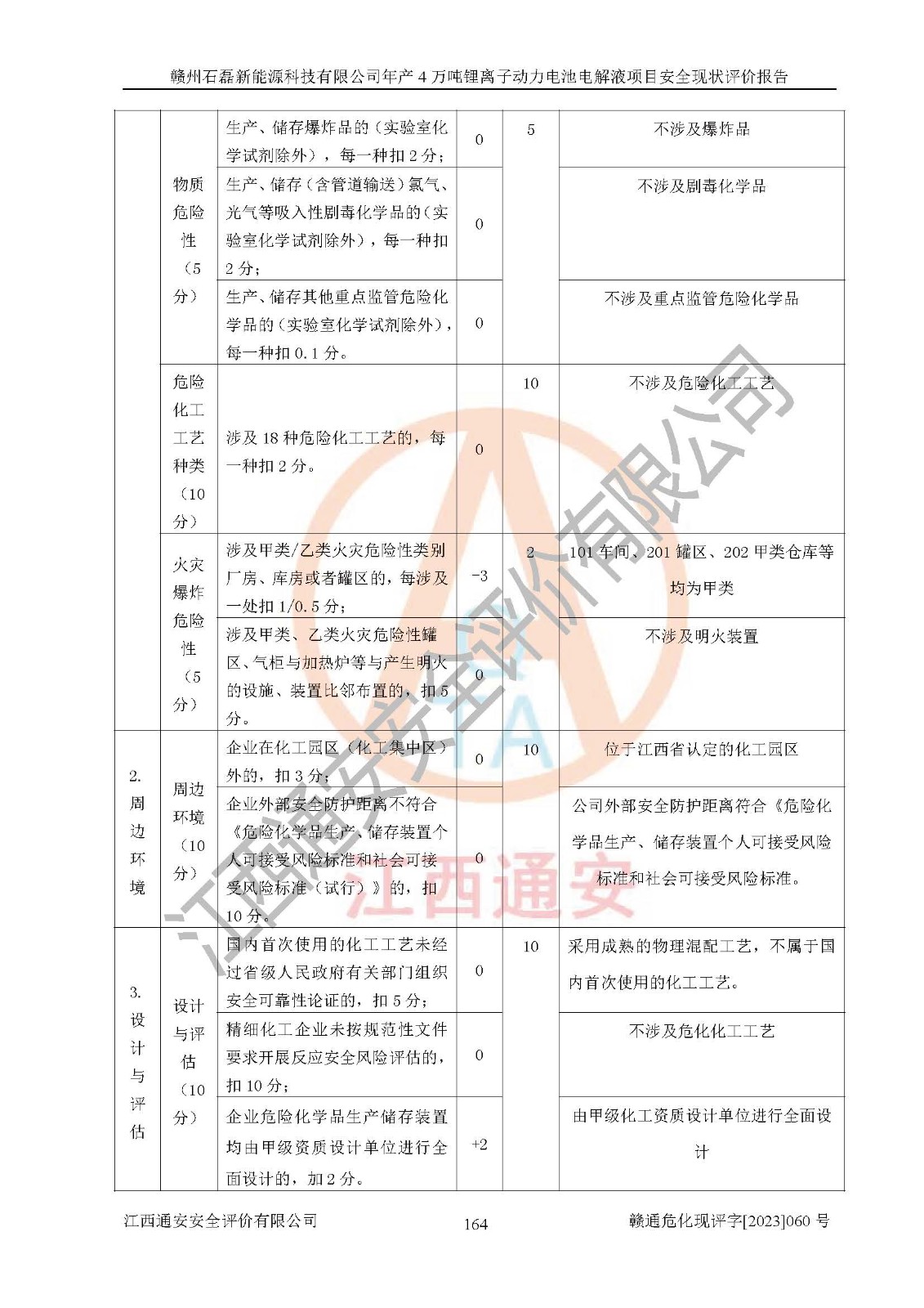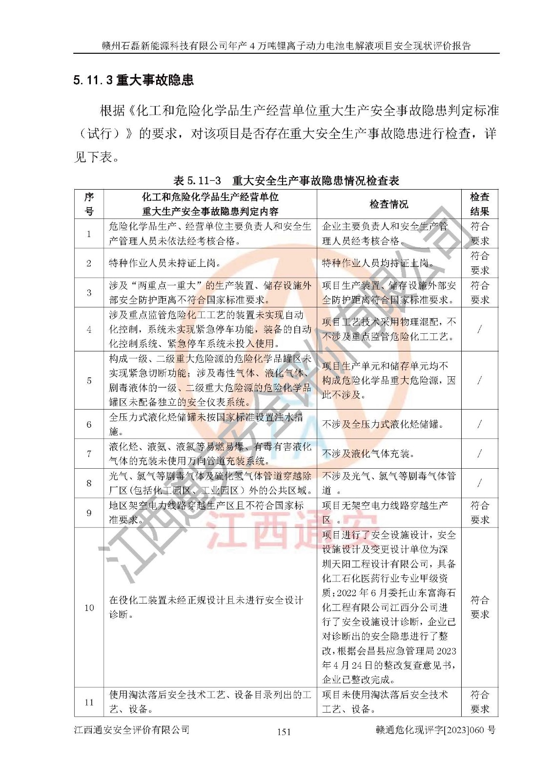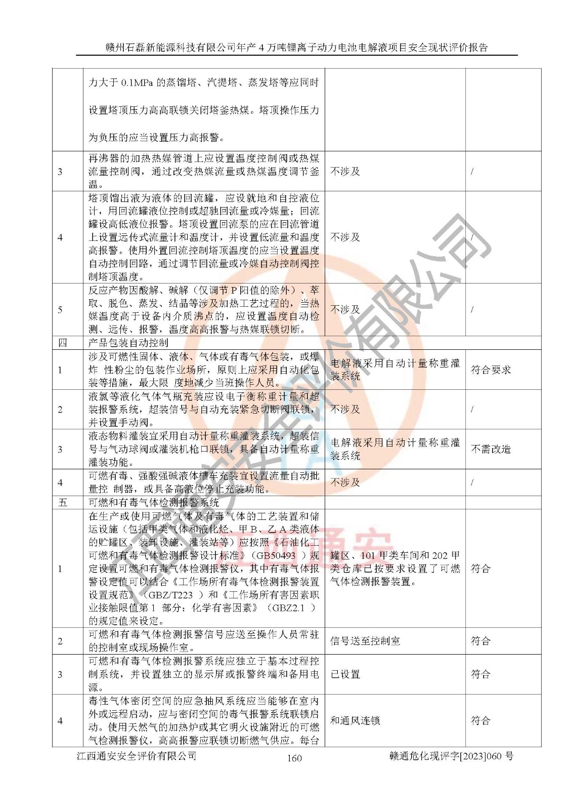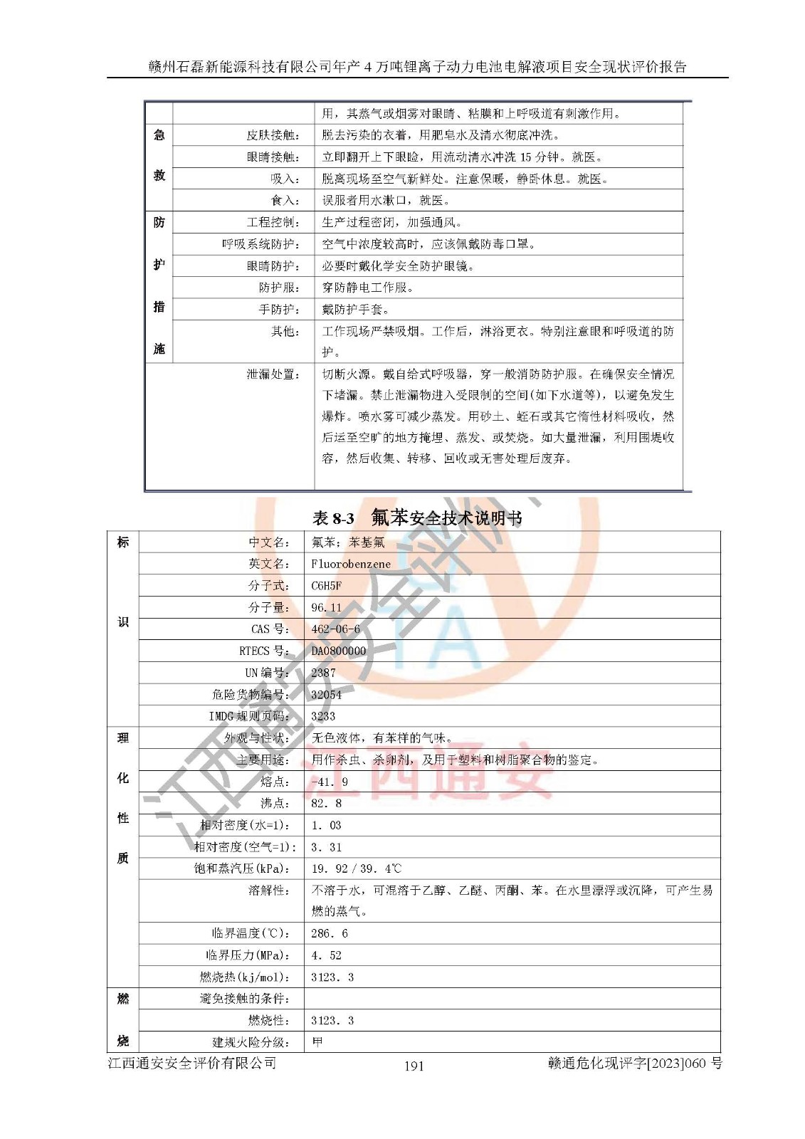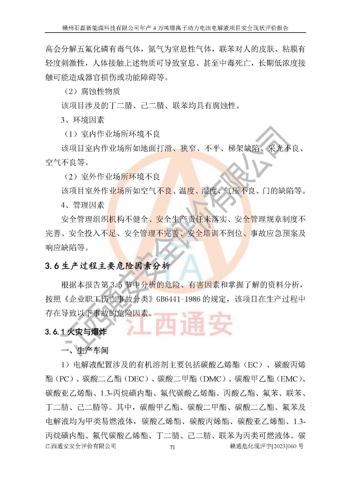 一、安全狀況綜合評(píng)述 1、該項(xiàng)目涉及的原輔材料中碳酸二乙酯、碳酸二甲酯、碳酸甲乙酯、丙酸乙酯、氟苯、丁二腈、己二腈、氮?dú)狻⒙?lián)苯及R22屬于危險(xiǎn)化學(xué)品,產(chǎn)品鋰離子電解液屬于危險(xiǎn)化學(xué)品。 2、該項(xiàng)目生產(chǎn)過(guò)程中存在的危險(xiǎn)、有害因素有:火災(zāi)與爆炸、觸電、中毒與窒息、灼燙、機(jī)械傷害、**傷害、高處墜落、物體打擊和其他傷害等危險(xiǎn)有害因素,其中*主要的危險(xiǎn)有害因素是火災(zāi)與爆炸、中毒與窒息。 3、該項(xiàng)目不涉及監(jiān)控化學(xué)品、易制毒化學(xué)品、易制爆危險(xiǎn)化學(xué)品、劇毒化學(xué)品、重點(diǎn)監(jiān)管危險(xiǎn)化學(xué)品和特別管控的危險(xiǎn)化學(xué)品。 4、該項(xiàng)目不涉及重點(diǎn)監(jiān)管的危險(xiǎn)化工工藝。 5、按照《危險(xiǎn)化學(xué)品重大危險(xiǎn)源辨識(shí)》(GB18218-2018)進(jìn)行辨識(shí),該項(xiàng)目生產(chǎn)單元和儲(chǔ)存單元均不構(gòu)成危險(xiǎn)化學(xué)品重大危險(xiǎn)源。 二、定量評(píng)價(jià)結(jié)果 1、作業(yè)條件危險(xiǎn)性評(píng)價(jià)結(jié)果:在選定的9個(gè)評(píng)價(jià)單元的作業(yè)危險(xiǎn)程度為“一般危險(xiǎn),需要注意”或以下,作業(yè)條件相對(duì)安全。 2、危險(xiǎn)度評(píng)價(jià)結(jié)果:101甲類車間、202甲類倉(cāng)庫(kù)、貯罐區(qū)的危險(xiǎn)程度均為**危險(xiǎn),甲類車間、甲類倉(cāng)庫(kù)和甲類貯罐區(qū)內(nèi)均設(shè)置了可燃?xì)怏w檢測(cè)報(bào)警裝置,并定期進(jìn)行校驗(yàn)**其正常工作。廠內(nèi)建構(gòu)筑物按設(shè)計(jì)要求設(shè)置了防雷防靜電接地裝置,并定期檢驗(yàn);爆炸危險(xiǎn)區(qū)域內(nèi)的電氣設(shè)備采用防爆電機(jī),消防設(shè)施通過(guò)了消防驗(yàn)收,車間生產(chǎn)裝置和儲(chǔ)罐采用密閉化、機(jī)械化和自動(dòng)化,設(shè)備本質(zhì)安全度高,并且應(yīng)在各作業(yè)場(chǎng)所為作業(yè)人員配置了勞動(dòng)保護(hù)用品和器具,作業(yè)人員經(jīng)過(guò)廠內(nèi)三級(jí)安全培訓(xùn),考核合格上崗。項(xiàng)目的安全設(shè)施和安全管理符合安全生產(chǎn)條件,能**降低火災(zāi)爆炸事故發(fā)生的可能性,使風(fēng)險(xiǎn)降低到可接受范圍內(nèi)。 3、個(gè)人風(fēng)險(xiǎn)和社會(huì)風(fēng)險(xiǎn)分析結(jié)果:根據(jù)個(gè)人風(fēng)險(xiǎn)分析效果圖,該項(xiàng)目不涉及高敏感防護(hù)目標(biāo)、重要防護(hù)目標(biāo)、一般防護(hù)目標(biāo)中的一類防護(hù)目標(biāo)(≤3×10-6)等值線、二類防護(hù)目標(biāo)(≤1×10-5)等值線和三類防護(hù)目標(biāo)(≤3×10-5)等值線,個(gè)人風(fēng)險(xiǎn)符合要求;根據(jù)社會(huì)風(fēng)險(xiǎn)分析效果圖可知,該項(xiàng)目社會(huì)風(fēng)險(xiǎn)在可接受范圍內(nèi)。 4、可能發(fā)生的危險(xiǎn)化學(xué)品事故的預(yù)測(cè)后果:該項(xiàng)目貯罐區(qū)和101生產(chǎn)車間災(zāi)害模式為池火,泄漏模式為容器中孔泄漏或容器整體破裂,事故預(yù)測(cè)后果*大的儲(chǔ)罐為碳酸二甲酯儲(chǔ)罐,發(fā)生事故的*大死亡半徑為9m;*大重傷半徑13m,*大輕傷半徑為19m。本項(xiàng)目液氮罐西北側(cè)設(shè)有一臺(tái)50m3液氮罐,液氮罐發(fā)生物理爆炸的*大死亡半徑為18m;*大重傷半徑32m,*大輕傷半徑為54m,多米諾半徑為25m。 5、多米諾效應(yīng)分析:該項(xiàng)目貯罐區(qū)和101車間災(zāi)害模式為池火,無(wú)多米諾半徑。液氮罐發(fā)生物理爆炸的多米諾半徑為25m,多米諾影響區(qū)局限在廠內(nèi)。201罐區(qū)有部分儲(chǔ)罐在多米諾影響區(qū)內(nèi),如液氮罐發(fā)生物理爆炸,會(huì)引發(fā)多米諾效應(yīng),導(dǎo)致罐區(qū)儲(chǔ)罐破裂,可燃液體泄漏發(fā)生池火災(zāi)的可能。因此應(yīng)重點(diǎn)關(guān)注液氮儲(chǔ)罐、201貯罐區(qū)等關(guān)鍵裝置安全設(shè)施的完整和**性,**運(yùn)行良好。 三、定性評(píng)價(jià)結(jié)果 1、依據(jù)相關(guān)法律、法規(guī)、標(biāo)準(zhǔn)等的規(guī)定,該項(xiàng)目外部安全條件、總平面布置、工藝及設(shè)備、防火防爆安全設(shè)施等符合**相關(guān)標(biāo)準(zhǔn)規(guī)范的要求,能滿足安全生產(chǎn)的要求。 2、該項(xiàng)目公用輔助設(shè)施能夠滿足安全生產(chǎn)的要求。 3、該項(xiàng)目按要求設(shè)置了安全生產(chǎn)管理機(jī)構(gòu),配備了專職安全生產(chǎn)管理人員,建立了安全生產(chǎn)責(zé)任制,制定了安全管理制度和崗位安全操作規(guī)程等。該公司修訂了生產(chǎn)安全事故應(yīng)急預(yù)案,配備了應(yīng)急救援器材,按要求定期進(jìn)行相關(guān)培訓(xùn)及演練。 4、該項(xiàng)目不涉及“兩重點(diǎn)一重大”,公司主要負(fù)責(zé)人、安全管理人員經(jīng)培訓(xùn)考核取得了相應(yīng)的安全資格證書。主要負(fù)責(zé)人的專業(yè)和學(xué)歷符合要求,公司任命了許惠彬和王佛金為專職安全管理人員,許惠彬的學(xué)歷和專業(yè)均符合要求,王佛金于2021年9月報(bào)名參加了大專應(yīng)用化工技術(shù)專業(yè)學(xué)歷提升,預(yù)計(jì)2024年1月畢業(yè),屆時(shí)可滿足危險(xiǎn)化學(xué)品企業(yè)重點(diǎn)人員安