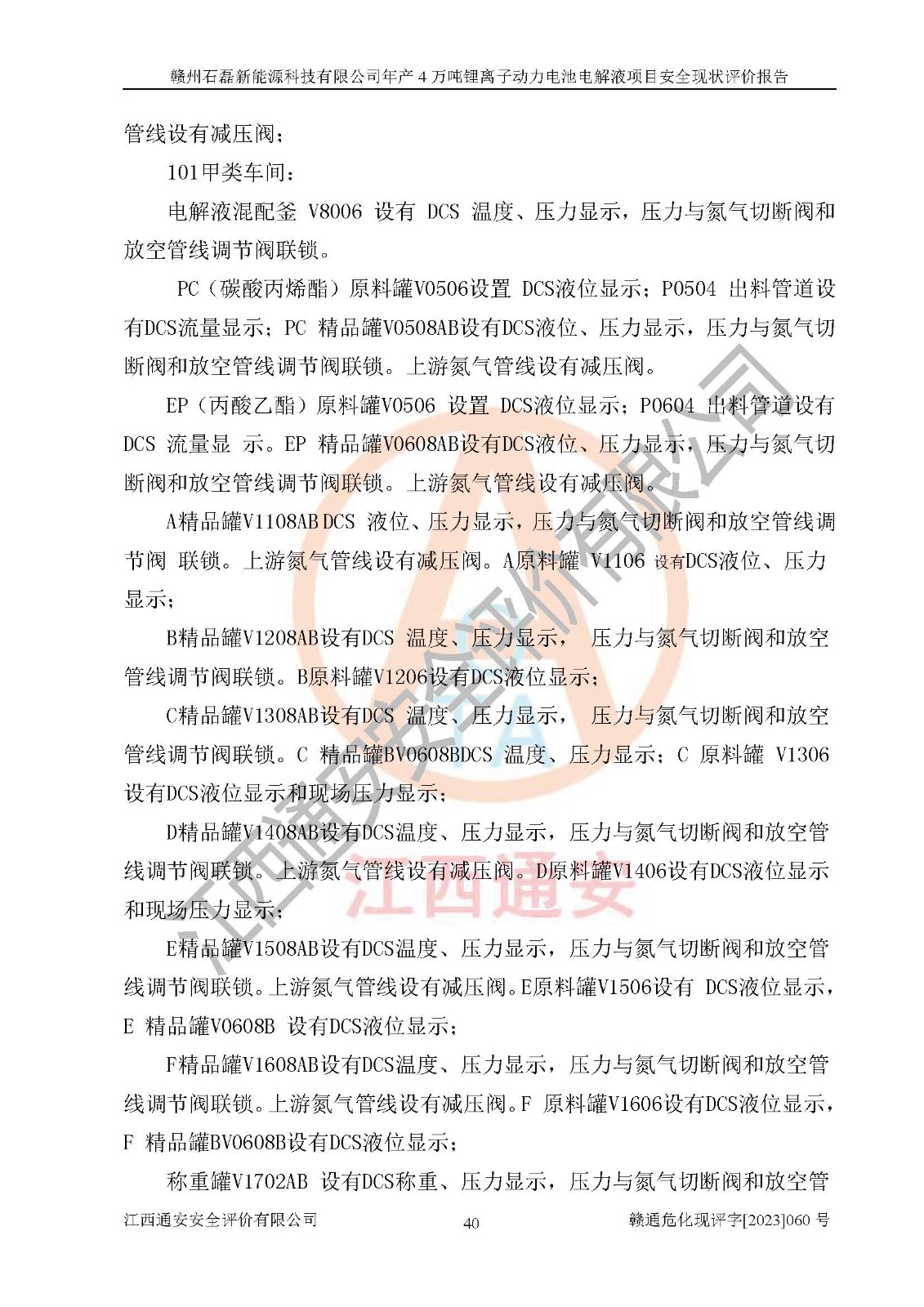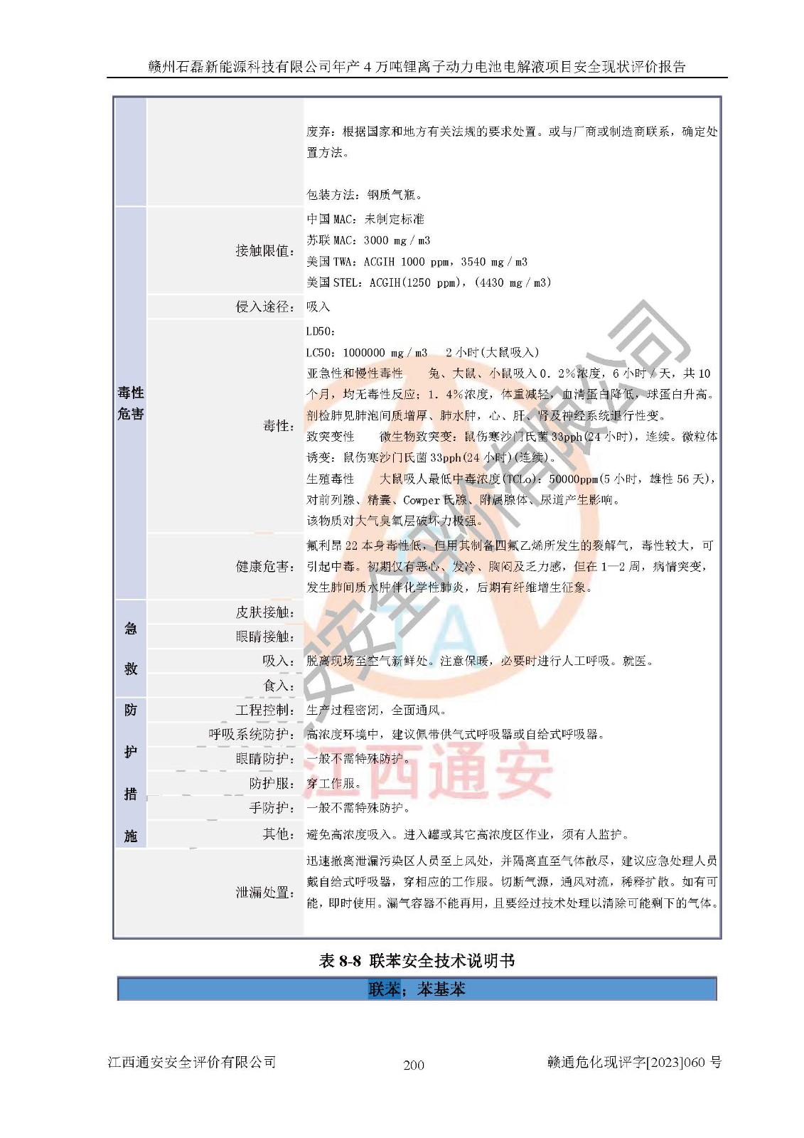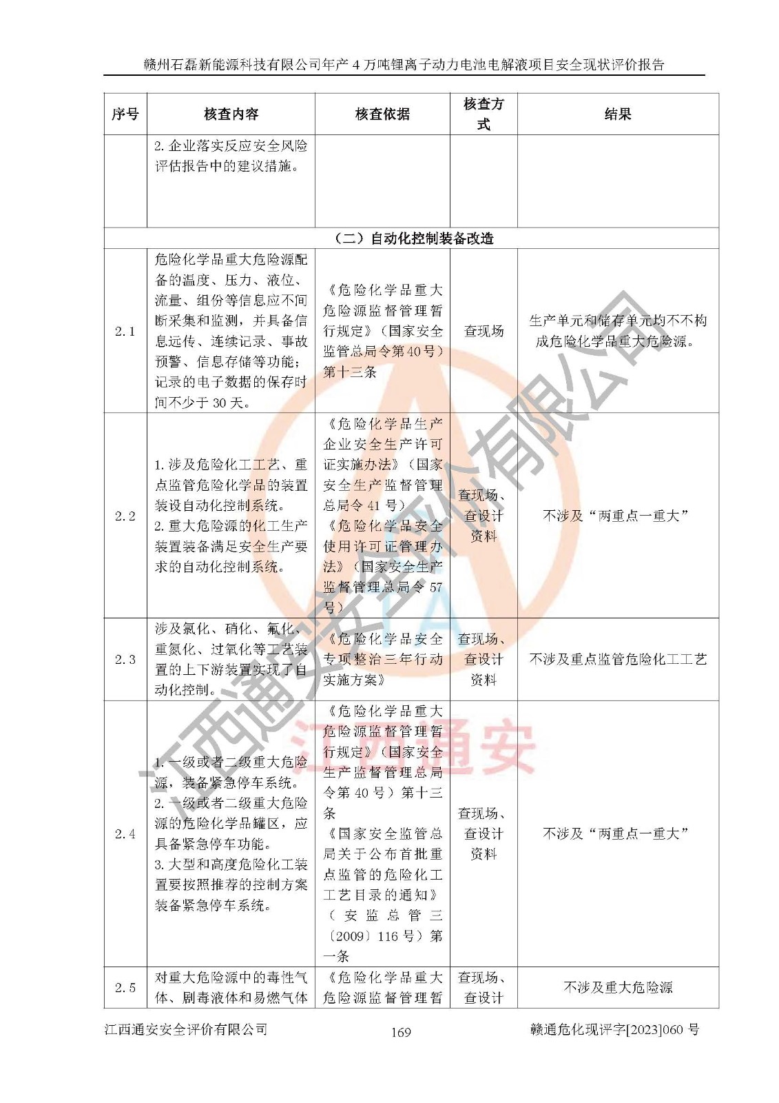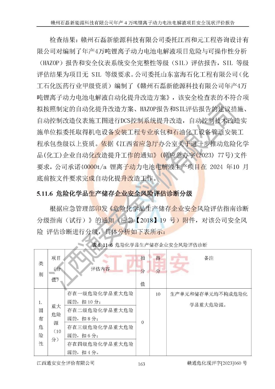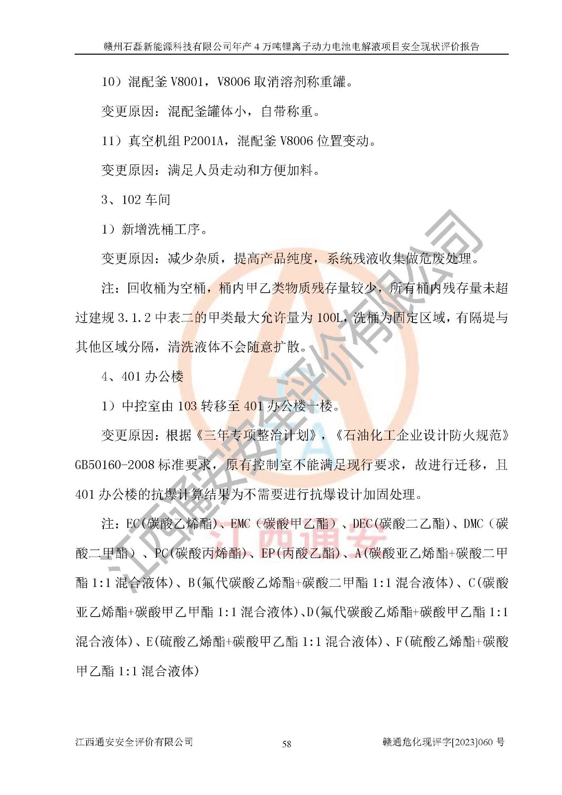 一、安全狀況綜合評(píng)述 1、該項(xiàng)目涉及的原輔材料中碳酸二乙酯、碳酸二甲酯、碳酸甲乙酯、丙酸乙酯、氟苯、丁二腈、己二腈、氮?dú)狻⒙?lián)苯及R22屬于危險(xiǎn)化學(xué)品,產(chǎn)品鋰離子電解液屬于危險(xiǎn)化學(xué)品。 2、該項(xiàng)目生產(chǎn)過(guò)程中存在的危險(xiǎn)、有害因素有:火災(zāi)與爆炸、觸電、中毒與窒息、灼燙、機(jī)械傷害、**傷害、高處墜落、物體打擊和其他傷害等危險(xiǎn)有害因素,其中*主要的危險(xiǎn)有害因素是火災(zāi)與爆炸、中毒與窒息。 3、該項(xiàng)目不涉及監(jiān)控化學(xué)品、易制毒化學(xué)品、易制爆危險(xiǎn)化學(xué)品、劇毒化學(xué)品、重點(diǎn)監(jiān)管危險(xiǎn)化學(xué)品和特別管控的危險(xiǎn)化學(xué)品。 4、該項(xiàng)目不涉及重點(diǎn)監(jiān)管的危險(xiǎn)化工工藝。 5、按照《危險(xiǎn)化學(xué)品重大危險(xiǎn)源辨識(shí)》(GB18218-2018)進(jìn)行辨識(shí),該項(xiàng)目生產(chǎn)單元和儲(chǔ)存單元均不構(gòu)成危險(xiǎn)化學(xué)品重大危險(xiǎn)源。 二、定量評(píng)價(jià)結(jié)果 1、作業(yè)條件危險(xiǎn)性評(píng)價(jià)結(jié)果:在選定的9個(gè)評(píng)價(jià)單元的作業(yè)危險(xiǎn)程度為“一般危險(xiǎn),需要注意”或以下,作業(yè)條件相對(duì)安全。 2、危險(xiǎn)度評(píng)價(jià)結(jié)果:101甲類車間、202甲類倉(cāng)庫(kù)、貯罐區(qū)的危險(xiǎn)程度均為**危險(xiǎn),甲類車間、甲類倉(cāng)庫(kù)和甲類貯罐區(qū)內(nèi)均設(shè)置了可燃?xì)怏w檢測(cè)報(bào)警裝置,并定期進(jìn)行校驗(yàn)**其正常工作。廠內(nèi)建構(gòu)筑物按設(shè)計(jì)要求設(shè)置了防雷防靜電接地裝置,并定期檢驗(yàn);爆炸危險(xiǎn)區(qū)域內(nèi)的電氣設(shè)備采用防爆電機(jī),消防設(shè)施通過(guò)了消防驗(yàn)收,車間生產(chǎn)裝置和儲(chǔ)罐采用密閉化、機(jī)械化和自動(dòng)化,設(shè)備本質(zhì)安全度高,并且應(yīng)在各作業(yè)場(chǎng)所為作業(yè)人員配置了勞動(dòng)保護(hù)用品和器具,作業(yè)人員經(jīng)過(guò)廠內(nèi)三級(jí)安全培訓(xùn),考核合格上崗。項(xiàng)目的安全設(shè)施和安全管理符合安全生產(chǎn)條件,能**降低火災(zāi)爆炸事故發(fā)生的可能性,使風(fēng)險(xiǎn)降低到可接受范圍內(nèi)。 3、個(gè)人風(fēng)險(xiǎn)和社會(huì)風(fēng)險(xiǎn)分析結(jié)果:根據(jù)個(gè)人風(fēng)險(xiǎn)分析效果圖,該項(xiàng)目不涉及高敏感防護(hù)目標(biāo)、重要防護(hù)目標(biāo)、一般防護(hù)目標(biāo)中的一類防護(hù)目標(biāo)(≤3×10-6)等值線、二類防護(hù)目標(biāo)(≤1×10-5)等值線和三類防護(hù)目標(biāo)(≤3×10-5)等值線,個(gè)人風(fēng)險(xiǎn)符合要求;根據(jù)社會(huì)風(fēng)險(xiǎn)分析效果圖可知,該項(xiàng)目社會(huì)風(fēng)險(xiǎn)在可接受范圍內(nèi)。 4、可能發(fā)生的危險(xiǎn)化學(xué)品事故的預(yù)測(cè)后果:該項(xiàng)目貯罐區(qū)和101生產(chǎn)車間災(zāi)害模式為池火,泄漏模式為容器中孔泄漏或容器整體破裂,事故預(yù)測(cè)后果*大的儲(chǔ)罐為碳酸二甲酯儲(chǔ)罐,發(fā)生事故的*大死亡半徑為9m;*大重傷半徑13m,*大輕傷半徑為19m。本項(xiàng)目液氮罐西北側(cè)設(shè)有一臺(tái)50m3液氮罐,液氮罐發(fā)生物理爆炸的*大死亡半徑為18m;*大重傷半徑32m,*大輕傷半徑為54m,多米諾半徑為25m。 5、多米諾效應(yīng)分析:該項(xiàng)目貯罐區(qū)和101車間災(zāi)害模式為池火,無(wú)多米諾半徑。液氮罐發(fā)生物理爆炸的多米諾半徑為25m,多米諾影響區(qū)局限在廠內(nèi)。201罐區(qū)有部分儲(chǔ)罐在多米諾影響區(qū)內(nèi),如液氮罐發(fā)生物理爆炸,會(huì)引發(fā)多米諾效應(yīng),導(dǎo)致罐區(qū)儲(chǔ)罐破裂,可燃液體泄漏發(fā)生池火災(zāi)的可能。因此應(yīng)重點(diǎn)關(guān)注液氮儲(chǔ)罐、201貯罐區(qū)等關(guān)鍵裝置安全設(shè)施的完整和**性,**運(yùn)行良好。 三、定性評(píng)價(jià)結(jié)果 1、依據(jù)相關(guān)法律、法規(guī)、標(biāo)準(zhǔn)等的規(guī)定,該項(xiàng)目外部安全條件、總平面布置、工藝及設(shè)備、防火防爆安全設(shè)施等符合**相關(guān)標(biāo)準(zhǔn)規(guī)范的要求,能滿足安全生產(chǎn)的要求。 2、該項(xiàng)目公用輔助設(shè)施能夠滿足安全生產(chǎn)的要求。 3、該項(xiàng)目按要求設(shè)置了安全生產(chǎn)管理機(jī)構(gòu),配備了專職安全生產(chǎn)管理人員,建立了安全生產(chǎn)責(zé)任制,制定了安全管理制度和崗位安全操作規(guī)程等。該公司修訂了生產(chǎn)安全事故應(yīng)急預(yù)案,配備了應(yīng)急救援器材,按要求定期進(jìn)行相關(guān)培訓(xùn)及演練。 4、該項(xiàng)目不涉及“兩重點(diǎn)一重大”,公司主要負(fù)責(zé)人、安全管理人員經(jīng)培訓(xùn)考核取得了相應(yīng)的安全資格證書。主要負(fù)責(zé)人的專業(yè)和學(xué)歷符合要求,公司任命了許惠彬和王佛金為專職安全管理人員,許惠彬的學(xué)歷和專業(yè)均符合要求,王佛金于2021年9月報(bào)名參加了大專應(yīng)用化工技術(shù)專業(yè)學(xué)歷提升,預(yù)計(jì)2024年1月畢業(yè),屆時(shí)可滿足危險(xiǎn)化學(xué)品企業(yè)重點(diǎn)人員安