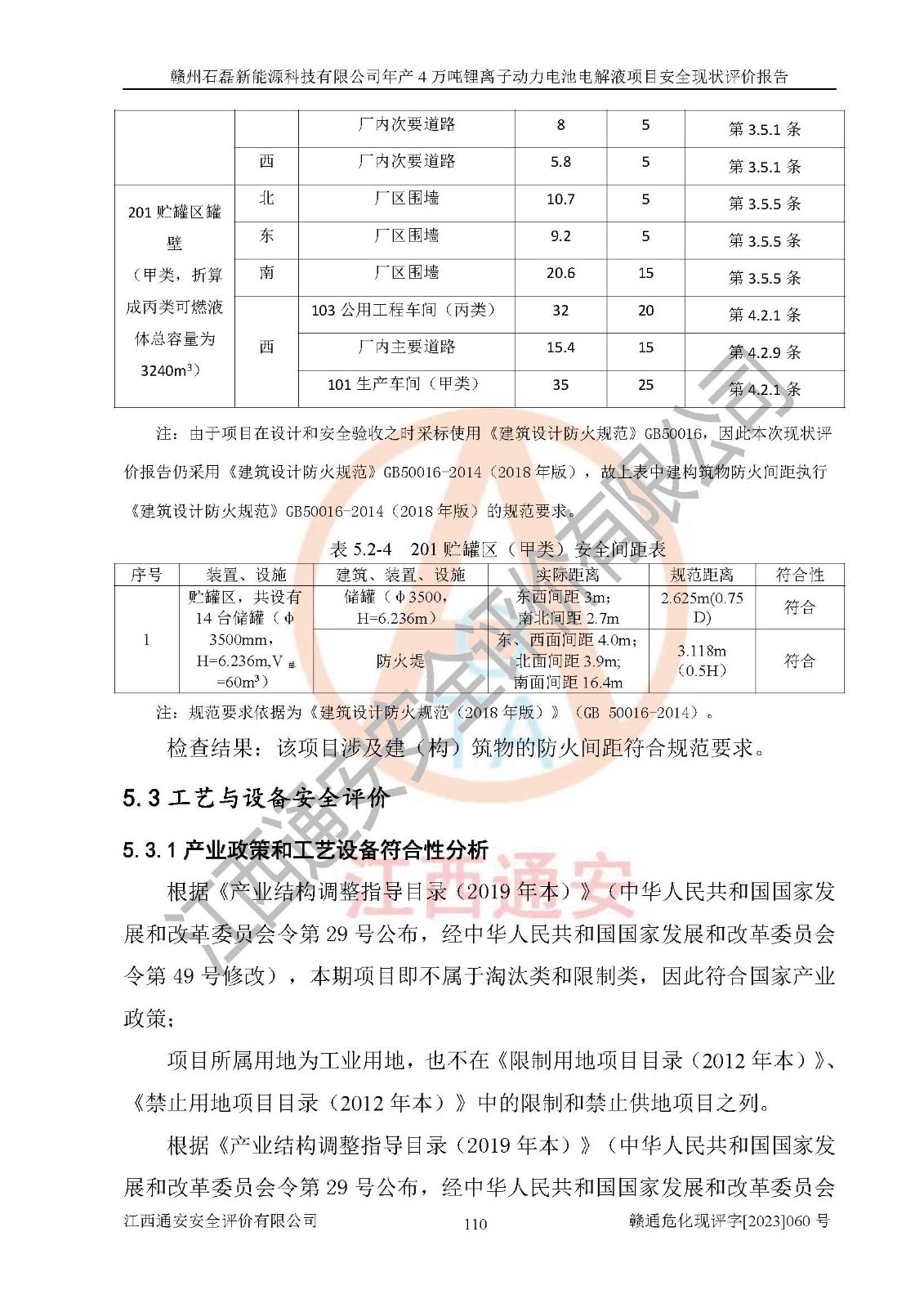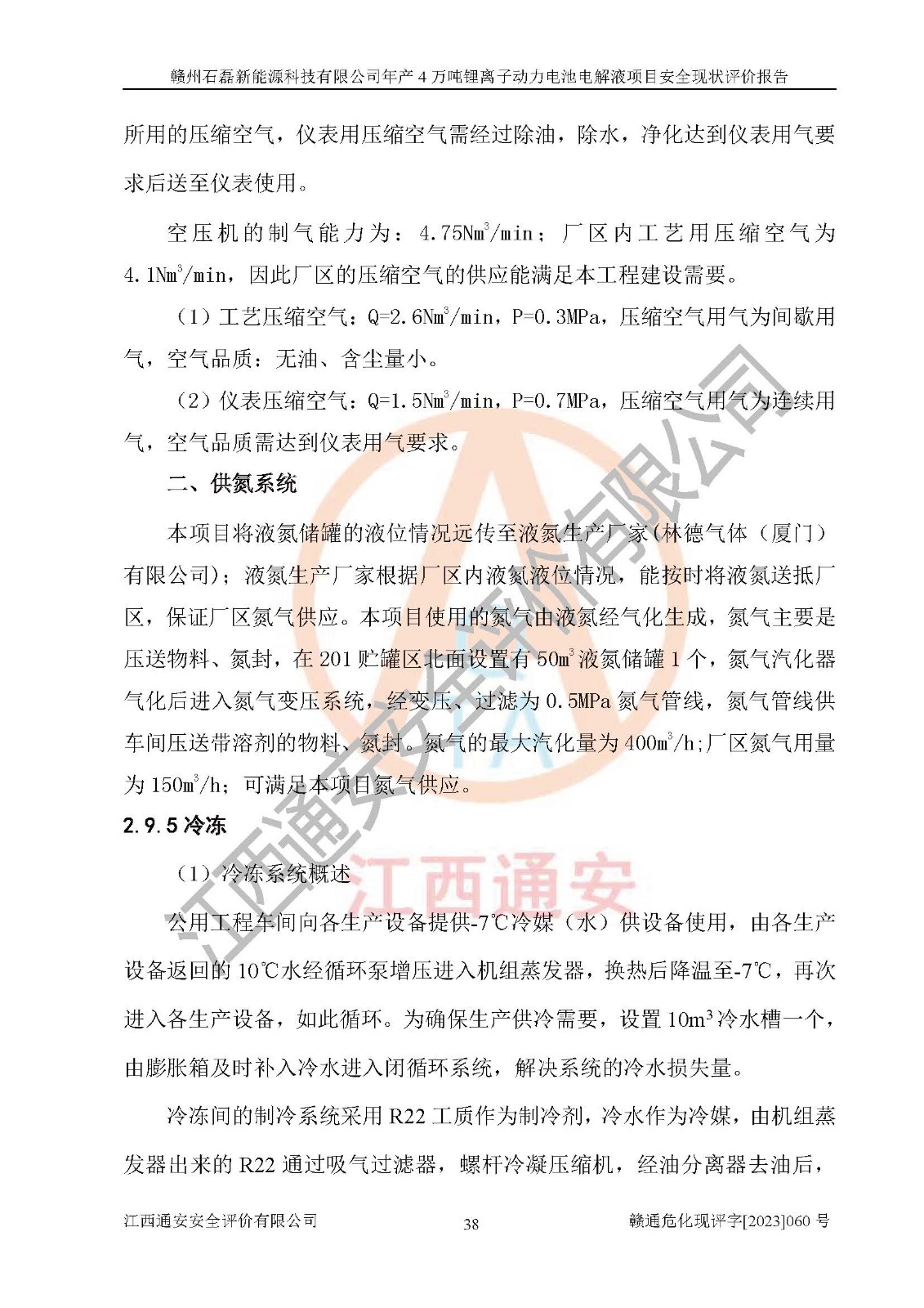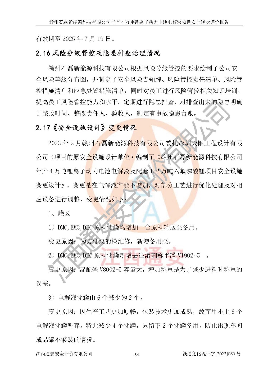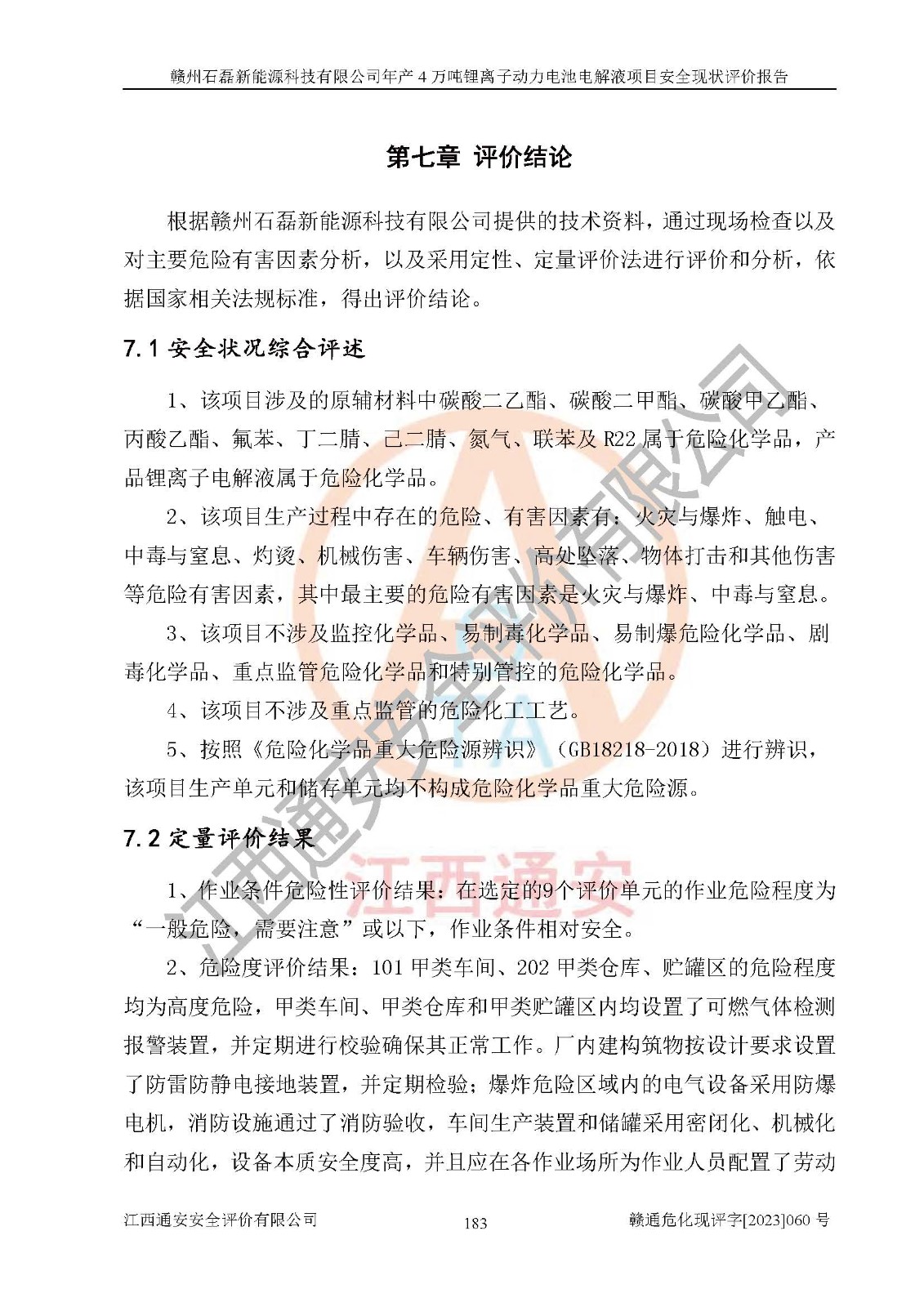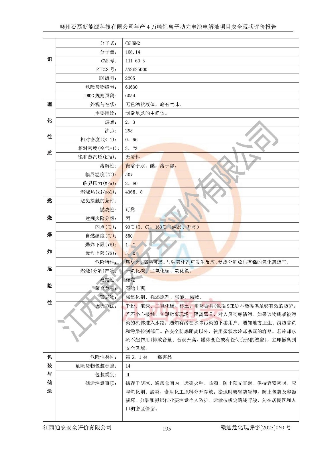 一、安全狀況綜合評(píng)述 1、該項(xiàng)目涉及的原輔材料中碳酸二乙酯、碳酸二甲酯、碳酸甲乙酯、丙酸乙酯、氟苯、丁二腈、己二腈、氮?dú)狻⒙?lián)苯及R22屬于危險(xiǎn)化學(xué)品,產(chǎn)品鋰離子電解液屬于危險(xiǎn)化學(xué)品。 2、該項(xiàng)目生產(chǎn)過(guò)程中存在的危險(xiǎn)、有害因素有:火災(zāi)與爆炸、觸電、中毒與窒息、灼燙、機(jī)械傷害、**傷害、高處墜落、物體打擊和其他傷害等危險(xiǎn)有害因素,其中*主要的危險(xiǎn)有害因素是火災(zāi)與爆炸、中毒與窒息。 3、該項(xiàng)目不涉及監(jiān)控化學(xué)品、易制毒化學(xué)品、易制爆危險(xiǎn)化學(xué)品、劇毒化學(xué)品、重點(diǎn)監(jiān)管危險(xiǎn)化學(xué)品和特別管控的危險(xiǎn)化學(xué)品。 4、該項(xiàng)目不涉及重點(diǎn)監(jiān)管的危險(xiǎn)化工工藝。 5、按照《危險(xiǎn)化學(xué)品重大危險(xiǎn)源辨識(shí)》(GB18218-2018)進(jìn)行辨識(shí),該項(xiàng)目生產(chǎn)單元和儲(chǔ)存單元均不構(gòu)成危險(xiǎn)化學(xué)品重大危險(xiǎn)源。 二、定量評(píng)價(jià)結(jié)果 1、作業(yè)條件危險(xiǎn)性評(píng)價(jià)結(jié)果:在選定的9個(gè)評(píng)價(jià)單元的作業(yè)危險(xiǎn)程度為“一般危險(xiǎn),需要注意”或以下,作業(yè)條件相對(duì)安全。 2、危險(xiǎn)度評(píng)價(jià)結(jié)果:101甲類車間、202甲類倉(cāng)庫(kù)、貯罐區(qū)的危險(xiǎn)程度均為**危險(xiǎn),甲類車間、甲類倉(cāng)庫(kù)和甲類貯罐區(qū)內(nèi)均設(shè)置了可燃?xì)怏w檢測(cè)報(bào)警裝置,并定期進(jìn)行校驗(yàn)**其正常工作。廠內(nèi)建構(gòu)筑物按設(shè)計(jì)要求設(shè)置了防雷防靜電接地裝置,并定期檢驗(yàn);爆炸危險(xiǎn)區(qū)域內(nèi)的電氣設(shè)備采用防爆電機(jī),消防設(shè)施通過(guò)了消防驗(yàn)收,車間生產(chǎn)裝置和儲(chǔ)罐采用密閉化、機(jī)械化和自動(dòng)化,設(shè)備本質(zhì)安全度高,并且應(yīng)在各作業(yè)場(chǎng)所為作業(yè)人員配置了勞動(dòng)保護(hù)用品和器具,作業(yè)人員經(jīng)過(guò)廠內(nèi)三級(jí)安全培訓(xùn),考核合格上崗。項(xiàng)目的安全設(shè)施和安全管理符合安全生產(chǎn)條件,能**降低火災(zāi)爆炸事故發(fā)生的可能性,使風(fēng)險(xiǎn)降低到可接受范圍內(nèi)。 3、個(gè)人風(fēng)險(xiǎn)和社會(huì)風(fēng)險(xiǎn)分析結(jié)果:根據(jù)個(gè)人風(fēng)險(xiǎn)分析效果圖,該項(xiàng)目不涉及高敏感防護(hù)目標(biāo)、重要防護(hù)目標(biāo)、一般防護(hù)目標(biāo)中的一類防護(hù)目標(biāo)(≤3×10-6)等值線、二類防護(hù)目標(biāo)(≤1×10-5)等值線和三類防護(hù)目標(biāo)(≤3×10-5)等值線,個(gè)人風(fēng)險(xiǎn)符合要求;根據(jù)社會(huì)風(fēng)險(xiǎn)分析效果圖可知,該項(xiàng)目社會(huì)風(fēng)險(xiǎn)在可接受范圍內(nèi)。 4、可能發(fā)生的危險(xiǎn)化學(xué)品事故的預(yù)測(cè)后果:該項(xiàng)目貯罐區(qū)和101生產(chǎn)車間災(zāi)害模式為池火,泄漏模式為容器中孔泄漏或容器整體破裂,事故預(yù)測(cè)后果*大的儲(chǔ)罐為碳酸二甲酯儲(chǔ)罐,發(fā)生事故的*大死亡半徑為9m;*大重傷半徑13m,*大輕傷半徑為19m。本項(xiàng)目液氮罐西北側(cè)設(shè)有一臺(tái)50m3液氮罐,液氮罐發(fā)生物理爆炸的*大死亡半徑為18m;*大重傷半徑32m,*大輕傷半徑為54m,多米諾半徑為25m。 5、多米諾效應(yīng)分析:該項(xiàng)目貯罐區(qū)和101車間災(zāi)害模式為池火,無(wú)多米諾半徑。液氮罐發(fā)生物理爆炸的多米諾半徑為25m,多米諾影響區(qū)局限在廠內(nèi)。201罐區(qū)有部分儲(chǔ)罐在多米諾影響區(qū)內(nèi),如液氮罐發(fā)生物理爆炸,會(huì)引發(fā)多米諾效應(yīng),導(dǎo)致罐區(qū)儲(chǔ)罐破裂,可燃液體泄漏發(fā)生池火災(zāi)的可能。因此應(yīng)重點(diǎn)關(guān)注液氮儲(chǔ)罐、201貯罐區(qū)等關(guān)鍵裝置安全設(shè)施的完整和**性,**運(yùn)行良好。 三、定性評(píng)價(jià)結(jié)果 1、依據(jù)相關(guān)法律、法規(guī)、標(biāo)準(zhǔn)等的規(guī)定,該項(xiàng)目外部安全條件、總平面布置、工藝及設(shè)備、防火防爆安全設(shè)施等符合**相關(guān)標(biāo)準(zhǔn)規(guī)范的要求,能滿足安全生產(chǎn)的要求。 2、該項(xiàng)目公用輔助設(shè)施能夠滿足安全生產(chǎn)的要求。 3、該項(xiàng)目按要求設(shè)置了安全生產(chǎn)管理機(jī)構(gòu),配備了專職安全生產(chǎn)管理人員,建立了安全生產(chǎn)責(zé)任制,制定了安全管理制度和崗位安全操作規(guī)程等。該公司修訂了生產(chǎn)安全事故應(yīng)急預(yù)案,配備了應(yīng)急救援器材,按要求定期進(jìn)行相關(guān)培訓(xùn)及演練。 4、該項(xiàng)目不涉及“兩重點(diǎn)一重大”,公司主要負(fù)責(zé)人、安全管理人員經(jīng)培訓(xùn)考核取得了相應(yīng)的安全資格證書。主要負(fù)責(zé)人的專業(yè)和學(xué)歷符合要求,公司任命了許惠彬和王佛金為專職安全管理人員,許惠彬的學(xué)歷和專業(yè)均符合要求,王佛金于2021年9月報(bào)名參加了大專應(yīng)用化工技術(shù)專業(yè)學(xué)歷提升,預(yù)計(jì)2024年1月畢業(yè),屆時(shí)可滿足危險(xiǎn)化學(xué)品企業(yè)重點(diǎn)人員安