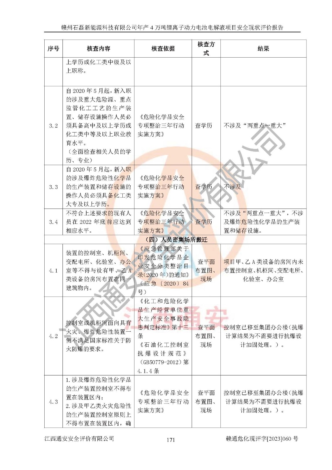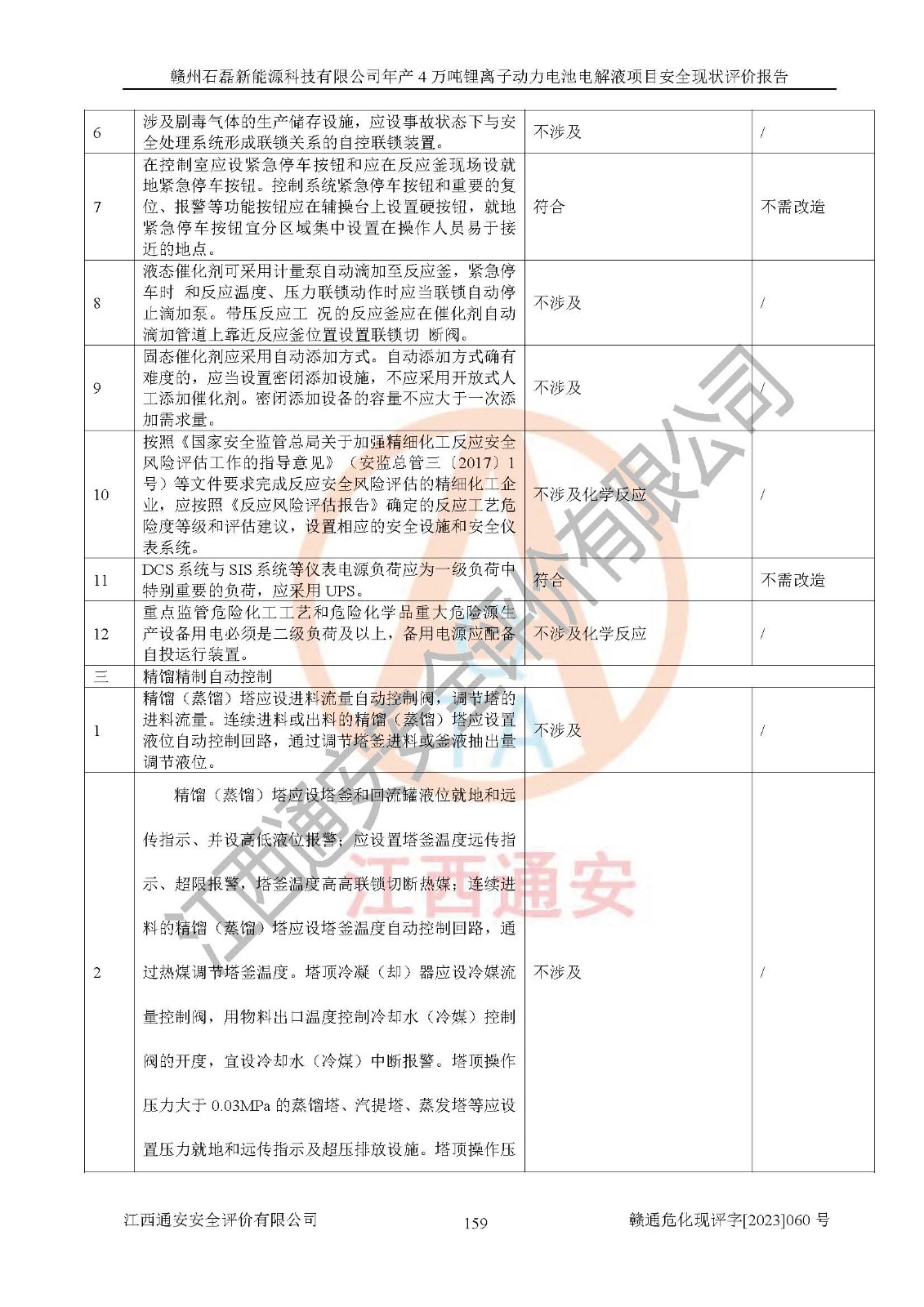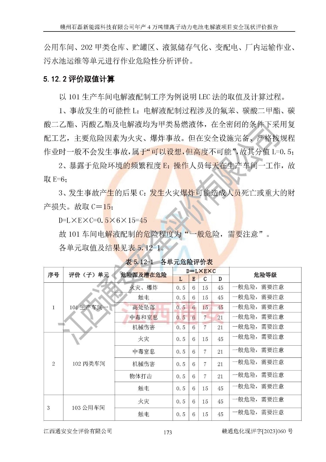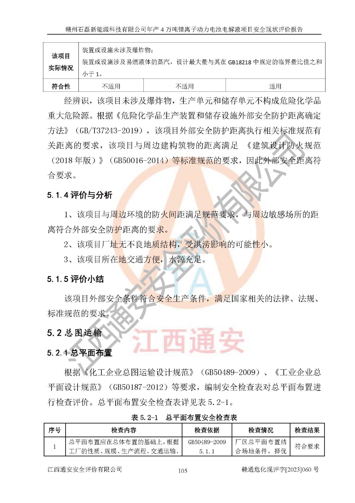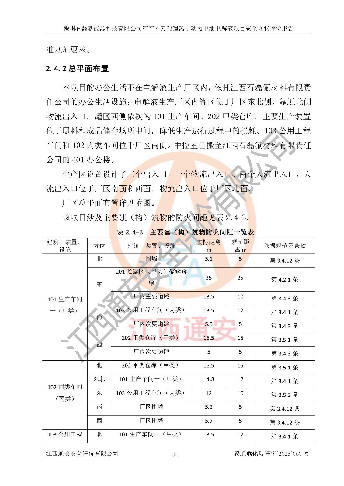 一、安全狀況綜合評(píng)述 1、該項(xiàng)目涉及的原輔材料中碳酸二乙酯、碳酸二甲酯、碳酸甲乙酯、丙酸乙酯、氟苯、丁二腈、己二腈、氮?dú)狻⒙?lián)苯及R22屬于危險(xiǎn)化學(xué)品,產(chǎn)品鋰離子電解液屬于危險(xiǎn)化學(xué)品。 2、該項(xiàng)目生產(chǎn)過(guò)程中存在的危險(xiǎn)、有害因素有:火災(zāi)與爆炸、觸電、中毒與窒息、灼燙、機(jī)械傷害、**傷害、高處墜落、物體打擊和其他傷害等危險(xiǎn)有害因素,其中*主要的危險(xiǎn)有害因素是火災(zāi)與爆炸、中毒與窒息。 3、該項(xiàng)目不涉及監(jiān)控化學(xué)品、易制毒化學(xué)品、易制爆危險(xiǎn)化學(xué)品、劇毒化學(xué)品、重點(diǎn)監(jiān)管危險(xiǎn)化學(xué)品和特別管控的危險(xiǎn)化學(xué)品。 4、該項(xiàng)目不涉及重點(diǎn)監(jiān)管的危險(xiǎn)化工工藝。 5、按照《危險(xiǎn)化學(xué)品重大危險(xiǎn)源辨識(shí)》(GB18218-2018)進(jìn)行辨識(shí),該項(xiàng)目生產(chǎn)單元和儲(chǔ)存單元均不構(gòu)成危險(xiǎn)化學(xué)品重大危險(xiǎn)源。 二、定量評(píng)價(jià)結(jié)果 1、作業(yè)條件危險(xiǎn)性評(píng)價(jià)結(jié)果:在選定的9個(gè)評(píng)價(jià)單元的作業(yè)危險(xiǎn)程度為“一般危險(xiǎn),需要注意”或以下,作業(yè)條件相對(duì)安全。 2、危險(xiǎn)度評(píng)價(jià)結(jié)果:101甲類車間、202甲類倉(cāng)庫(kù)、貯罐區(qū)的危險(xiǎn)程度均為**危險(xiǎn),甲類車間、甲類倉(cāng)庫(kù)和甲類貯罐區(qū)內(nèi)均設(shè)置了可燃?xì)怏w檢測(cè)報(bào)警裝置,并定期進(jìn)行校驗(yàn)**其正常工作。廠內(nèi)建構(gòu)筑物按設(shè)計(jì)要求設(shè)置了防雷防靜電接地裝置,并定期檢驗(yàn);爆炸危險(xiǎn)區(qū)域內(nèi)的電氣設(shè)備采用防爆電機(jī),消防設(shè)施通過(guò)了消防驗(yàn)收,車間生產(chǎn)裝置和儲(chǔ)罐采用密閉化、機(jī)械化和自動(dòng)化,設(shè)備本質(zhì)安全度高,并且應(yīng)在各作業(yè)場(chǎng)所為作業(yè)人員配置了勞動(dòng)保護(hù)用品和器具,作業(yè)人員經(jīng)過(guò)廠內(nèi)三級(jí)安全培訓(xùn),考核合格上崗。項(xiàng)目的安全設(shè)施和安全管理符合安全生產(chǎn)條件,能**降低火災(zāi)爆炸事故發(fā)生的可能性,使風(fēng)險(xiǎn)降低到可接受范圍內(nèi)。 3、個(gè)人風(fēng)險(xiǎn)和社會(huì)風(fēng)險(xiǎn)分析結(jié)果:根據(jù)個(gè)人風(fēng)險(xiǎn)分析效果圖,該項(xiàng)目不涉及高敏感防護(hù)目標(biāo)、重要防護(hù)目標(biāo)、一般防護(hù)目標(biāo)中的一類防護(hù)目標(biāo)(≤3×10-6)等值線、二類防護(hù)目標(biāo)(≤1×10-5)等值線和三類防護(hù)目標(biāo)(≤3×10-5)等值線,個(gè)人風(fēng)險(xiǎn)符合要求;根據(jù)社會(huì)風(fēng)險(xiǎn)分析效果圖可知,該項(xiàng)目社會(huì)風(fēng)險(xiǎn)在可接受范圍內(nèi)。 4、可能發(fā)生的危險(xiǎn)化學(xué)品事故的預(yù)測(cè)后果:該項(xiàng)目貯罐區(qū)和101生產(chǎn)車間災(zāi)害模式為池火,泄漏模式為容器中孔泄漏或容器整體破裂,事故預(yù)測(cè)后果*大的儲(chǔ)罐為碳酸二甲酯儲(chǔ)罐,發(fā)生事故的*大死亡半徑為9m;*大重傷半徑13m,*大輕傷半徑為19m。本項(xiàng)目液氮罐西北側(cè)設(shè)有一臺(tái)50m3液氮罐,液氮罐發(fā)生物理爆炸的*大死亡半徑為18m;*大重傷半徑32m,*大輕傷半徑為54m,多米諾半徑為25m。 5、多米諾效應(yīng)分析:該項(xiàng)目貯罐區(qū)和101車間災(zāi)害模式為池火,無(wú)多米諾半徑。液氮罐發(fā)生物理爆炸的多米諾半徑為25m,多米諾影響區(qū)局限在廠內(nèi)。201罐區(qū)有部分儲(chǔ)罐在多米諾影響區(qū)內(nèi),如液氮罐發(fā)生物理爆炸,會(huì)引發(fā)多米諾效應(yīng),導(dǎo)致罐區(qū)儲(chǔ)罐破裂,可燃液體泄漏發(fā)生池火災(zāi)的可能。因此應(yīng)重點(diǎn)關(guān)注液氮儲(chǔ)罐、201貯罐區(qū)等關(guān)鍵裝置安全設(shè)施的完整和**性,**運(yùn)行良好。 三、定性評(píng)價(jià)結(jié)果 1、依據(jù)相關(guān)法律、法規(guī)、標(biāo)準(zhǔn)等的規(guī)定,該項(xiàng)目外部安全條件、總平面布置、工藝及設(shè)備、防火防爆安全設(shè)施等符合**相關(guān)標(biāo)準(zhǔn)規(guī)范的要求,能滿足安全生產(chǎn)的要求。 2、該項(xiàng)目公用輔助設(shè)施能夠滿足安全生產(chǎn)的要求。 3、該項(xiàng)目按要求設(shè)置了安全生產(chǎn)管理機(jī)構(gòu),配備了專職安全生產(chǎn)管理人員,建立了安全生產(chǎn)責(zé)任制,制定了安全管理制度和崗位安全操作規(guī)程等。該公司修訂了生產(chǎn)安全事故應(yīng)急預(yù)案,配備了應(yīng)急救援器材,按要求定期進(jìn)行相關(guān)培訓(xùn)及演練。 4、該項(xiàng)目不涉及“兩重點(diǎn)一重大”,公司主要負(fù)責(zé)人、安全管理人員經(jīng)培訓(xùn)考核取得了相應(yīng)的安全資格證書。主要負(fù)責(zé)人的專業(yè)和學(xué)歷符合要求,公司任命了許惠彬和王佛金為專職安全管理人員,許惠彬的學(xué)歷和專業(yè)均符合要求,王佛金于2021年9月報(bào)名參加了大專應(yīng)用化工技術(shù)專業(yè)學(xué)歷提升,預(yù)計(jì)2024年1月畢業(yè),屆時(shí)可滿足危險(xiǎn)化學(xué)品企業(yè)重點(diǎn)人員安