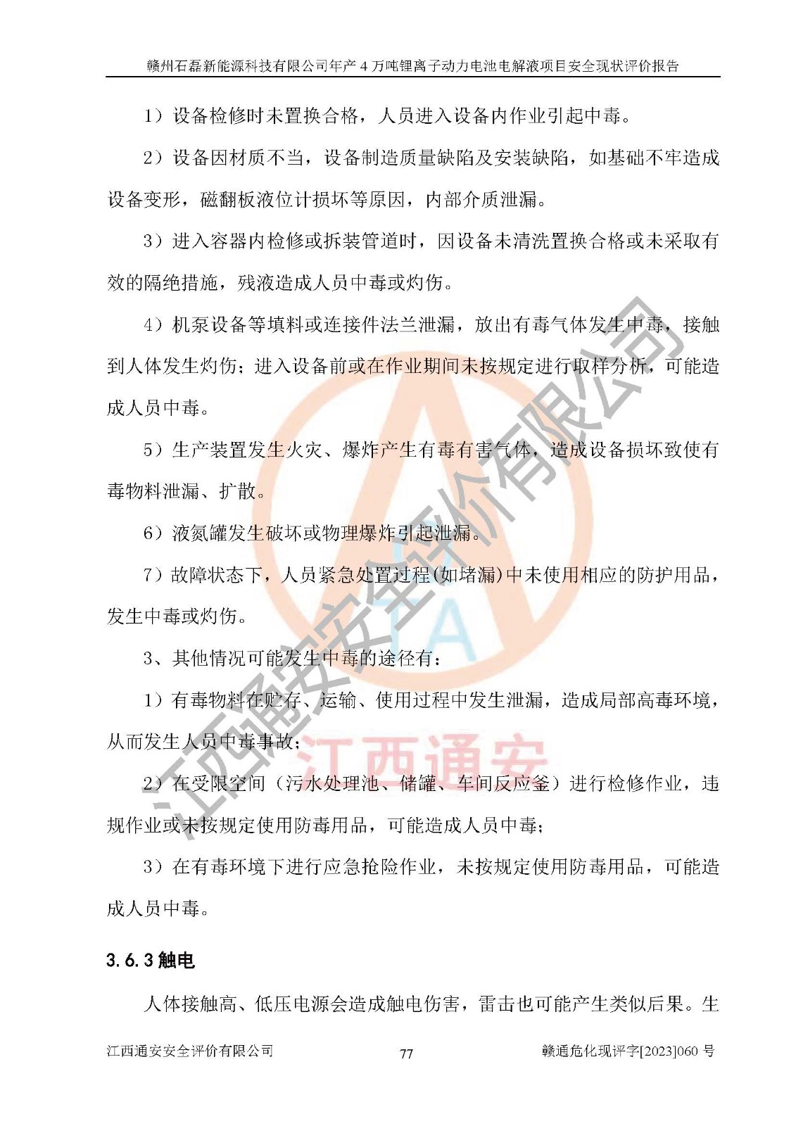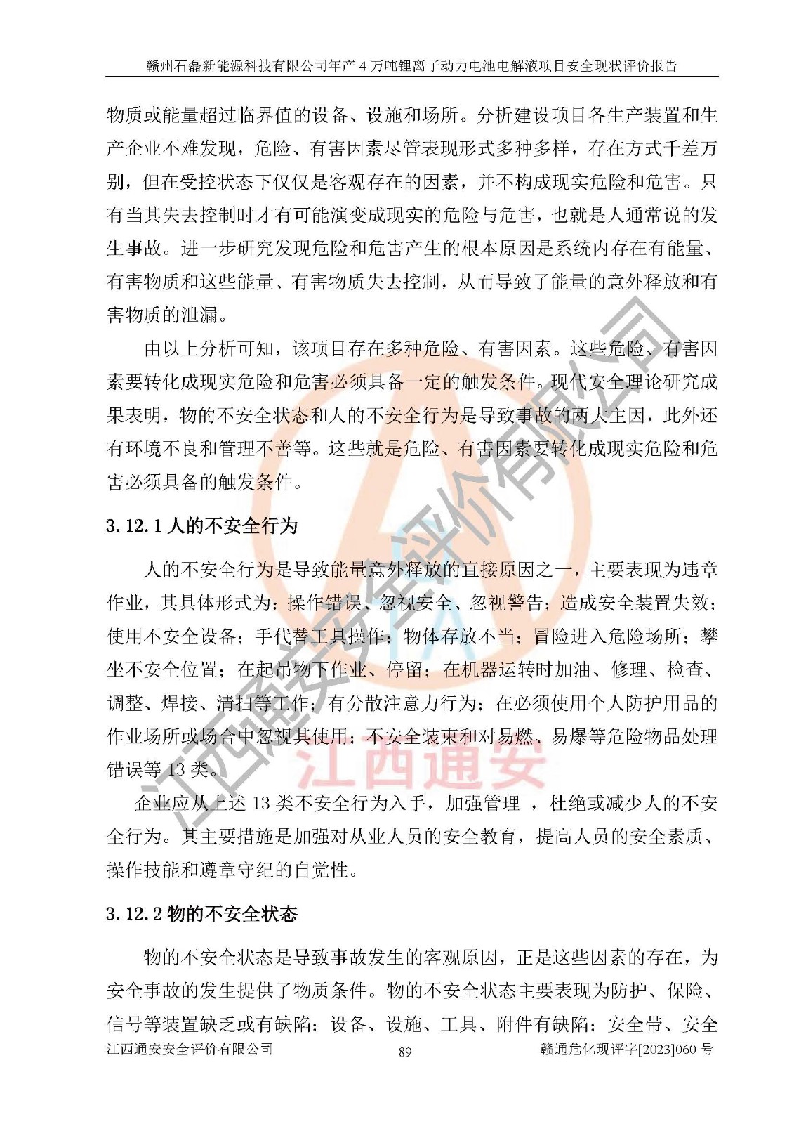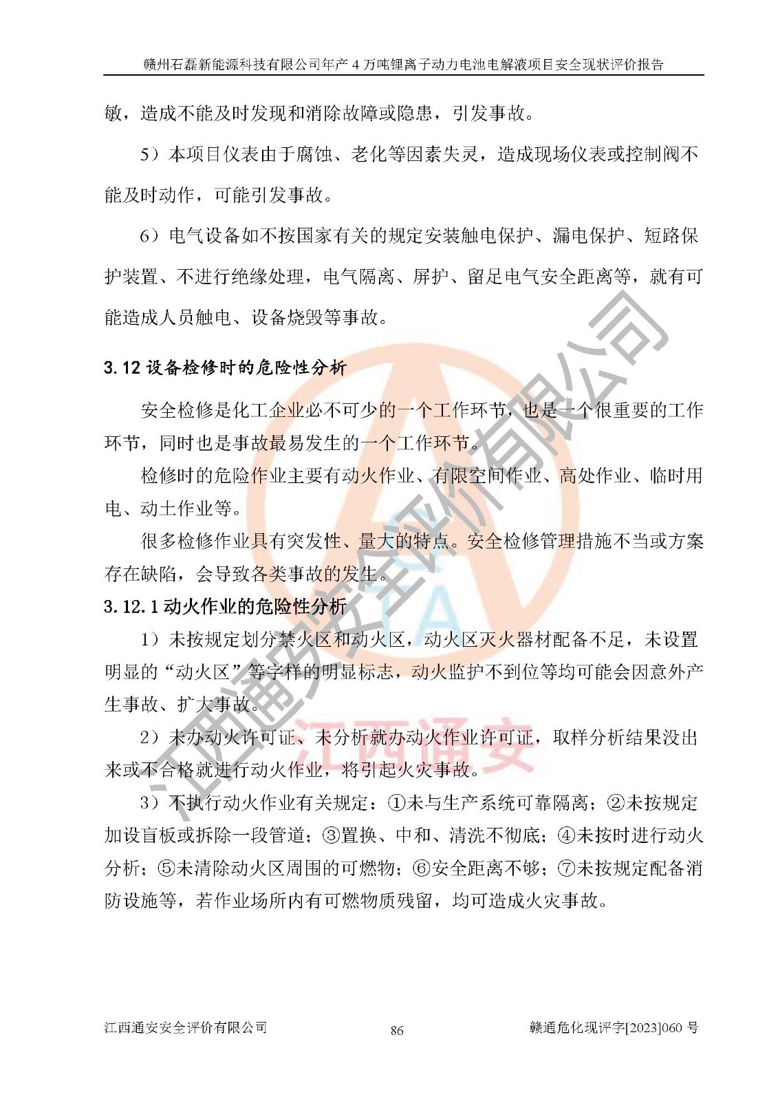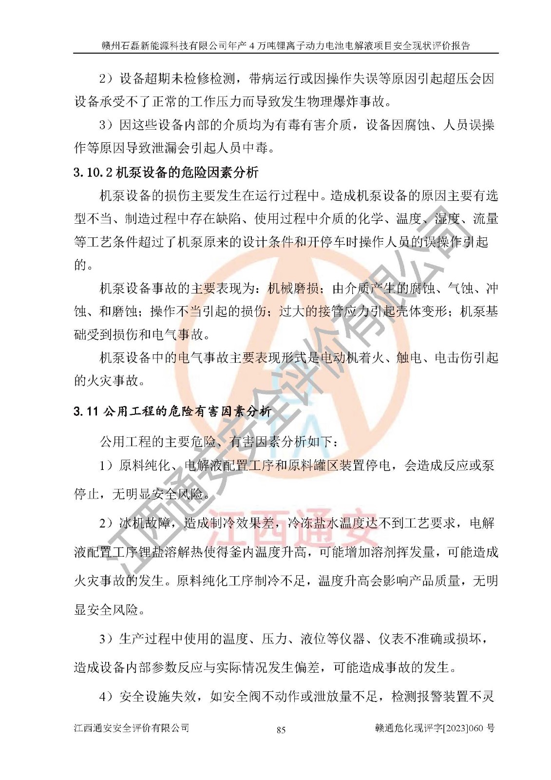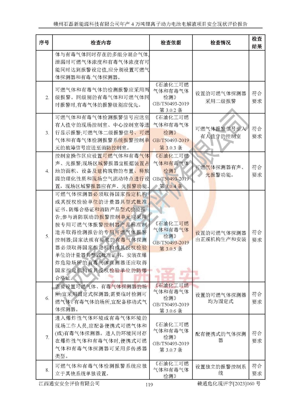 一、安全狀況綜合評(píng)述 1、該項(xiàng)目涉及的原輔材料中碳酸二乙酯、碳酸二甲酯、碳酸甲乙酯、丙酸乙酯、氟苯、丁二腈、己二腈、氮?dú)狻⒙?lián)苯及R22屬于危險(xiǎn)化學(xué)品,產(chǎn)品鋰離子電解液屬于危險(xiǎn)化學(xué)品。 2、該項(xiàng)目生產(chǎn)過(guò)程中存在的危險(xiǎn)、有害因素有:火災(zāi)與爆炸、觸電、中毒與窒息、灼燙、機(jī)械傷害、**傷害、高處墜落、物體打擊和其他傷害等危險(xiǎn)有害因素,其中*主要的危險(xiǎn)有害因素是火災(zāi)與爆炸、中毒與窒息。 3、該項(xiàng)目不涉及監(jiān)控化學(xué)品、易制毒化學(xué)品、易制爆危險(xiǎn)化學(xué)品、劇毒化學(xué)品、重點(diǎn)監(jiān)管危險(xiǎn)化學(xué)品和特別管控的危險(xiǎn)化學(xué)品。 4、該項(xiàng)目不涉及重點(diǎn)監(jiān)管的危險(xiǎn)化工工藝。 5、按照《危險(xiǎn)化學(xué)品重大危險(xiǎn)源辨識(shí)》(GB18218-2018)進(jìn)行辨識(shí),該項(xiàng)目生產(chǎn)單元和儲(chǔ)存單元均不構(gòu)成危險(xiǎn)化學(xué)品重大危險(xiǎn)源。 二、定量評(píng)價(jià)結(jié)果 1、作業(yè)條件危險(xiǎn)性評(píng)價(jià)結(jié)果:在選定的9個(gè)評(píng)價(jià)單元的作業(yè)危險(xiǎn)程度為“一般危險(xiǎn),需要注意”或以下,作業(yè)條件相對(duì)安全。 2、危險(xiǎn)度評(píng)價(jià)結(jié)果:101甲類車間、202甲類倉(cāng)庫(kù)、貯罐區(qū)的危險(xiǎn)程度均為**危險(xiǎn),甲類車間、甲類倉(cāng)庫(kù)和甲類貯罐區(qū)內(nèi)均設(shè)置了可燃?xì)怏w檢測(cè)報(bào)警裝置,并定期進(jìn)行校驗(yàn)**其正常工作。廠內(nèi)建構(gòu)筑物按設(shè)計(jì)要求設(shè)置了防雷防靜電接地裝置,并定期檢驗(yàn);爆炸危險(xiǎn)區(qū)域內(nèi)的電氣設(shè)備采用防爆電機(jī),消防設(shè)施通過(guò)了消防驗(yàn)收,車間生產(chǎn)裝置和儲(chǔ)罐采用密閉化、機(jī)械化和自動(dòng)化,設(shè)備本質(zhì)安全度高,并且應(yīng)在各作業(yè)場(chǎng)所為作業(yè)人員配置了勞動(dòng)保護(hù)用品和器具,作業(yè)人員經(jīng)過(guò)廠內(nèi)三級(jí)安全培訓(xùn),考核合格上崗。項(xiàng)目的安全設(shè)施和安全管理符合安全生產(chǎn)條件,能**降低火災(zāi)爆炸事故發(fā)生的可能性,使風(fēng)險(xiǎn)降低到可接受范圍內(nèi)。 3、個(gè)人風(fēng)險(xiǎn)和社會(huì)風(fēng)險(xiǎn)分析結(jié)果:根據(jù)個(gè)人風(fēng)險(xiǎn)分析效果圖,該項(xiàng)目不涉及高敏感防護(hù)目標(biāo)、重要防護(hù)目標(biāo)、一般防護(hù)目標(biāo)中的一類防護(hù)目標(biāo)(≤3×10-6)等值線、二類防護(hù)目標(biāo)(≤1×10-5)等值線和三類防護(hù)目標(biāo)(≤3×10-5)等值線,個(gè)人風(fēng)險(xiǎn)符合要求;根據(jù)社會(huì)風(fēng)險(xiǎn)分析效果圖可知,該項(xiàng)目社會(huì)風(fēng)險(xiǎn)在可接受范圍內(nèi)。 4、可能發(fā)生的危險(xiǎn)化學(xué)品事故的預(yù)測(cè)后果:該項(xiàng)目貯罐區(qū)和101生產(chǎn)車間災(zāi)害模式為池火,泄漏模式為容器中孔泄漏或容器整體破裂,事故預(yù)測(cè)后果*大的儲(chǔ)罐為碳酸二甲酯儲(chǔ)罐,發(fā)生事故的*大死亡半徑為9m;*大重傷半徑13m,*大輕傷半徑為19m。本項(xiàng)目液氮罐西北側(cè)設(shè)有一臺(tái)50m3液氮罐,液氮罐發(fā)生物理爆炸的*大死亡半徑為18m;*大重傷半徑32m,*大輕傷半徑為54m,多米諾半徑為25m。 5、多米諾效應(yīng)分析:該項(xiàng)目貯罐區(qū)和101車間災(zāi)害模式為池火,無(wú)多米諾半徑。液氮罐發(fā)生物理爆炸的多米諾半徑為25m,多米諾影響區(qū)局限在廠內(nèi)。201罐區(qū)有部分儲(chǔ)罐在多米諾影響區(qū)內(nèi),如液氮罐發(fā)生物理爆炸,會(huì)引發(fā)多米諾效應(yīng),導(dǎo)致罐區(qū)儲(chǔ)罐破裂,可燃液體泄漏發(fā)生池火災(zāi)的可能。因此應(yīng)重點(diǎn)關(guān)注液氮儲(chǔ)罐、201貯罐區(qū)等關(guān)鍵裝置安全設(shè)施的完整和**性,**運(yùn)行良好。 三、定性評(píng)價(jià)結(jié)果 1、依據(jù)相關(guān)法律、法規(guī)、標(biāo)準(zhǔn)等的規(guī)定,該項(xiàng)目外部安全條件、總平面布置、工藝及設(shè)備、防火防爆安全設(shè)施等符合**相關(guān)標(biāo)準(zhǔn)規(guī)范的要求,能滿足安全生產(chǎn)的要求。 2、該項(xiàng)目公用輔助設(shè)施能夠滿足安全生產(chǎn)的要求。 3、該項(xiàng)目按要求設(shè)置了安全生產(chǎn)管理機(jī)構(gòu),配備了專職安全生產(chǎn)管理人員,建立了安全生產(chǎn)責(zé)任制,制定了安全管理制度和崗位安全操作規(guī)程等。該公司修訂了生產(chǎn)安全事故應(yīng)急預(yù)案,配備了應(yīng)急救援器材,按要求定期進(jìn)行相關(guān)培訓(xùn)及演練。 4、該項(xiàng)目不涉及“兩重點(diǎn)一重大”,公司主要負(fù)責(zé)人、安全管理人員經(jīng)培訓(xùn)考核取得了相應(yīng)的安全資格證書。主要負(fù)責(zé)人的專業(yè)和學(xué)歷符合要求,公司任命了許惠彬和王佛金為專職安全管理人員,許惠彬的學(xué)歷和專業(yè)均符合要求,王佛金于2021年9月報(bào)名參加了大專應(yīng)用化工技術(shù)專業(yè)學(xué)歷提升,預(yù)計(jì)2024年1月畢業(yè),屆時(shí)可滿足危險(xiǎn)化學(xué)品企業(yè)重點(diǎn)人員安