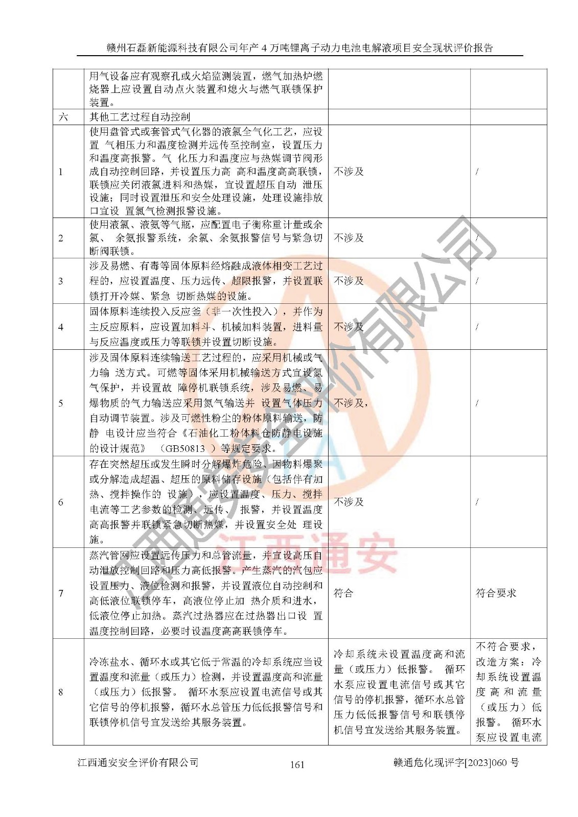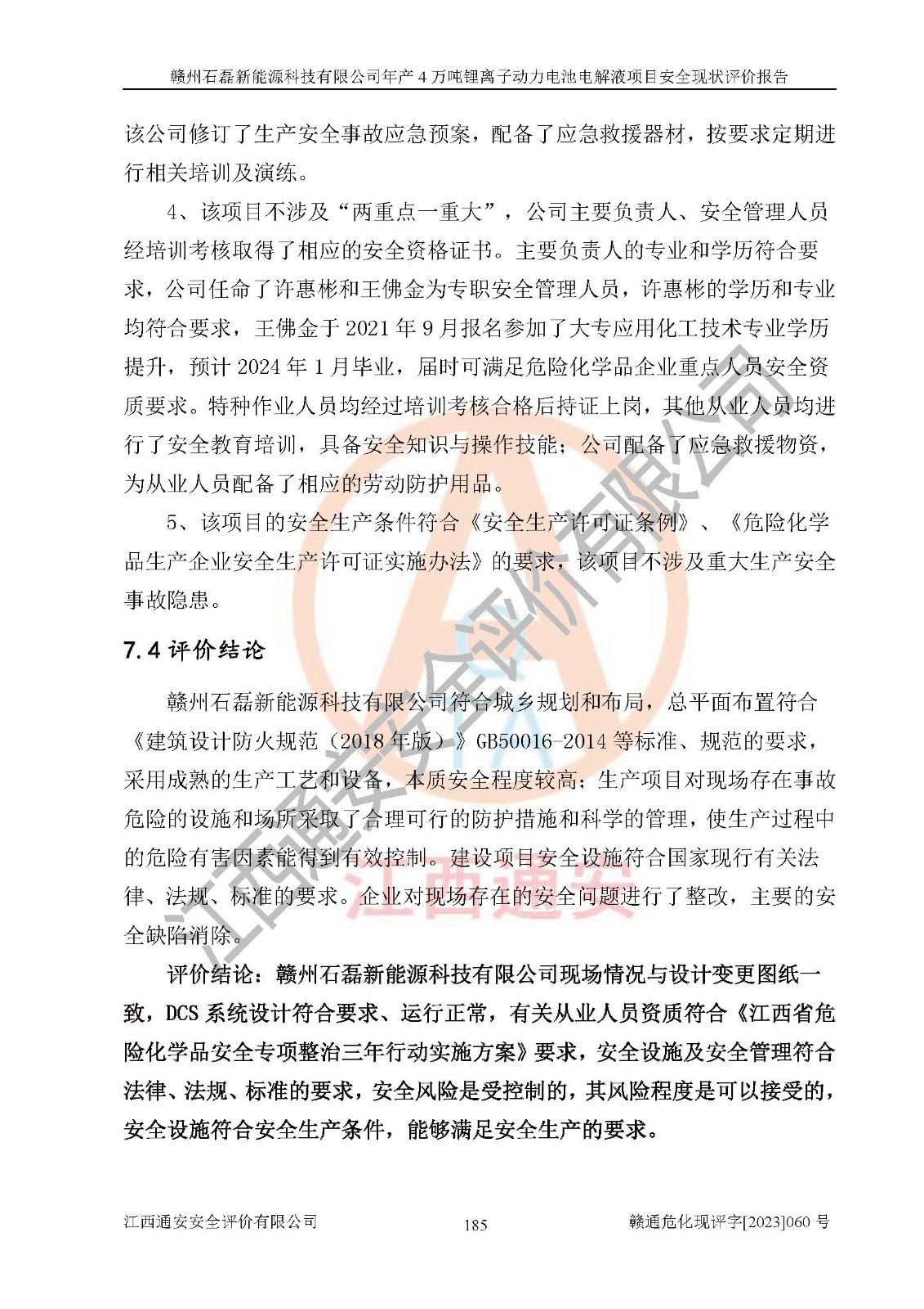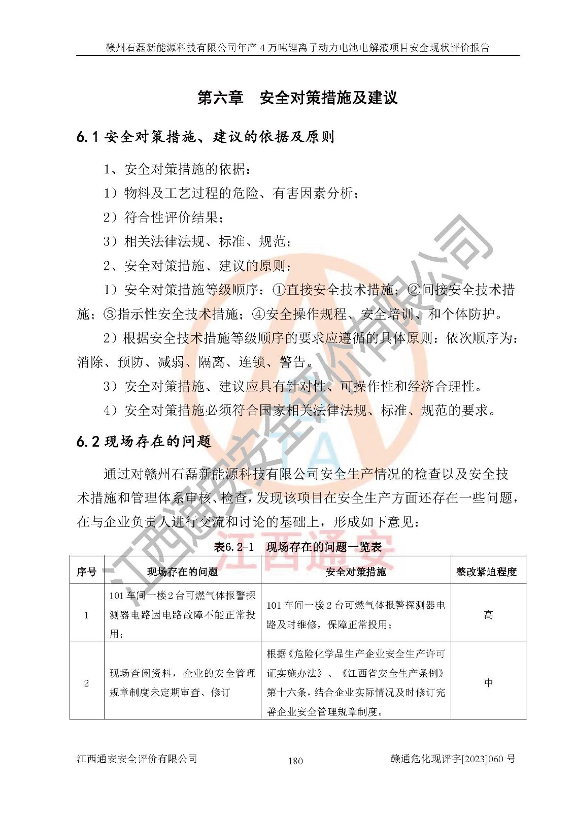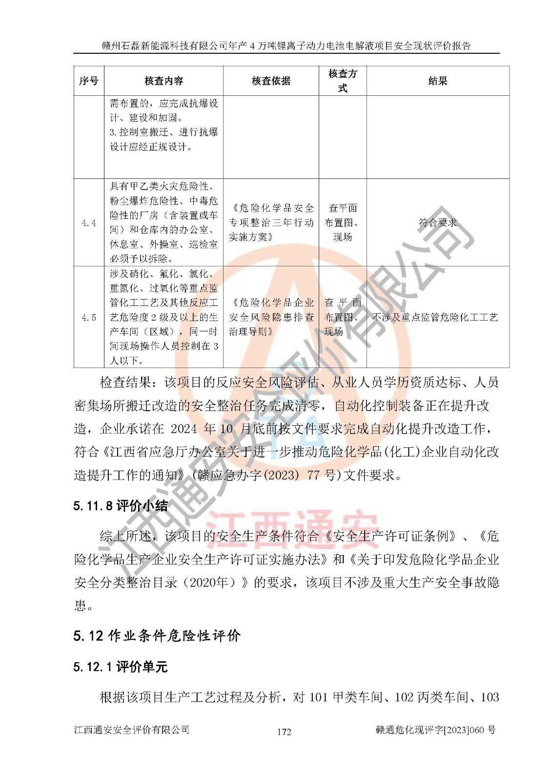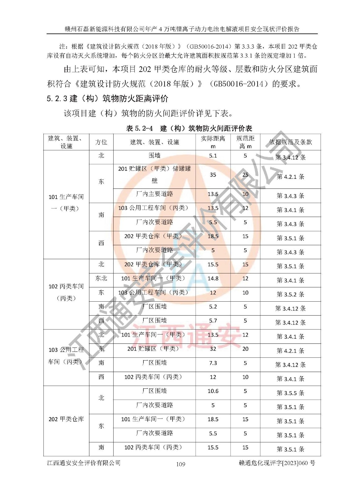一、安全狀況綜合評(píng)述 1、該項(xiàng)目涉及的原輔材料中碳酸二乙酯、碳酸二甲酯、碳酸甲乙酯、丙酸乙酯、氟苯、丁二腈、己二腈、氮?dú)狻⒙?lián)苯及R22屬于危險(xiǎn)化學(xué)品,產(chǎn)品鋰離子電解液屬于危險(xiǎn)化學(xué)品。 2、該項(xiàng)目生產(chǎn)過(guò)程中存在的危險(xiǎn)、有害因素有:火災(zāi)與爆炸、觸電、中毒與窒息、灼燙、機(jī)械傷害、**傷害、高處墜落、物體打擊和其他傷害等危險(xiǎn)有害因素,其中*主要的危險(xiǎn)有害因素是火災(zāi)與爆炸、中毒與窒息。 3、該項(xiàng)目不涉及監(jiān)控化學(xué)品、易制毒化學(xué)品、易制爆危險(xiǎn)化學(xué)品、劇毒化學(xué)品、重點(diǎn)監(jiān)管危險(xiǎn)化學(xué)品和特別管控的危險(xiǎn)化學(xué)品。 4、該項(xiàng)目不涉及重點(diǎn)監(jiān)管的危險(xiǎn)化工工藝。 5、按照《危險(xiǎn)化學(xué)品重大危險(xiǎn)源辨識(shí)》(GB18218-2018)進(jìn)行辨識(shí),該項(xiàng)目生產(chǎn)單元和儲(chǔ)存單元均不構(gòu)成危險(xiǎn)化學(xué)品重大危險(xiǎn)源。 二、定量評(píng)價(jià)結(jié)果 1、作業(yè)條件危險(xiǎn)性評(píng)價(jià)結(jié)果:在選定的9個(gè)評(píng)價(jià)單元的作業(yè)危險(xiǎn)程度為“一般危險(xiǎn),需要注意”或以下,作業(yè)條件相對(duì)安全。 2、危險(xiǎn)度評(píng)價(jià)結(jié)果:101甲類車間、202甲類倉(cāng)庫(kù)、貯罐區(qū)的危險(xiǎn)程度均為**危險(xiǎn),甲類車間、甲類倉(cāng)庫(kù)和甲類貯罐區(qū)內(nèi)均設(shè)置了可燃?xì)怏w檢測(cè)報(bào)警裝置,并定期進(jìn)行校驗(yàn)**其正常工作。廠內(nèi)建構(gòu)筑物按設(shè)計(jì)要求設(shè)置了防雷防靜電接地裝置,并定期檢驗(yàn);爆炸危險(xiǎn)區(qū)域內(nèi)的電氣設(shè)備采用防爆電機(jī),消防設(shè)施通過(guò)了消防驗(yàn)收,車間生產(chǎn)裝置和儲(chǔ)罐采用密閉化、機(jī)械化和自動(dòng)化,設(shè)備本質(zhì)安全度高,并且應(yīng)在各作業(yè)場(chǎng)所為作業(yè)人員配置了勞動(dòng)保護(hù)用品和器具,作業(yè)人員經(jīng)過(guò)廠內(nèi)三級(jí)安全培訓(xùn),考核合格上崗。項(xiàng)目的安全設(shè)施和安全管理符合安全生產(chǎn)條件,能**降低火災(zāi)爆炸事故發(fā)生的可能性,使風(fēng)險(xiǎn)降低到可接受范圍內(nèi)。 3、個(gè)人風(fēng)險(xiǎn)和社會(huì)風(fēng)險(xiǎn)分析結(jié)果:根據(jù)個(gè)人風(fēng)險(xiǎn)分析效果圖,該項(xiàng)目不涉及高敏感防護(hù)目標(biāo)、重要防護(hù)目標(biāo)、一般防護(hù)目標(biāo)中的一類防護(hù)目標(biāo)(≤3×10-6)等值線、二類防護(hù)目標(biāo)(≤1×10-5)等值線和三類防護(hù)目標(biāo)(≤3×10-5)等值線,個(gè)人風(fēng)險(xiǎn)符合要求;根據(jù)社會(huì)風(fēng)險(xiǎn)分析效果圖可知,該項(xiàng)目社會(huì)風(fēng)險(xiǎn)在可接受范圍內(nèi)。 4、可能發(fā)生的危險(xiǎn)化學(xué)品事故的預(yù)測(cè)后果:該項(xiàng)目貯罐區(qū)和101生產(chǎn)車間災(zāi)害模式為池火,泄漏模式為容器中孔泄漏或容器整體破裂,事故預(yù)測(cè)后果*大的儲(chǔ)罐為碳酸二甲酯儲(chǔ)罐,發(fā)生事故的*大死亡半徑為9m;*大重傷半徑13m,*大輕傷半徑為19m。本項(xiàng)目液氮罐西北側(cè)設(shè)有一臺(tái)50m3液氮罐,液氮罐發(fā)生物理爆炸的*大死亡半徑為18m;*大重傷半徑32m,*大輕傷半徑為54m,多米諾半徑為25m。 5、多米諾效應(yīng)分析:該項(xiàng)目貯罐區(qū)和101車間災(zāi)害模式為池火,無(wú)多米諾半徑。液氮罐發(fā)生物理爆炸的多米諾半徑為25m,多米諾影響區(qū)局限在廠內(nèi)。201罐區(qū)有部分儲(chǔ)罐在多米諾影響區(qū)內(nèi),如液氮罐發(fā)生物理爆炸,會(huì)引發(fā)多米諾效應(yīng),導(dǎo)致罐區(qū)儲(chǔ)罐破裂,可燃液體泄漏發(fā)生池火災(zāi)的可能。因此應(yīng)重點(diǎn)關(guān)注液氮儲(chǔ)罐、201貯罐區(qū)等關(guān)鍵裝置安全設(shè)施的完整和**性,**運(yùn)行良好。 三、定性評(píng)價(jià)結(jié)果 1、依據(jù)相關(guān)法律、法規(guī)、標(biāo)準(zhǔn)等的規(guī)定,該項(xiàng)目外部安全條件、總平面布置、工藝及設(shè)備、防火防爆安全設(shè)施等符合**相關(guān)標(biāo)準(zhǔn)規(guī)范的要求,能滿足安全生產(chǎn)的要求。 2、該項(xiàng)目公用輔助設(shè)施能夠滿足安全生產(chǎn)的要求。 3、該項(xiàng)目按要求設(shè)置了安全生產(chǎn)管理機(jī)構(gòu),配備了專職安全生產(chǎn)管理人員,建立了安全生產(chǎn)責(zé)任制,制定了安全管理制度和崗位安全操作規(guī)程等。該公司修訂了生產(chǎn)安全事故應(yīng)急預(yù)案,配備了應(yīng)急救援器材,按要求定期進(jìn)行相關(guān)培訓(xùn)及演練。 4、該項(xiàng)目不涉及“兩重點(diǎn)一重大”,公司主要負(fù)責(zé)人、安全管理人員經(jīng)培訓(xùn)考核取得了相應(yīng)的安全資格證書。主要負(fù)責(zé)人的專業(yè)和學(xué)歷符合要求,公司任命了許惠彬和王佛金為專職安全管理人員,許惠彬的學(xué)歷和專業(yè)均符合要求,王佛金于2021年9月報(bào)名參加了大專應(yīng)用化工技術(shù)專業(yè)學(xué)歷提升,預(yù)計(jì)2024年1月畢業(yè),屆時(shí)可滿足危險(xiǎn)化學(xué)品企業(yè)重點(diǎn)人員安