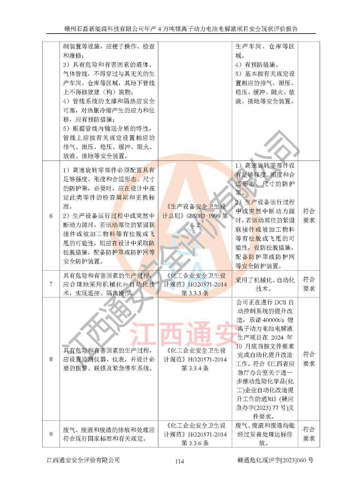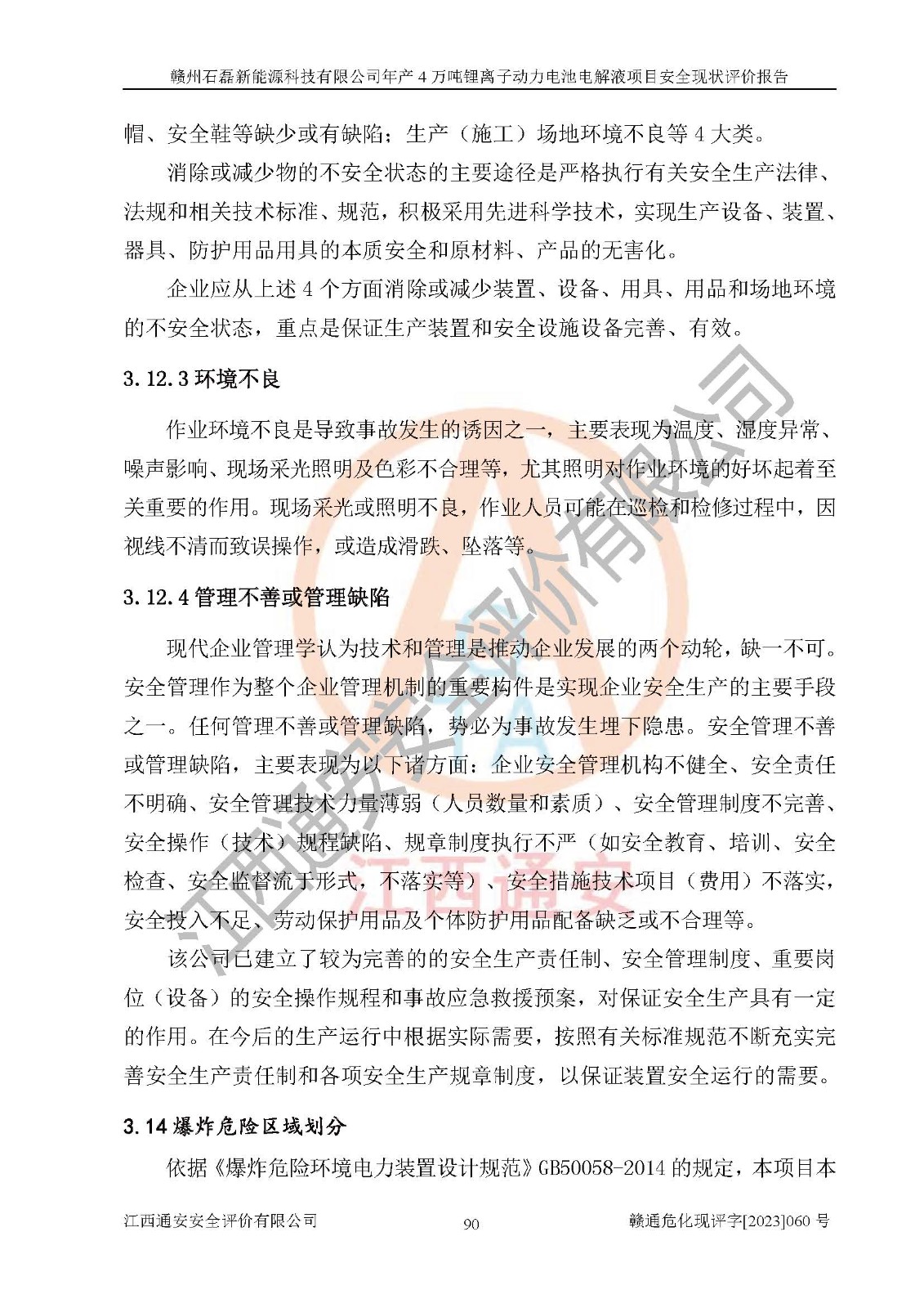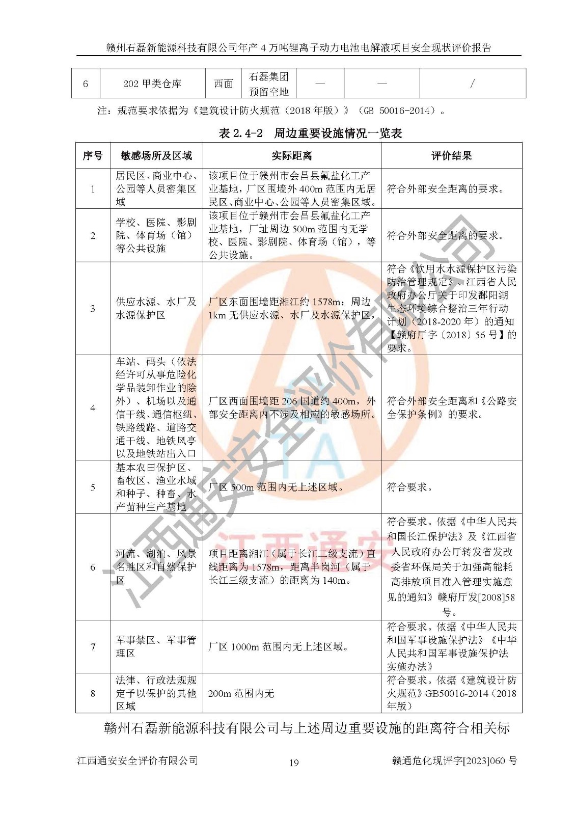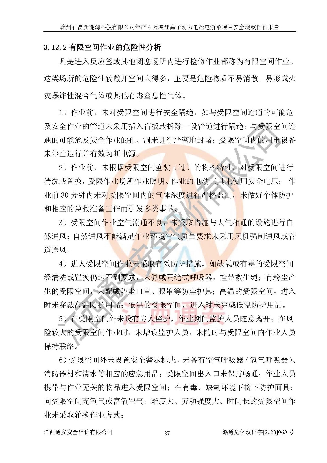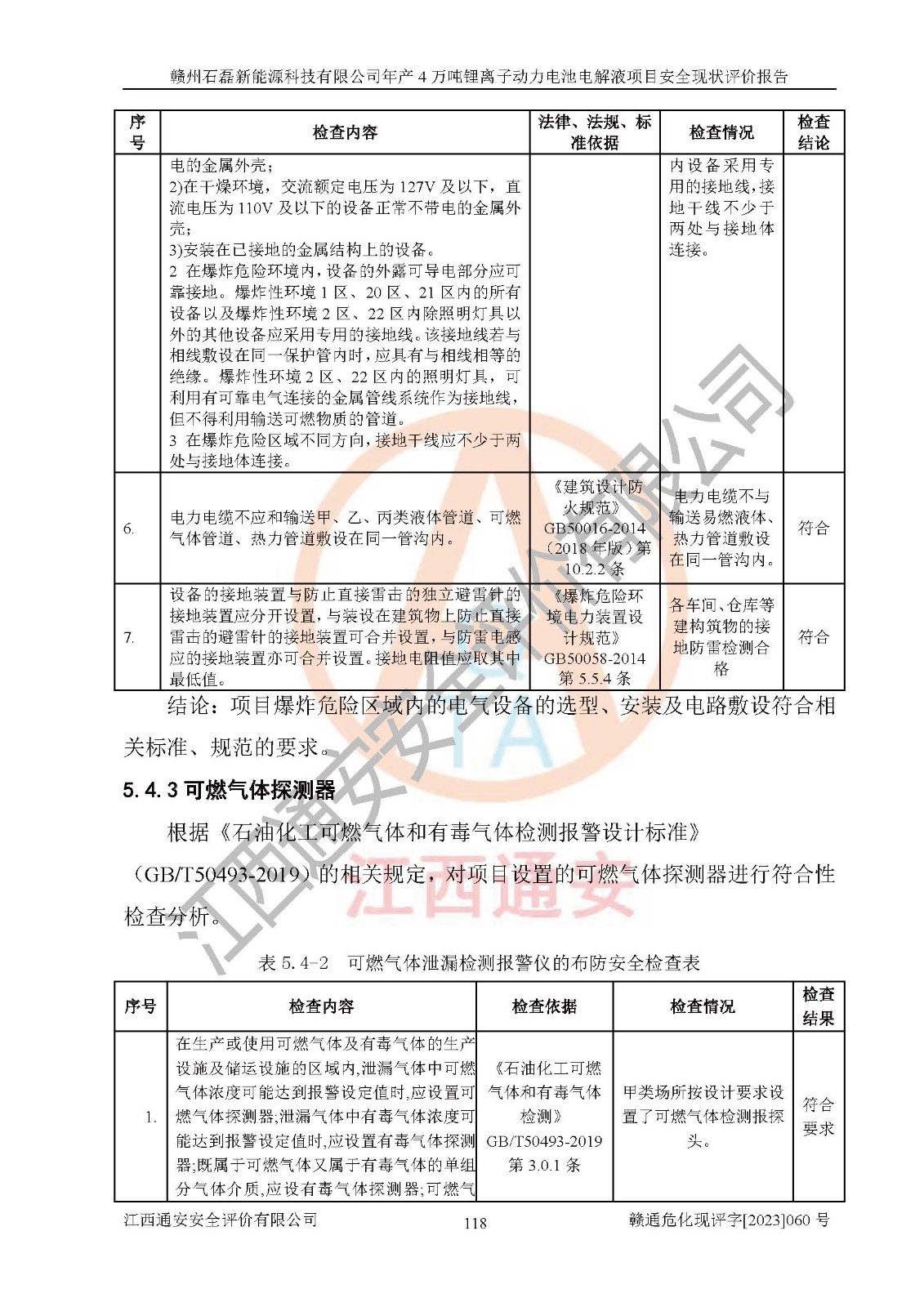 一、安全狀況綜合評(píng)述 1、該項(xiàng)目涉及的原輔材料中碳酸二乙酯、碳酸二甲酯、碳酸甲乙酯、丙酸乙酯、氟苯、丁二腈、己二腈、氮?dú)狻⒙?lián)苯及R22屬于危險(xiǎn)化學(xué)品,產(chǎn)品鋰離子電解液屬于危險(xiǎn)化學(xué)品。 2、該項(xiàng)目生產(chǎn)過(guò)程中存在的危險(xiǎn)、有害因素有:火災(zāi)與爆炸、觸電、中毒與窒息、灼燙、機(jī)械傷害、**傷害、高處墜落、物體打擊和其他傷害等危險(xiǎn)有害因素,其中*主要的危險(xiǎn)有害因素是火災(zāi)與爆炸、中毒與窒息。 3、該項(xiàng)目不涉及監(jiān)控化學(xué)品、易制毒化學(xué)品、易制爆危險(xiǎn)化學(xué)品、劇毒化學(xué)品、重點(diǎn)監(jiān)管危險(xiǎn)化學(xué)品和特別管控的危險(xiǎn)化學(xué)品。 4、該項(xiàng)目不涉及重點(diǎn)監(jiān)管的危險(xiǎn)化工工藝。 5、按照《危險(xiǎn)化學(xué)品重大危險(xiǎn)源辨識(shí)》(GB18218-2018)進(jìn)行辨識(shí),該項(xiàng)目生產(chǎn)單元和儲(chǔ)存單元均不構(gòu)成危險(xiǎn)化學(xué)品重大危險(xiǎn)源。 二、定量評(píng)價(jià)結(jié)果 1、作業(yè)條件危險(xiǎn)性評(píng)價(jià)結(jié)果:在選定的9個(gè)評(píng)價(jià)單元的作業(yè)危險(xiǎn)程度為“一般危險(xiǎn),需要注意”或以下,作業(yè)條件相對(duì)安全。 2、危險(xiǎn)度評(píng)價(jià)結(jié)果:101甲類車間、202甲類倉(cāng)庫(kù)、貯罐區(qū)的危險(xiǎn)程度均為**危險(xiǎn),甲類車間、甲類倉(cāng)庫(kù)和甲類貯罐區(qū)內(nèi)均設(shè)置了可燃?xì)怏w檢測(cè)報(bào)警裝置,并定期進(jìn)行校驗(yàn)**其正常工作。廠內(nèi)建構(gòu)筑物按設(shè)計(jì)要求設(shè)置了防雷防靜電接地裝置,并定期檢驗(yàn);爆炸危險(xiǎn)區(qū)域內(nèi)的電氣設(shè)備采用防爆電機(jī),消防設(shè)施通過(guò)了消防驗(yàn)收,車間生產(chǎn)裝置和儲(chǔ)罐采用密閉化、機(jī)械化和自動(dòng)化,設(shè)備本質(zhì)安全度高,并且應(yīng)在各作業(yè)場(chǎng)所為作業(yè)人員配置了勞動(dòng)保護(hù)用品和器具,作業(yè)人員經(jīng)過(guò)廠內(nèi)三級(jí)安全培訓(xùn),考核合格上崗。項(xiàng)目的安全設(shè)施和安全管理符合安全生產(chǎn)條件,能**降低火災(zāi)爆炸事故發(fā)生的可能性,使風(fēng)險(xiǎn)降低到可接受范圍內(nèi)。 3、個(gè)人風(fēng)險(xiǎn)和社會(huì)風(fēng)險(xiǎn)分析結(jié)果:根據(jù)個(gè)人風(fēng)險(xiǎn)分析效果圖,該項(xiàng)目不涉及高敏感防護(hù)目標(biāo)、重要防護(hù)目標(biāo)、一般防護(hù)目標(biāo)中的一類防護(hù)目標(biāo)(≤3×10-6)等值線、二類防護(hù)目標(biāo)(≤1×10-5)等值線和三類防護(hù)目標(biāo)(≤3×10-5)等值線,個(gè)人風(fēng)險(xiǎn)符合要求;根據(jù)社會(huì)風(fēng)險(xiǎn)分析效果圖可知,該項(xiàng)目社會(huì)風(fēng)險(xiǎn)在可接受范圍內(nèi)。 4、可能發(fā)生的危險(xiǎn)化學(xué)品事故的預(yù)測(cè)后果:該項(xiàng)目貯罐區(qū)和101生產(chǎn)車間災(zāi)害模式為池火,泄漏模式為容器中孔泄漏或容器整體破裂,事故預(yù)測(cè)后果*大的儲(chǔ)罐為碳酸二甲酯儲(chǔ)罐,發(fā)生事故的*大死亡半徑為9m;*大重傷半徑13m,*大輕傷半徑為19m。本項(xiàng)目液氮罐西北側(cè)設(shè)有一臺(tái)50m3液氮罐,液氮罐發(fā)生物理爆炸的*大死亡半徑為18m;*大重傷半徑32m,*大輕傷半徑為54m,多米諾半徑為25m。 5、多米諾效應(yīng)分析:該項(xiàng)目貯罐區(qū)和101車間災(zāi)害模式為池火,無(wú)多米諾半徑。液氮罐發(fā)生物理爆炸的多米諾半徑為25m,多米諾影響區(qū)局限在廠內(nèi)。201罐區(qū)有部分儲(chǔ)罐在多米諾影響區(qū)內(nèi),如液氮罐發(fā)生物理爆炸,會(huì)引發(fā)多米諾效應(yīng),導(dǎo)致罐區(qū)儲(chǔ)罐破裂,可燃液體泄漏發(fā)生池火災(zāi)的可能。因此應(yīng)重點(diǎn)關(guān)注液氮儲(chǔ)罐、201貯罐區(qū)等關(guān)鍵裝置安全設(shè)施的完整和**性,**運(yùn)行良好。 三、定性評(píng)價(jià)結(jié)果 1、依據(jù)相關(guān)法律、法規(guī)、標(biāo)準(zhǔn)等的規(guī)定,該項(xiàng)目外部安全條件、總平面布置、工藝及設(shè)備、防火防爆安全設(shè)施等符合**相關(guān)標(biāo)準(zhǔn)規(guī)范的要求,能滿足安全生產(chǎn)的要求。 2、該項(xiàng)目公用輔助設(shè)施能夠滿足安全生產(chǎn)的要求。 3、該項(xiàng)目按要求設(shè)置了安全生產(chǎn)管理機(jī)構(gòu),配備了專職安全生產(chǎn)管理人員,建立了安全生產(chǎn)責(zé)任制,制定了安全管理制度和崗位安全操作規(guī)程等。該公司修訂了生產(chǎn)安全事故應(yīng)急預(yù)案,配備了應(yīng)急救援器材,按要求定期進(jìn)行相關(guān)培訓(xùn)及演練。 4、該項(xiàng)目不涉及“兩重點(diǎn)一重大”,公司主要負(fù)責(zé)人、安全管理人員經(jīng)培訓(xùn)考核取得了相應(yīng)的安全資格證書。主要負(fù)責(zé)人的專業(yè)和學(xué)歷符合要求,公司任命了許惠彬和王佛金為專職安全管理人員,許惠彬的學(xué)歷和專業(yè)均符合要求,王佛金于2021年9月報(bào)名參加了大專應(yīng)用化工技術(shù)專業(yè)學(xué)歷提升,預(yù)計(jì)2024年1月畢業(yè),屆時(shí)可滿足危險(xiǎn)化學(xué)品企業(yè)重點(diǎn)人員安