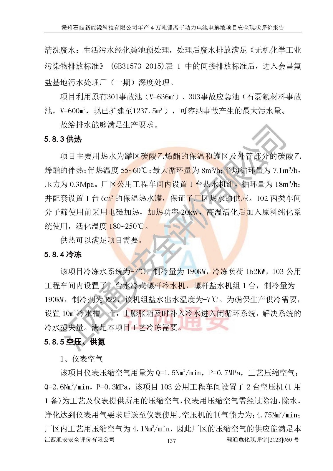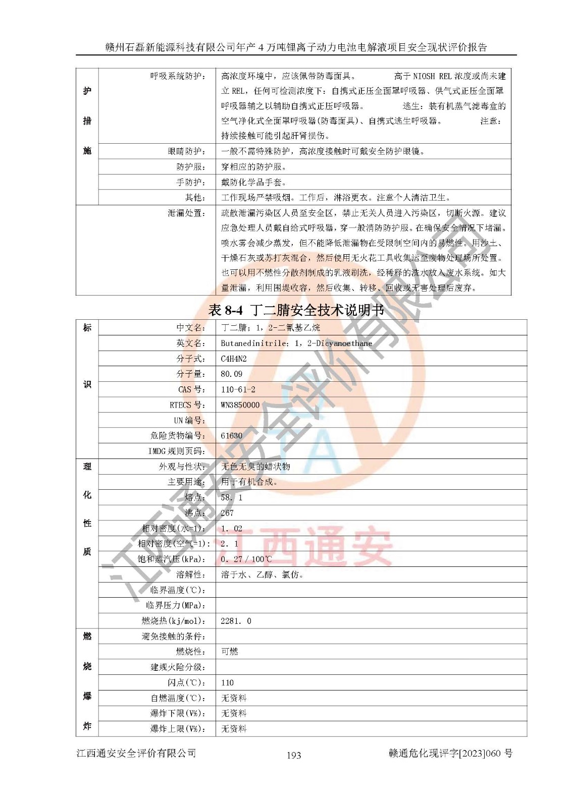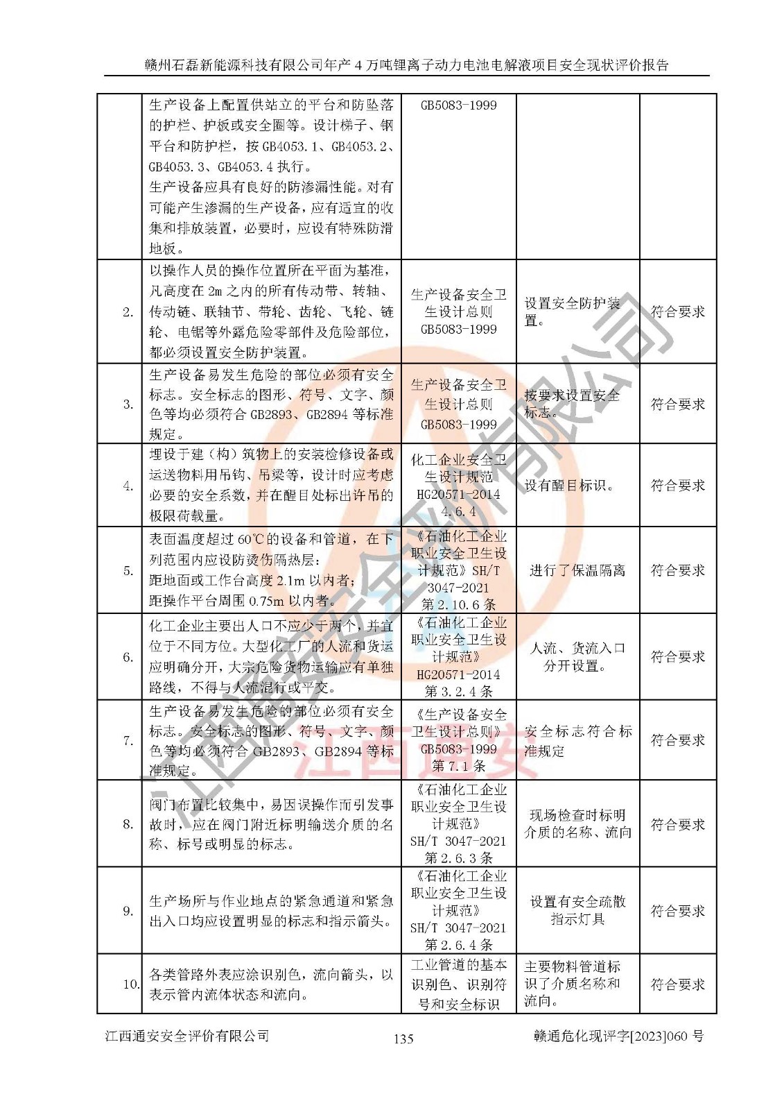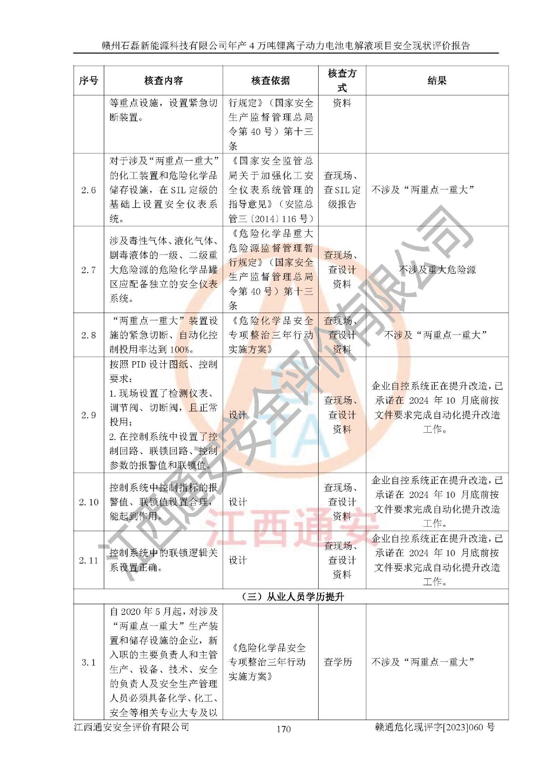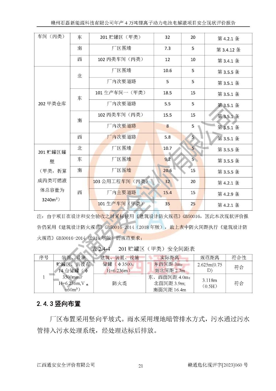 一、安全狀況綜合評(píng)述 1、該項(xiàng)目涉及的原輔材料中碳酸二乙酯、碳酸二甲酯、碳酸甲乙酯、丙酸乙酯、氟苯、丁二腈、己二腈、氮?dú)狻⒙?lián)苯及R22屬于危險(xiǎn)化學(xué)品,產(chǎn)品鋰離子電解液屬于危險(xiǎn)化學(xué)品。 2、該項(xiàng)目生產(chǎn)過(guò)程中存在的危險(xiǎn)、有害因素有:火災(zāi)與爆炸、觸電、中毒與窒息、灼燙、機(jī)械傷害、**傷害、高處墜落、物體打擊和其他傷害等危險(xiǎn)有害因素,其中*主要的危險(xiǎn)有害因素是火災(zāi)與爆炸、中毒與窒息。 3、該項(xiàng)目不涉及監(jiān)控化學(xué)品、易制毒化學(xué)品、易制爆危險(xiǎn)化學(xué)品、劇毒化學(xué)品、重點(diǎn)監(jiān)管危險(xiǎn)化學(xué)品和特別管控的危險(xiǎn)化學(xué)品。 4、該項(xiàng)目不涉及重點(diǎn)監(jiān)管的危險(xiǎn)化工工藝。 5、按照《危險(xiǎn)化學(xué)品重大危險(xiǎn)源辨識(shí)》(GB18218-2018)進(jìn)行辨識(shí),該項(xiàng)目生產(chǎn)單元和儲(chǔ)存單元均不構(gòu)成危險(xiǎn)化學(xué)品重大危險(xiǎn)源。 二、定量評(píng)價(jià)結(jié)果 1、作業(yè)條件危險(xiǎn)性評(píng)價(jià)結(jié)果:在選定的9個(gè)評(píng)價(jià)單元的作業(yè)危險(xiǎn)程度為“一般危險(xiǎn),需要注意”或以下,作業(yè)條件相對(duì)安全。 2、危險(xiǎn)度評(píng)價(jià)結(jié)果:101甲類車間、202甲類倉(cāng)庫(kù)、貯罐區(qū)的危險(xiǎn)程度均為**危險(xiǎn),甲類車間、甲類倉(cāng)庫(kù)和甲類貯罐區(qū)內(nèi)均設(shè)置了可燃?xì)怏w檢測(cè)報(bào)警裝置,并定期進(jìn)行校驗(yàn)**其正常工作。廠內(nèi)建構(gòu)筑物按設(shè)計(jì)要求設(shè)置了防雷防靜電接地裝置,并定期檢驗(yàn);爆炸危險(xiǎn)區(qū)域內(nèi)的電氣設(shè)備采用防爆電機(jī),消防設(shè)施通過(guò)了消防驗(yàn)收,車間生產(chǎn)裝置和儲(chǔ)罐采用密閉化、機(jī)械化和自動(dòng)化,設(shè)備本質(zhì)安全度高,并且應(yīng)在各作業(yè)場(chǎng)所為作業(yè)人員配置了勞動(dòng)保護(hù)用品和器具,作業(yè)人員經(jīng)過(guò)廠內(nèi)三級(jí)安全培訓(xùn),考核合格上崗。項(xiàng)目的安全設(shè)施和安全管理符合安全生產(chǎn)條件,能**降低火災(zāi)爆炸事故發(fā)生的可能性,使風(fēng)險(xiǎn)降低到可接受范圍內(nèi)。 3、個(gè)人風(fēng)險(xiǎn)和社會(huì)風(fēng)險(xiǎn)分析結(jié)果:根據(jù)個(gè)人風(fēng)險(xiǎn)分析效果圖,該項(xiàng)目不涉及高敏感防護(hù)目標(biāo)、重要防護(hù)目標(biāo)、一般防護(hù)目標(biāo)中的一類防護(hù)目標(biāo)(≤3×10-6)等值線、二類防護(hù)目標(biāo)(≤1×10-5)等值線和三類防護(hù)目標(biāo)(≤3×10-5)等值線,個(gè)人風(fēng)險(xiǎn)符合要求;根據(jù)社會(huì)風(fēng)險(xiǎn)分析效果圖可知,該項(xiàng)目社會(huì)風(fēng)險(xiǎn)在可接受范圍內(nèi)。 4、可能發(fā)生的危險(xiǎn)化學(xué)品事故的預(yù)測(cè)后果:該項(xiàng)目貯罐區(qū)和101生產(chǎn)車間災(zāi)害模式為池火,泄漏模式為容器中孔泄漏或容器整體破裂,事故預(yù)測(cè)后果*大的儲(chǔ)罐為碳酸二甲酯儲(chǔ)罐,發(fā)生事故的*大死亡半徑為9m;*大重傷半徑13m,*大輕傷半徑為19m。本項(xiàng)目液氮罐西北側(cè)設(shè)有一臺(tái)50m3液氮罐,液氮罐發(fā)生物理爆炸的*大死亡半徑為18m;*大重傷半徑32m,*大輕傷半徑為54m,多米諾半徑為25m。 5、多米諾效應(yīng)分析:該項(xiàng)目貯罐區(qū)和101車間災(zāi)害模式為池火,無(wú)多米諾半徑。液氮罐發(fā)生物理爆炸的多米諾半徑為25m,多米諾影響區(qū)局限在廠內(nèi)。201罐區(qū)有部分儲(chǔ)罐在多米諾影響區(qū)內(nèi),如液氮罐發(fā)生物理爆炸,會(huì)引發(fā)多米諾效應(yīng),導(dǎo)致罐區(qū)儲(chǔ)罐破裂,可燃液體泄漏發(fā)生池火災(zāi)的可能。因此應(yīng)重點(diǎn)關(guān)注液氮儲(chǔ)罐、201貯罐區(qū)等關(guān)鍵裝置安全設(shè)施的完整和**性,**運(yùn)行良好。 三、定性評(píng)價(jià)結(jié)果 1、依據(jù)相關(guān)法律、法規(guī)、標(biāo)準(zhǔn)等的規(guī)定,該項(xiàng)目外部安全條件、總平面布置、工藝及設(shè)備、防火防爆安全設(shè)施等符合**相關(guān)標(biāo)準(zhǔn)規(guī)范的要求,能滿足安全生產(chǎn)的要求。 2、該項(xiàng)目公用輔助設(shè)施能夠滿足安全生產(chǎn)的要求。 3、該項(xiàng)目按要求設(shè)置了安全生產(chǎn)管理機(jī)構(gòu),配備了專職安全生產(chǎn)管理人員,建立了安全生產(chǎn)責(zé)任制,制定了安全管理制度和崗位安全操作規(guī)程等。該公司修訂了生產(chǎn)安全事故應(yīng)急預(yù)案,配備了應(yīng)急救援器材,按要求定期進(jìn)行相關(guān)培訓(xùn)及演練。 4、該項(xiàng)目不涉及“兩重點(diǎn)一重大”,公司主要負(fù)責(zé)人、安全管理人員經(jīng)培訓(xùn)考核取得了相應(yīng)的安全資格證書。主要負(fù)責(zé)人的專業(yè)和學(xué)歷符合要求,公司任命了許惠彬和王佛金為專職安全管理人員,許惠彬的學(xué)歷和專業(yè)均符合要求,王佛金于2021年9月報(bào)名參加了大專應(yīng)用化工技術(shù)專業(yè)學(xué)歷提升,預(yù)計(jì)2024年1月畢業(yè),屆時(shí)可滿足危險(xiǎn)化學(xué)品企業(yè)重點(diǎn)人員安