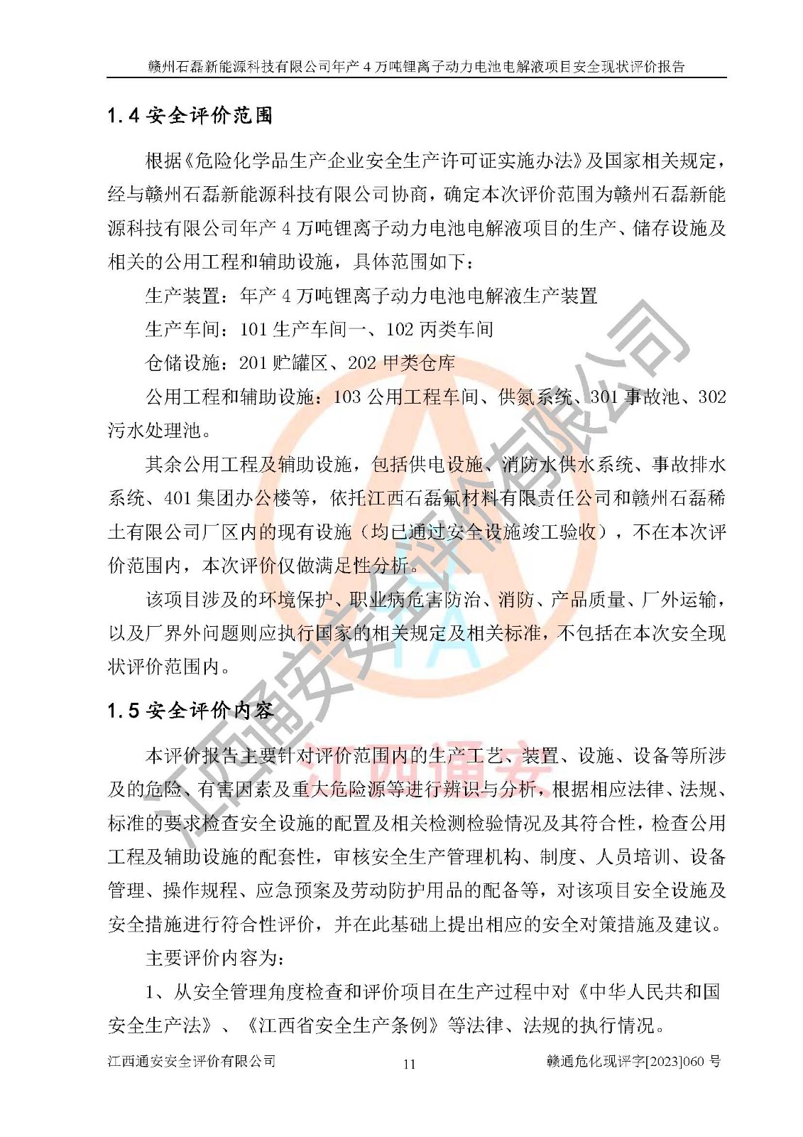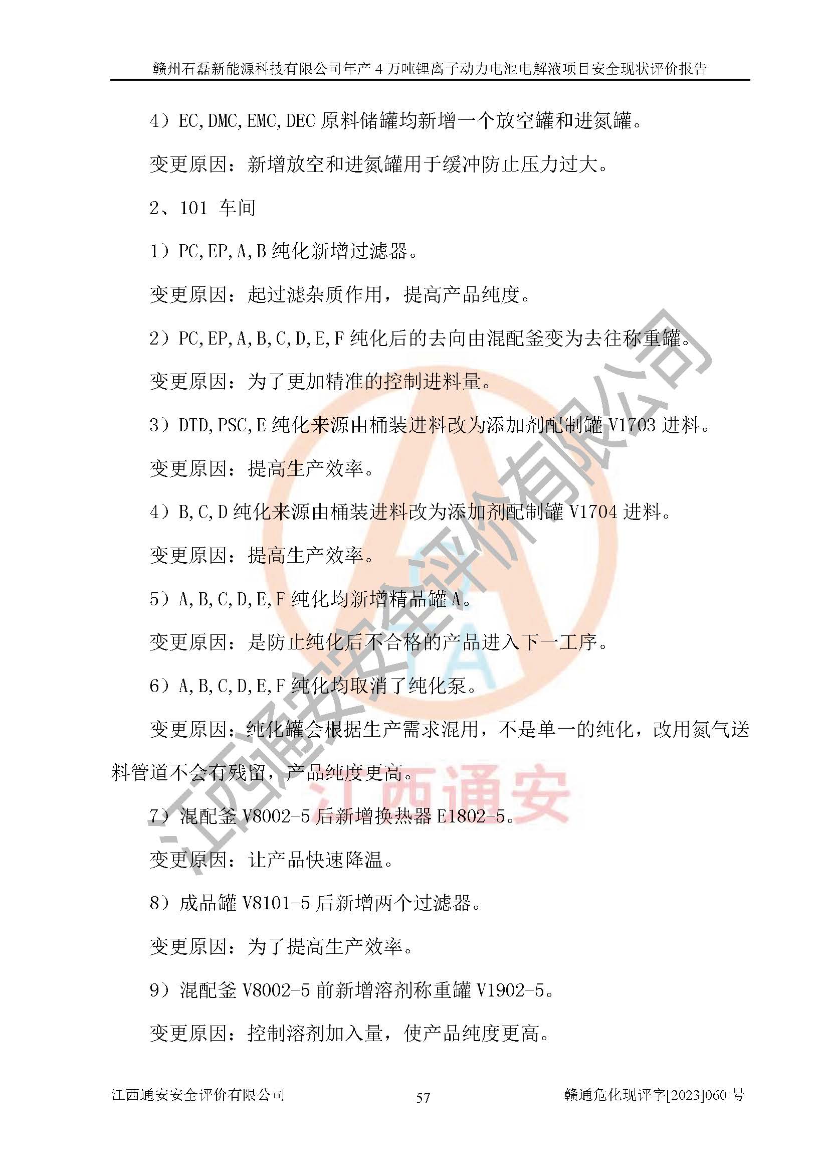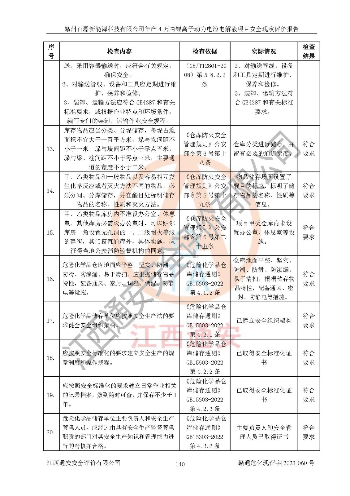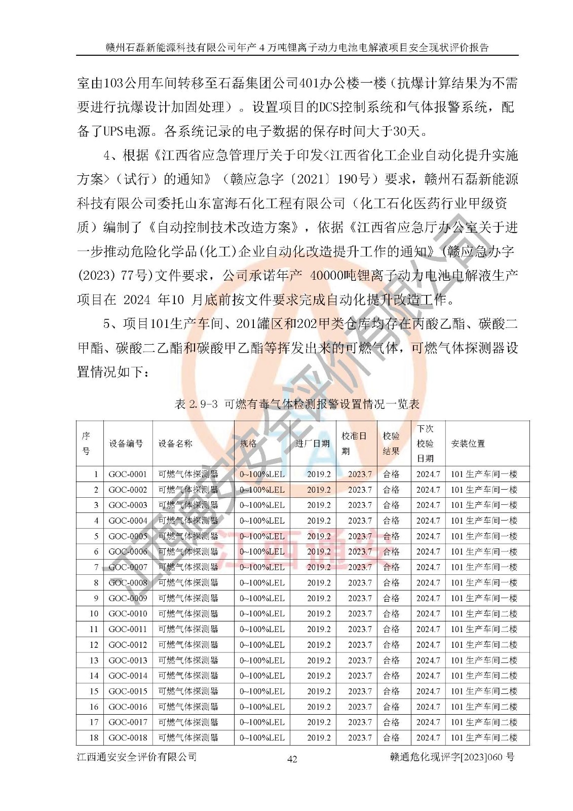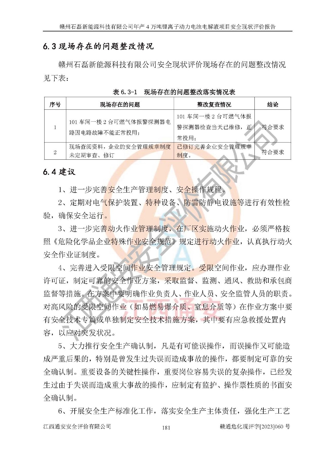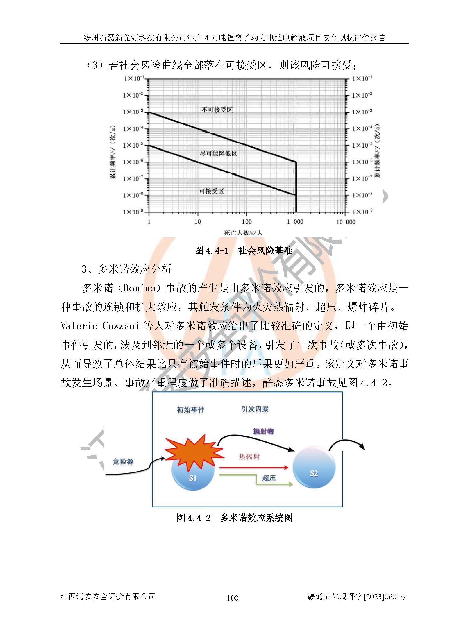 一、安全狀況綜合評(píng)述 1、該項(xiàng)目涉及的原輔材料中碳酸二乙酯、碳酸二甲酯、碳酸甲乙酯、丙酸乙酯、氟苯、丁二腈、己二腈、氮?dú)狻⒙?lián)苯及R22屬于危險(xiǎn)化學(xué)品,產(chǎn)品鋰離子電解液屬于危險(xiǎn)化學(xué)品。 2、該項(xiàng)目生產(chǎn)過(guò)程中存在的危險(xiǎn)、有害因素有:火災(zāi)與爆炸、觸電、中毒與窒息、灼燙、機(jī)械傷害、**傷害、高處墜落、物體打擊和其他傷害等危險(xiǎn)有害因素,其中*主要的危險(xiǎn)有害因素是火災(zāi)與爆炸、中毒與窒息。 3、該項(xiàng)目不涉及監(jiān)控化學(xué)品、易制毒化學(xué)品、易制爆危險(xiǎn)化學(xué)品、劇毒化學(xué)品、重點(diǎn)監(jiān)管危險(xiǎn)化學(xué)品和特別管控的危險(xiǎn)化學(xué)品。 4、該項(xiàng)目不涉及重點(diǎn)監(jiān)管的危險(xiǎn)化工工藝。 5、按照《危險(xiǎn)化學(xué)品重大危險(xiǎn)源辨識(shí)》(GB18218-2018)進(jìn)行辨識(shí),該項(xiàng)目生產(chǎn)單元和儲(chǔ)存單元均不構(gòu)成危險(xiǎn)化學(xué)品重大危險(xiǎn)源。 二、定量評(píng)價(jià)結(jié)果 1、作業(yè)條件危險(xiǎn)性評(píng)價(jià)結(jié)果:在選定的9個(gè)評(píng)價(jià)單元的作業(yè)危險(xiǎn)程度為“一般危險(xiǎn),需要注意”或以下,作業(yè)條件相對(duì)安全。 2、危險(xiǎn)度評(píng)價(jià)結(jié)果:101甲類車間、202甲類倉(cāng)庫(kù)、貯罐區(qū)的危險(xiǎn)程度均為**危險(xiǎn),甲類車間、甲類倉(cāng)庫(kù)和甲類貯罐區(qū)內(nèi)均設(shè)置了可燃?xì)怏w檢測(cè)報(bào)警裝置,并定期進(jìn)行校驗(yàn)**其正常工作。廠內(nèi)建構(gòu)筑物按設(shè)計(jì)要求設(shè)置了防雷防靜電接地裝置,并定期檢驗(yàn);爆炸危險(xiǎn)區(qū)域內(nèi)的電氣設(shè)備采用防爆電機(jī),消防設(shè)施通過(guò)了消防驗(yàn)收,車間生產(chǎn)裝置和儲(chǔ)罐采用密閉化、機(jī)械化和自動(dòng)化,設(shè)備本質(zhì)安全度高,并且應(yīng)在各作業(yè)場(chǎng)所為作業(yè)人員配置了勞動(dòng)保護(hù)用品和器具,作業(yè)人員經(jīng)過(guò)廠內(nèi)三級(jí)安全培訓(xùn),考核合格上崗。項(xiàng)目的安全設(shè)施和安全管理符合安全生產(chǎn)條件,能**降低火災(zāi)爆炸事故發(fā)生的可能性,使風(fēng)險(xiǎn)降低到可接受范圍內(nèi)。 3、個(gè)人風(fēng)險(xiǎn)和社會(huì)風(fēng)險(xiǎn)分析結(jié)果:根據(jù)個(gè)人風(fēng)險(xiǎn)分析效果圖,該項(xiàng)目不涉及高敏感防護(hù)目標(biāo)、重要防護(hù)目標(biāo)、一般防護(hù)目標(biāo)中的一類防護(hù)目標(biāo)(≤3×10-6)等值線、二類防護(hù)目標(biāo)(≤1×10-5)等值線和三類防護(hù)目標(biāo)(≤3×10-5)等值線,個(gè)人風(fēng)險(xiǎn)符合要求;根據(jù)社會(huì)風(fēng)險(xiǎn)分析效果圖可知,該項(xiàng)目社會(huì)風(fēng)險(xiǎn)在可接受范圍內(nèi)。 4、可能發(fā)生的危險(xiǎn)化學(xué)品事故的預(yù)測(cè)后果:該項(xiàng)目貯罐區(qū)和101生產(chǎn)車間災(zāi)害模式為池火,泄漏模式為容器中孔泄漏或容器整體破裂,事故預(yù)測(cè)后果*大的儲(chǔ)罐為碳酸二甲酯儲(chǔ)罐,發(fā)生事故的*大死亡半徑為9m;*大重傷半徑13m,*大輕傷半徑為19m。本項(xiàng)目液氮罐西北側(cè)設(shè)有一臺(tái)50m3液氮罐,液氮罐發(fā)生物理爆炸的*大死亡半徑為18m;*大重傷半徑32m,*大輕傷半徑為54m,多米諾半徑為25m。 5、多米諾效應(yīng)分析:該項(xiàng)目貯罐區(qū)和101車間災(zāi)害模式為池火,無(wú)多米諾半徑。液氮罐發(fā)生物理爆炸的多米諾半徑為25m,多米諾影響區(qū)局限在廠內(nèi)。201罐區(qū)有部分儲(chǔ)罐在多米諾影響區(qū)內(nèi),如液氮罐發(fā)生物理爆炸,會(huì)引發(fā)多米諾效應(yīng),導(dǎo)致罐區(qū)儲(chǔ)罐破裂,可燃液體泄漏發(fā)生池火災(zāi)的可能。因此應(yīng)重點(diǎn)關(guān)注液氮儲(chǔ)罐、201貯罐區(qū)等關(guān)鍵裝置安全設(shè)施的完整和**性,**運(yùn)行良好。 三、定性評(píng)價(jià)結(jié)果 1、依據(jù)相關(guān)法律、法規(guī)、標(biāo)準(zhǔn)等的規(guī)定,該項(xiàng)目外部安全條件、總平面布置、工藝及設(shè)備、防火防爆安全設(shè)施等符合**相關(guān)標(biāo)準(zhǔn)規(guī)范的要求,能滿足安全生產(chǎn)的要求。 2、該項(xiàng)目公用輔助設(shè)施能夠滿足安全生產(chǎn)的要求。 3、該項(xiàng)目按要求設(shè)置了安全生產(chǎn)管理機(jī)構(gòu),配備了專職安全生產(chǎn)管理人員,建立了安全生產(chǎn)責(zé)任制,制定了安全管理制度和崗位安全操作規(guī)程等。該公司修訂了生產(chǎn)安全事故應(yīng)急預(yù)案,配備了應(yīng)急救援器材,按要求定期進(jìn)行相關(guān)培訓(xùn)及演練。 4、該項(xiàng)目不涉及“兩重點(diǎn)一重大”,公司主要負(fù)責(zé)人、安全管理人員經(jīng)培訓(xùn)考核取得了相應(yīng)的安全資格證書。主要負(fù)責(zé)人的專業(yè)和學(xué)歷符合要求,公司任命了許惠彬和王佛金為專職安全管理人員,許惠彬的學(xué)歷和專業(yè)均符合要求,王佛金于2021年9月報(bào)名參加了大專應(yīng)用化工技術(shù)專業(yè)學(xué)歷提升,預(yù)計(jì)2024年1月畢業(yè),屆時(shí)可滿足危險(xiǎn)化學(xué)品企業(yè)重點(diǎn)人員安