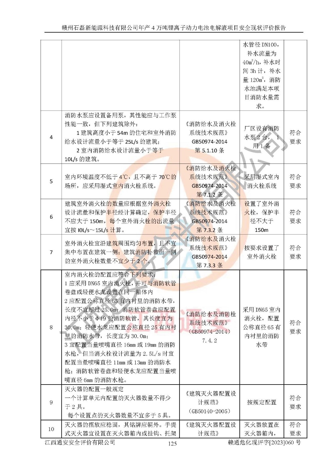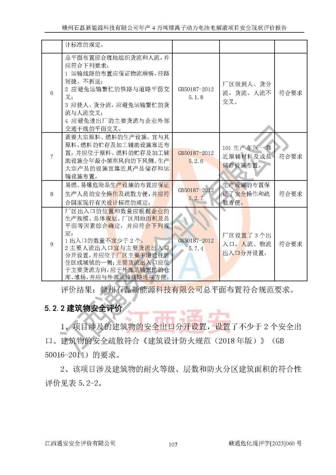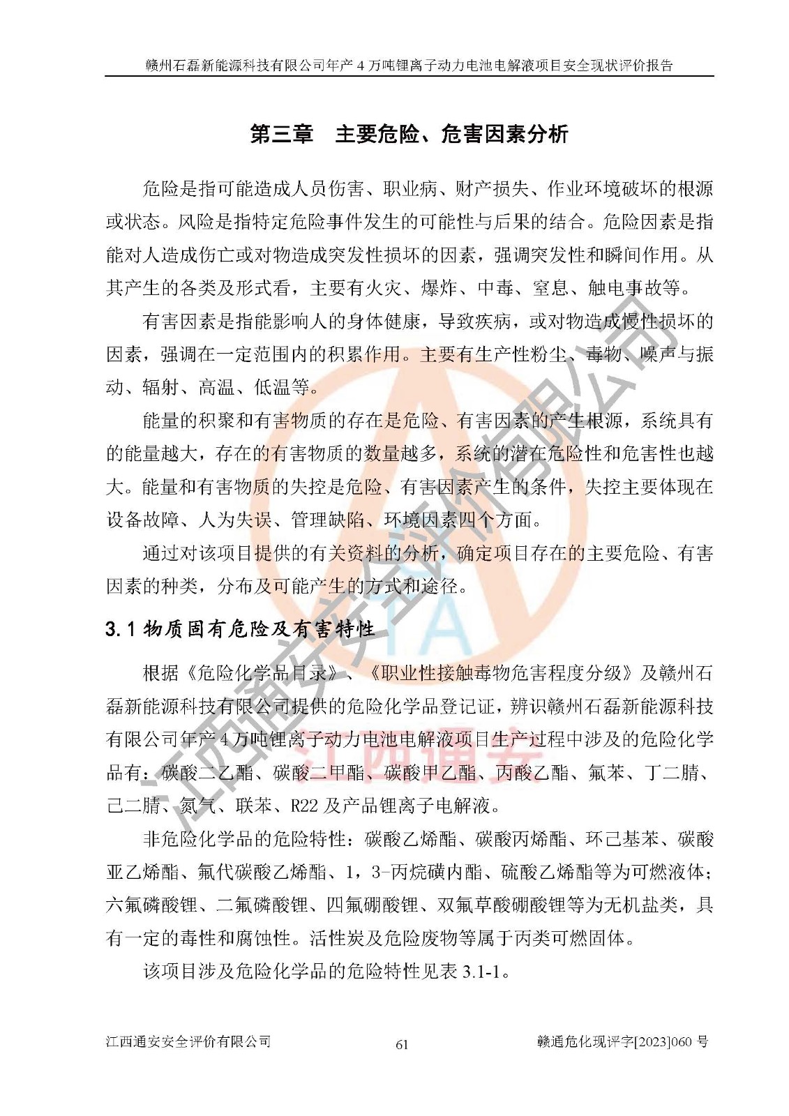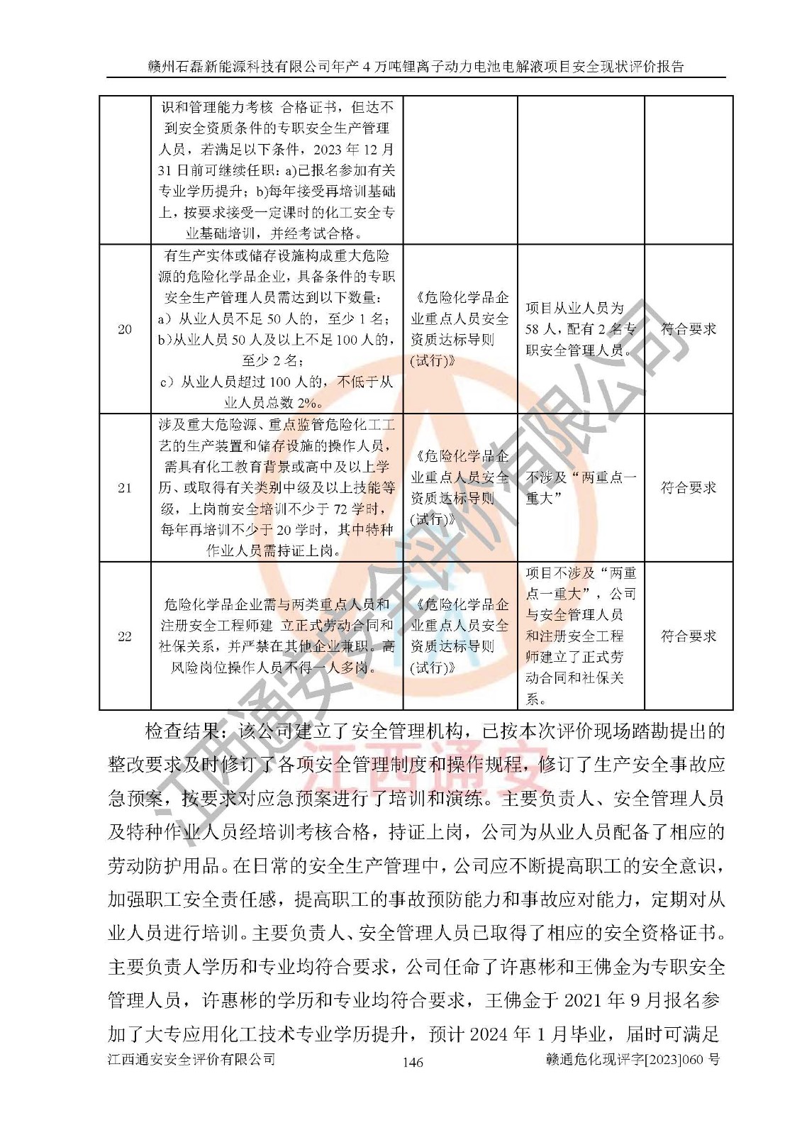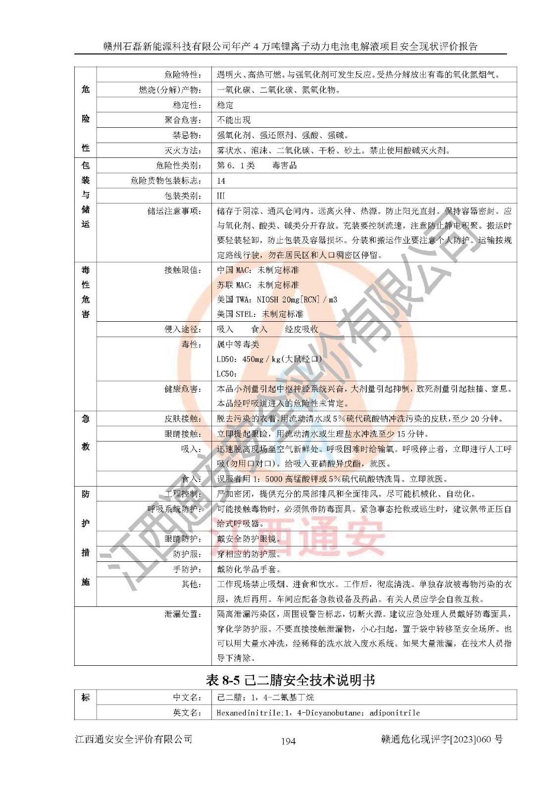一、安全狀況綜合評(píng)述 1、該項(xiàng)目涉及的原輔材料中碳酸二乙酯、碳酸二甲酯、碳酸甲乙酯、丙酸乙酯、氟苯、丁二腈、己二腈、氮?dú)狻⒙?lián)苯及R22屬于危險(xiǎn)化學(xué)品,產(chǎn)品鋰離子電解液屬于危險(xiǎn)化學(xué)品。 2、該項(xiàng)目生產(chǎn)過(guò)程中存在的危險(xiǎn)、有害因素有:火災(zāi)與爆炸、觸電、中毒與窒息、灼燙、機(jī)械傷害、**傷害、高處墜落、物體打擊和其他傷害等危險(xiǎn)有害因素,其中*主要的危險(xiǎn)有害因素是火災(zāi)與爆炸、中毒與窒息。 3、該項(xiàng)目不涉及監(jiān)控化學(xué)品、易制毒化學(xué)品、易制爆危險(xiǎn)化學(xué)品、劇毒化學(xué)品、重點(diǎn)監(jiān)管危險(xiǎn)化學(xué)品和特別管控的危險(xiǎn)化學(xué)品。 4、該項(xiàng)目不涉及重點(diǎn)監(jiān)管的危險(xiǎn)化工工藝。 5、按照《危險(xiǎn)化學(xué)品重大危險(xiǎn)源辨識(shí)》(GB18218-2018)進(jìn)行辨識(shí),該項(xiàng)目生產(chǎn)單元和儲(chǔ)存單元均不構(gòu)成危險(xiǎn)化學(xué)品重大危險(xiǎn)源。 二、定量評(píng)價(jià)結(jié)果 1、作業(yè)條件危險(xiǎn)性評(píng)價(jià)結(jié)果:在選定的9個(gè)評(píng)價(jià)單元的作業(yè)危險(xiǎn)程度為“一般危險(xiǎn),需要注意”或以下,作業(yè)條件相對(duì)安全。 2、危險(xiǎn)度評(píng)價(jià)結(jié)果:101甲類車間、202甲類倉(cāng)庫(kù)、貯罐區(qū)的危險(xiǎn)程度均為**危險(xiǎn),甲類車間、甲類倉(cāng)庫(kù)和甲類貯罐區(qū)內(nèi)均設(shè)置了可燃?xì)怏w檢測(cè)報(bào)警裝置,并定期進(jìn)行校驗(yàn)**其正常工作。廠內(nèi)建構(gòu)筑物按設(shè)計(jì)要求設(shè)置了防雷防靜電接地裝置,并定期檢驗(yàn);爆炸危險(xiǎn)區(qū)域內(nèi)的電氣設(shè)備采用防爆電機(jī),消防設(shè)施通過(guò)了消防驗(yàn)收,車間生產(chǎn)裝置和儲(chǔ)罐采用密閉化、機(jī)械化和自動(dòng)化,設(shè)備本質(zhì)安全度高,并且應(yīng)在各作業(yè)場(chǎng)所為作業(yè)人員配置了勞動(dòng)保護(hù)用品和器具,作業(yè)人員經(jīng)過(guò)廠內(nèi)三級(jí)安全培訓(xùn),考核合格上崗。項(xiàng)目的安全設(shè)施和安全管理符合安全生產(chǎn)條件,能**降低火災(zāi)爆炸事故發(fā)生的可能性,使風(fēng)險(xiǎn)降低到可接受范圍內(nèi)。 3、個(gè)人風(fēng)險(xiǎn)和社會(huì)風(fēng)險(xiǎn)分析結(jié)果:根據(jù)個(gè)人風(fēng)險(xiǎn)分析效果圖,該項(xiàng)目不涉及高敏感防護(hù)目標(biāo)、重要防護(hù)目標(biāo)、一般防護(hù)目標(biāo)中的一類防護(hù)目標(biāo)(≤3×10-6)等值線、二類防護(hù)目標(biāo)(≤1×10-5)等值線和三類防護(hù)目標(biāo)(≤3×10-5)等值線,個(gè)人風(fēng)險(xiǎn)符合要求;根據(jù)社會(huì)風(fēng)險(xiǎn)分析效果圖可知,該項(xiàng)目社會(huì)風(fēng)險(xiǎn)在可接受范圍內(nèi)。 4、可能發(fā)生的危險(xiǎn)化學(xué)品事故的預(yù)測(cè)后果:該項(xiàng)目貯罐區(qū)和101生產(chǎn)車間災(zāi)害模式為池火,泄漏模式為容器中孔泄漏或容器整體破裂,事故預(yù)測(cè)后果*大的儲(chǔ)罐為碳酸二甲酯儲(chǔ)罐,發(fā)生事故的*大死亡半徑為9m;*大重傷半徑13m,*大輕傷半徑為19m。本項(xiàng)目液氮罐西北側(cè)設(shè)有一臺(tái)50m3液氮罐,液氮罐發(fā)生物理爆炸的*大死亡半徑為18m;*大重傷半徑32m,*大輕傷半徑為54m,多米諾半徑為25m。 5、多米諾效應(yīng)分析:該項(xiàng)目貯罐區(qū)和101車間災(zāi)害模式為池火,無(wú)多米諾半徑。液氮罐發(fā)生物理爆炸的多米諾半徑為25m,多米諾影響區(qū)局限在廠內(nèi)。201罐區(qū)有部分儲(chǔ)罐在多米諾影響區(qū)內(nèi),如液氮罐發(fā)生物理爆炸,會(huì)引發(fā)多米諾效應(yīng),導(dǎo)致罐區(qū)儲(chǔ)罐破裂,可燃液體泄漏發(fā)生池火災(zāi)的可能。因此應(yīng)重點(diǎn)關(guān)注液氮儲(chǔ)罐、201貯罐區(qū)等關(guān)鍵裝置安全設(shè)施的完整和**性,**運(yùn)行良好。 三、定性評(píng)價(jià)結(jié)果 1、依據(jù)相關(guān)法律、法規(guī)、標(biāo)準(zhǔn)等的規(guī)定,該項(xiàng)目外部安全條件、總平面布置、工藝及設(shè)備、防火防爆安全設(shè)施等符合**相關(guān)標(biāo)準(zhǔn)規(guī)范的要求,能滿足安全生產(chǎn)的要求。 2、該項(xiàng)目公用輔助設(shè)施能夠滿足安全生產(chǎn)的要求。 3、該項(xiàng)目按要求設(shè)置了安全生產(chǎn)管理機(jī)構(gòu),配備了專職安全生產(chǎn)管理人員,建立了安全生產(chǎn)責(zé)任制,制定了安全管理制度和崗位安全操作規(guī)程等。該公司修訂了生產(chǎn)安全事故應(yīng)急預(yù)案,配備了應(yīng)急救援器材,按要求定期進(jìn)行相關(guān)培訓(xùn)及演練。 4、該項(xiàng)目不涉及“兩重點(diǎn)一重大”,公司主要負(fù)責(zé)人、安全管理人員經(jīng)培訓(xùn)考核取得了相應(yīng)的安全資格證書。主要負(fù)責(zé)人的專業(yè)和學(xué)歷符合要求,公司任命了許惠彬和王佛金為專職安全管理人員,許惠彬的學(xué)歷和專業(yè)均符合要求,王佛金于2021年9月報(bào)名參加了大專應(yīng)用化工技術(shù)專業(yè)學(xué)歷提升,預(yù)計(jì)2024年1月畢業(yè),屆時(shí)可滿足危險(xiǎn)化學(xué)品企業(yè)重點(diǎn)人員安