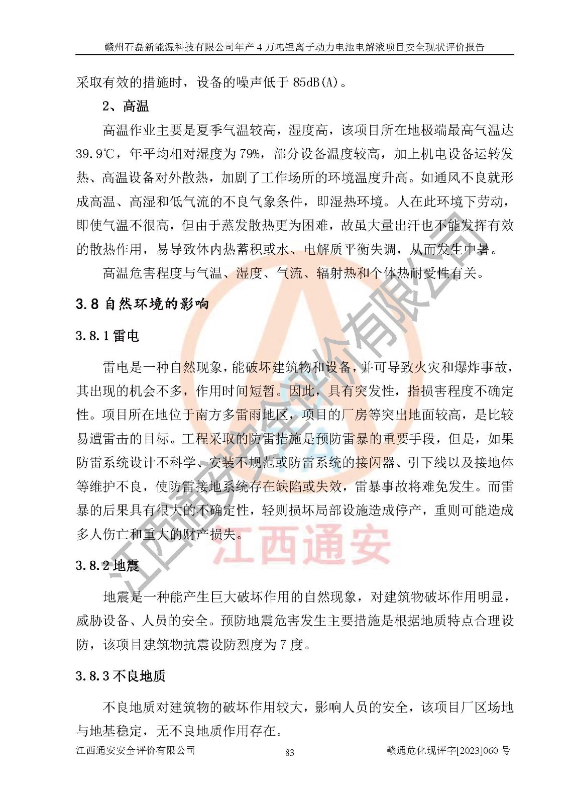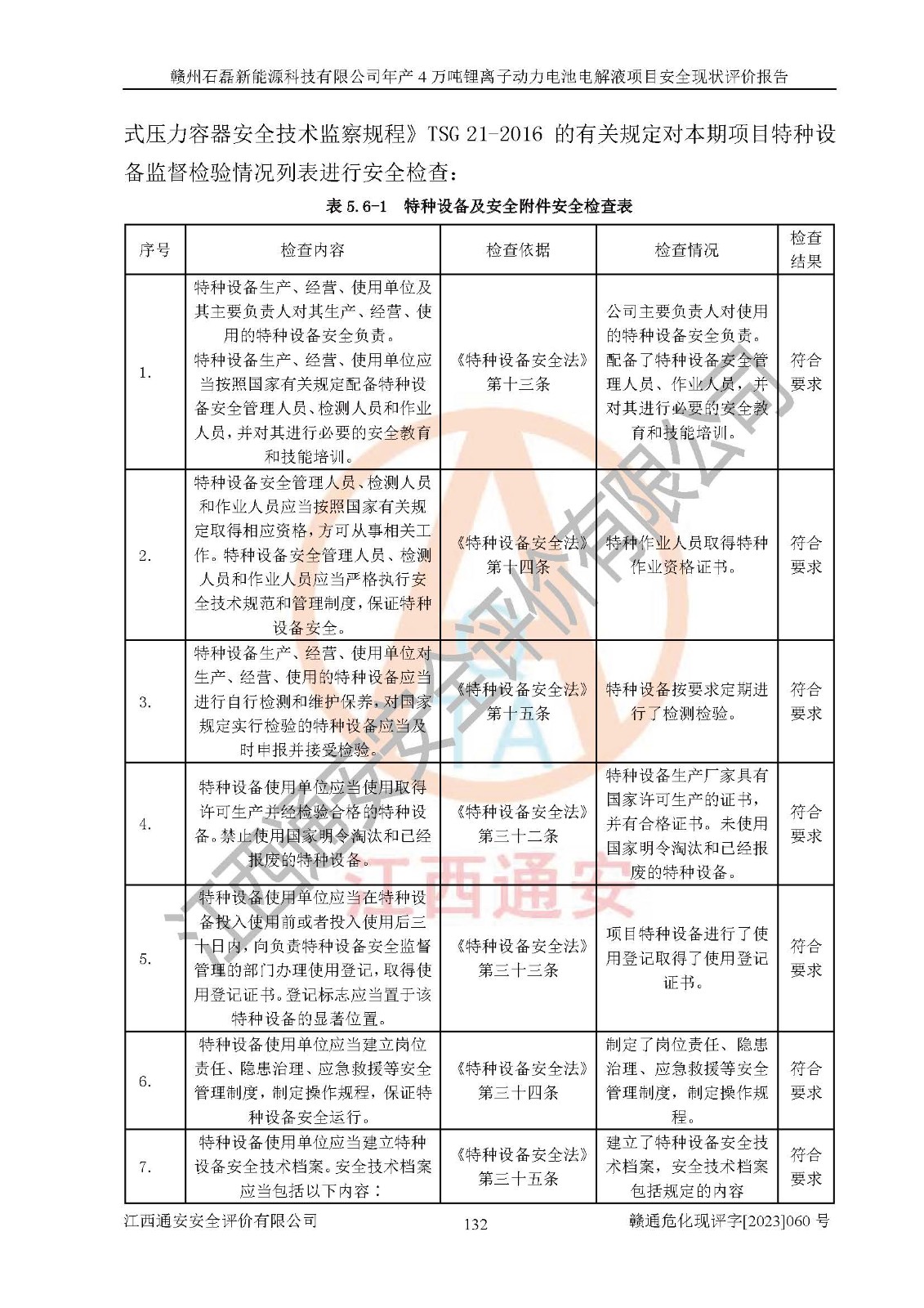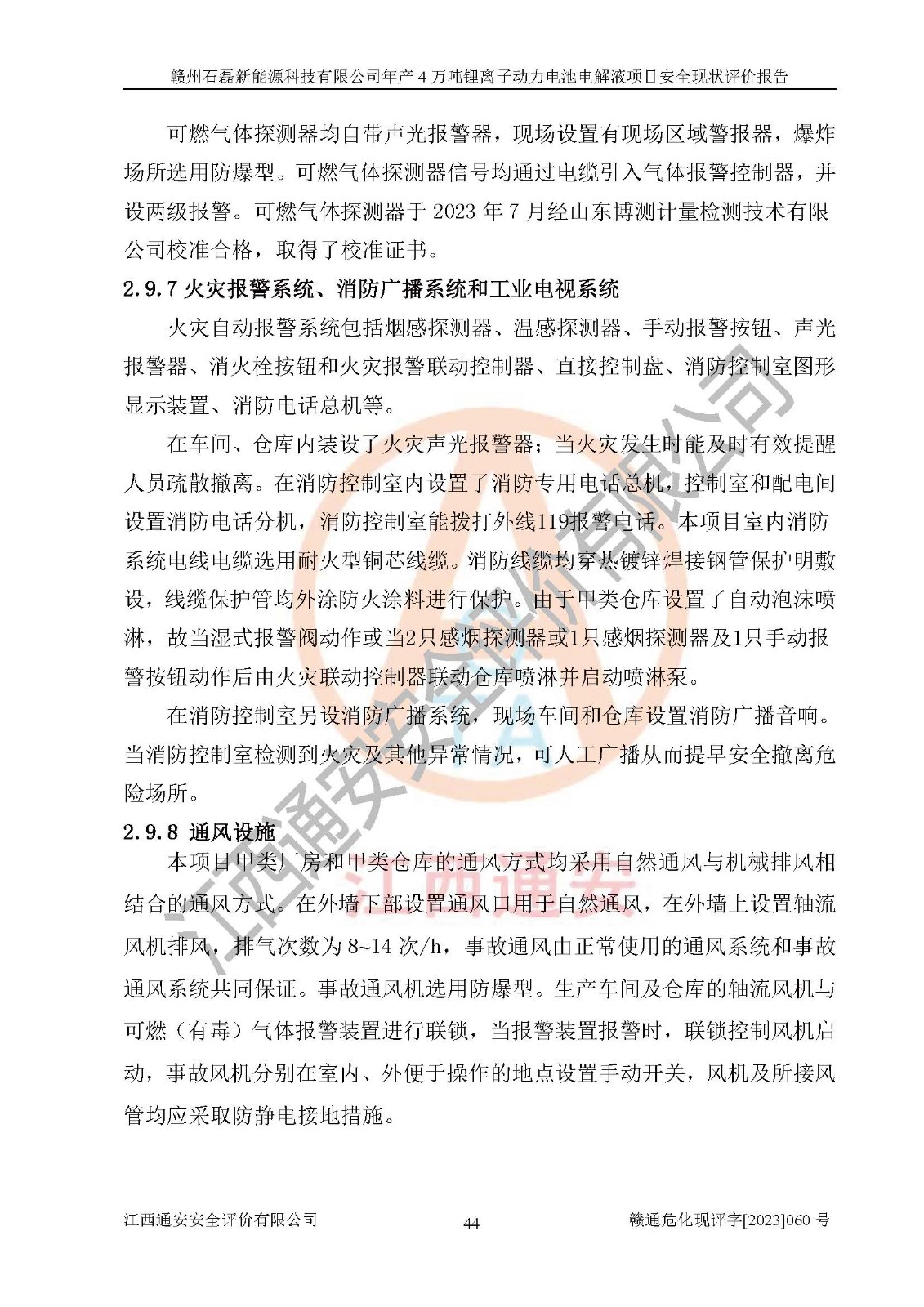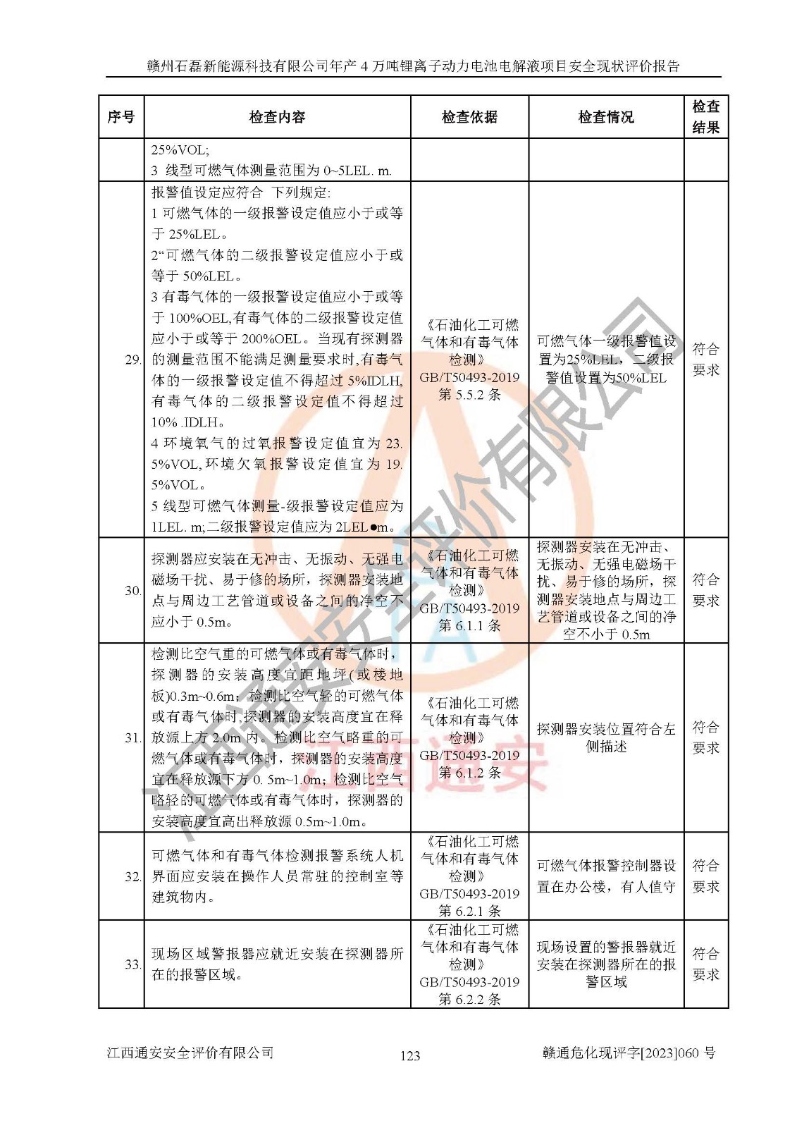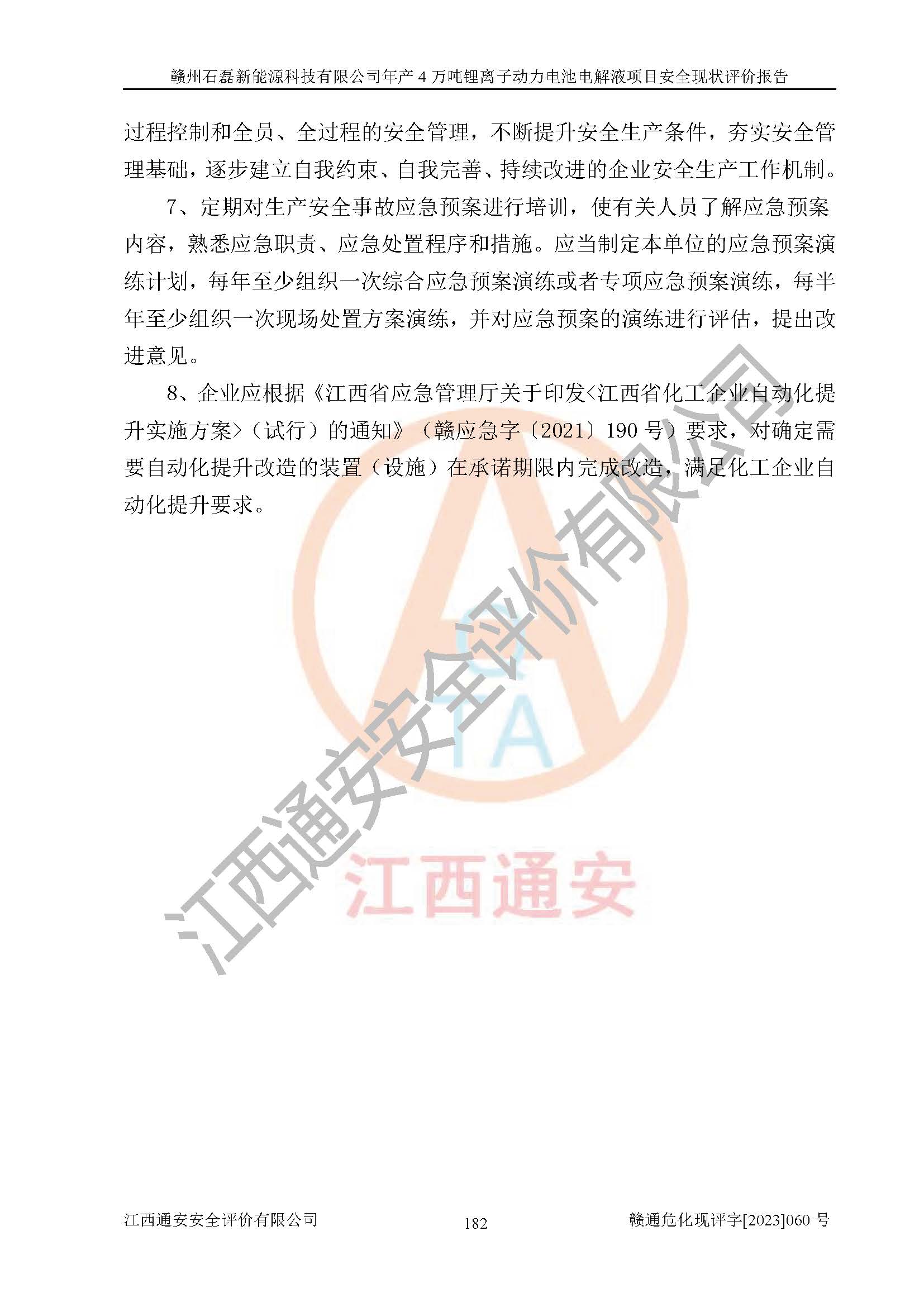 一、安全狀況綜合評(píng)述 1、該項(xiàng)目涉及的原輔材料中碳酸二乙酯、碳酸二甲酯、碳酸甲乙酯、丙酸乙酯、氟苯、丁二腈、己二腈、氮?dú)狻⒙?lián)苯及R22屬于危險(xiǎn)化學(xué)品,產(chǎn)品鋰離子電解液屬于危險(xiǎn)化學(xué)品。 2、該項(xiàng)目生產(chǎn)過(guò)程中存在的危險(xiǎn)、有害因素有:火災(zāi)與爆炸、觸電、中毒與窒息、灼燙、機(jī)械傷害、**傷害、高處墜落、物體打擊和其他傷害等危險(xiǎn)有害因素,其中*主要的危險(xiǎn)有害因素是火災(zāi)與爆炸、中毒與窒息。 3、該項(xiàng)目不涉及監(jiān)控化學(xué)品、易制毒化學(xué)品、易制爆危險(xiǎn)化學(xué)品、劇毒化學(xué)品、重點(diǎn)監(jiān)管危險(xiǎn)化學(xué)品和特別管控的危險(xiǎn)化學(xué)品。 4、該項(xiàng)目不涉及重點(diǎn)監(jiān)管的危險(xiǎn)化工工藝。 5、按照《危險(xiǎn)化學(xué)品重大危險(xiǎn)源辨識(shí)》(GB18218-2018)進(jìn)行辨識(shí),該項(xiàng)目生產(chǎn)單元和儲(chǔ)存單元均不構(gòu)成危險(xiǎn)化學(xué)品重大危險(xiǎn)源。 二、定量評(píng)價(jià)結(jié)果 1、作業(yè)條件危險(xiǎn)性評(píng)價(jià)結(jié)果:在選定的9個(gè)評(píng)價(jià)單元的作業(yè)危險(xiǎn)程度為“一般危險(xiǎn),需要注意”或以下,作業(yè)條件相對(duì)安全。 2、危險(xiǎn)度評(píng)價(jià)結(jié)果:101甲類車間、202甲類倉(cāng)庫(kù)、貯罐區(qū)的危險(xiǎn)程度均為**危險(xiǎn),甲類車間、甲類倉(cāng)庫(kù)和甲類貯罐區(qū)內(nèi)均設(shè)置了可燃?xì)怏w檢測(cè)報(bào)警裝置,并定期進(jìn)行校驗(yàn)**其正常工作。廠內(nèi)建構(gòu)筑物按設(shè)計(jì)要求設(shè)置了防雷防靜電接地裝置,并定期檢驗(yàn);爆炸危險(xiǎn)區(qū)域內(nèi)的電氣設(shè)備采用防爆電機(jī),消防設(shè)施通過(guò)了消防驗(yàn)收,車間生產(chǎn)裝置和儲(chǔ)罐采用密閉化、機(jī)械化和自動(dòng)化,設(shè)備本質(zhì)安全度高,并且應(yīng)在各作業(yè)場(chǎng)所為作業(yè)人員配置了勞動(dòng)保護(hù)用品和器具,作業(yè)人員經(jīng)過(guò)廠內(nèi)三級(jí)安全培訓(xùn),考核合格上崗。項(xiàng)目的安全設(shè)施和安全管理符合安全生產(chǎn)條件,能**降低火災(zāi)爆炸事故發(fā)生的可能性,使風(fēng)險(xiǎn)降低到可接受范圍內(nèi)。 3、個(gè)人風(fēng)險(xiǎn)和社會(huì)風(fēng)險(xiǎn)分析結(jié)果:根據(jù)個(gè)人風(fēng)險(xiǎn)分析效果圖,該項(xiàng)目不涉及高敏感防護(hù)目標(biāo)、重要防護(hù)目標(biāo)、一般防護(hù)目標(biāo)中的一類防護(hù)目標(biāo)(≤3×10-6)等值線、二類防護(hù)目標(biāo)(≤1×10-5)等值線和三類防護(hù)目標(biāo)(≤3×10-5)等值線,個(gè)人風(fēng)險(xiǎn)符合要求;根據(jù)社會(huì)風(fēng)險(xiǎn)分析效果圖可知,該項(xiàng)目社會(huì)風(fēng)險(xiǎn)在可接受范圍內(nèi)。 4、可能發(fā)生的危險(xiǎn)化學(xué)品事故的預(yù)測(cè)后果:該項(xiàng)目貯罐區(qū)和101生產(chǎn)車間災(zāi)害模式為池火,泄漏模式為容器中孔泄漏或容器整體破裂,事故預(yù)測(cè)后果*大的儲(chǔ)罐為碳酸二甲酯儲(chǔ)罐,發(fā)生事故的*大死亡半徑為9m;*大重傷半徑13m,*大輕傷半徑為19m。本項(xiàng)目液氮罐西北側(cè)設(shè)有一臺(tái)50m3液氮罐,液氮罐發(fā)生物理爆炸的*大死亡半徑為18m;*大重傷半徑32m,*大輕傷半徑為54m,多米諾半徑為25m。 5、多米諾效應(yīng)分析:該項(xiàng)目貯罐區(qū)和101車間災(zāi)害模式為池火,無(wú)多米諾半徑。液氮罐發(fā)生物理爆炸的多米諾半徑為25m,多米諾影響區(qū)局限在廠內(nèi)。201罐區(qū)有部分儲(chǔ)罐在多米諾影響區(qū)內(nèi),如液氮罐發(fā)生物理爆炸,會(huì)引發(fā)多米諾效應(yīng),導(dǎo)致罐區(qū)儲(chǔ)罐破裂,可燃液體泄漏發(fā)生池火災(zāi)的可能。因此應(yīng)重點(diǎn)關(guān)注液氮儲(chǔ)罐、201貯罐區(qū)等關(guān)鍵裝置安全設(shè)施的完整和**性,**運(yùn)行良好。 三、定性評(píng)價(jià)結(jié)果 1、依據(jù)相關(guān)法律、法規(guī)、標(biāo)準(zhǔn)等的規(guī)定,該項(xiàng)目外部安全條件、總平面布置、工藝及設(shè)備、防火防爆安全設(shè)施等符合**相關(guān)標(biāo)準(zhǔn)規(guī)范的要求,能滿足安全生產(chǎn)的要求。 2、該項(xiàng)目公用輔助設(shè)施能夠滿足安全生產(chǎn)的要求。 3、該項(xiàng)目按要求設(shè)置了安全生產(chǎn)管理機(jī)構(gòu),配備了專職安全生產(chǎn)管理人員,建立了安全生產(chǎn)責(zé)任制,制定了安全管理制度和崗位安全操作規(guī)程等。該公司修訂了生產(chǎn)安全事故應(yīng)急預(yù)案,配備了應(yīng)急救援器材,按要求定期進(jìn)行相關(guān)培訓(xùn)及演練。 4、該項(xiàng)目不涉及“兩重點(diǎn)一重大”,公司主要負(fù)責(zé)人、安全管理人員經(jīng)培訓(xùn)考核取得了相應(yīng)的安全資格證書。主要負(fù)責(zé)人的專業(yè)和學(xué)歷符合要求,公司任命了許惠彬和王佛金為專職安全管理人員,許惠彬的學(xué)歷和專業(yè)均符合要求,王佛金于2021年9月報(bào)名參加了大專應(yīng)用化工技術(shù)專業(yè)學(xué)歷提升,預(yù)計(jì)2024年1月畢業(yè),屆時(shí)可滿足危險(xiǎn)化學(xué)品企業(yè)重點(diǎn)人員安