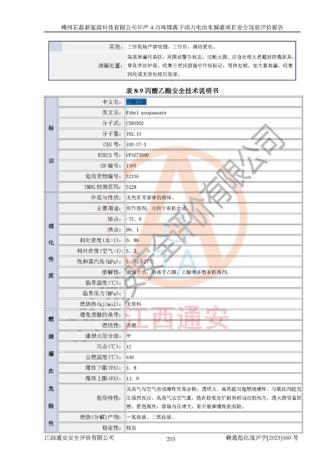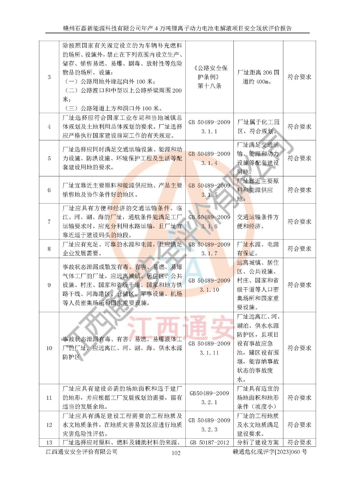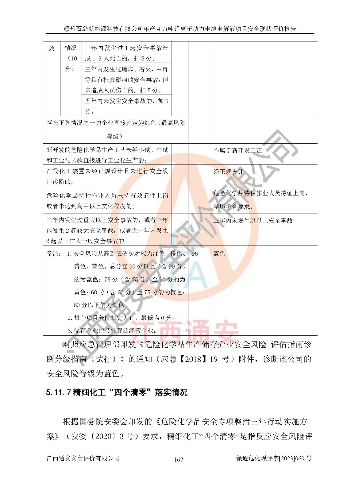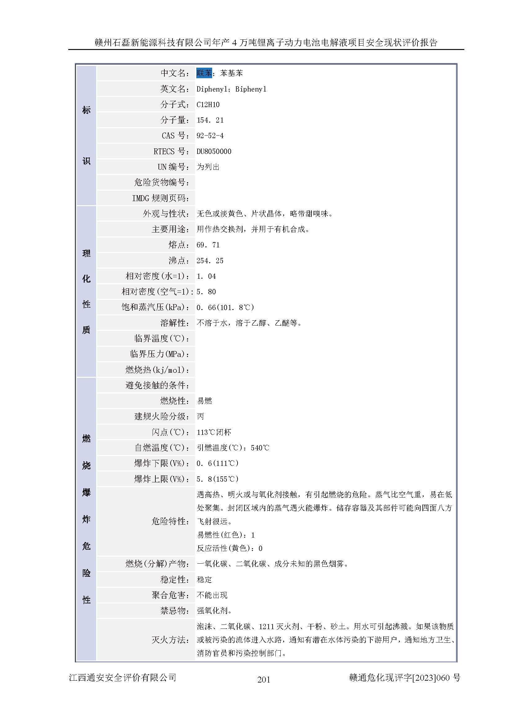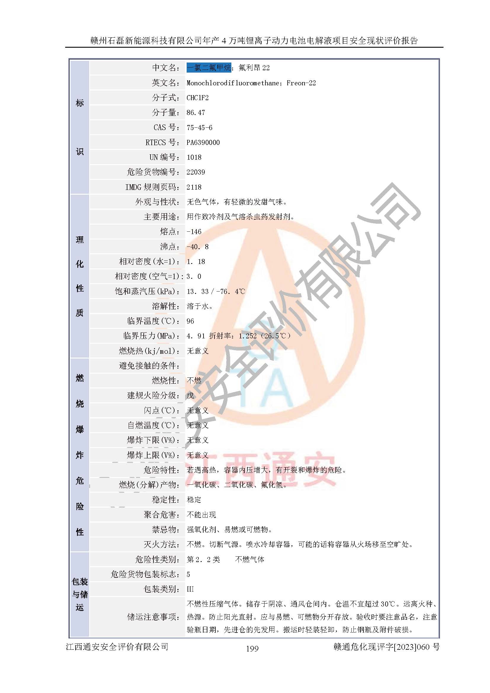 一、安全狀況綜合評(píng)述 1、該項(xiàng)目涉及的原輔材料中碳酸二乙酯、碳酸二甲酯、碳酸甲乙酯、丙酸乙酯、氟苯、丁二腈、己二腈、氮?dú)狻⒙?lián)苯及R22屬于危險(xiǎn)化學(xué)品,產(chǎn)品鋰離子電解液屬于危險(xiǎn)化學(xué)品。 2、該項(xiàng)目生產(chǎn)過(guò)程中存在的危險(xiǎn)、有害因素有:火災(zāi)與爆炸、觸電、中毒與窒息、灼燙、機(jī)械傷害、**傷害、高處墜落、物體打擊和其他傷害等危險(xiǎn)有害因素,其中*主要的危險(xiǎn)有害因素是火災(zāi)與爆炸、中毒與窒息。 3、該項(xiàng)目不涉及監(jiān)控化學(xué)品、易制毒化學(xué)品、易制爆危險(xiǎn)化學(xué)品、劇毒化學(xué)品、重點(diǎn)監(jiān)管危險(xiǎn)化學(xué)品和特別管控的危險(xiǎn)化學(xué)品。 4、該項(xiàng)目不涉及重點(diǎn)監(jiān)管的危險(xiǎn)化工工藝。 5、按照《危險(xiǎn)化學(xué)品重大危險(xiǎn)源辨識(shí)》(GB18218-2018)進(jìn)行辨識(shí),該項(xiàng)目生產(chǎn)單元和儲(chǔ)存單元均不構(gòu)成危險(xiǎn)化學(xué)品重大危險(xiǎn)源。 二、定量評(píng)價(jià)結(jié)果 1、作業(yè)條件危險(xiǎn)性評(píng)價(jià)結(jié)果:在選定的9個(gè)評(píng)價(jià)單元的作業(yè)危險(xiǎn)程度為“一般危險(xiǎn),需要注意”或以下,作業(yè)條件相對(duì)安全。 2、危險(xiǎn)度評(píng)價(jià)結(jié)果:101甲類車間、202甲類倉(cāng)庫(kù)、貯罐區(qū)的危險(xiǎn)程度均為**危險(xiǎn),甲類車間、甲類倉(cāng)庫(kù)和甲類貯罐區(qū)內(nèi)均設(shè)置了可燃?xì)怏w檢測(cè)報(bào)警裝置,并定期進(jìn)行校驗(yàn)**其正常工作。廠內(nèi)建構(gòu)筑物按設(shè)計(jì)要求設(shè)置了防雷防靜電接地裝置,并定期檢驗(yàn);爆炸危險(xiǎn)區(qū)域內(nèi)的電氣設(shè)備采用防爆電機(jī),消防設(shè)施通過(guò)了消防驗(yàn)收,車間生產(chǎn)裝置和儲(chǔ)罐采用密閉化、機(jī)械化和自動(dòng)化,設(shè)備本質(zhì)安全度高,并且應(yīng)在各作業(yè)場(chǎng)所為作業(yè)人員配置了勞動(dòng)保護(hù)用品和器具,作業(yè)人員經(jīng)過(guò)廠內(nèi)三級(jí)安全培訓(xùn),考核合格上崗。項(xiàng)目的安全設(shè)施和安全管理符合安全生產(chǎn)條件,能**降低火災(zāi)爆炸事故發(fā)生的可能性,使風(fēng)險(xiǎn)降低到可接受范圍內(nèi)。 3、個(gè)人風(fēng)險(xiǎn)和社會(huì)風(fēng)險(xiǎn)分析結(jié)果:根據(jù)個(gè)人風(fēng)險(xiǎn)分析效果圖,該項(xiàng)目不涉及高敏感防護(hù)目標(biāo)、重要防護(hù)目標(biāo)、一般防護(hù)目標(biāo)中的一類防護(hù)目標(biāo)(≤3×10-6)等值線、二類防護(hù)目標(biāo)(≤1×10-5)等值線和三類防護(hù)目標(biāo)(≤3×10-5)等值線,個(gè)人風(fēng)險(xiǎn)符合要求;根據(jù)社會(huì)風(fēng)險(xiǎn)分析效果圖可知,該項(xiàng)目社會(huì)風(fēng)險(xiǎn)在可接受范圍內(nèi)。 4、可能發(fā)生的危險(xiǎn)化學(xué)品事故的預(yù)測(cè)后果:該項(xiàng)目貯罐區(qū)和101生產(chǎn)車間災(zāi)害模式為池火,泄漏模式為容器中孔泄漏或容器整體破裂,事故預(yù)測(cè)后果*大的儲(chǔ)罐為碳酸二甲酯儲(chǔ)罐,發(fā)生事故的*大死亡半徑為9m;*大重傷半徑13m,*大輕傷半徑為19m。本項(xiàng)目液氮罐西北側(cè)設(shè)有一臺(tái)50m3液氮罐,液氮罐發(fā)生物理爆炸的*大死亡半徑為18m;*大重傷半徑32m,*大輕傷半徑為54m,多米諾半徑為25m。 5、多米諾效應(yīng)分析:該項(xiàng)目貯罐區(qū)和101車間災(zāi)害模式為池火,無(wú)多米諾半徑。液氮罐發(fā)生物理爆炸的多米諾半徑為25m,多米諾影響區(qū)局限在廠內(nèi)。201罐區(qū)有部分儲(chǔ)罐在多米諾影響區(qū)內(nèi),如液氮罐發(fā)生物理爆炸,會(huì)引發(fā)多米諾效應(yīng),導(dǎo)致罐區(qū)儲(chǔ)罐破裂,可燃液體泄漏發(fā)生池火災(zāi)的可能。因此應(yīng)重點(diǎn)關(guān)注液氮儲(chǔ)罐、201貯罐區(qū)等關(guān)鍵裝置安全設(shè)施的完整和**性,**運(yùn)行良好。 三、定性評(píng)價(jià)結(jié)果 1、依據(jù)相關(guān)法律、法規(guī)、標(biāo)準(zhǔn)等的規(guī)定,該項(xiàng)目外部安全條件、總平面布置、工藝及設(shè)備、防火防爆安全設(shè)施等符合**相關(guān)標(biāo)準(zhǔn)規(guī)范的要求,能滿足安全生產(chǎn)的要求。 2、該項(xiàng)目公用輔助設(shè)施能夠滿足安全生產(chǎn)的要求。 3、該項(xiàng)目按要求設(shè)置了安全生產(chǎn)管理機(jī)構(gòu),配備了專職安全生產(chǎn)管理人員,建立了安全生產(chǎn)責(zé)任制,制定了安全管理制度和崗位安全操作規(guī)程等。該公司修訂了生產(chǎn)安全事故應(yīng)急預(yù)案,配備了應(yīng)急救援器材,按要求定期進(jìn)行相關(guān)培訓(xùn)及演練。 4、該項(xiàng)目不涉及“兩重點(diǎn)一重大”,公司主要負(fù)責(zé)人、安全管理人員經(jīng)培訓(xùn)考核取得了相應(yīng)的安全資格證書。主要負(fù)責(zé)人的專業(yè)和學(xué)歷符合要求,公司任命了許惠彬和王佛金為專職安全管理人員,許惠彬的學(xué)歷和專業(yè)均符合要求,王佛金于2021年9月報(bào)名參加了大專應(yīng)用化工技術(shù)專業(yè)學(xué)歷提升,預(yù)計(jì)2024年1月畢業(yè),屆時(shí)可滿足危險(xiǎn)化學(xué)品企業(yè)重點(diǎn)人員安
