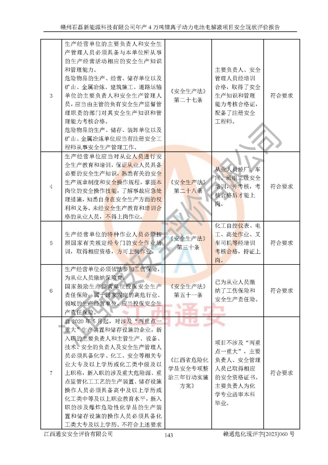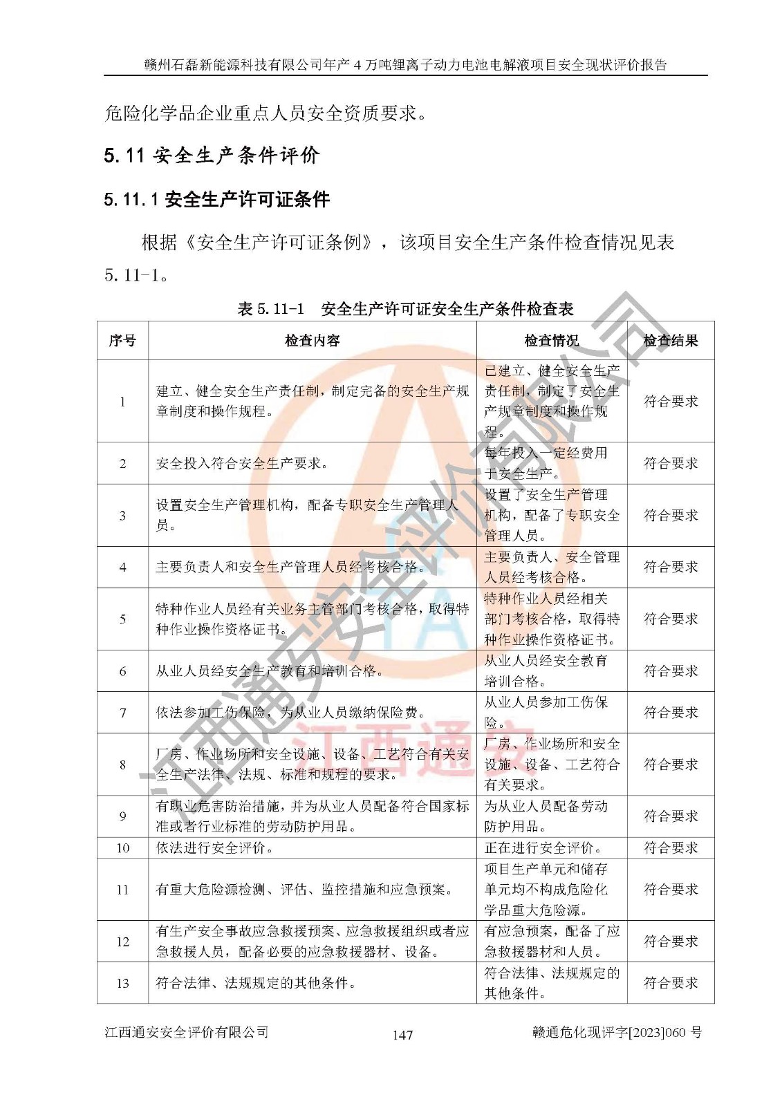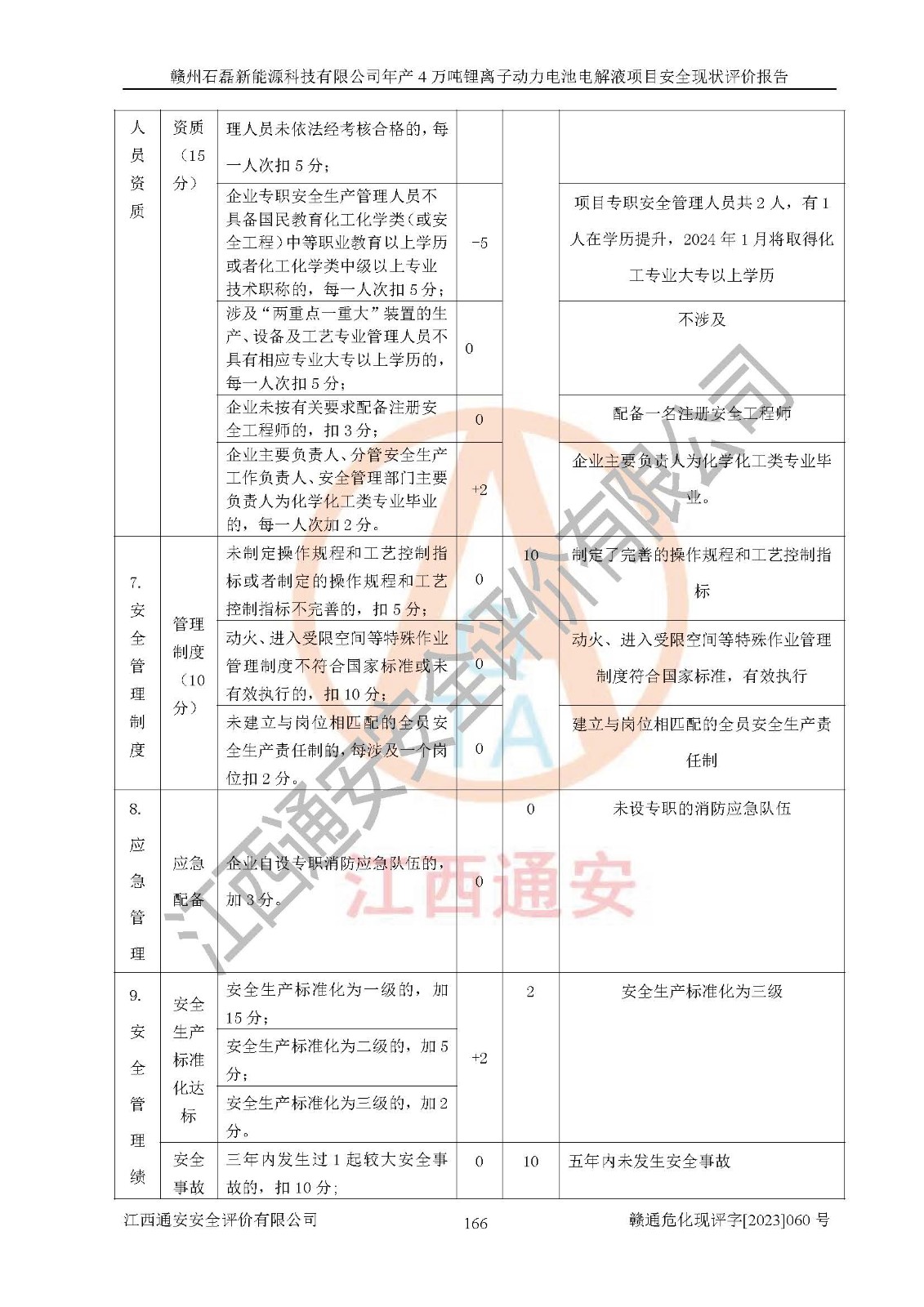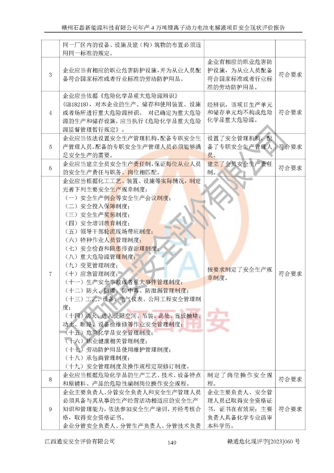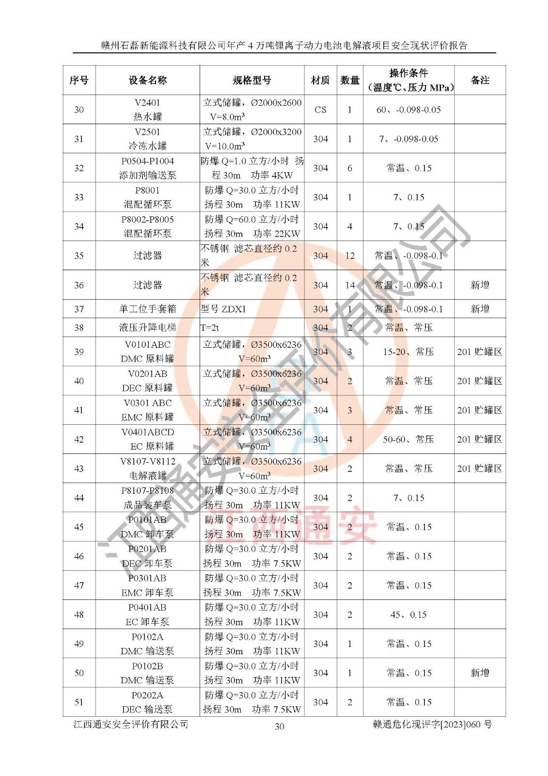 一、安全狀況綜合評(píng)述 1、該項(xiàng)目涉及的原輔材料中碳酸二乙酯、碳酸二甲酯、碳酸甲乙酯、丙酸乙酯、氟苯、丁二腈、己二腈、氮?dú)狻⒙?lián)苯及R22屬于危險(xiǎn)化學(xué)品,產(chǎn)品鋰離子電解液屬于危險(xiǎn)化學(xué)品。 2、該項(xiàng)目生產(chǎn)過(guò)程中存在的危險(xiǎn)、有害因素有:火災(zāi)與爆炸、觸電、中毒與窒息、灼燙、機(jī)械傷害、**傷害、高處墜落、物體打擊和其他傷害等危險(xiǎn)有害因素,其中*主要的危險(xiǎn)有害因素是火災(zāi)與爆炸、中毒與窒息。 3、該項(xiàng)目不涉及監(jiān)控化學(xué)品、易制毒化學(xué)品、易制爆危險(xiǎn)化學(xué)品、劇毒化學(xué)品、重點(diǎn)監(jiān)管危險(xiǎn)化學(xué)品和特別管控的危險(xiǎn)化學(xué)品。 4、該項(xiàng)目不涉及重點(diǎn)監(jiān)管的危險(xiǎn)化工工藝。 5、按照《危險(xiǎn)化學(xué)品重大危險(xiǎn)源辨識(shí)》(GB18218-2018)進(jìn)行辨識(shí),該項(xiàng)目生產(chǎn)單元和儲(chǔ)存單元均不構(gòu)成危險(xiǎn)化學(xué)品重大危險(xiǎn)源。 二、定量評(píng)價(jià)結(jié)果 1、作業(yè)條件危險(xiǎn)性評(píng)價(jià)結(jié)果:在選定的9個(gè)評(píng)價(jià)單元的作業(yè)危險(xiǎn)程度為“一般危險(xiǎn),需要注意”或以下,作業(yè)條件相對(duì)安全。 2、危險(xiǎn)度評(píng)價(jià)結(jié)果:101甲類車間、202甲類倉(cāng)庫(kù)、貯罐區(qū)的危險(xiǎn)程度均為**危險(xiǎn),甲類車間、甲類倉(cāng)庫(kù)和甲類貯罐區(qū)內(nèi)均設(shè)置了可燃?xì)怏w檢測(cè)報(bào)警裝置,并定期進(jìn)行校驗(yàn)**其正常工作。廠內(nèi)建構(gòu)筑物按設(shè)計(jì)要求設(shè)置了防雷防靜電接地裝置,并定期檢驗(yàn);爆炸危險(xiǎn)區(qū)域內(nèi)的電氣設(shè)備采用防爆電機(jī),消防設(shè)施通過(guò)了消防驗(yàn)收,車間生產(chǎn)裝置和儲(chǔ)罐采用密閉化、機(jī)械化和自動(dòng)化,設(shè)備本質(zhì)安全度高,并且應(yīng)在各作業(yè)場(chǎng)所為作業(yè)人員配置了勞動(dòng)保護(hù)用品和器具,作業(yè)人員經(jīng)過(guò)廠內(nèi)三級(jí)安全培訓(xùn),考核合格上崗。項(xiàng)目的安全設(shè)施和安全管理符合安全生產(chǎn)條件,能**降低火災(zāi)爆炸事故發(fā)生的可能性,使風(fēng)險(xiǎn)降低到可接受范圍內(nèi)。 3、個(gè)人風(fēng)險(xiǎn)和社會(huì)風(fēng)險(xiǎn)分析結(jié)果:根據(jù)個(gè)人風(fēng)險(xiǎn)分析效果圖,該項(xiàng)目不涉及高敏感防護(hù)目標(biāo)、重要防護(hù)目標(biāo)、一般防護(hù)目標(biāo)中的一類防護(hù)目標(biāo)(≤3×10-6)等值線、二類防護(hù)目標(biāo)(≤1×10-5)等值線和三類防護(hù)目標(biāo)(≤3×10-5)等值線,個(gè)人風(fēng)險(xiǎn)符合要求;根據(jù)社會(huì)風(fēng)險(xiǎn)分析效果圖可知,該項(xiàng)目社會(huì)風(fēng)險(xiǎn)在可接受范圍內(nèi)。 4、可能發(fā)生的危險(xiǎn)化學(xué)品事故的預(yù)測(cè)后果:該項(xiàng)目貯罐區(qū)和101生產(chǎn)車間災(zāi)害模式為池火,泄漏模式為容器中孔泄漏或容器整體破裂,事故預(yù)測(cè)后果*大的儲(chǔ)罐為碳酸二甲酯儲(chǔ)罐,發(fā)生事故的*大死亡半徑為9m;*大重傷半徑13m,*大輕傷半徑為19m。本項(xiàng)目液氮罐西北側(cè)設(shè)有一臺(tái)50m3液氮罐,液氮罐發(fā)生物理爆炸的*大死亡半徑為18m;*大重傷半徑32m,*大輕傷半徑為54m,多米諾半徑為25m。 5、多米諾效應(yīng)分析:該項(xiàng)目貯罐區(qū)和101車間災(zāi)害模式為池火,無(wú)多米諾半徑。液氮罐發(fā)生物理爆炸的多米諾半徑為25m,多米諾影響區(qū)局限在廠內(nèi)。201罐區(qū)有部分儲(chǔ)罐在多米諾影響區(qū)內(nèi),如液氮罐發(fā)生物理爆炸,會(huì)引發(fā)多米諾效應(yīng),導(dǎo)致罐區(qū)儲(chǔ)罐破裂,可燃液體泄漏發(fā)生池火災(zāi)的可能。因此應(yīng)重點(diǎn)關(guān)注液氮儲(chǔ)罐、201貯罐區(qū)等關(guān)鍵裝置安全設(shè)施的完整和**性,**運(yùn)行良好。 三、定性評(píng)價(jià)結(jié)果 1、依據(jù)相關(guān)法律、法規(guī)、標(biāo)準(zhǔn)等的規(guī)定,該項(xiàng)目外部安全條件、總平面布置、工藝及設(shè)備、防火防爆安全設(shè)施等符合**相關(guān)標(biāo)準(zhǔn)規(guī)范的要求,能滿足安全生產(chǎn)的要求。 2、該項(xiàng)目公用輔助設(shè)施能夠滿足安全生產(chǎn)的要求。 3、該項(xiàng)目按要求設(shè)置了安全生產(chǎn)管理機(jī)構(gòu),配備了專職安全生產(chǎn)管理人員,建立了安全生產(chǎn)責(zé)任制,制定了安全管理制度和崗位安全操作規(guī)程等。該公司修訂了生產(chǎn)安全事故應(yīng)急預(yù)案,配備了應(yīng)急救援器材,按要求定期進(jìn)行相關(guān)培訓(xùn)及演練。 4、該項(xiàng)目不涉及“兩重點(diǎn)一重大”,公司主要負(fù)責(zé)人、安全管理人員經(jīng)培訓(xùn)考核取得了相應(yīng)的安全資格證書。主要負(fù)責(zé)人的專業(yè)和學(xué)歷符合要求,公司任命了許惠彬和王佛金為專職安全管理人員,許惠彬的學(xué)歷和專業(yè)均符合要求,王佛金于2021年9月報(bào)名參加了大專應(yīng)用化工技術(shù)專業(yè)學(xué)歷提升,預(yù)計(jì)2024年1月畢業(yè),屆時(shí)可滿足危險(xiǎn)化學(xué)品企業(yè)重點(diǎn)人員安