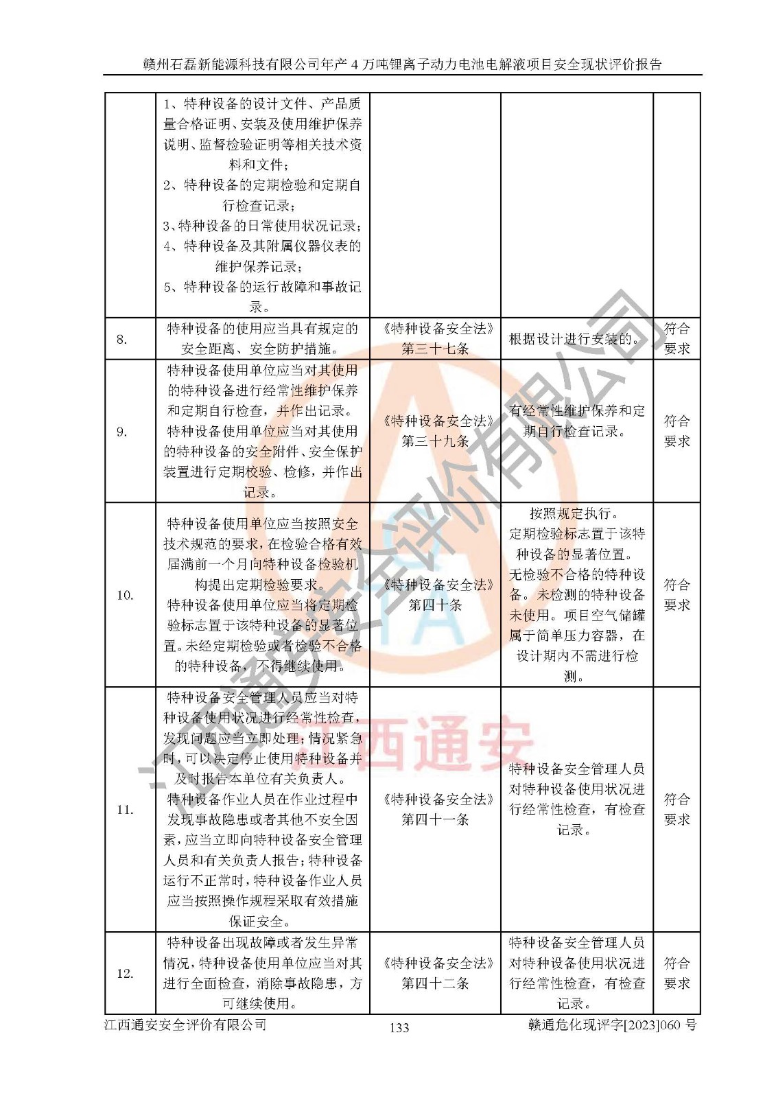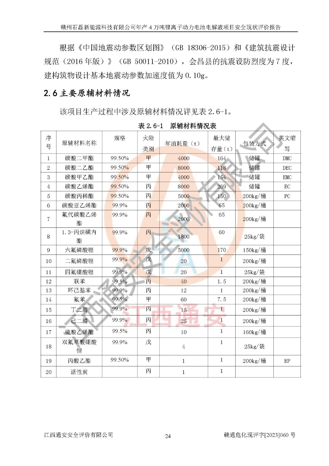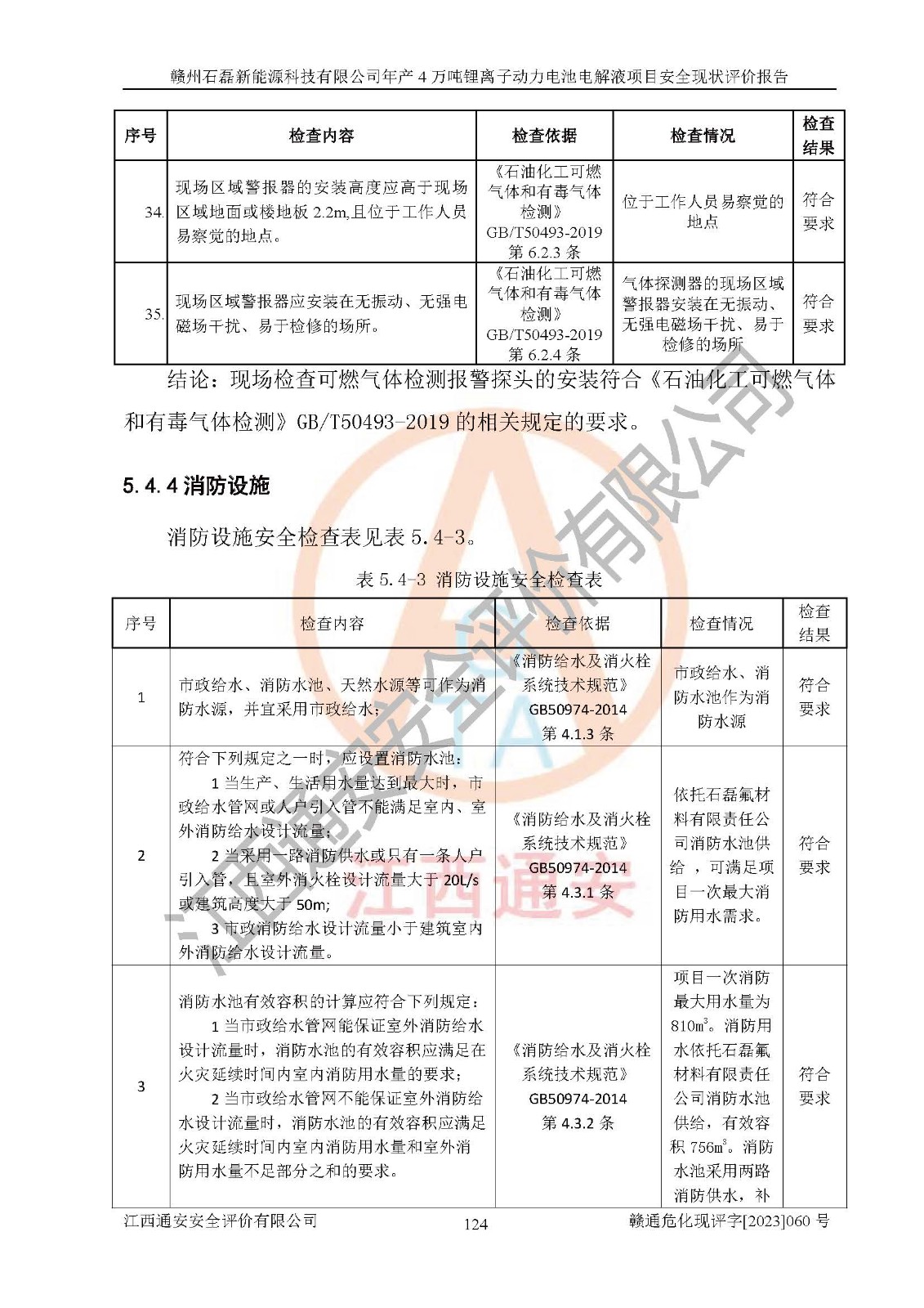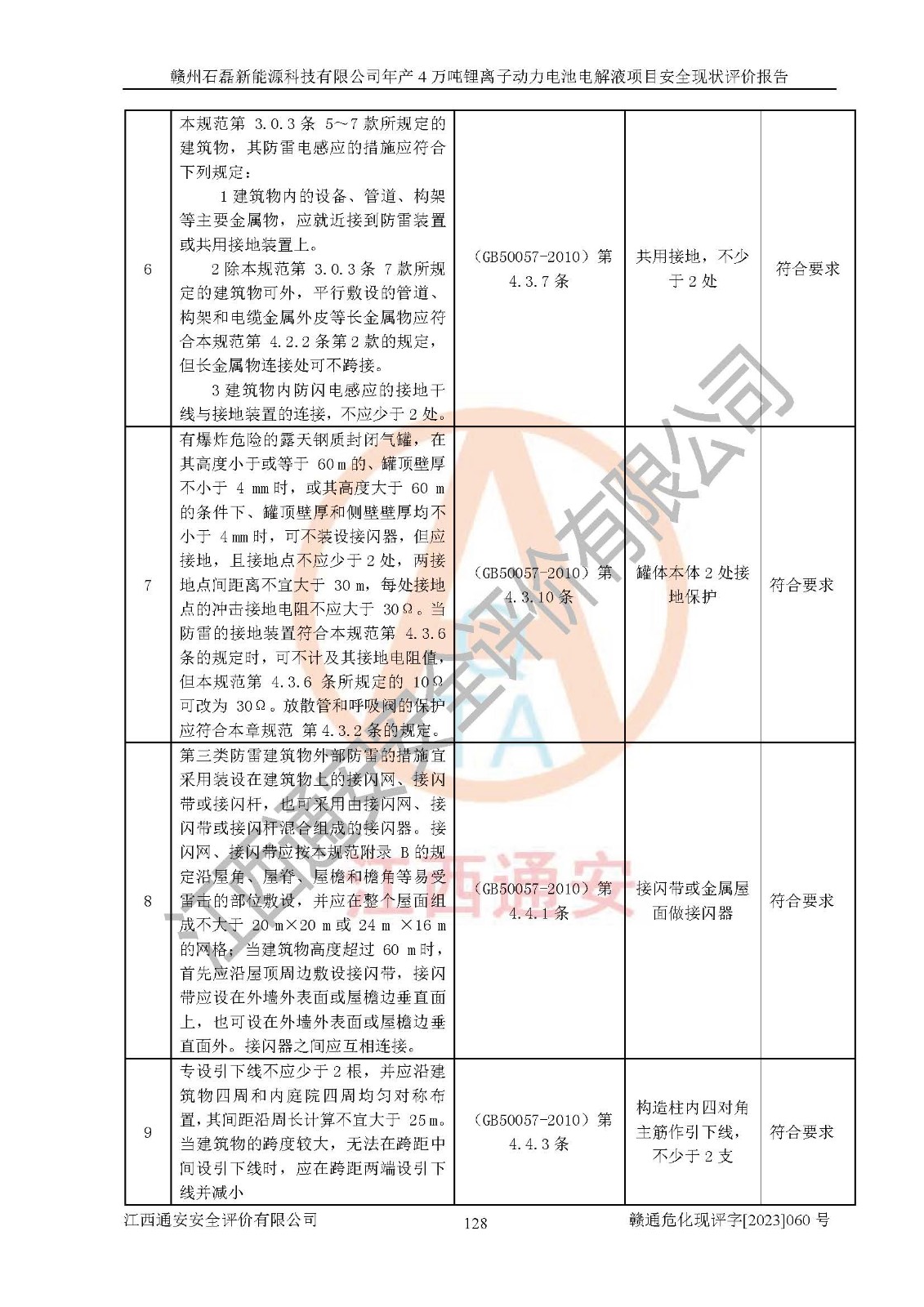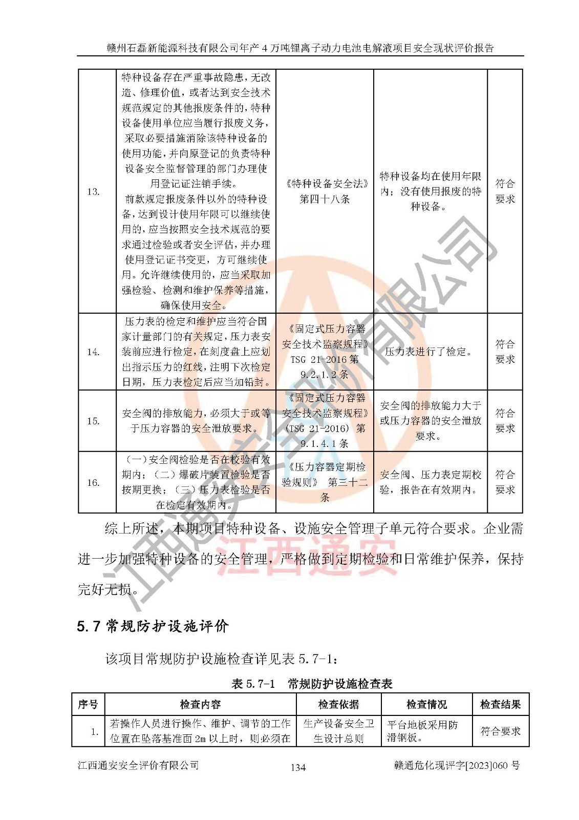 一、安全狀況綜合評(píng)述 1、該項(xiàng)目涉及的原輔材料中碳酸二乙酯、碳酸二甲酯、碳酸甲乙酯、丙酸乙酯、氟苯、丁二腈、己二腈、氮?dú)狻⒙?lián)苯及R22屬于危險(xiǎn)化學(xué)品,產(chǎn)品鋰離子電解液屬于危險(xiǎn)化學(xué)品。 2、該項(xiàng)目生產(chǎn)過(guò)程中存在的危險(xiǎn)、有害因素有:火災(zāi)與爆炸、觸電、中毒與窒息、灼燙、機(jī)械傷害、**傷害、高處墜落、物體打擊和其他傷害等危險(xiǎn)有害因素,其中*主要的危險(xiǎn)有害因素是火災(zāi)與爆炸、中毒與窒息。 3、該項(xiàng)目不涉及監(jiān)控化學(xué)品、易制毒化學(xué)品、易制爆危險(xiǎn)化學(xué)品、劇毒化學(xué)品、重點(diǎn)監(jiān)管危險(xiǎn)化學(xué)品和特別管控的危險(xiǎn)化學(xué)品。 4、該項(xiàng)目不涉及重點(diǎn)監(jiān)管的危險(xiǎn)化工工藝。 5、按照《危險(xiǎn)化學(xué)品重大危險(xiǎn)源辨識(shí)》(GB18218-2018)進(jìn)行辨識(shí),該項(xiàng)目生產(chǎn)單元和儲(chǔ)存單元均不構(gòu)成危險(xiǎn)化學(xué)品重大危險(xiǎn)源。 二、定量評(píng)價(jià)結(jié)果 1、作業(yè)條件危險(xiǎn)性評(píng)價(jià)結(jié)果:在選定的9個(gè)評(píng)價(jià)單元的作業(yè)危險(xiǎn)程度為“一般危險(xiǎn),需要注意”或以下,作業(yè)條件相對(duì)安全。 2、危險(xiǎn)度評(píng)價(jià)結(jié)果:101甲類車間、202甲類倉(cāng)庫(kù)、貯罐區(qū)的危險(xiǎn)程度均為**危險(xiǎn),甲類車間、甲類倉(cāng)庫(kù)和甲類貯罐區(qū)內(nèi)均設(shè)置了可燃?xì)怏w檢測(cè)報(bào)警裝置,并定期進(jìn)行校驗(yàn)**其正常工作。廠內(nèi)建構(gòu)筑物按設(shè)計(jì)要求設(shè)置了防雷防靜電接地裝置,并定期檢驗(yàn);爆炸危險(xiǎn)區(qū)域內(nèi)的電氣設(shè)備采用防爆電機(jī),消防設(shè)施通過(guò)了消防驗(yàn)收,車間生產(chǎn)裝置和儲(chǔ)罐采用密閉化、機(jī)械化和自動(dòng)化,設(shè)備本質(zhì)安全度高,并且應(yīng)在各作業(yè)場(chǎng)所為作業(yè)人員配置了勞動(dòng)保護(hù)用品和器具,作業(yè)人員經(jīng)過(guò)廠內(nèi)三級(jí)安全培訓(xùn),考核合格上崗。項(xiàng)目的安全設(shè)施和安全管理符合安全生產(chǎn)條件,能**降低火災(zāi)爆炸事故發(fā)生的可能性,使風(fēng)險(xiǎn)降低到可接受范圍內(nèi)。 3、個(gè)人風(fēng)險(xiǎn)和社會(huì)風(fēng)險(xiǎn)分析結(jié)果:根據(jù)個(gè)人風(fēng)險(xiǎn)分析效果圖,該項(xiàng)目不涉及高敏感防護(hù)目標(biāo)、重要防護(hù)目標(biāo)、一般防護(hù)目標(biāo)中的一類防護(hù)目標(biāo)(≤3×10-6)等值線、二類防護(hù)目標(biāo)(≤1×10-5)等值線和三類防護(hù)目標(biāo)(≤3×10-5)等值線,個(gè)人風(fēng)險(xiǎn)符合要求;根據(jù)社會(huì)風(fēng)險(xiǎn)分析效果圖可知,該項(xiàng)目社會(huì)風(fēng)險(xiǎn)在可接受范圍內(nèi)。 4、可能發(fā)生的危險(xiǎn)化學(xué)品事故的預(yù)測(cè)后果:該項(xiàng)目貯罐區(qū)和101生產(chǎn)車間災(zāi)害模式為池火,泄漏模式為容器中孔泄漏或容器整體破裂,事故預(yù)測(cè)后果*大的儲(chǔ)罐為碳酸二甲酯儲(chǔ)罐,發(fā)生事故的*大死亡半徑為9m;*大重傷半徑13m,*大輕傷半徑為19m。本項(xiàng)目液氮罐西北側(cè)設(shè)有一臺(tái)50m3液氮罐,液氮罐發(fā)生物理爆炸的*大死亡半徑為18m;*大重傷半徑32m,*大輕傷半徑為54m,多米諾半徑為25m。 5、多米諾效應(yīng)分析:該項(xiàng)目貯罐區(qū)和101車間災(zāi)害模式為池火,無(wú)多米諾半徑。液氮罐發(fā)生物理爆炸的多米諾半徑為25m,多米諾影響區(qū)局限在廠內(nèi)。201罐區(qū)有部分儲(chǔ)罐在多米諾影響區(qū)內(nèi),如液氮罐發(fā)生物理爆炸,會(huì)引發(fā)多米諾效應(yīng),導(dǎo)致罐區(qū)儲(chǔ)罐破裂,可燃液體泄漏發(fā)生池火災(zāi)的可能。因此應(yīng)重點(diǎn)關(guān)注液氮儲(chǔ)罐、201貯罐區(qū)等關(guān)鍵裝置安全設(shè)施的完整和**性,**運(yùn)行良好。 三、定性評(píng)價(jià)結(jié)果 1、依據(jù)相關(guān)法律、法規(guī)、標(biāo)準(zhǔn)等的規(guī)定,該項(xiàng)目外部安全條件、總平面布置、工藝及設(shè)備、防火防爆安全設(shè)施等符合**相關(guān)標(biāo)準(zhǔn)規(guī)范的要求,能滿足安全生產(chǎn)的要求。 2、該項(xiàng)目公用輔助設(shè)施能夠滿足安全生產(chǎn)的要求。 3、該項(xiàng)目按要求設(shè)置了安全生產(chǎn)管理機(jī)構(gòu),配備了專職安全生產(chǎn)管理人員,建立了安全生產(chǎn)責(zé)任制,制定了安全管理制度和崗位安全操作規(guī)程等。該公司修訂了生產(chǎn)安全事故應(yīng)急預(yù)案,配備了應(yīng)急救援器材,按要求定期進(jìn)行相關(guān)培訓(xùn)及演練。 4、該項(xiàng)目不涉及“兩重點(diǎn)一重大”,公司主要負(fù)責(zé)人、安全管理人員經(jīng)培訓(xùn)考核取得了相應(yīng)的安全資格證書。主要負(fù)責(zé)人的專業(yè)和學(xué)歷符合要求,公司任命了許惠彬和王佛金為專職安全管理人員,許惠彬的學(xué)歷和專業(yè)均符合要求,王佛金于2021年9月報(bào)名參加了大專應(yīng)用化工技術(shù)專業(yè)學(xué)歷提升,預(yù)計(jì)2024年1月畢業(yè),屆時(shí)可滿足危險(xiǎn)化學(xué)品企業(yè)重點(diǎn)人員安