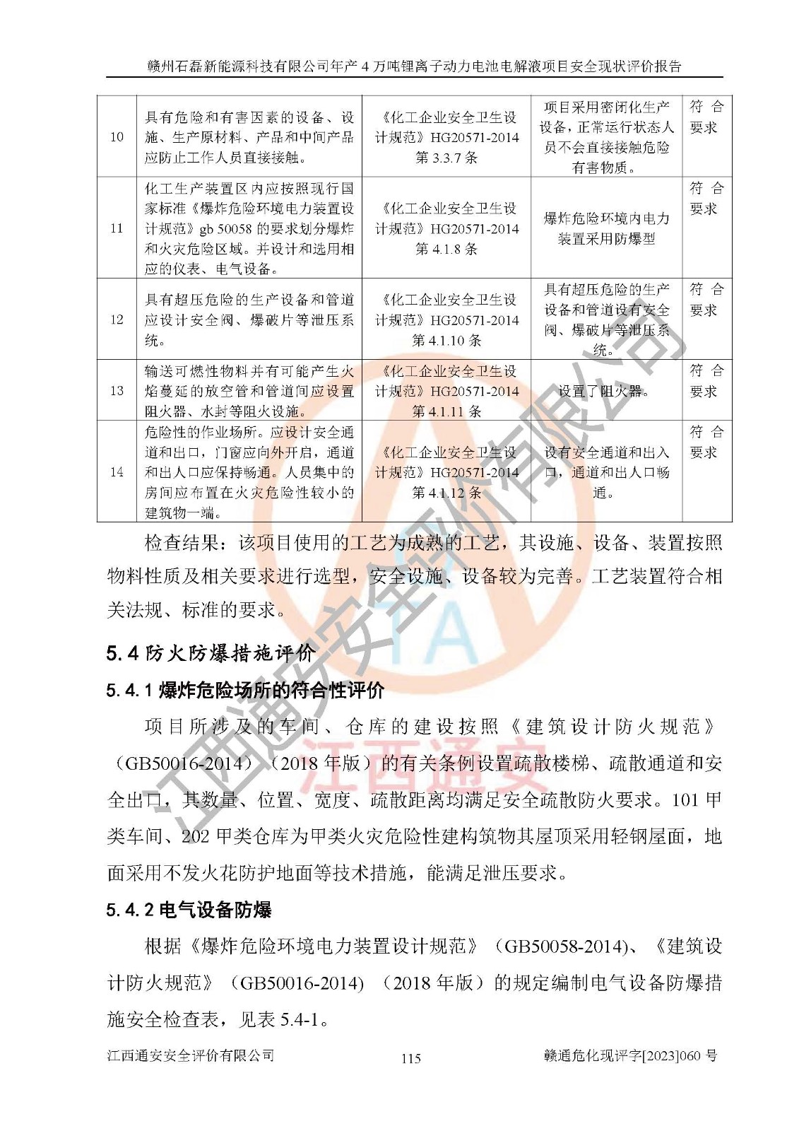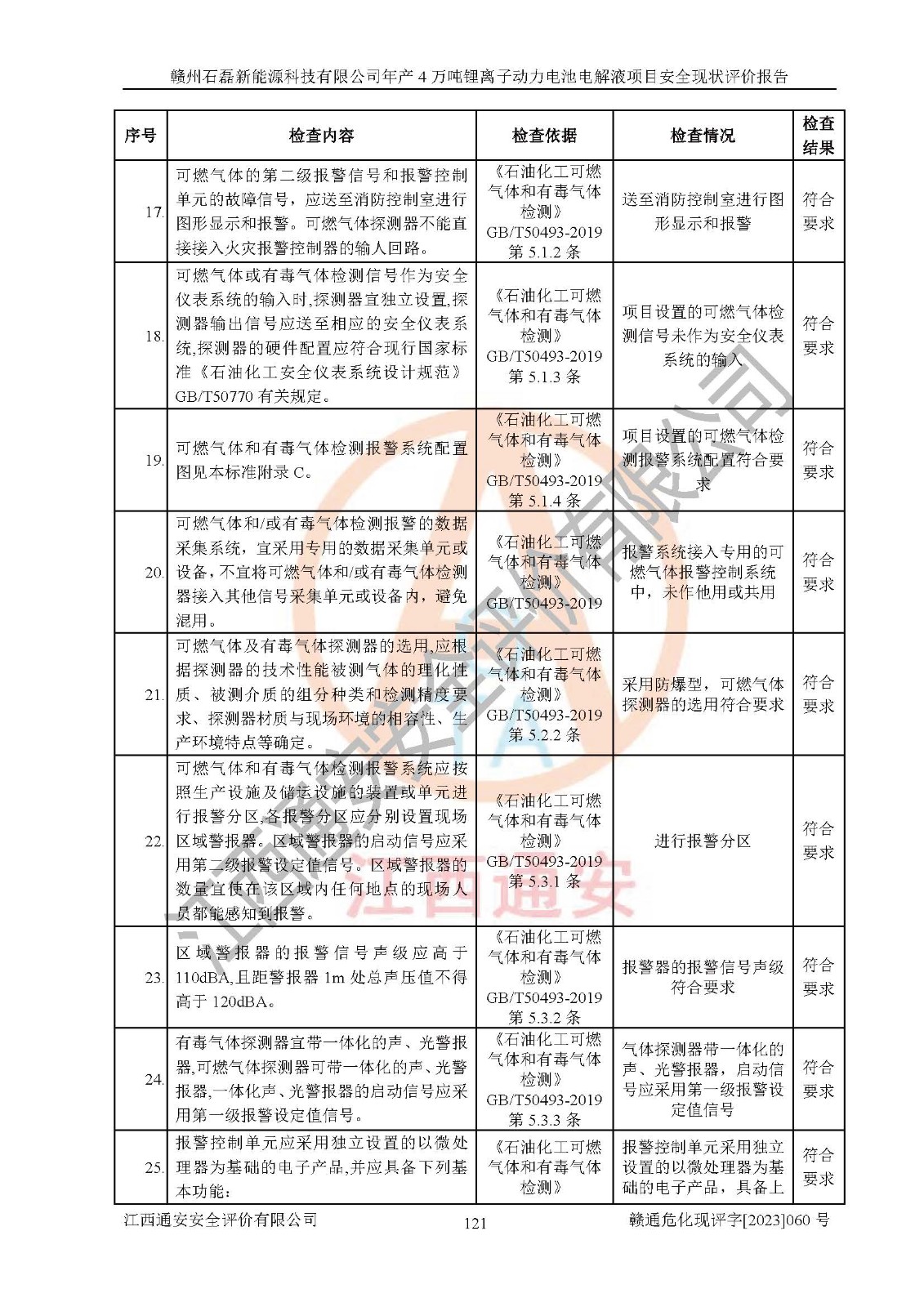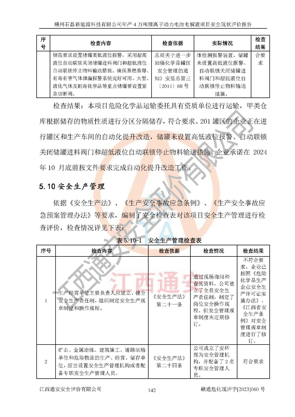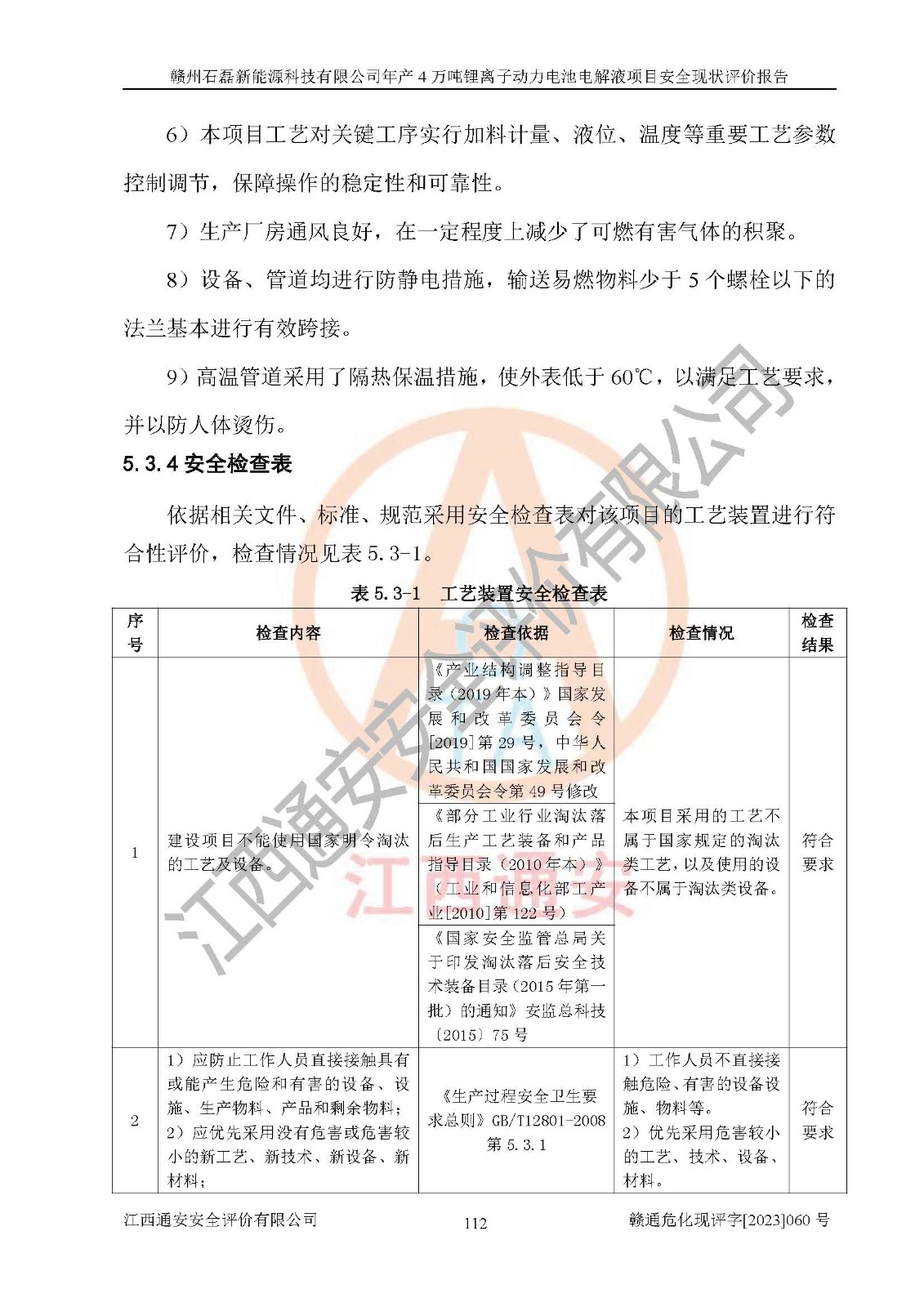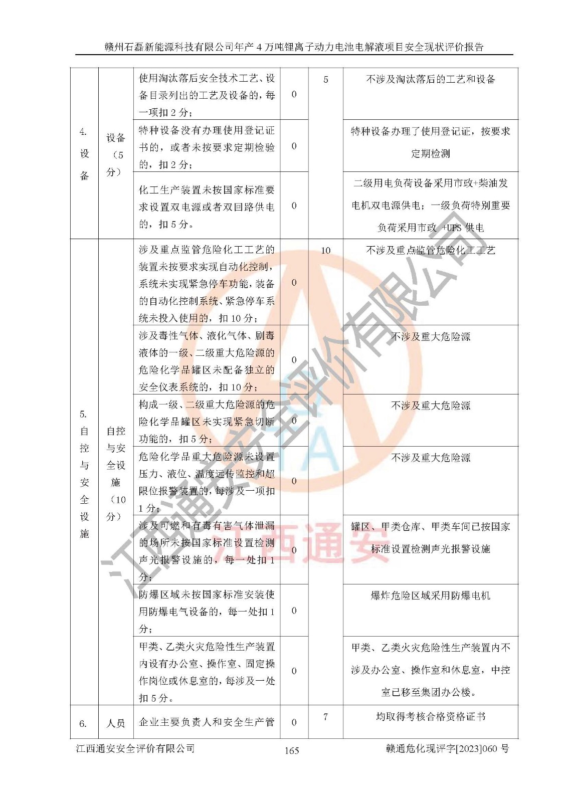 一、安全狀況綜合評(píng)述 1、該項(xiàng)目涉及的原輔材料中碳酸二乙酯、碳酸二甲酯、碳酸甲乙酯、丙酸乙酯、氟苯、丁二腈、己二腈、氮?dú)狻⒙?lián)苯及R22屬于危險(xiǎn)化學(xué)品,產(chǎn)品鋰離子電解液屬于危險(xiǎn)化學(xué)品。 2、該項(xiàng)目生產(chǎn)過(guò)程中存在的危險(xiǎn)、有害因素有:火災(zāi)與爆炸、觸電、中毒與窒息、灼燙、機(jī)械傷害、**傷害、高處墜落、物體打擊和其他傷害等危險(xiǎn)有害因素,其中*主要的危險(xiǎn)有害因素是火災(zāi)與爆炸、中毒與窒息。 3、該項(xiàng)目不涉及監(jiān)控化學(xué)品、易制毒化學(xué)品、易制爆危險(xiǎn)化學(xué)品、劇毒化學(xué)品、重點(diǎn)監(jiān)管危險(xiǎn)化學(xué)品和特別管控的危險(xiǎn)化學(xué)品。 4、該項(xiàng)目不涉及重點(diǎn)監(jiān)管的危險(xiǎn)化工工藝。 5、按照《危險(xiǎn)化學(xué)品重大危險(xiǎn)源辨識(shí)》(GB18218-2018)進(jìn)行辨識(shí),該項(xiàng)目生產(chǎn)單元和儲(chǔ)存單元均不構(gòu)成危險(xiǎn)化學(xué)品重大危險(xiǎn)源。 二、定量評(píng)價(jià)結(jié)果 1、作業(yè)條件危險(xiǎn)性評(píng)價(jià)結(jié)果:在選定的9個(gè)評(píng)價(jià)單元的作業(yè)危險(xiǎn)程度為“一般危險(xiǎn),需要注意”或以下,作業(yè)條件相對(duì)安全。 2、危險(xiǎn)度評(píng)價(jià)結(jié)果:101甲類車間、202甲類倉(cāng)庫(kù)、貯罐區(qū)的危險(xiǎn)程度均為**危險(xiǎn),甲類車間、甲類倉(cāng)庫(kù)和甲類貯罐區(qū)內(nèi)均設(shè)置了可燃?xì)怏w檢測(cè)報(bào)警裝置,并定期進(jìn)行校驗(yàn)**其正常工作。廠內(nèi)建構(gòu)筑物按設(shè)計(jì)要求設(shè)置了防雷防靜電接地裝置,并定期檢驗(yàn);爆炸危險(xiǎn)區(qū)域內(nèi)的電氣設(shè)備采用防爆電機(jī),消防設(shè)施通過(guò)了消防驗(yàn)收,車間生產(chǎn)裝置和儲(chǔ)罐采用密閉化、機(jī)械化和自動(dòng)化,設(shè)備本質(zhì)安全度高,并且應(yīng)在各作業(yè)場(chǎng)所為作業(yè)人員配置了勞動(dòng)保護(hù)用品和器具,作業(yè)人員經(jīng)過(guò)廠內(nèi)三級(jí)安全培訓(xùn),考核合格上崗。項(xiàng)目的安全設(shè)施和安全管理符合安全生產(chǎn)條件,能**降低火災(zāi)爆炸事故發(fā)生的可能性,使風(fēng)險(xiǎn)降低到可接受范圍內(nèi)。 3、個(gè)人風(fēng)險(xiǎn)和社會(huì)風(fēng)險(xiǎn)分析結(jié)果:根據(jù)個(gè)人風(fēng)險(xiǎn)分析效果圖,該項(xiàng)目不涉及高敏感防護(hù)目標(biāo)、重要防護(hù)目標(biāo)、一般防護(hù)目標(biāo)中的一類防護(hù)目標(biāo)(≤3×10-6)等值線、二類防護(hù)目標(biāo)(≤1×10-5)等值線和三類防護(hù)目標(biāo)(≤3×10-5)等值線,個(gè)人風(fēng)險(xiǎn)符合要求;根據(jù)社會(huì)風(fēng)險(xiǎn)分析效果圖可知,該項(xiàng)目社會(huì)風(fēng)險(xiǎn)在可接受范圍內(nèi)。 4、可能發(fā)生的危險(xiǎn)化學(xué)品事故的預(yù)測(cè)后果:該項(xiàng)目貯罐區(qū)和101生產(chǎn)車間災(zāi)害模式為池火,泄漏模式為容器中孔泄漏或容器整體破裂,事故預(yù)測(cè)后果*大的儲(chǔ)罐為碳酸二甲酯儲(chǔ)罐,發(fā)生事故的*大死亡半徑為9m;*大重傷半徑13m,*大輕傷半徑為19m。本項(xiàng)目液氮罐西北側(cè)設(shè)有一臺(tái)50m3液氮罐,液氮罐發(fā)生物理爆炸的*大死亡半徑為18m;*大重傷半徑32m,*大輕傷半徑為54m,多米諾半徑為25m。 5、多米諾效應(yīng)分析:該項(xiàng)目貯罐區(qū)和101車間災(zāi)害模式為池火,無(wú)多米諾半徑。液氮罐發(fā)生物理爆炸的多米諾半徑為25m,多米諾影響區(qū)局限在廠內(nèi)。201罐區(qū)有部分儲(chǔ)罐在多米諾影響區(qū)內(nèi),如液氮罐發(fā)生物理爆炸,會(huì)引發(fā)多米諾效應(yīng),導(dǎo)致罐區(qū)儲(chǔ)罐破裂,可燃液體泄漏發(fā)生池火災(zāi)的可能。因此應(yīng)重點(diǎn)關(guān)注液氮儲(chǔ)罐、201貯罐區(qū)等關(guān)鍵裝置安全設(shè)施的完整和**性,**運(yùn)行良好。 三、定性評(píng)價(jià)結(jié)果 1、依據(jù)相關(guān)法律、法規(guī)、標(biāo)準(zhǔn)等的規(guī)定,該項(xiàng)目外部安全條件、總平面布置、工藝及設(shè)備、防火防爆安全設(shè)施等符合**相關(guān)標(biāo)準(zhǔn)規(guī)范的要求,能滿足安全生產(chǎn)的要求。 2、該項(xiàng)目公用輔助設(shè)施能夠滿足安全生產(chǎn)的要求。 3、該項(xiàng)目按要求設(shè)置了安全生產(chǎn)管理機(jī)構(gòu),配備了專職安全生產(chǎn)管理人員,建立了安全生產(chǎn)責(zé)任制,制定了安全管理制度和崗位安全操作規(guī)程等。該公司修訂了生產(chǎn)安全事故應(yīng)急預(yù)案,配備了應(yīng)急救援器材,按要求定期進(jìn)行相關(guān)培訓(xùn)及演練。 4、該項(xiàng)目不涉及“兩重點(diǎn)一重大”,公司主要負(fù)責(zé)人、安全管理人員經(jīng)培訓(xùn)考核取得了相應(yīng)的安全資格證書。主要負(fù)責(zé)人的專業(yè)和學(xué)歷符合要求,公司任命了許惠彬和王佛金為專職安全管理人員,許惠彬的學(xué)歷和專業(yè)均符合要求,王佛金于2021年9月報(bào)名參加了大專應(yīng)用化工技術(shù)專業(yè)學(xué)歷提升,預(yù)計(jì)2024年1月畢業(yè),屆時(shí)可滿足危險(xiǎn)化學(xué)品企業(yè)重點(diǎn)人員安