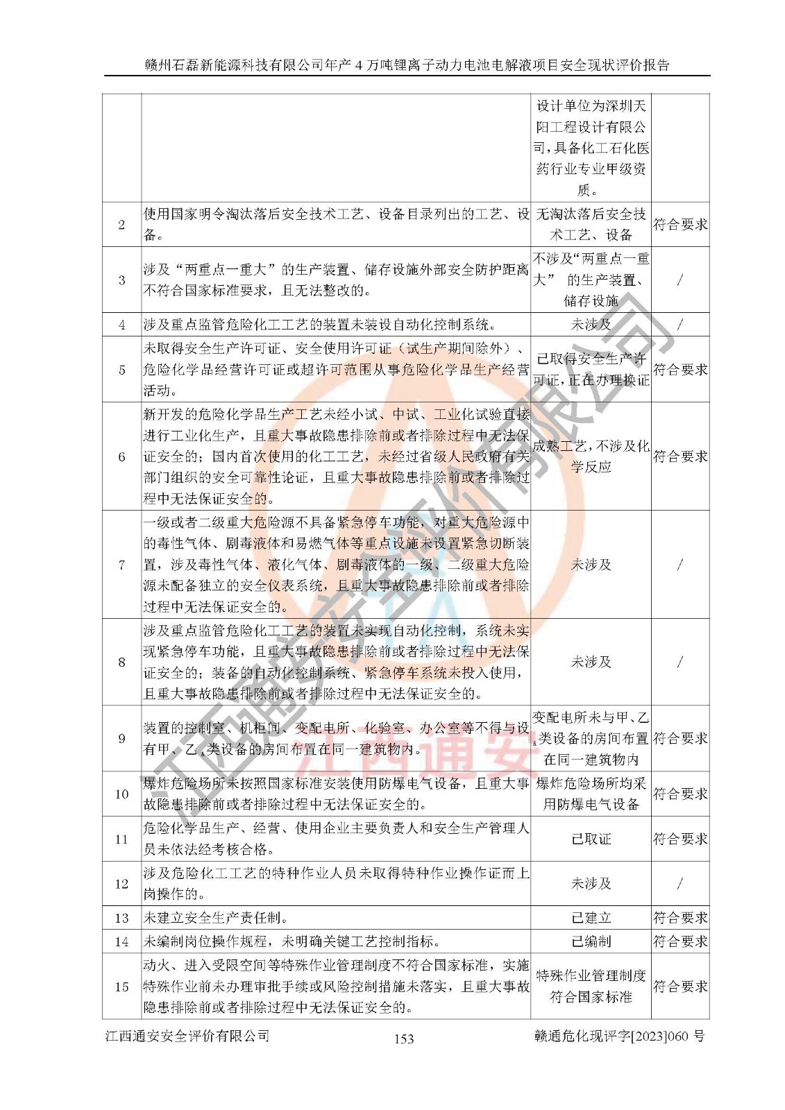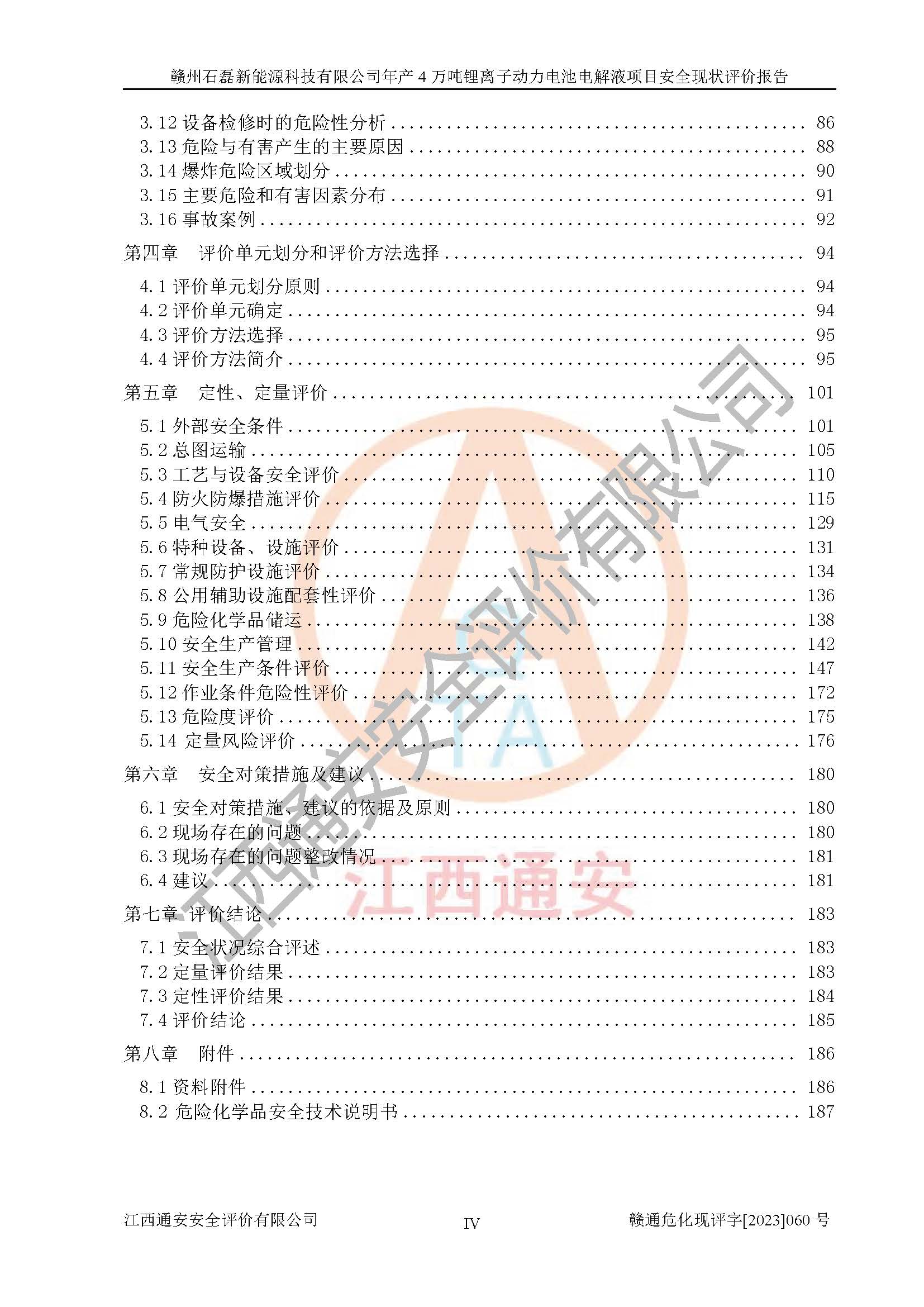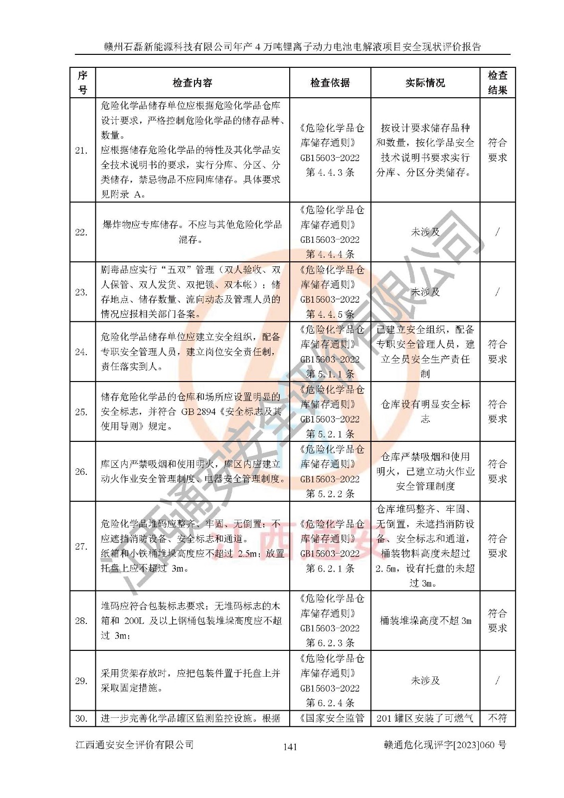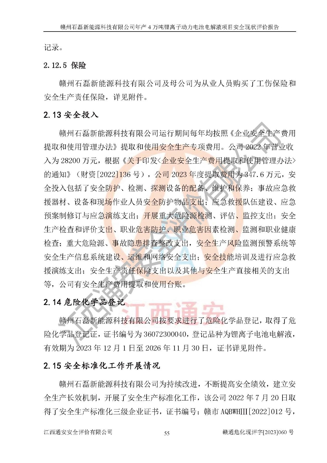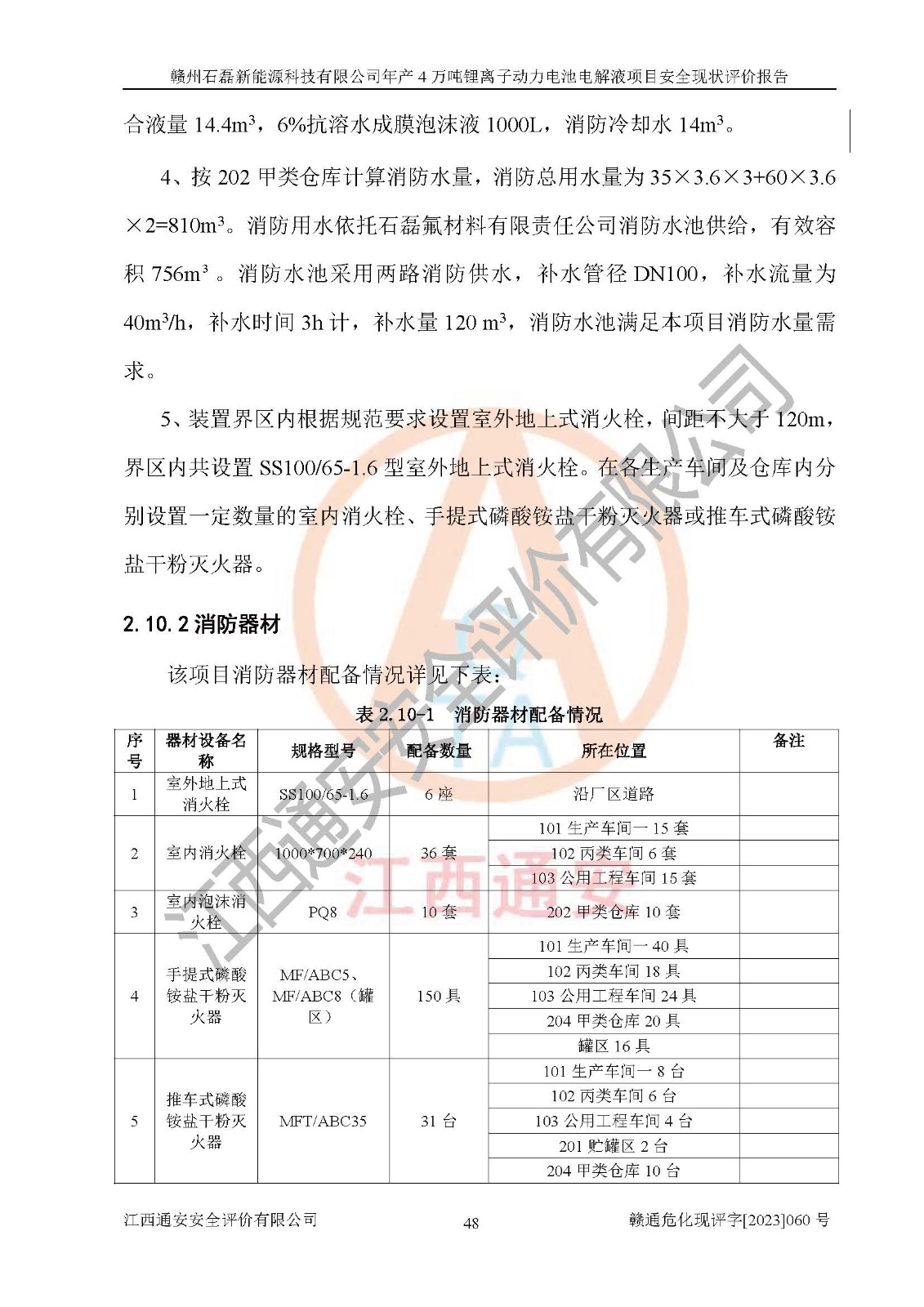 一、安全狀況綜合評(píng)述 1、該項(xiàng)目涉及的原輔材料中碳酸二乙酯、碳酸二甲酯、碳酸甲乙酯、丙酸乙酯、氟苯、丁二腈、己二腈、氮?dú)狻⒙?lián)苯及R22屬于危險(xiǎn)化學(xué)品,產(chǎn)品鋰離子電解液屬于危險(xiǎn)化學(xué)品。 2、該項(xiàng)目生產(chǎn)過(guò)程中存在的危險(xiǎn)、有害因素有:火災(zāi)與爆炸、觸電、中毒與窒息、灼燙、機(jī)械傷害、**傷害、高處墜落、物體打擊和其他傷害等危險(xiǎn)有害因素,其中*主要的危險(xiǎn)有害因素是火災(zāi)與爆炸、中毒與窒息。 3、該項(xiàng)目不涉及監(jiān)控化學(xué)品、易制毒化學(xué)品、易制爆危險(xiǎn)化學(xué)品、劇毒化學(xué)品、重點(diǎn)監(jiān)管危險(xiǎn)化學(xué)品和特別管控的危險(xiǎn)化學(xué)品。 4、該項(xiàng)目不涉及重點(diǎn)監(jiān)管的危險(xiǎn)化工工藝。 5、按照《危險(xiǎn)化學(xué)品重大危險(xiǎn)源辨識(shí)》(GB18218-2018)進(jìn)行辨識(shí),該項(xiàng)目生產(chǎn)單元和儲(chǔ)存單元均不構(gòu)成危險(xiǎn)化學(xué)品重大危險(xiǎn)源。 二、定量評(píng)價(jià)結(jié)果 1、作業(yè)條件危險(xiǎn)性評(píng)價(jià)結(jié)果:在選定的9個(gè)評(píng)價(jià)單元的作業(yè)危險(xiǎn)程度為“一般危險(xiǎn),需要注意”或以下,作業(yè)條件相對(duì)安全。 2、危險(xiǎn)度評(píng)價(jià)結(jié)果:101甲類車間、202甲類倉(cāng)庫(kù)、貯罐區(qū)的危險(xiǎn)程度均為**危險(xiǎn),甲類車間、甲類倉(cāng)庫(kù)和甲類貯罐區(qū)內(nèi)均設(shè)置了可燃?xì)怏w檢測(cè)報(bào)警裝置,并定期進(jìn)行校驗(yàn)**其正常工作。廠內(nèi)建構(gòu)筑物按設(shè)計(jì)要求設(shè)置了防雷防靜電接地裝置,并定期檢驗(yàn);爆炸危險(xiǎn)區(qū)域內(nèi)的電氣設(shè)備采用防爆電機(jī),消防設(shè)施通過(guò)了消防驗(yàn)收,車間生產(chǎn)裝置和儲(chǔ)罐采用密閉化、機(jī)械化和自動(dòng)化,設(shè)備本質(zhì)安全度高,并且應(yīng)在各作業(yè)場(chǎng)所為作業(yè)人員配置了勞動(dòng)保護(hù)用品和器具,作業(yè)人員經(jīng)過(guò)廠內(nèi)三級(jí)安全培訓(xùn),考核合格上崗。項(xiàng)目的安全設(shè)施和安全管理符合安全生產(chǎn)條件,能**降低火災(zāi)爆炸事故發(fā)生的可能性,使風(fēng)險(xiǎn)降低到可接受范圍內(nèi)。 3、個(gè)人風(fēng)險(xiǎn)和社會(huì)風(fēng)險(xiǎn)分析結(jié)果:根據(jù)個(gè)人風(fēng)險(xiǎn)分析效果圖,該項(xiàng)目不涉及高敏感防護(hù)目標(biāo)、重要防護(hù)目標(biāo)、一般防護(hù)目標(biāo)中的一類防護(hù)目標(biāo)(≤3×10-6)等值線、二類防護(hù)目標(biāo)(≤1×10-5)等值線和三類防護(hù)目標(biāo)(≤3×10-5)等值線,個(gè)人風(fēng)險(xiǎn)符合要求;根據(jù)社會(huì)風(fēng)險(xiǎn)分析效果圖可知,該項(xiàng)目社會(huì)風(fēng)險(xiǎn)在可接受范圍內(nèi)。 4、可能發(fā)生的危險(xiǎn)化學(xué)品事故的預(yù)測(cè)后果:該項(xiàng)目貯罐區(qū)和101生產(chǎn)車間災(zāi)害模式為池火,泄漏模式為容器中孔泄漏或容器整體破裂,事故預(yù)測(cè)后果*大的儲(chǔ)罐為碳酸二甲酯儲(chǔ)罐,發(fā)生事故的*大死亡半徑為9m;*大重傷半徑13m,*大輕傷半徑為19m。本項(xiàng)目液氮罐西北側(cè)設(shè)有一臺(tái)50m3液氮罐,液氮罐發(fā)生物理爆炸的*大死亡半徑為18m;*大重傷半徑32m,*大輕傷半徑為54m,多米諾半徑為25m。 5、多米諾效應(yīng)分析:該項(xiàng)目貯罐區(qū)和101車間災(zāi)害模式為池火,無(wú)多米諾半徑。液氮罐發(fā)生物理爆炸的多米諾半徑為25m,多米諾影響區(qū)局限在廠內(nèi)。201罐區(qū)有部分儲(chǔ)罐在多米諾影響區(qū)內(nèi),如液氮罐發(fā)生物理爆炸,會(huì)引發(fā)多米諾效應(yīng),導(dǎo)致罐區(qū)儲(chǔ)罐破裂,可燃液體泄漏發(fā)生池火災(zāi)的可能。因此應(yīng)重點(diǎn)關(guān)注液氮儲(chǔ)罐、201貯罐區(qū)等關(guān)鍵裝置安全設(shè)施的完整和**性,**運(yùn)行良好。 三、定性評(píng)價(jià)結(jié)果 1、依據(jù)相關(guān)法律、法規(guī)、標(biāo)準(zhǔn)等的規(guī)定,該項(xiàng)目外部安全條件、總平面布置、工藝及設(shè)備、防火防爆安全設(shè)施等符合**相關(guān)標(biāo)準(zhǔn)規(guī)范的要求,能滿足安全生產(chǎn)的要求。 2、該項(xiàng)目公用輔助設(shè)施能夠滿足安全生產(chǎn)的要求。 3、該項(xiàng)目按要求設(shè)置了安全生產(chǎn)管理機(jī)構(gòu),配備了專職安全生產(chǎn)管理人員,建立了安全生產(chǎn)責(zé)任制,制定了安全管理制度和崗位安全操作規(guī)程等。該公司修訂了生產(chǎn)安全事故應(yīng)急預(yù)案,配備了應(yīng)急救援器材,按要求定期進(jìn)行相關(guān)培訓(xùn)及演練。 4、該項(xiàng)目不涉及“兩重點(diǎn)一重大”,公司主要負(fù)責(zé)人、安全管理人員經(jīng)培訓(xùn)考核取得了相應(yīng)的安全資格證書。主要負(fù)責(zé)人的專業(yè)和學(xué)歷符合要求,公司任命了許惠彬和王佛金為專職安全管理人員,許惠彬的學(xué)歷和專業(yè)均符合要求,王佛金于2021年9月報(bào)名參加了大專應(yīng)用化工技術(shù)專業(yè)學(xué)歷提升,預(yù)計(jì)2024年1月畢業(yè),屆時(shí)可滿足危險(xiǎn)化學(xué)品企業(yè)重點(diǎn)人員安