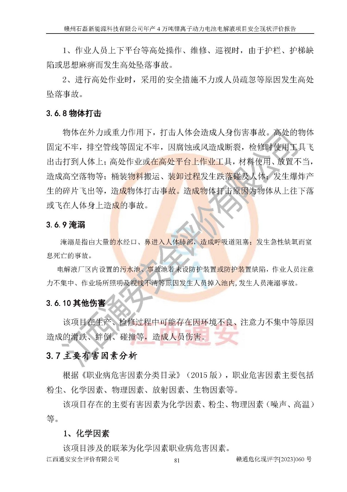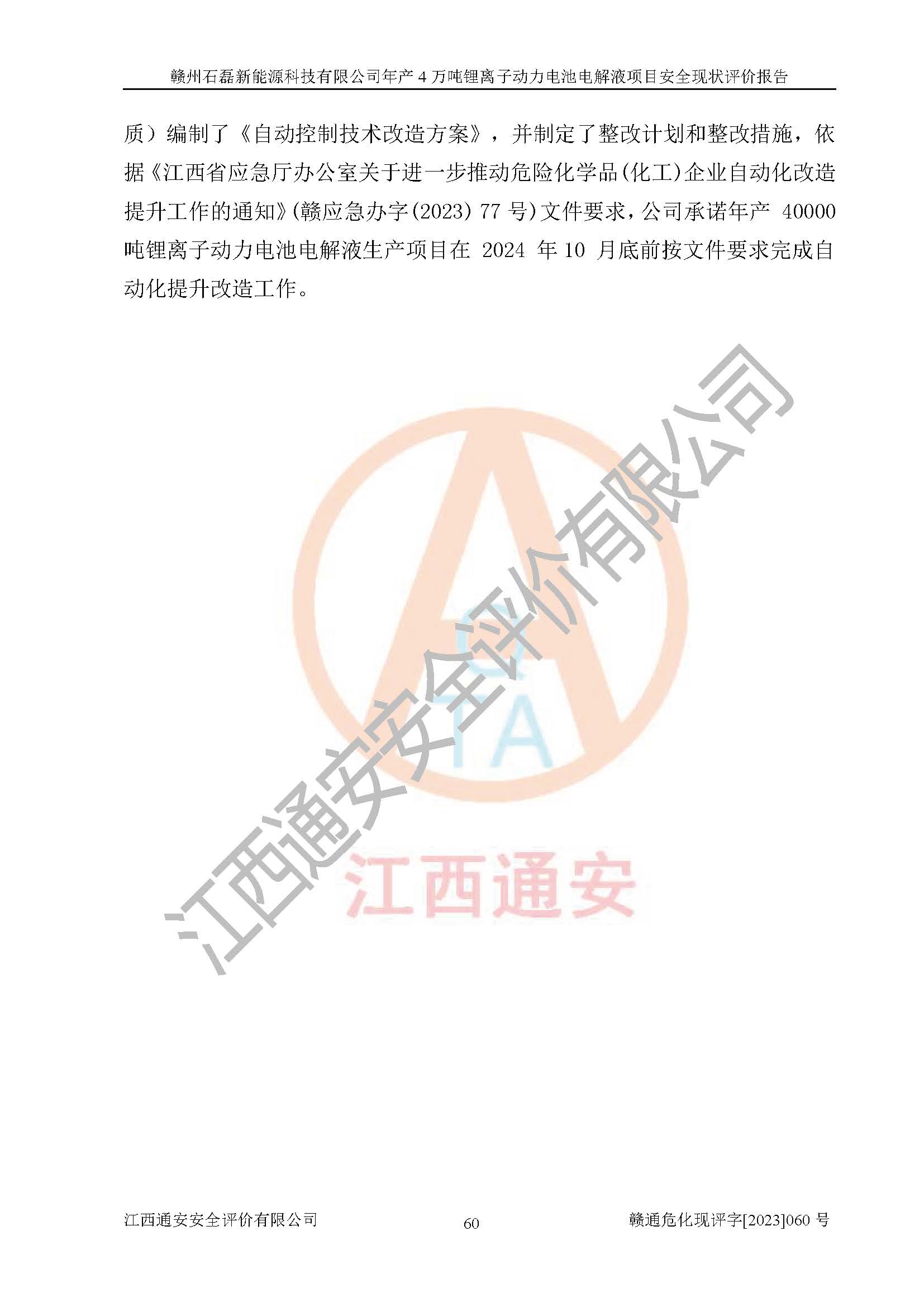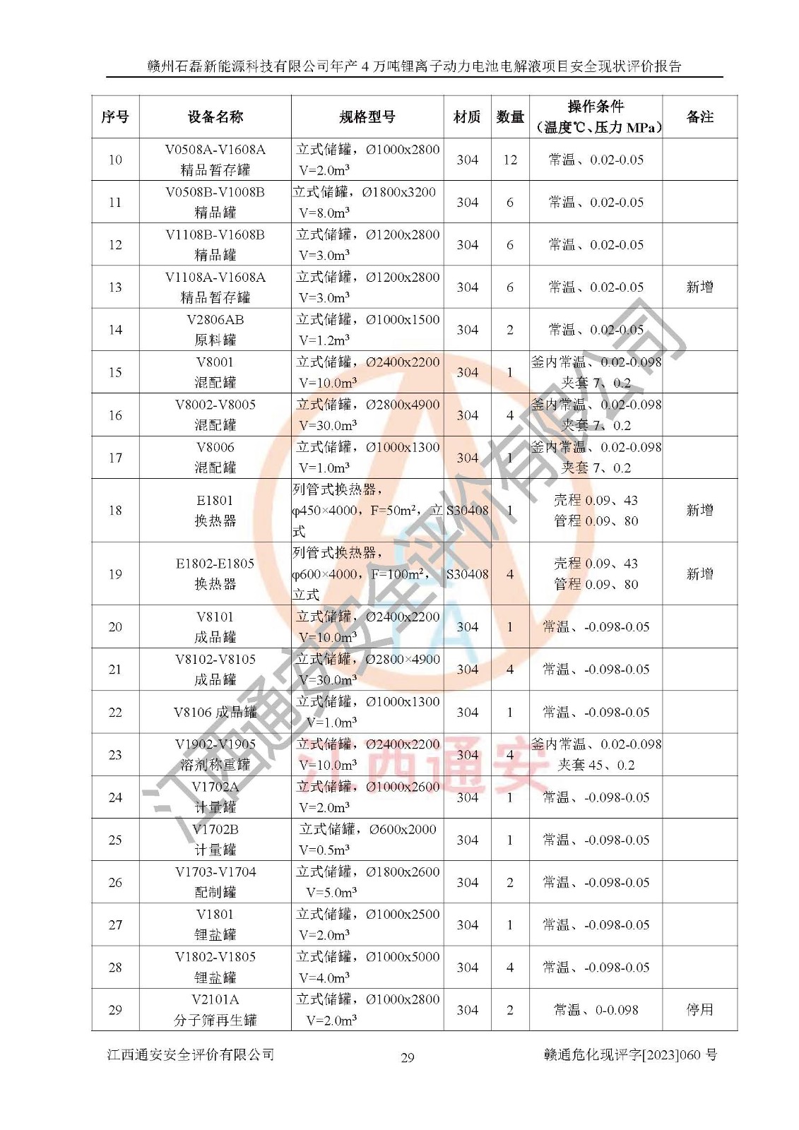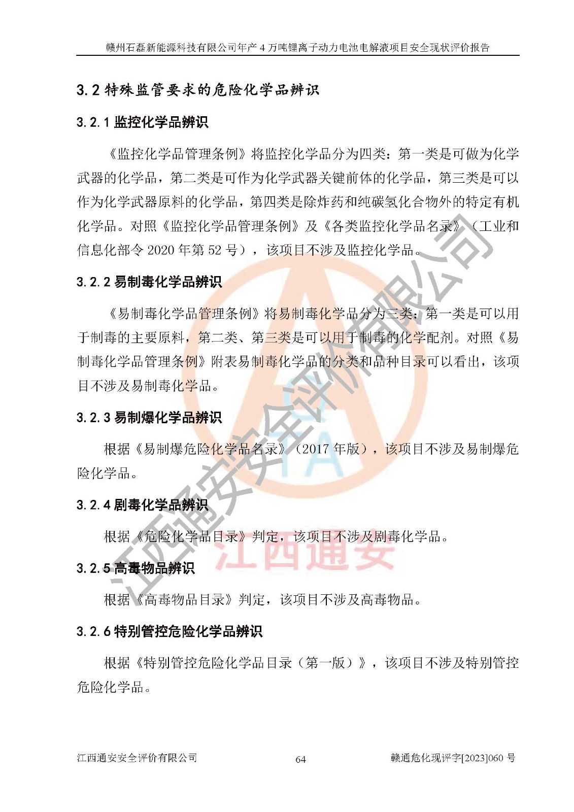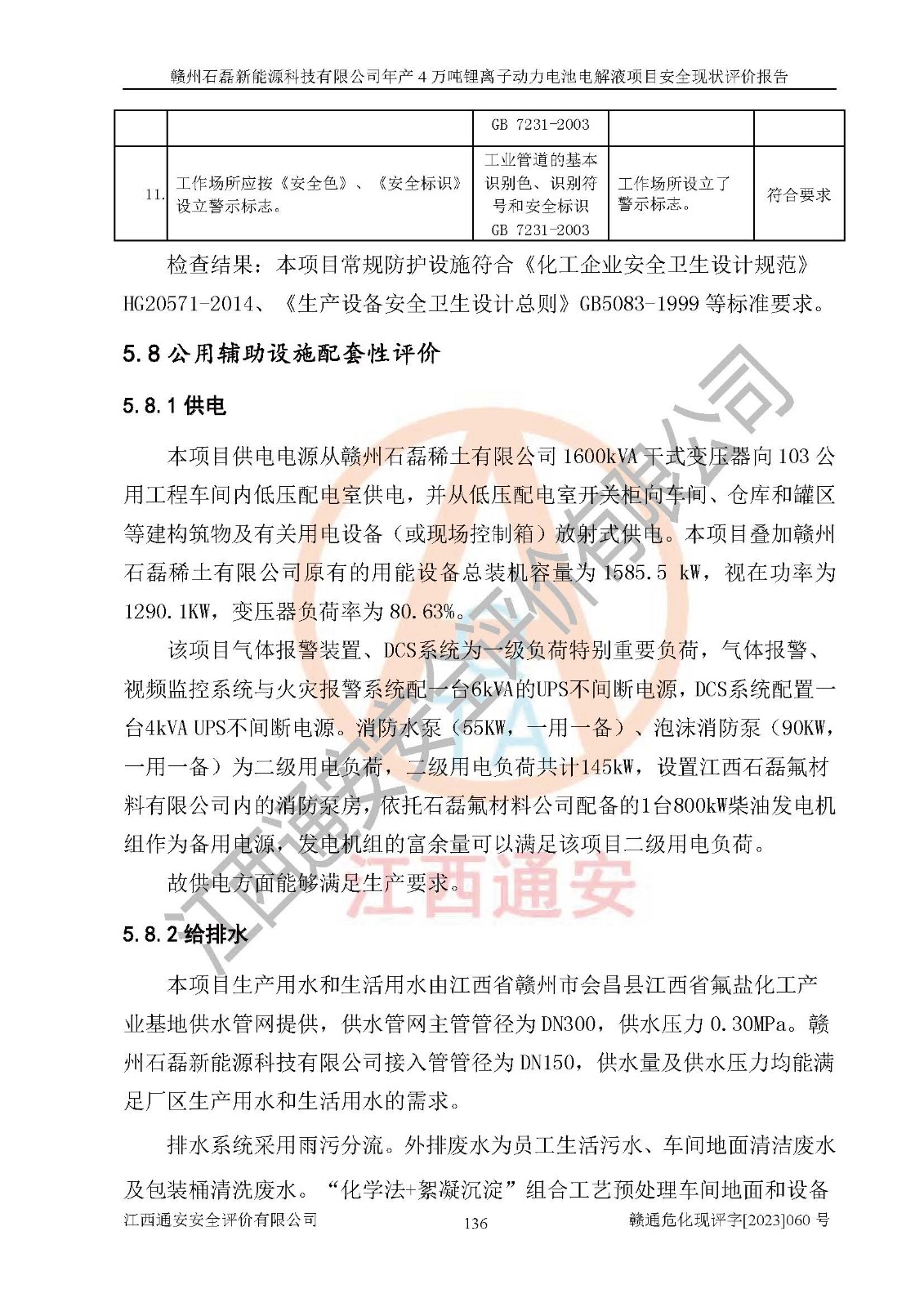 一、安全狀況綜合評(píng)述 1、該項(xiàng)目涉及的原輔材料中碳酸二乙酯、碳酸二甲酯、碳酸甲乙酯、丙酸乙酯、氟苯、丁二腈、己二腈、氮?dú)狻⒙?lián)苯及R22屬于危險(xiǎn)化學(xué)品,產(chǎn)品鋰離子電解液屬于危險(xiǎn)化學(xué)品。 2、該項(xiàng)目生產(chǎn)過(guò)程中存在的危險(xiǎn)、有害因素有:火災(zāi)與爆炸、觸電、中毒與窒息、灼燙、機(jī)械傷害、**傷害、高處墜落、物體打擊和其他傷害等危險(xiǎn)有害因素,其中*主要的危險(xiǎn)有害因素是火災(zāi)與爆炸、中毒與窒息。 3、該項(xiàng)目不涉及監(jiān)控化學(xué)品、易制毒化學(xué)品、易制爆危險(xiǎn)化學(xué)品、劇毒化學(xué)品、重點(diǎn)監(jiān)管危險(xiǎn)化學(xué)品和特別管控的危險(xiǎn)化學(xué)品。 4、該項(xiàng)目不涉及重點(diǎn)監(jiān)管的危險(xiǎn)化工工藝。 5、按照《危險(xiǎn)化學(xué)品重大危險(xiǎn)源辨識(shí)》(GB18218-2018)進(jìn)行辨識(shí),該項(xiàng)目生產(chǎn)單元和儲(chǔ)存單元均不構(gòu)成危險(xiǎn)化學(xué)品重大危險(xiǎn)源。 二、定量評(píng)價(jià)結(jié)果 1、作業(yè)條件危險(xiǎn)性評(píng)價(jià)結(jié)果:在選定的9個(gè)評(píng)價(jià)單元的作業(yè)危險(xiǎn)程度為“一般危險(xiǎn),需要注意”或以下,作業(yè)條件相對(duì)安全。 2、危險(xiǎn)度評(píng)價(jià)結(jié)果:101甲類車間、202甲類倉(cāng)庫(kù)、貯罐區(qū)的危險(xiǎn)程度均為**危險(xiǎn),甲類車間、甲類倉(cāng)庫(kù)和甲類貯罐區(qū)內(nèi)均設(shè)置了可燃?xì)怏w檢測(cè)報(bào)警裝置,并定期進(jìn)行校驗(yàn)**其正常工作。廠內(nèi)建構(gòu)筑物按設(shè)計(jì)要求設(shè)置了防雷防靜電接地裝置,并定期檢驗(yàn);爆炸危險(xiǎn)區(qū)域內(nèi)的電氣設(shè)備采用防爆電機(jī),消防設(shè)施通過(guò)了消防驗(yàn)收,車間生產(chǎn)裝置和儲(chǔ)罐采用密閉化、機(jī)械化和自動(dòng)化,設(shè)備本質(zhì)安全度高,并且應(yīng)在各作業(yè)場(chǎng)所為作業(yè)人員配置了勞動(dòng)保護(hù)用品和器具,作業(yè)人員經(jīng)過(guò)廠內(nèi)三級(jí)安全培訓(xùn),考核合格上崗。項(xiàng)目的安全設(shè)施和安全管理符合安全生產(chǎn)條件,能**降低火災(zāi)爆炸事故發(fā)生的可能性,使風(fēng)險(xiǎn)降低到可接受范圍內(nèi)。 3、個(gè)人風(fēng)險(xiǎn)和社會(huì)風(fēng)險(xiǎn)分析結(jié)果:根據(jù)個(gè)人風(fēng)險(xiǎn)分析效果圖,該項(xiàng)目不涉及高敏感防護(hù)目標(biāo)、重要防護(hù)目標(biāo)、一般防護(hù)目標(biāo)中的一類防護(hù)目標(biāo)(≤3×10-6)等值線、二類防護(hù)目標(biāo)(≤1×10-5)等值線和三類防護(hù)目標(biāo)(≤3×10-5)等值線,個(gè)人風(fēng)險(xiǎn)符合要求;根據(jù)社會(huì)風(fēng)險(xiǎn)分析效果圖可知,該項(xiàng)目社會(huì)風(fēng)險(xiǎn)在可接受范圍內(nèi)。 4、可能發(fā)生的危險(xiǎn)化學(xué)品事故的預(yù)測(cè)后果:該項(xiàng)目貯罐區(qū)和101生產(chǎn)車間災(zāi)害模式為池火,泄漏模式為容器中孔泄漏或容器整體破裂,事故預(yù)測(cè)后果*大的儲(chǔ)罐為碳酸二甲酯儲(chǔ)罐,發(fā)生事故的*大死亡半徑為9m;*大重傷半徑13m,*大輕傷半徑為19m。本項(xiàng)目液氮罐西北側(cè)設(shè)有一臺(tái)50m3液氮罐,液氮罐發(fā)生物理爆炸的*大死亡半徑為18m;*大重傷半徑32m,*大輕傷半徑為54m,多米諾半徑為25m。 5、多米諾效應(yīng)分析:該項(xiàng)目貯罐區(qū)和101車間災(zāi)害模式為池火,無(wú)多米諾半徑。液氮罐發(fā)生物理爆炸的多米諾半徑為25m,多米諾影響區(qū)局限在廠內(nèi)。201罐區(qū)有部分儲(chǔ)罐在多米諾影響區(qū)內(nèi),如液氮罐發(fā)生物理爆炸,會(huì)引發(fā)多米諾效應(yīng),導(dǎo)致罐區(qū)儲(chǔ)罐破裂,可燃液體泄漏發(fā)生池火災(zāi)的可能。因此應(yīng)重點(diǎn)關(guān)注液氮儲(chǔ)罐、201貯罐區(qū)等關(guān)鍵裝置安全設(shè)施的完整和**性,**運(yùn)行良好。 三、定性評(píng)價(jià)結(jié)果 1、依據(jù)相關(guān)法律、法規(guī)、標(biāo)準(zhǔn)等的規(guī)定,該項(xiàng)目外部安全條件、總平面布置、工藝及設(shè)備、防火防爆安全設(shè)施等符合**相關(guān)標(biāo)準(zhǔn)規(guī)范的要求,能滿足安全生產(chǎn)的要求。 2、該項(xiàng)目公用輔助設(shè)施能夠滿足安全生產(chǎn)的要求。 3、該項(xiàng)目按要求設(shè)置了安全生產(chǎn)管理機(jī)構(gòu),配備了專職安全生產(chǎn)管理人員,建立了安全生產(chǎn)責(zé)任制,制定了安全管理制度和崗位安全操作規(guī)程等。該公司修訂了生產(chǎn)安全事故應(yīng)急預(yù)案,配備了應(yīng)急救援器材,按要求定期進(jìn)行相關(guān)培訓(xùn)及演練。 4、該項(xiàng)目不涉及“兩重點(diǎn)一重大”,公司主要負(fù)責(zé)人、安全管理人員經(jīng)培訓(xùn)考核取得了相應(yīng)的安全資格證書。主要負(fù)責(zé)人的專業(yè)和學(xué)歷符合要求,公司任命了許惠彬和王佛金為專職安全管理人員,許惠彬的學(xué)歷和專業(yè)均符合要求,王佛金于2021年9月報(bào)名參加了大專應(yīng)用化工技術(shù)專業(yè)學(xué)歷提升,預(yù)計(jì)2024年1月畢業(yè),屆時(shí)可滿足危險(xiǎn)化學(xué)品企業(yè)重點(diǎn)人員安