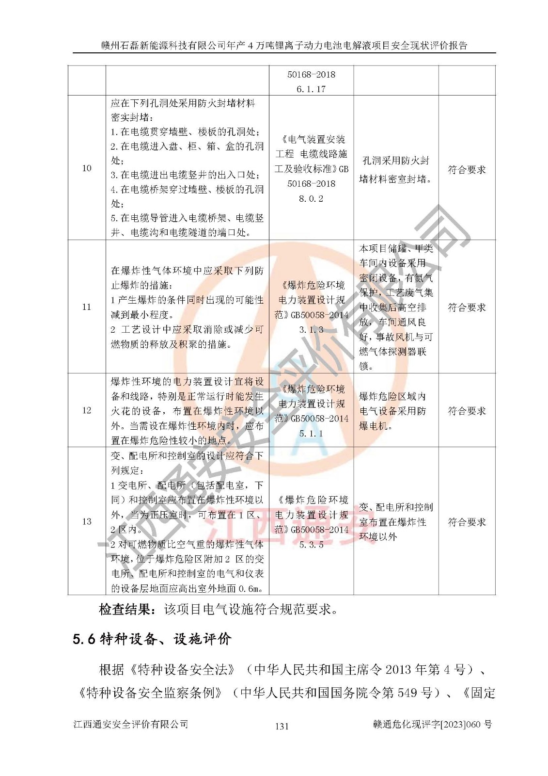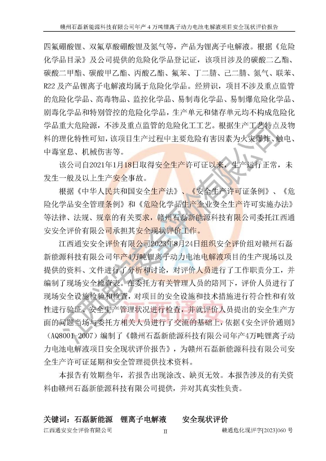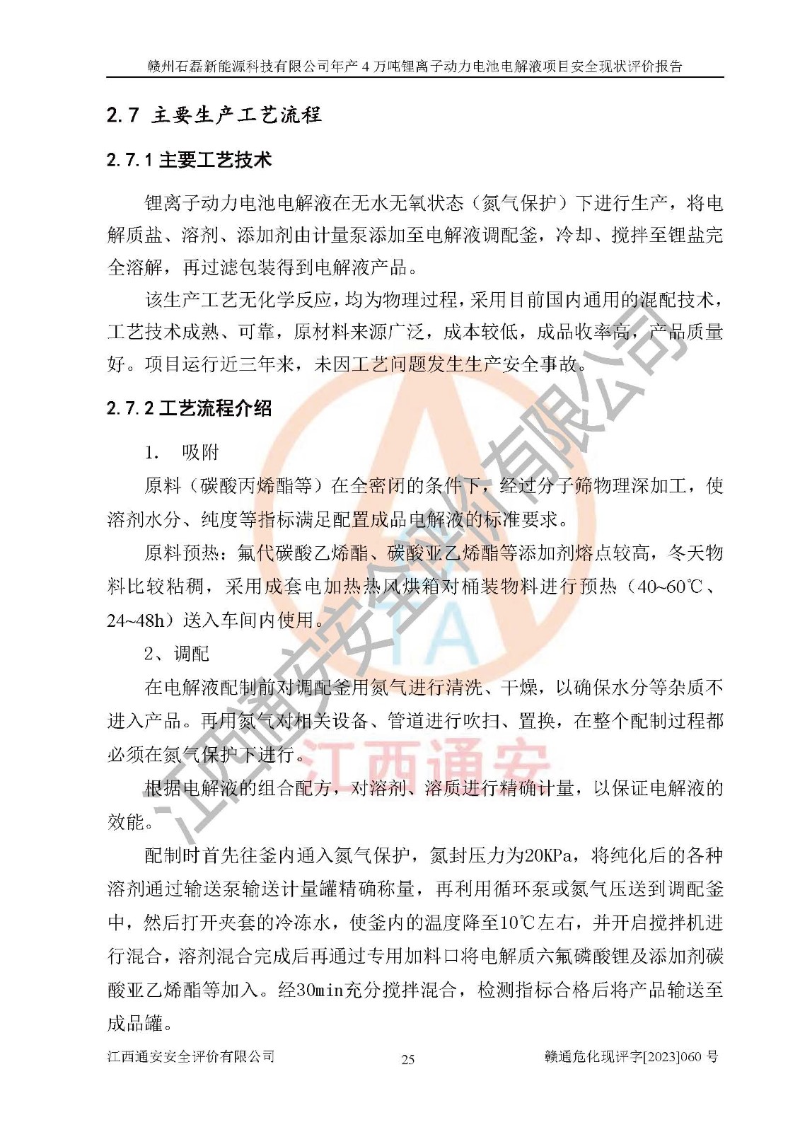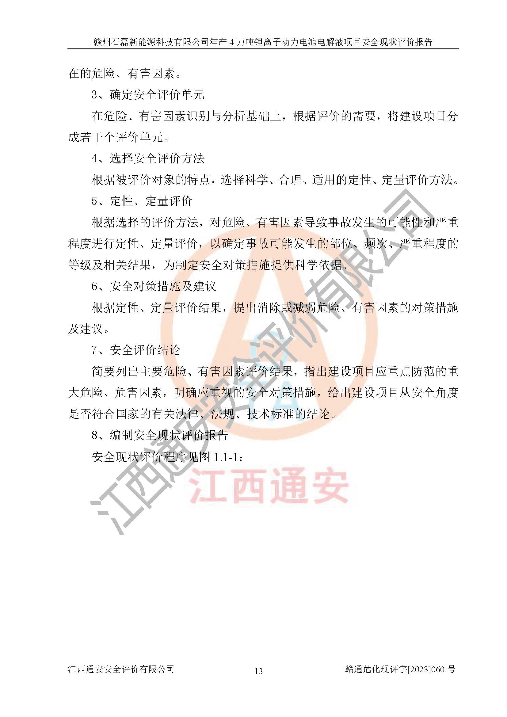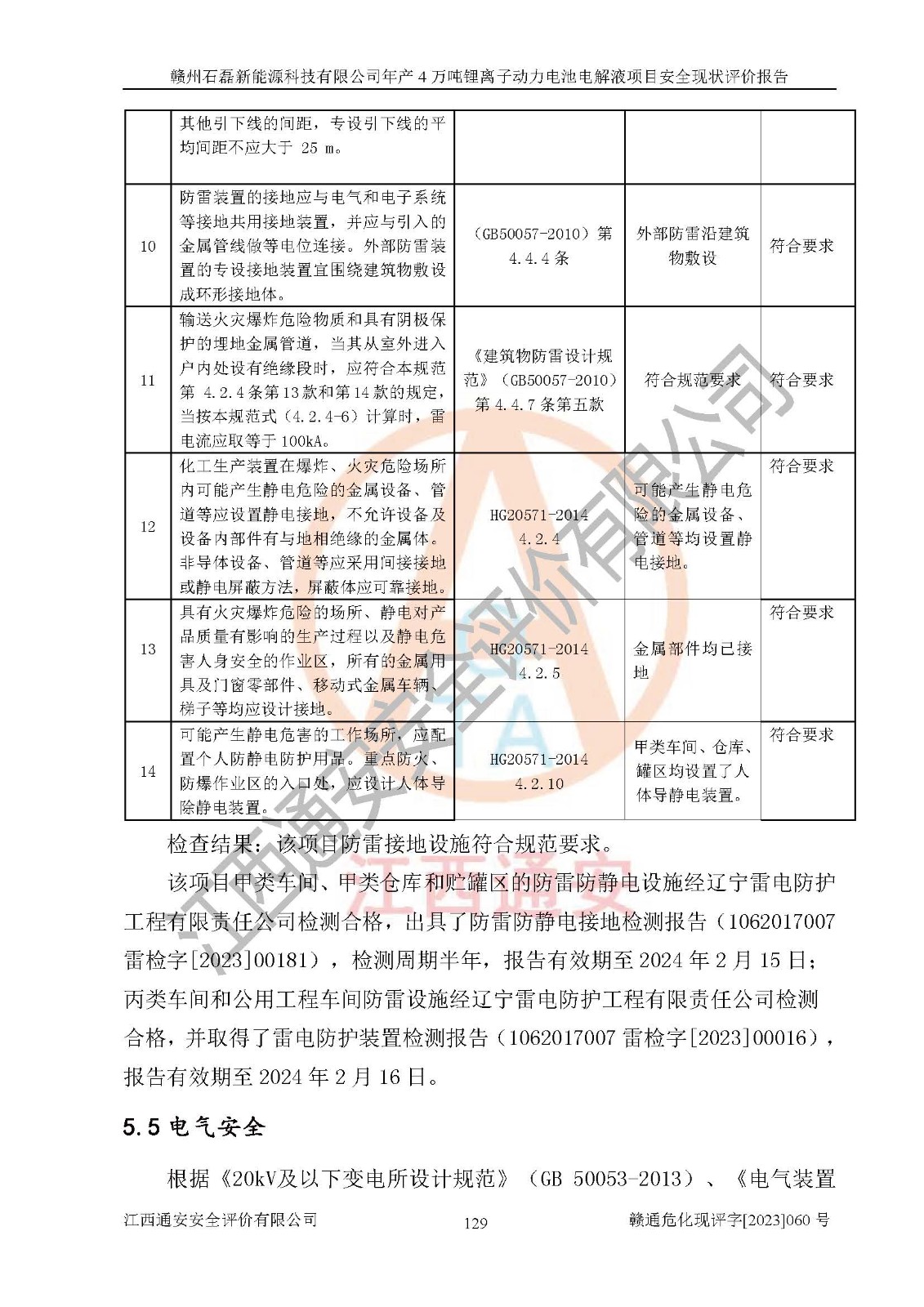 一、安全狀況綜合評(píng)述 1、該項(xiàng)目涉及的原輔材料中碳酸二乙酯、碳酸二甲酯、碳酸甲乙酯、丙酸乙酯、氟苯、丁二腈、己二腈、氮?dú)狻⒙?lián)苯及R22屬于危險(xiǎn)化學(xué)品,產(chǎn)品鋰離子電解液屬于危險(xiǎn)化學(xué)品。 2、該項(xiàng)目生產(chǎn)過(guò)程中存在的危險(xiǎn)、有害因素有:火災(zāi)與爆炸、觸電、中毒與窒息、灼燙、機(jī)械傷害、**傷害、高處墜落、物體打擊和其他傷害等危險(xiǎn)有害因素,其中*主要的危險(xiǎn)有害因素是火災(zāi)與爆炸、中毒與窒息。 3、該項(xiàng)目不涉及監(jiān)控化學(xué)品、易制毒化學(xué)品、易制爆危險(xiǎn)化學(xué)品、劇毒化學(xué)品、重點(diǎn)監(jiān)管危險(xiǎn)化學(xué)品和特別管控的危險(xiǎn)化學(xué)品。 4、該項(xiàng)目不涉及重點(diǎn)監(jiān)管的危險(xiǎn)化工工藝。 5、按照《危險(xiǎn)化學(xué)品重大危險(xiǎn)源辨識(shí)》(GB18218-2018)進(jìn)行辨識(shí),該項(xiàng)目生產(chǎn)單元和儲(chǔ)存單元均不構(gòu)成危險(xiǎn)化學(xué)品重大危險(xiǎn)源。 二、定量評(píng)價(jià)結(jié)果 1、作業(yè)條件危險(xiǎn)性評(píng)價(jià)結(jié)果:在選定的9個(gè)評(píng)價(jià)單元的作業(yè)危險(xiǎn)程度為“一般危險(xiǎn),需要注意”或以下,作業(yè)條件相對(duì)安全。 2、危險(xiǎn)度評(píng)價(jià)結(jié)果:101甲類車間、202甲類倉(cāng)庫(kù)、貯罐區(qū)的危險(xiǎn)程度均為**危險(xiǎn),甲類車間、甲類倉(cāng)庫(kù)和甲類貯罐區(qū)內(nèi)均設(shè)置了可燃?xì)怏w檢測(cè)報(bào)警裝置,并定期進(jìn)行校驗(yàn)**其正常工作。廠內(nèi)建構(gòu)筑物按設(shè)計(jì)要求設(shè)置了防雷防靜電接地裝置,并定期檢驗(yàn);爆炸危險(xiǎn)區(qū)域內(nèi)的電氣設(shè)備采用防爆電機(jī),消防設(shè)施通過(guò)了消防驗(yàn)收,車間生產(chǎn)裝置和儲(chǔ)罐采用密閉化、機(jī)械化和自動(dòng)化,設(shè)備本質(zhì)安全度高,并且應(yīng)在各作業(yè)場(chǎng)所為作業(yè)人員配置了勞動(dòng)保護(hù)用品和器具,作業(yè)人員經(jīng)過(guò)廠內(nèi)三級(jí)安全培訓(xùn),考核合格上崗。項(xiàng)目的安全設(shè)施和安全管理符合安全生產(chǎn)條件,能**降低火災(zāi)爆炸事故發(fā)生的可能性,使風(fēng)險(xiǎn)降低到可接受范圍內(nèi)。 3、個(gè)人風(fēng)險(xiǎn)和社會(huì)風(fēng)險(xiǎn)分析結(jié)果:根據(jù)個(gè)人風(fēng)險(xiǎn)分析效果圖,該項(xiàng)目不涉及高敏感防護(hù)目標(biāo)、重要防護(hù)目標(biāo)、一般防護(hù)目標(biāo)中的一類防護(hù)目標(biāo)(≤3×10-6)等值線、二類防護(hù)目標(biāo)(≤1×10-5)等值線和三類防護(hù)目標(biāo)(≤3×10-5)等值線,個(gè)人風(fēng)險(xiǎn)符合要求;根據(jù)社會(huì)風(fēng)險(xiǎn)分析效果圖可知,該項(xiàng)目社會(huì)風(fēng)險(xiǎn)在可接受范圍內(nèi)。 4、可能發(fā)生的危險(xiǎn)化學(xué)品事故的預(yù)測(cè)后果:該項(xiàng)目貯罐區(qū)和101生產(chǎn)車間災(zāi)害模式為池火,泄漏模式為容器中孔泄漏或容器整體破裂,事故預(yù)測(cè)后果*大的儲(chǔ)罐為碳酸二甲酯儲(chǔ)罐,發(fā)生事故的*大死亡半徑為9m;*大重傷半徑13m,*大輕傷半徑為19m。本項(xiàng)目液氮罐西北側(cè)設(shè)有一臺(tái)50m3液氮罐,液氮罐發(fā)生物理爆炸的*大死亡半徑為18m;*大重傷半徑32m,*大輕傷半徑為54m,多米諾半徑為25m。 5、多米諾效應(yīng)分析:該項(xiàng)目貯罐區(qū)和101車間災(zāi)害模式為池火,無(wú)多米諾半徑。液氮罐發(fā)生物理爆炸的多米諾半徑為25m,多米諾影響區(qū)局限在廠內(nèi)。201罐區(qū)有部分儲(chǔ)罐在多米諾影響區(qū)內(nèi),如液氮罐發(fā)生物理爆炸,會(huì)引發(fā)多米諾效應(yīng),導(dǎo)致罐區(qū)儲(chǔ)罐破裂,可燃液體泄漏發(fā)生池火災(zāi)的可能。因此應(yīng)重點(diǎn)關(guān)注液氮儲(chǔ)罐、201貯罐區(qū)等關(guān)鍵裝置安全設(shè)施的完整和**性,**運(yùn)行良好。 三、定性評(píng)價(jià)結(jié)果 1、依據(jù)相關(guān)法律、法規(guī)、標(biāo)準(zhǔn)等的規(guī)定,該項(xiàng)目外部安全條件、總平面布置、工藝及設(shè)備、防火防爆安全設(shè)施等符合**相關(guān)標(biāo)準(zhǔn)規(guī)范的要求,能滿足安全生產(chǎn)的要求。 2、該項(xiàng)目公用輔助設(shè)施能夠滿足安全生產(chǎn)的要求。 3、該項(xiàng)目按要求設(shè)置了安全生產(chǎn)管理機(jī)構(gòu),配備了專職安全生產(chǎn)管理人員,建立了安全生產(chǎn)責(zé)任制,制定了安全管理制度和崗位安全操作規(guī)程等。該公司修訂了生產(chǎn)安全事故應(yīng)急預(yù)案,配備了應(yīng)急救援器材,按要求定期進(jìn)行相關(guān)培訓(xùn)及演練。 4、該項(xiàng)目不涉及“兩重點(diǎn)一重大”,公司主要負(fù)責(zé)人、安全管理人員經(jīng)培訓(xùn)考核取得了相應(yīng)的安全資格證書。主要負(fù)責(zé)人的專業(yè)和學(xué)歷符合要求,公司任命了許惠彬和王佛金為專職安全管理人員,許惠彬的學(xué)歷和專業(yè)均符合要求,王佛金于2021年9月報(bào)名參加了大專應(yīng)用化工技術(shù)專業(yè)學(xué)歷提升,預(yù)計(jì)2024年1月畢業(yè),屆時(shí)可滿足危險(xiǎn)化學(xué)品企業(yè)重點(diǎn)人員安