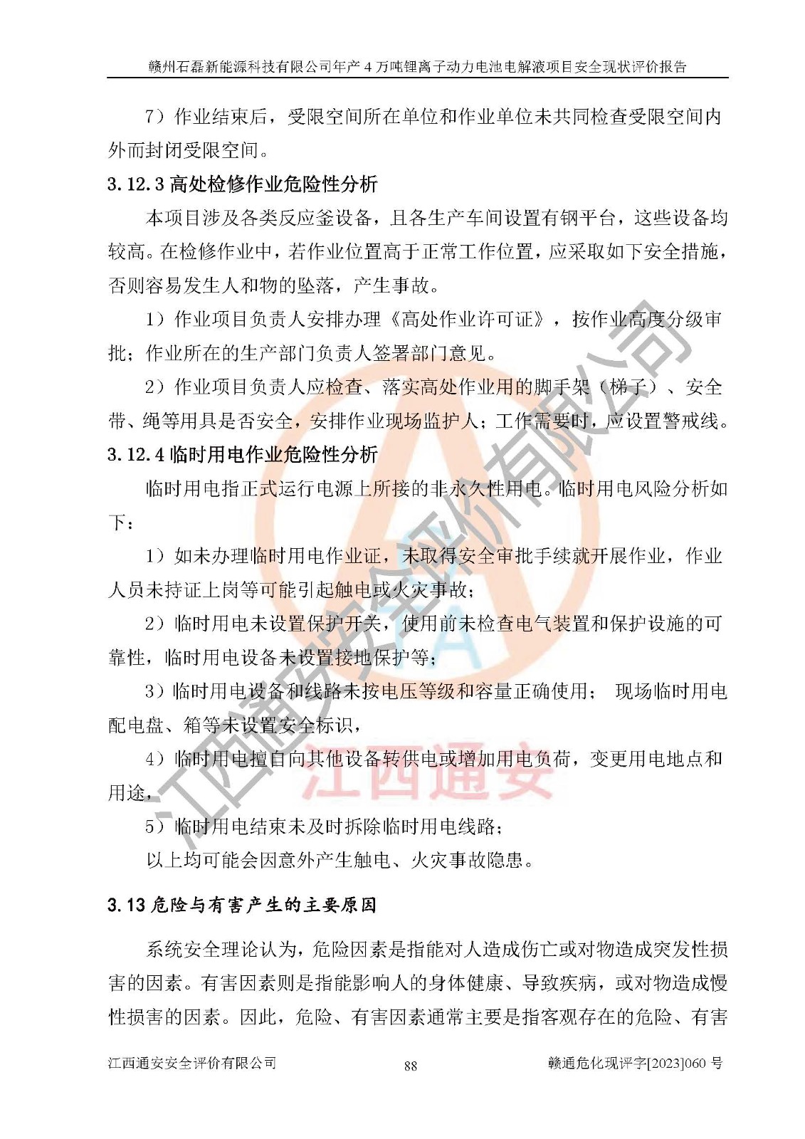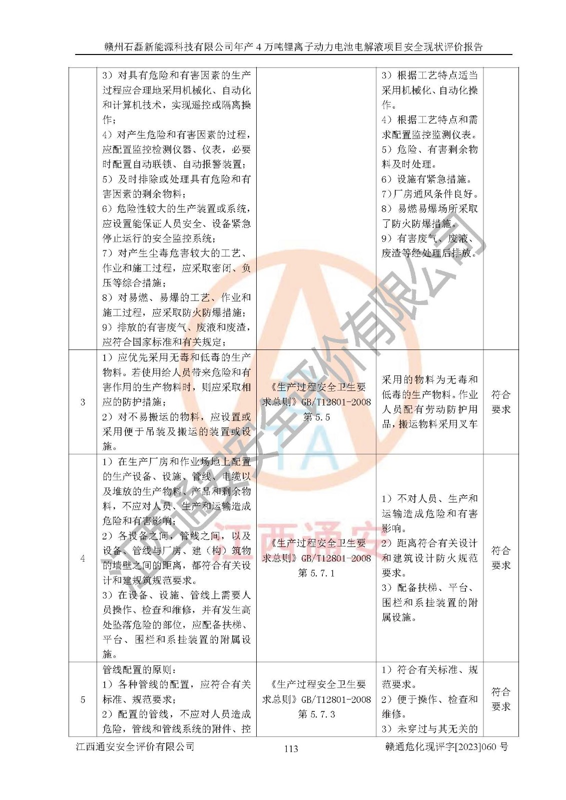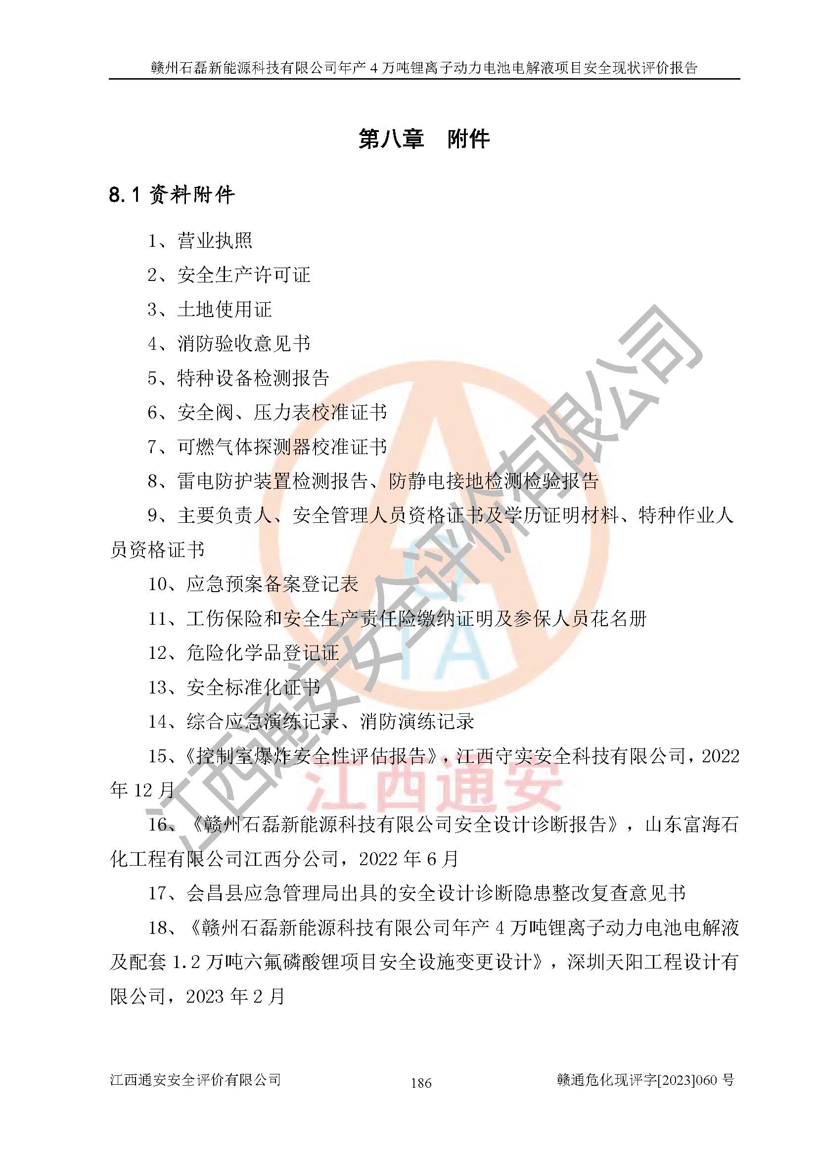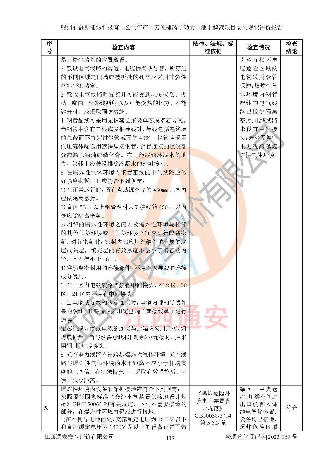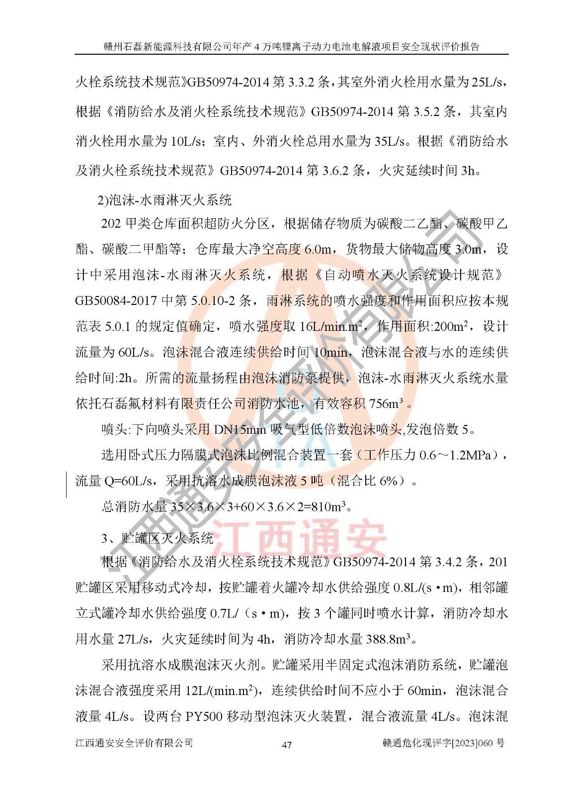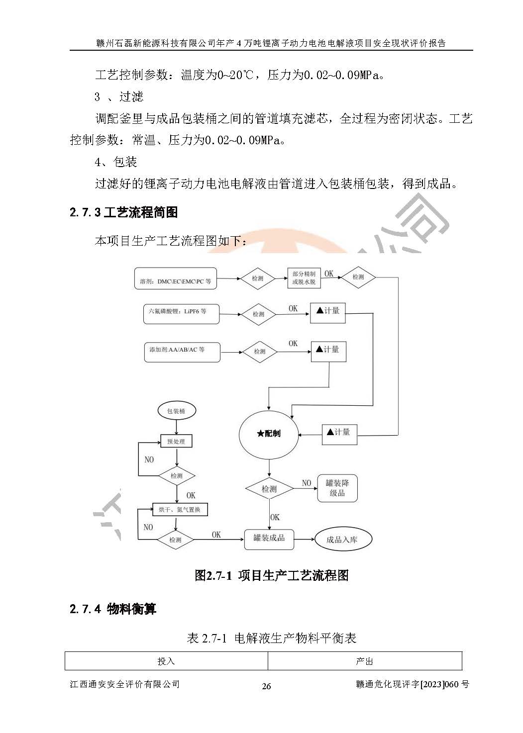 一、安全狀況綜合評(píng)述 1、該項(xiàng)目涉及的原輔材料中碳酸二乙酯、碳酸二甲酯、碳酸甲乙酯、丙酸乙酯、氟苯、丁二腈、己二腈、氮?dú)狻⒙?lián)苯及R22屬于危險(xiǎn)化學(xué)品,產(chǎn)品鋰離子電解液屬于危險(xiǎn)化學(xué)品。 2、該項(xiàng)目生產(chǎn)過(guò)程中存在的危險(xiǎn)、有害因素有:火災(zāi)與爆炸、觸電、中毒與窒息、灼燙、機(jī)械傷害、**傷害、高處墜落、物體打擊和其他傷害等危險(xiǎn)有害因素,其中*主要的危險(xiǎn)有害因素是火災(zāi)與爆炸、中毒與窒息。 3、該項(xiàng)目不涉及監(jiān)控化學(xué)品、易制毒化學(xué)品、易制爆危險(xiǎn)化學(xué)品、劇毒化學(xué)品、重點(diǎn)監(jiān)管危險(xiǎn)化學(xué)品和特別管控的危險(xiǎn)化學(xué)品。 4、該項(xiàng)目不涉及重點(diǎn)監(jiān)管的危險(xiǎn)化工工藝。 5、按照《危險(xiǎn)化學(xué)品重大危險(xiǎn)源辨識(shí)》(GB18218-2018)進(jìn)行辨識(shí),該項(xiàng)目生產(chǎn)單元和儲(chǔ)存單元均不構(gòu)成危險(xiǎn)化學(xué)品重大危險(xiǎn)源。 二、定量評(píng)價(jià)結(jié)果 1、作業(yè)條件危險(xiǎn)性評(píng)價(jià)結(jié)果:在選定的9個(gè)評(píng)價(jià)單元的作業(yè)危險(xiǎn)程度為“一般危險(xiǎn),需要注意”或以下,作業(yè)條件相對(duì)安全。 2、危險(xiǎn)度評(píng)價(jià)結(jié)果:101甲類車間、202甲類倉(cāng)庫(kù)、貯罐區(qū)的危險(xiǎn)程度均為**危險(xiǎn),甲類車間、甲類倉(cāng)庫(kù)和甲類貯罐區(qū)內(nèi)均設(shè)置了可燃?xì)怏w檢測(cè)報(bào)警裝置,并定期進(jìn)行校驗(yàn)**其正常工作。廠內(nèi)建構(gòu)筑物按設(shè)計(jì)要求設(shè)置了防雷防靜電接地裝置,并定期檢驗(yàn);爆炸危險(xiǎn)區(qū)域內(nèi)的電氣設(shè)備采用防爆電機(jī),消防設(shè)施通過(guò)了消防驗(yàn)收,車間生產(chǎn)裝置和儲(chǔ)罐采用密閉化、機(jī)械化和自動(dòng)化,設(shè)備本質(zhì)安全度高,并且應(yīng)在各作業(yè)場(chǎng)所為作業(yè)人員配置了勞動(dòng)保護(hù)用品和器具,作業(yè)人員經(jīng)過(guò)廠內(nèi)三級(jí)安全培訓(xùn),考核合格上崗。項(xiàng)目的安全設(shè)施和安全管理符合安全生產(chǎn)條件,能**降低火災(zāi)爆炸事故發(fā)生的可能性,使風(fēng)險(xiǎn)降低到可接受范圍內(nèi)。 3、個(gè)人風(fēng)險(xiǎn)和社會(huì)風(fēng)險(xiǎn)分析結(jié)果:根據(jù)個(gè)人風(fēng)險(xiǎn)分析效果圖,該項(xiàng)目不涉及高敏感防護(hù)目標(biāo)、重要防護(hù)目標(biāo)、一般防護(hù)目標(biāo)中的一類防護(hù)目標(biāo)(≤3×10-6)等值線、二類防護(hù)目標(biāo)(≤1×10-5)等值線和三類防護(hù)目標(biāo)(≤3×10-5)等值線,個(gè)人風(fēng)險(xiǎn)符合要求;根據(jù)社會(huì)風(fēng)險(xiǎn)分析效果圖可知,該項(xiàng)目社會(huì)風(fēng)險(xiǎn)在可接受范圍內(nèi)。 4、可能發(fā)生的危險(xiǎn)化學(xué)品事故的預(yù)測(cè)后果:該項(xiàng)目貯罐區(qū)和101生產(chǎn)車間災(zāi)害模式為池火,泄漏模式為容器中孔泄漏或容器整體破裂,事故預(yù)測(cè)后果*大的儲(chǔ)罐為碳酸二甲酯儲(chǔ)罐,發(fā)生事故的*大死亡半徑為9m;*大重傷半徑13m,*大輕傷半徑為19m。本項(xiàng)目液氮罐西北側(cè)設(shè)有一臺(tái)50m3液氮罐,液氮罐發(fā)生物理爆炸的*大死亡半徑為18m;*大重傷半徑32m,*大輕傷半徑為54m,多米諾半徑為25m。 5、多米諾效應(yīng)分析:該項(xiàng)目貯罐區(qū)和101車間災(zāi)害模式為池火,無(wú)多米諾半徑。液氮罐發(fā)生物理爆炸的多米諾半徑為25m,多米諾影響區(qū)局限在廠內(nèi)。201罐區(qū)有部分儲(chǔ)罐在多米諾影響區(qū)內(nèi),如液氮罐發(fā)生物理爆炸,會(huì)引發(fā)多米諾效應(yīng),導(dǎo)致罐區(qū)儲(chǔ)罐破裂,可燃液體泄漏發(fā)生池火災(zāi)的可能。因此應(yīng)重點(diǎn)關(guān)注液氮儲(chǔ)罐、201貯罐區(qū)等關(guān)鍵裝置安全設(shè)施的完整和**性,**運(yùn)行良好。 三、定性評(píng)價(jià)結(jié)果 1、依據(jù)相關(guān)法律、法規(guī)、標(biāo)準(zhǔn)等的規(guī)定,該項(xiàng)目外部安全條件、總平面布置、工藝及設(shè)備、防火防爆安全設(shè)施等符合**相關(guān)標(biāo)準(zhǔn)規(guī)范的要求,能滿足安全生產(chǎn)的要求。 2、該項(xiàng)目公用輔助設(shè)施能夠滿足安全生產(chǎn)的要求。 3、該項(xiàng)目按要求設(shè)置了安全生產(chǎn)管理機(jī)構(gòu),配備了專職安全生產(chǎn)管理人員,建立了安全生產(chǎn)責(zé)任制,制定了安全管理制度和崗位安全操作規(guī)程等。該公司修訂了生產(chǎn)安全事故應(yīng)急預(yù)案,配備了應(yīng)急救援器材,按要求定期進(jìn)行相關(guān)培訓(xùn)及演練。 4、該項(xiàng)目不涉及“兩重點(diǎn)一重大”,公司主要負(fù)責(zé)人、安全管理人員經(jīng)培訓(xùn)考核取得了相應(yīng)的安全資格證書。主要負(fù)責(zé)人的專業(yè)和學(xué)歷符合要求,公司任命了許惠彬和王佛金為專職安全管理人員,許惠彬的學(xué)歷和專業(yè)均符合要求,王佛金于2021年9月報(bào)名參加了大專應(yīng)用化工技術(shù)專業(yè)學(xué)歷提升,預(yù)計(jì)2024年1月畢業(yè),屆時(shí)可滿足危險(xiǎn)化學(xué)品企業(yè)重點(diǎn)人員安
