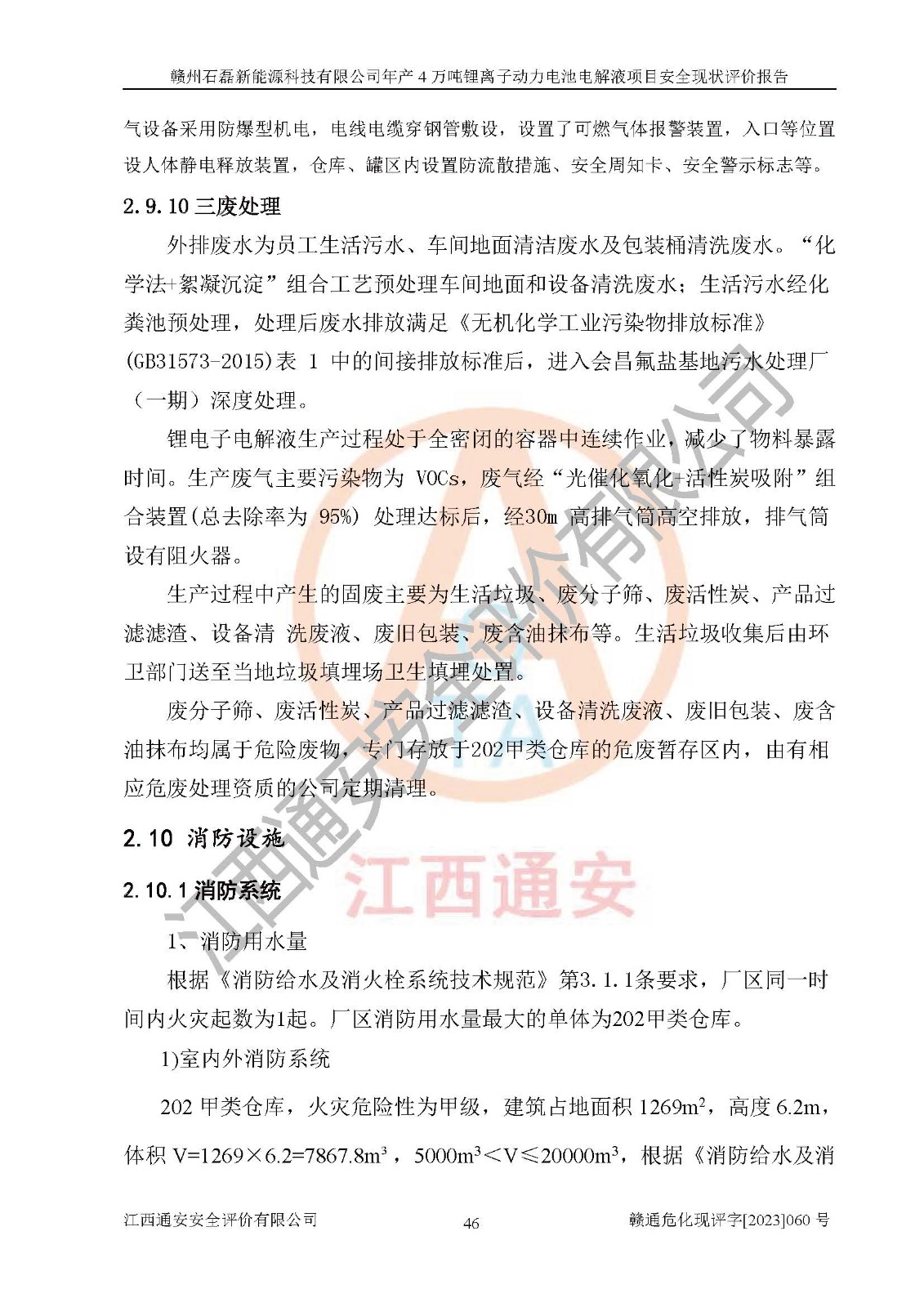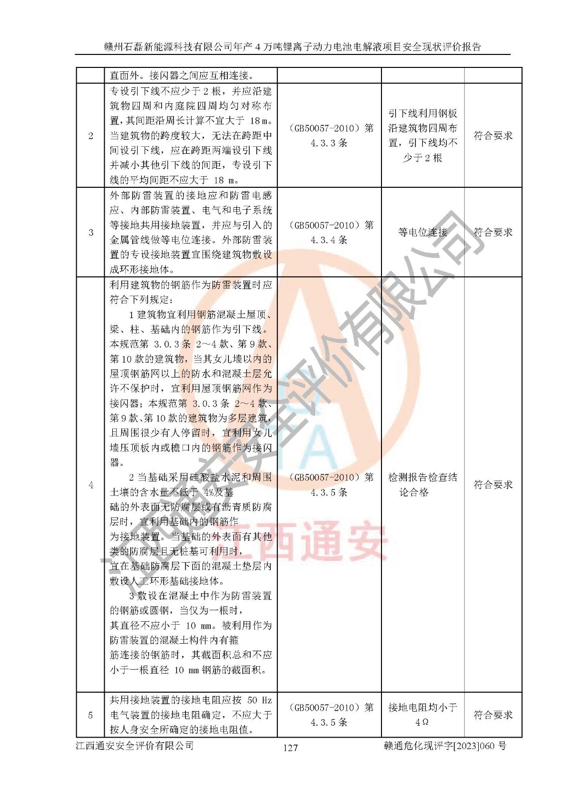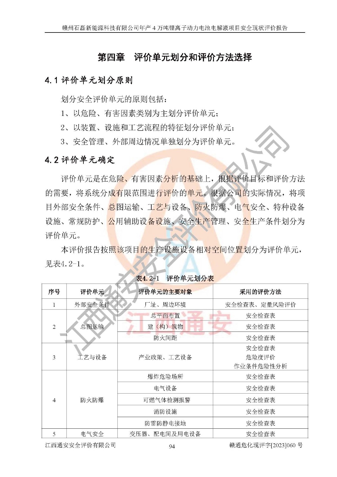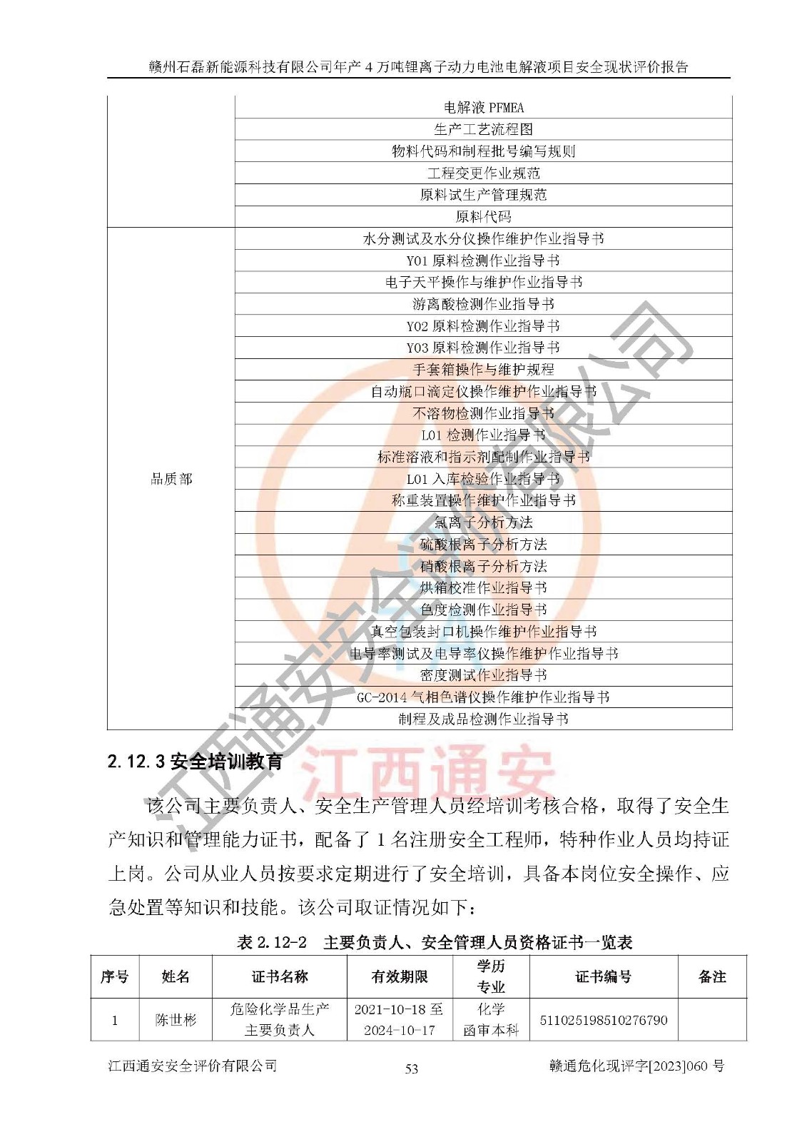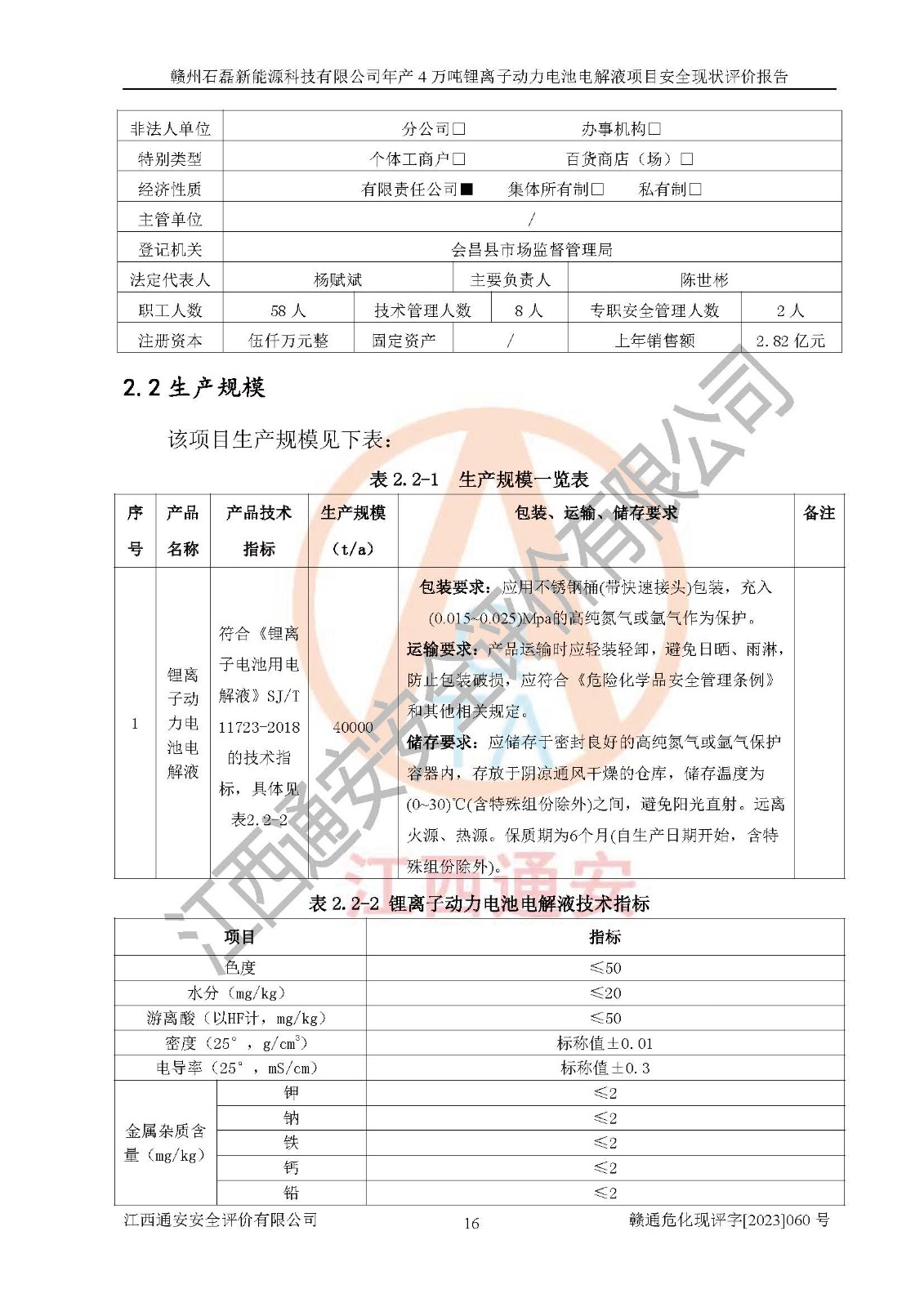 一、安全狀況綜合評(píng)述 1、該項(xiàng)目涉及的原輔材料中碳酸二乙酯、碳酸二甲酯、碳酸甲乙酯、丙酸乙酯、氟苯、丁二腈、己二腈、氮?dú)狻⒙?lián)苯及R22屬于危險(xiǎn)化學(xué)品,產(chǎn)品鋰離子電解液屬于危險(xiǎn)化學(xué)品。 2、該項(xiàng)目生產(chǎn)過(guò)程中存在的危險(xiǎn)、有害因素有:火災(zāi)與爆炸、觸電、中毒與窒息、灼燙、機(jī)械傷害、**傷害、高處墜落、物體打擊和其他傷害等危險(xiǎn)有害因素,其中*主要的危險(xiǎn)有害因素是火災(zāi)與爆炸、中毒與窒息。 3、該項(xiàng)目不涉及監(jiān)控化學(xué)品、易制毒化學(xué)品、易制爆危險(xiǎn)化學(xué)品、劇毒化學(xué)品、重點(diǎn)監(jiān)管危險(xiǎn)化學(xué)品和特別管控的危險(xiǎn)化學(xué)品。 4、該項(xiàng)目不涉及重點(diǎn)監(jiān)管的危險(xiǎn)化工工藝。 5、按照《危險(xiǎn)化學(xué)品重大危險(xiǎn)源辨識(shí)》(GB18218-2018)進(jìn)行辨識(shí),該項(xiàng)目生產(chǎn)單元和儲(chǔ)存單元均不構(gòu)成危險(xiǎn)化學(xué)品重大危險(xiǎn)源。 二、定量評(píng)價(jià)結(jié)果 1、作業(yè)條件危險(xiǎn)性評(píng)價(jià)結(jié)果:在選定的9個(gè)評(píng)價(jià)單元的作業(yè)危險(xiǎn)程度為“一般危險(xiǎn),需要注意”或以下,作業(yè)條件相對(duì)安全。 2、危險(xiǎn)度評(píng)價(jià)結(jié)果:101甲類車間、202甲類倉(cāng)庫(kù)、貯罐區(qū)的危險(xiǎn)程度均為**危險(xiǎn),甲類車間、甲類倉(cāng)庫(kù)和甲類貯罐區(qū)內(nèi)均設(shè)置了可燃?xì)怏w檢測(cè)報(bào)警裝置,并定期進(jìn)行校驗(yàn)**其正常工作。廠內(nèi)建構(gòu)筑物按設(shè)計(jì)要求設(shè)置了防雷防靜電接地裝置,并定期檢驗(yàn);爆炸危險(xiǎn)區(qū)域內(nèi)的電氣設(shè)備采用防爆電機(jī),消防設(shè)施通過(guò)了消防驗(yàn)收,車間生產(chǎn)裝置和儲(chǔ)罐采用密閉化、機(jī)械化和自動(dòng)化,設(shè)備本質(zhì)安全度高,并且應(yīng)在各作業(yè)場(chǎng)所為作業(yè)人員配置了勞動(dòng)保護(hù)用品和器具,作業(yè)人員經(jīng)過(guò)廠內(nèi)三級(jí)安全培訓(xùn),考核合格上崗。項(xiàng)目的安全設(shè)施和安全管理符合安全生產(chǎn)條件,能**降低火災(zāi)爆炸事故發(fā)生的可能性,使風(fēng)險(xiǎn)降低到可接受范圍內(nèi)。 3、個(gè)人風(fēng)險(xiǎn)和社會(huì)風(fēng)險(xiǎn)分析結(jié)果:根據(jù)個(gè)人風(fēng)險(xiǎn)分析效果圖,該項(xiàng)目不涉及高敏感防護(hù)目標(biāo)、重要防護(hù)目標(biāo)、一般防護(hù)目標(biāo)中的一類防護(hù)目標(biāo)(≤3×10-6)等值線、二類防護(hù)目標(biāo)(≤1×10-5)等值線和三類防護(hù)目標(biāo)(≤3×10-5)等值線,個(gè)人風(fēng)險(xiǎn)符合要求;根據(jù)社會(huì)風(fēng)險(xiǎn)分析效果圖可知,該項(xiàng)目社會(huì)風(fēng)險(xiǎn)在可接受范圍內(nèi)。 4、可能發(fā)生的危險(xiǎn)化學(xué)品事故的預(yù)測(cè)后果:該項(xiàng)目貯罐區(qū)和101生產(chǎn)車間災(zāi)害模式為池火,泄漏模式為容器中孔泄漏或容器整體破裂,事故預(yù)測(cè)后果*大的儲(chǔ)罐為碳酸二甲酯儲(chǔ)罐,發(fā)生事故的*大死亡半徑為9m;*大重傷半徑13m,*大輕傷半徑為19m。本項(xiàng)目液氮罐西北側(cè)設(shè)有一臺(tái)50m3液氮罐,液氮罐發(fā)生物理爆炸的*大死亡半徑為18m;*大重傷半徑32m,*大輕傷半徑為54m,多米諾半徑為25m。 5、多米諾效應(yīng)分析:該項(xiàng)目貯罐區(qū)和101車間災(zāi)害模式為池火,無(wú)多米諾半徑。液氮罐發(fā)生物理爆炸的多米諾半徑為25m,多米諾影響區(qū)局限在廠內(nèi)。201罐區(qū)有部分儲(chǔ)罐在多米諾影響區(qū)內(nèi),如液氮罐發(fā)生物理爆炸,會(huì)引發(fā)多米諾效應(yīng),導(dǎo)致罐區(qū)儲(chǔ)罐破裂,可燃液體泄漏發(fā)生池火災(zāi)的可能。因此應(yīng)重點(diǎn)關(guān)注液氮儲(chǔ)罐、201貯罐區(qū)等關(guān)鍵裝置安全設(shè)施的完整和**性,**運(yùn)行良好。 三、定性評(píng)價(jià)結(jié)果 1、依據(jù)相關(guān)法律、法規(guī)、標(biāo)準(zhǔn)等的規(guī)定,該項(xiàng)目外部安全條件、總平面布置、工藝及設(shè)備、防火防爆安全設(shè)施等符合**相關(guān)標(biāo)準(zhǔn)規(guī)范的要求,能滿足安全生產(chǎn)的要求。 2、該項(xiàng)目公用輔助設(shè)施能夠滿足安全生產(chǎn)的要求。 3、該項(xiàng)目按要求設(shè)置了安全生產(chǎn)管理機(jī)構(gòu),配備了專職安全生產(chǎn)管理人員,建立了安全生產(chǎn)責(zé)任制,制定了安全管理制度和崗位安全操作規(guī)程等。該公司修訂了生產(chǎn)安全事故應(yīng)急預(yù)案,配備了應(yīng)急救援器材,按要求定期進(jìn)行相關(guān)培訓(xùn)及演練。 4、該項(xiàng)目不涉及“兩重點(diǎn)一重大”,公司主要負(fù)責(zé)人、安全管理人員經(jīng)培訓(xùn)考核取得了相應(yīng)的安全資格證書。主要負(fù)責(zé)人的專業(yè)和學(xué)歷符合要求,公司任命了許惠彬和王佛金為專職安全管理人員,許惠彬的學(xué)歷和專業(yè)均符合要求,王佛金于2021年9月報(bào)名參加了大專應(yīng)用化工技術(shù)專業(yè)學(xué)歷提升,預(yù)計(jì)2024年1月畢業(yè),屆時(shí)可滿足危險(xiǎn)化學(xué)品企業(yè)重點(diǎn)人員安
