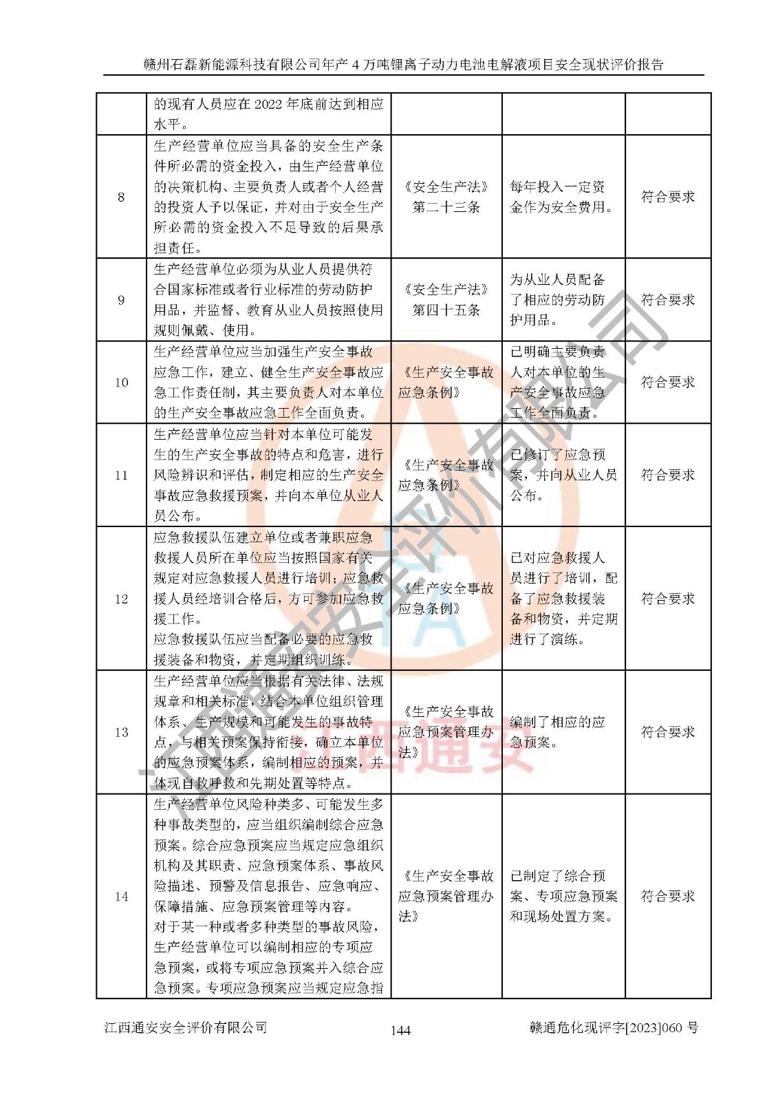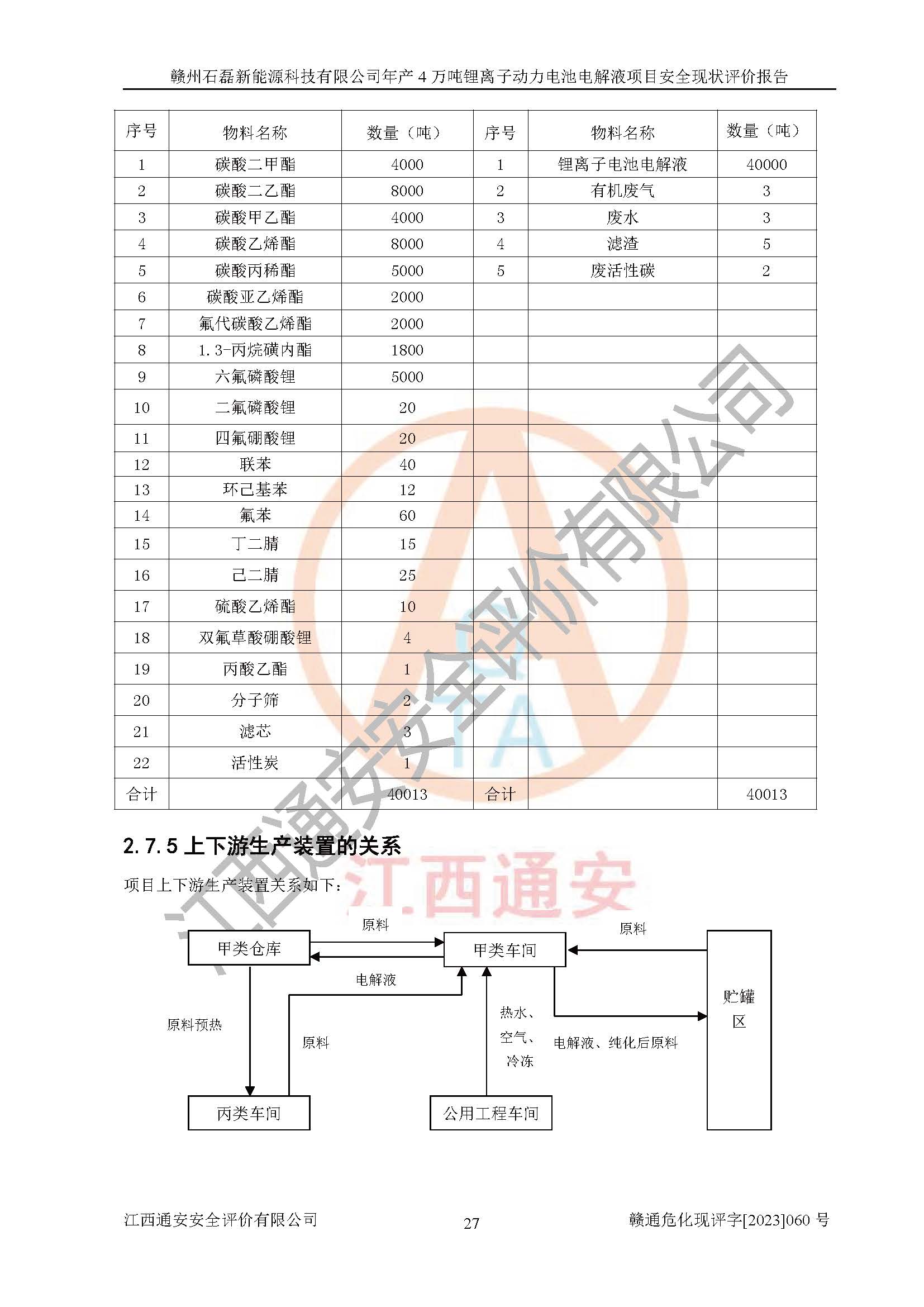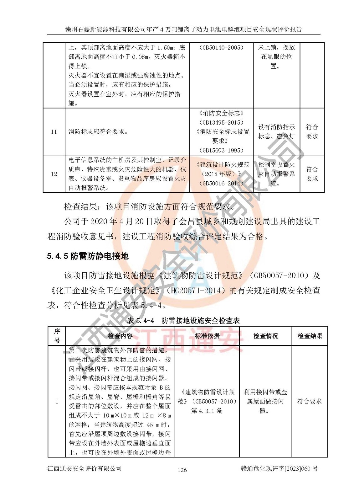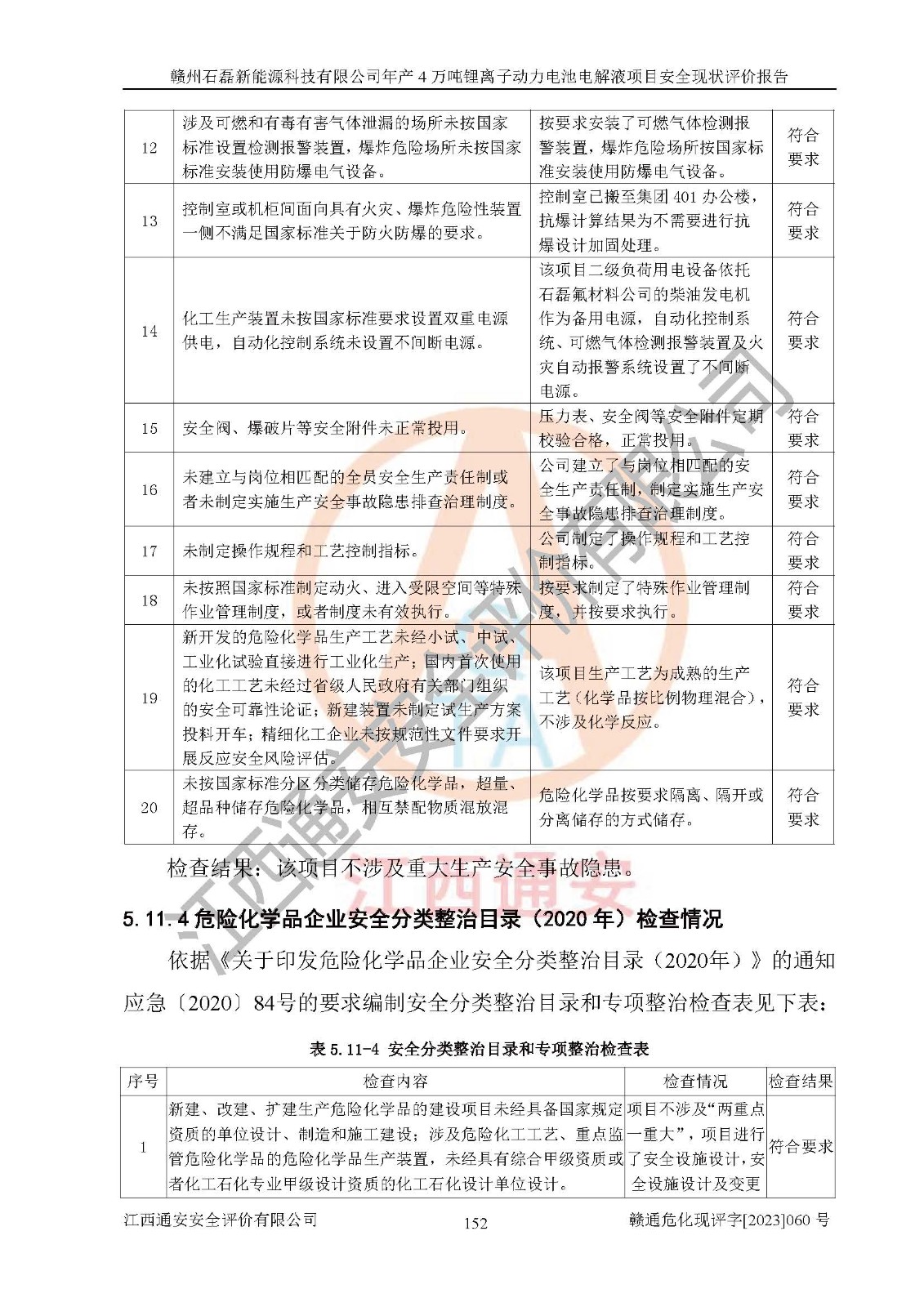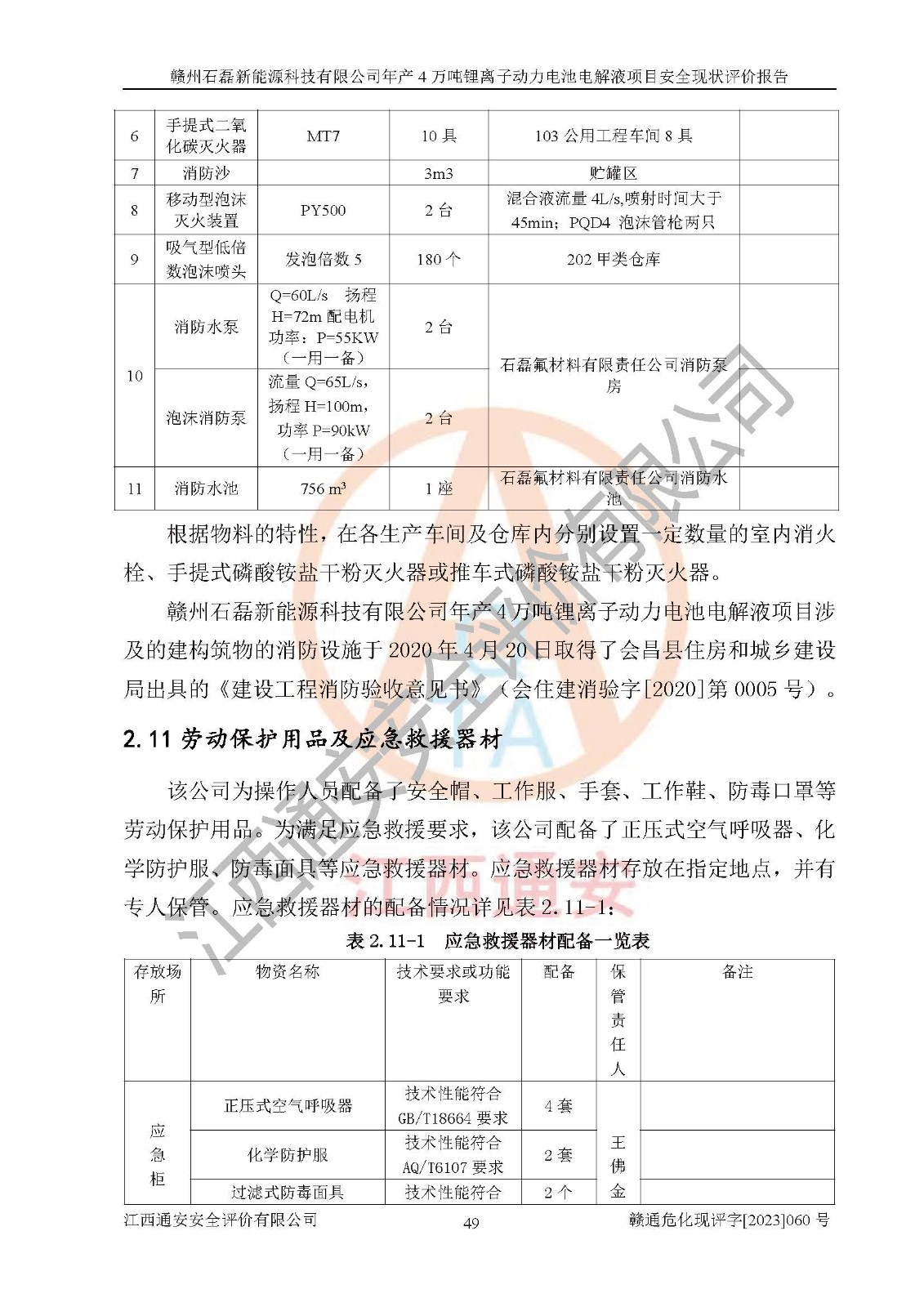 一、安全狀況綜合評(píng)述 1、該項(xiàng)目涉及的原輔材料中碳酸二乙酯、碳酸二甲酯、碳酸甲乙酯、丙酸乙酯、氟苯、丁二腈、己二腈、氮?dú)狻⒙?lián)苯及R22屬于危險(xiǎn)化學(xué)品,產(chǎn)品鋰離子電解液屬于危險(xiǎn)化學(xué)品。 2、該項(xiàng)目生產(chǎn)過(guò)程中存在的危險(xiǎn)、有害因素有:火災(zāi)與爆炸、觸電、中毒與窒息、灼燙、機(jī)械傷害、**傷害、高處墜落、物體打擊和其他傷害等危險(xiǎn)有害因素,其中*主要的危險(xiǎn)有害因素是火災(zāi)與爆炸、中毒與窒息。 3、該項(xiàng)目不涉及監(jiān)控化學(xué)品、易制毒化學(xué)品、易制爆危險(xiǎn)化學(xué)品、劇毒化學(xué)品、重點(diǎn)監(jiān)管危險(xiǎn)化學(xué)品和特別管控的危險(xiǎn)化學(xué)品。 4、該項(xiàng)目不涉及重點(diǎn)監(jiān)管的危險(xiǎn)化工工藝。 5、按照《危險(xiǎn)化學(xué)品重大危險(xiǎn)源辨識(shí)》(GB18218-2018)進(jìn)行辨識(shí),該項(xiàng)目生產(chǎn)單元和儲(chǔ)存單元均不構(gòu)成危險(xiǎn)化學(xué)品重大危險(xiǎn)源。 二、定量評(píng)價(jià)結(jié)果 1、作業(yè)條件危險(xiǎn)性評(píng)價(jià)結(jié)果:在選定的9個(gè)評(píng)價(jià)單元的作業(yè)危險(xiǎn)程度為“一般危險(xiǎn),需要注意”或以下,作業(yè)條件相對(duì)安全。 2、危險(xiǎn)度評(píng)價(jià)結(jié)果:101甲類車間、202甲類倉(cāng)庫(kù)、貯罐區(qū)的危險(xiǎn)程度均為**危險(xiǎn),甲類車間、甲類倉(cāng)庫(kù)和甲類貯罐區(qū)內(nèi)均設(shè)置了可燃?xì)怏w檢測(cè)報(bào)警裝置,并定期進(jìn)行校驗(yàn)**其正常工作。廠內(nèi)建構(gòu)筑物按設(shè)計(jì)要求設(shè)置了防雷防靜電接地裝置,并定期檢驗(yàn);爆炸危險(xiǎn)區(qū)域內(nèi)的電氣設(shè)備采用防爆電機(jī),消防設(shè)施通過(guò)了消防驗(yàn)收,車間生產(chǎn)裝置和儲(chǔ)罐采用密閉化、機(jī)械化和自動(dòng)化,設(shè)備本質(zhì)安全度高,并且應(yīng)在各作業(yè)場(chǎng)所為作業(yè)人員配置了勞動(dòng)保護(hù)用品和器具,作業(yè)人員經(jīng)過(guò)廠內(nèi)三級(jí)安全培訓(xùn),考核合格上崗。項(xiàng)目的安全設(shè)施和安全管理符合安全生產(chǎn)條件,能**降低火災(zāi)爆炸事故發(fā)生的可能性,使風(fēng)險(xiǎn)降低到可接受范圍內(nèi)。 3、個(gè)人風(fēng)險(xiǎn)和社會(huì)風(fēng)險(xiǎn)分析結(jié)果:根據(jù)個(gè)人風(fēng)險(xiǎn)分析效果圖,該項(xiàng)目不涉及高敏感防護(hù)目標(biāo)、重要防護(hù)目標(biāo)、一般防護(hù)目標(biāo)中的一類防護(hù)目標(biāo)(≤3×10-6)等值線、二類防護(hù)目標(biāo)(≤1×10-5)等值線和三類防護(hù)目標(biāo)(≤3×10-5)等值線,個(gè)人風(fēng)險(xiǎn)符合要求;根據(jù)社會(huì)風(fēng)險(xiǎn)分析效果圖可知,該項(xiàng)目社會(huì)風(fēng)險(xiǎn)在可接受范圍內(nèi)。 4、可能發(fā)生的危險(xiǎn)化學(xué)品事故的預(yù)測(cè)后果:該項(xiàng)目貯罐區(qū)和101生產(chǎn)車間災(zāi)害模式為池火,泄漏模式為容器中孔泄漏或容器整體破裂,事故預(yù)測(cè)后果*大的儲(chǔ)罐為碳酸二甲酯儲(chǔ)罐,發(fā)生事故的*大死亡半徑為9m;*大重傷半徑13m,*大輕傷半徑為19m。本項(xiàng)目液氮罐西北側(cè)設(shè)有一臺(tái)50m3液氮罐,液氮罐發(fā)生物理爆炸的*大死亡半徑為18m;*大重傷半徑32m,*大輕傷半徑為54m,多米諾半徑為25m。 5、多米諾效應(yīng)分析:該項(xiàng)目貯罐區(qū)和101車間災(zāi)害模式為池火,無(wú)多米諾半徑。液氮罐發(fā)生物理爆炸的多米諾半徑為25m,多米諾影響區(qū)局限在廠內(nèi)。201罐區(qū)有部分儲(chǔ)罐在多米諾影響區(qū)內(nèi),如液氮罐發(fā)生物理爆炸,會(huì)引發(fā)多米諾效應(yīng),導(dǎo)致罐區(qū)儲(chǔ)罐破裂,可燃液體泄漏發(fā)生池火災(zāi)的可能。因此應(yīng)重點(diǎn)關(guān)注液氮儲(chǔ)罐、201貯罐區(qū)等關(guān)鍵裝置安全設(shè)施的完整和**性,**運(yùn)行良好。 三、定性評(píng)價(jià)結(jié)果 1、依據(jù)相關(guān)法律、法規(guī)、標(biāo)準(zhǔn)等的規(guī)定,該項(xiàng)目外部安全條件、總平面布置、工藝及設(shè)備、防火防爆安全設(shè)施等符合**相關(guān)標(biāo)準(zhǔn)規(guī)范的要求,能滿足安全生產(chǎn)的要求。 2、該項(xiàng)目公用輔助設(shè)施能夠滿足安全生產(chǎn)的要求。 3、該項(xiàng)目按要求設(shè)置了安全生產(chǎn)管理機(jī)構(gòu),配備了專職安全生產(chǎn)管理人員,建立了安全生產(chǎn)責(zé)任制,制定了安全管理制度和崗位安全操作規(guī)程等。該公司修訂了生產(chǎn)安全事故應(yīng)急預(yù)案,配備了應(yīng)急救援器材,按要求定期進(jìn)行相關(guān)培訓(xùn)及演練。 4、該項(xiàng)目不涉及“兩重點(diǎn)一重大”,公司主要負(fù)責(zé)人、安全管理人員經(jīng)培訓(xùn)考核取得了相應(yīng)的安全資格證書。主要負(fù)責(zé)人的專業(yè)和學(xué)歷符合要求,公司任命了許惠彬和王佛金為專職安全管理人員,許惠彬的學(xué)歷和專業(yè)均符合要求,王佛金于2021年9月報(bào)名參加了大專應(yīng)用化工技術(shù)專業(yè)學(xué)歷提升,預(yù)計(jì)2024年1月畢業(yè),屆時(shí)可滿足危險(xiǎn)化學(xué)品企業(yè)重點(diǎn)人員安