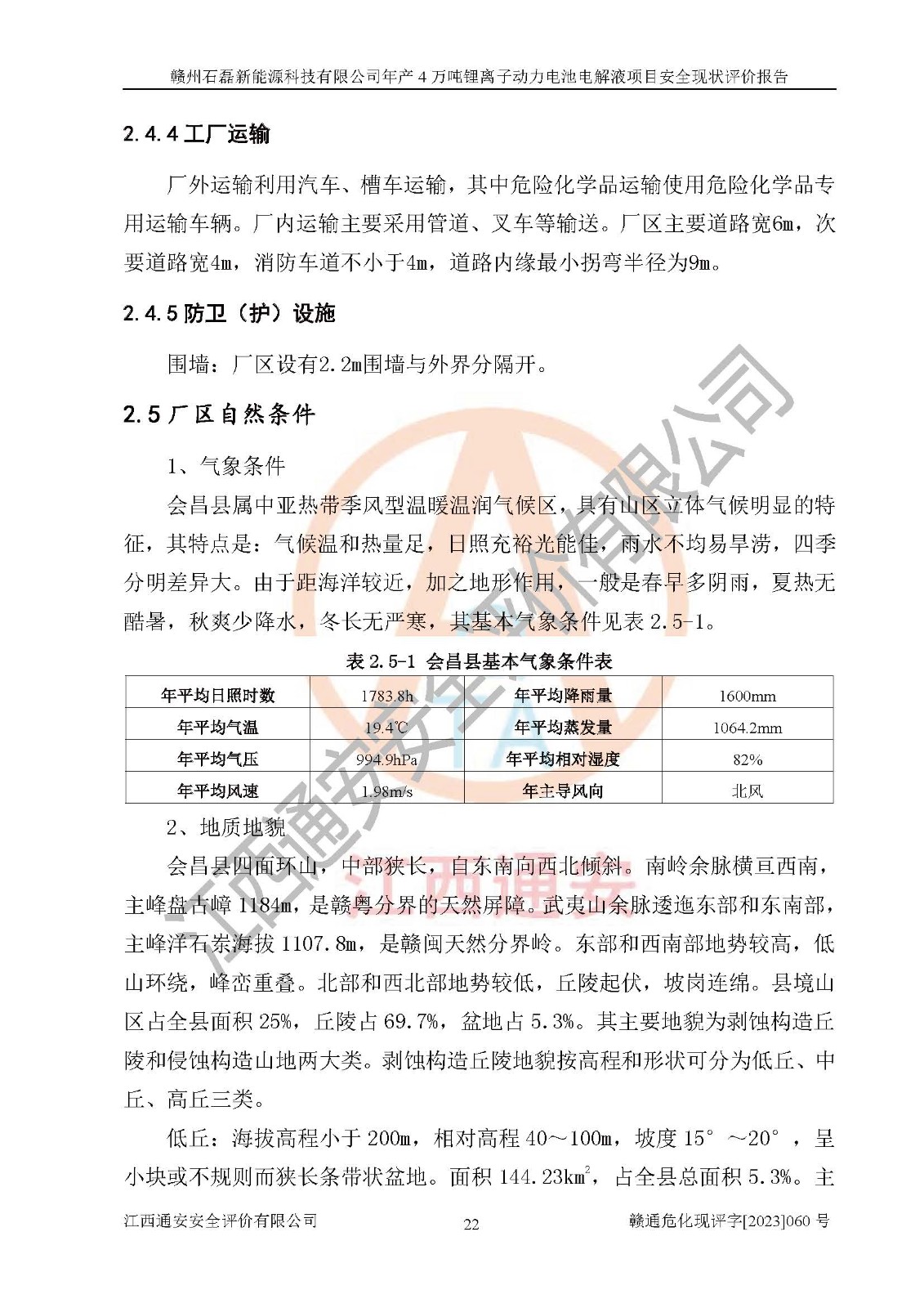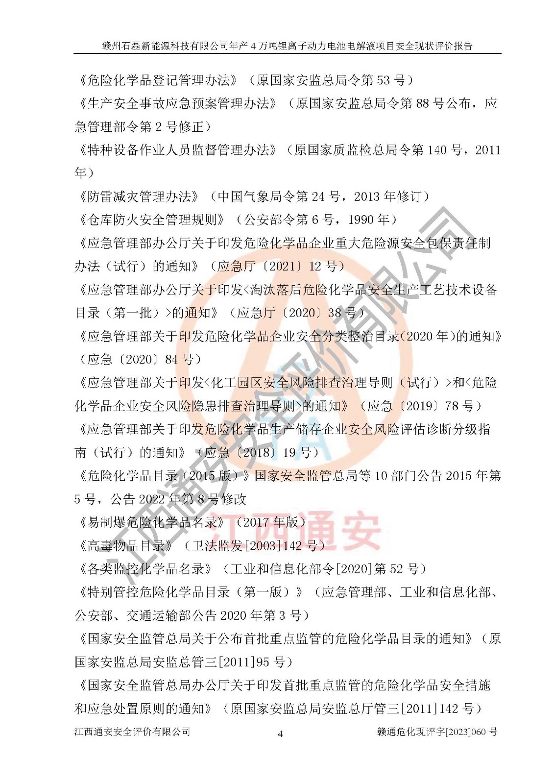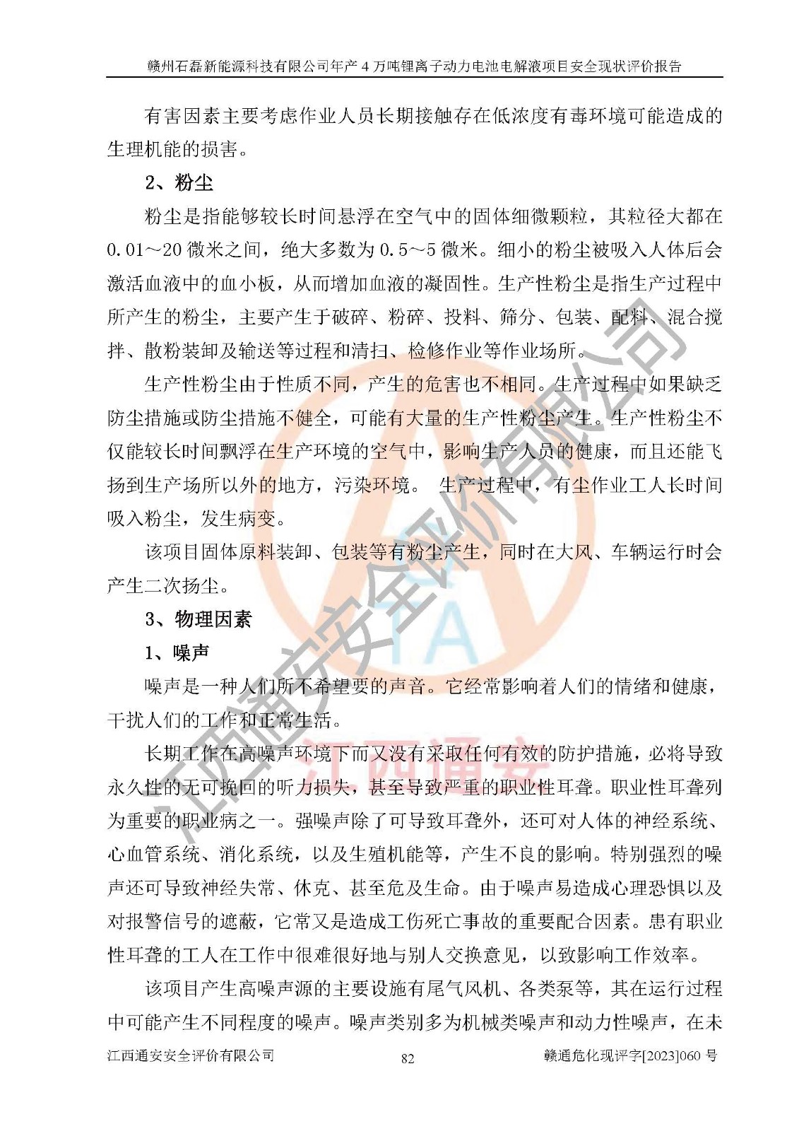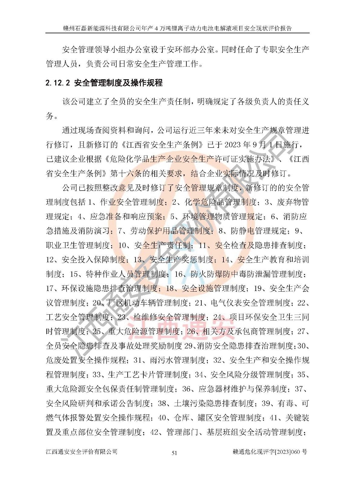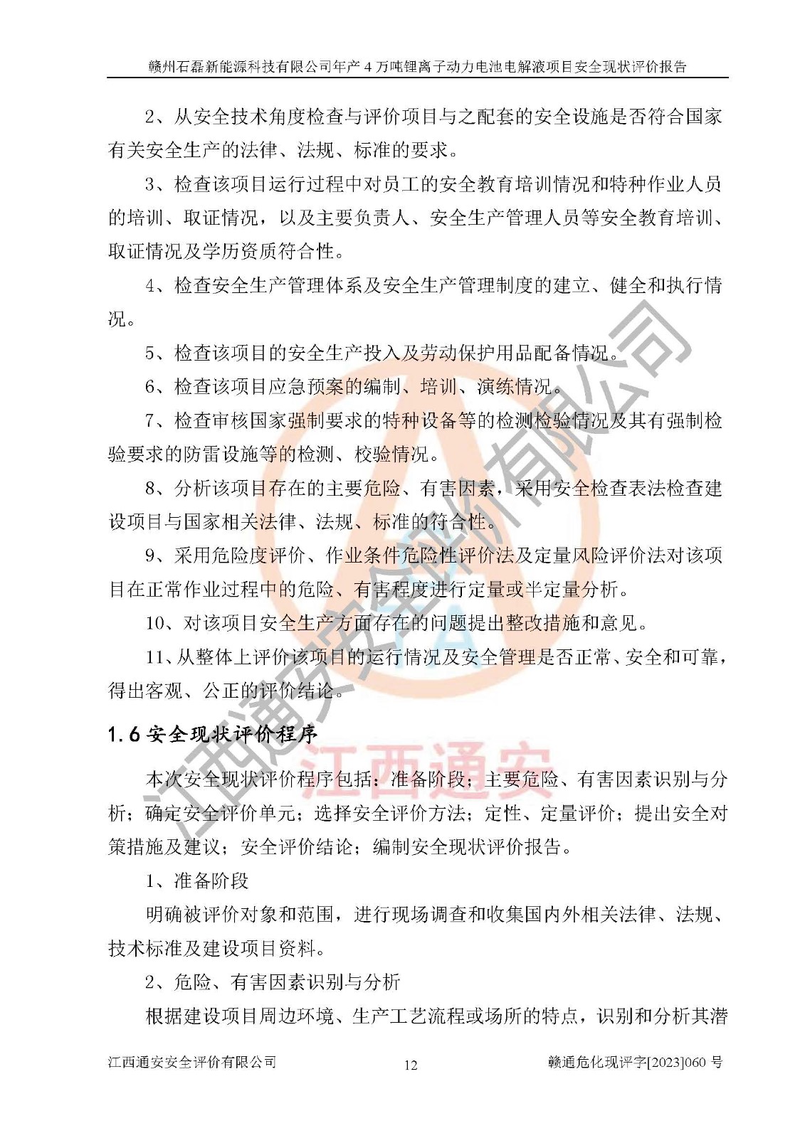 一、安全狀況綜合評(píng)述 1、該項(xiàng)目涉及的原輔材料中碳酸二乙酯、碳酸二甲酯、碳酸甲乙酯、丙酸乙酯、氟苯、丁二腈、己二腈、氮?dú)狻⒙?lián)苯及R22屬于危險(xiǎn)化學(xué)品,產(chǎn)品鋰離子電解液屬于危險(xiǎn)化學(xué)品。 2、該項(xiàng)目生產(chǎn)過(guò)程中存在的危險(xiǎn)、有害因素有:火災(zāi)與爆炸、觸電、中毒與窒息、灼燙、機(jī)械傷害、**傷害、高處墜落、物體打擊和其他傷害等危險(xiǎn)有害因素,其中*主要的危險(xiǎn)有害因素是火災(zāi)與爆炸、中毒與窒息。 3、該項(xiàng)目不涉及監(jiān)控化學(xué)品、易制毒化學(xué)品、易制爆危險(xiǎn)化學(xué)品、劇毒化學(xué)品、重點(diǎn)監(jiān)管危險(xiǎn)化學(xué)品和特別管控的危險(xiǎn)化學(xué)品。 4、該項(xiàng)目不涉及重點(diǎn)監(jiān)管的危險(xiǎn)化工工藝。 5、按照《危險(xiǎn)化學(xué)品重大危險(xiǎn)源辨識(shí)》(GB18218-2018)進(jìn)行辨識(shí),該項(xiàng)目生產(chǎn)單元和儲(chǔ)存單元均不構(gòu)成危險(xiǎn)化學(xué)品重大危險(xiǎn)源。 二、定量評(píng)價(jià)結(jié)果 1、作業(yè)條件危險(xiǎn)性評(píng)價(jià)結(jié)果:在選定的9個(gè)評(píng)價(jià)單元的作業(yè)危險(xiǎn)程度為“一般危險(xiǎn),需要注意”或以下,作業(yè)條件相對(duì)安全。 2、危險(xiǎn)度評(píng)價(jià)結(jié)果:101甲類車間、202甲類倉(cāng)庫(kù)、貯罐區(qū)的危險(xiǎn)程度均為**危險(xiǎn),甲類車間、甲類倉(cāng)庫(kù)和甲類貯罐區(qū)內(nèi)均設(shè)置了可燃?xì)怏w檢測(cè)報(bào)警裝置,并定期進(jìn)行校驗(yàn)**其正常工作。廠內(nèi)建構(gòu)筑物按設(shè)計(jì)要求設(shè)置了防雷防靜電接地裝置,并定期檢驗(yàn);爆炸危險(xiǎn)區(qū)域內(nèi)的電氣設(shè)備采用防爆電機(jī),消防設(shè)施通過(guò)了消防驗(yàn)收,車間生產(chǎn)裝置和儲(chǔ)罐采用密閉化、機(jī)械化和自動(dòng)化,設(shè)備本質(zhì)安全度高,并且應(yīng)在各作業(yè)場(chǎng)所為作業(yè)人員配置了勞動(dòng)保護(hù)用品和器具,作業(yè)人員經(jīng)過(guò)廠內(nèi)三級(jí)安全培訓(xùn),考核合格上崗。項(xiàng)目的安全設(shè)施和安全管理符合安全生產(chǎn)條件,能**降低火災(zāi)爆炸事故發(fā)生的可能性,使風(fēng)險(xiǎn)降低到可接受范圍內(nèi)。 3、個(gè)人風(fēng)險(xiǎn)和社會(huì)風(fēng)險(xiǎn)分析結(jié)果:根據(jù)個(gè)人風(fēng)險(xiǎn)分析效果圖,該項(xiàng)目不涉及高敏感防護(hù)目標(biāo)、重要防護(hù)目標(biāo)、一般防護(hù)目標(biāo)中的一類防護(hù)目標(biāo)(≤3×10-6)等值線、二類防護(hù)目標(biāo)(≤1×10-5)等值線和三類防護(hù)目標(biāo)(≤3×10-5)等值線,個(gè)人風(fēng)險(xiǎn)符合要求;根據(jù)社會(huì)風(fēng)險(xiǎn)分析效果圖可知,該項(xiàng)目社會(huì)風(fēng)險(xiǎn)在可接受范圍內(nèi)。 4、可能發(fā)生的危險(xiǎn)化學(xué)品事故的預(yù)測(cè)后果:該項(xiàng)目貯罐區(qū)和101生產(chǎn)車間災(zāi)害模式為池火,泄漏模式為容器中孔泄漏或容器整體破裂,事故預(yù)測(cè)后果*大的儲(chǔ)罐為碳酸二甲酯儲(chǔ)罐,發(fā)生事故的*大死亡半徑為9m;*大重傷半徑13m,*大輕傷半徑為19m。本項(xiàng)目液氮罐西北側(cè)設(shè)有一臺(tái)50m3液氮罐,液氮罐發(fā)生物理爆炸的*大死亡半徑為18m;*大重傷半徑32m,*大輕傷半徑為54m,多米諾半徑為25m。 5、多米諾效應(yīng)分析:該項(xiàng)目貯罐區(qū)和101車間災(zāi)害模式為池火,無(wú)多米諾半徑。液氮罐發(fā)生物理爆炸的多米諾半徑為25m,多米諾影響區(qū)局限在廠內(nèi)。201罐區(qū)有部分儲(chǔ)罐在多米諾影響區(qū)內(nèi),如液氮罐發(fā)生物理爆炸,會(huì)引發(fā)多米諾效應(yīng),導(dǎo)致罐區(qū)儲(chǔ)罐破裂,可燃液體泄漏發(fā)生池火災(zāi)的可能。因此應(yīng)重點(diǎn)關(guān)注液氮儲(chǔ)罐、201貯罐區(qū)等關(guān)鍵裝置安全設(shè)施的完整和**性,**運(yùn)行良好。 三、定性評(píng)價(jià)結(jié)果 1、依據(jù)相關(guān)法律、法規(guī)、標(biāo)準(zhǔn)等的規(guī)定,該項(xiàng)目外部安全條件、總平面布置、工藝及設(shè)備、防火防爆安全設(shè)施等符合**相關(guān)標(biāo)準(zhǔn)規(guī)范的要求,能滿足安全生產(chǎn)的要求。 2、該項(xiàng)目公用輔助設(shè)施能夠滿足安全生產(chǎn)的要求。 3、該項(xiàng)目按要求設(shè)置了安全生產(chǎn)管理機(jī)構(gòu),配備了專職安全生產(chǎn)管理人員,建立了安全生產(chǎn)責(zé)任制,制定了安全管理制度和崗位安全操作規(guī)程等。該公司修訂了生產(chǎn)安全事故應(yīng)急預(yù)案,配備了應(yīng)急救援器材,按要求定期進(jìn)行相關(guān)培訓(xùn)及演練。 4、該項(xiàng)目不涉及“兩重點(diǎn)一重大”,公司主要負(fù)責(zé)人、安全管理人員經(jīng)培訓(xùn)考核取得了相應(yīng)的安全資格證書。主要負(fù)責(zé)人的專業(yè)和學(xué)歷符合要求,公司任命了許惠彬和王佛金為專職安全管理人員,許惠彬的學(xué)歷和專業(yè)均符合要求,王佛金于2021年9月報(bào)名參加了大專應(yīng)用化工技術(shù)專業(yè)學(xué)歷提升,預(yù)計(jì)2024年1月畢業(yè),屆時(shí)可滿足危險(xiǎn)化學(xué)品企業(yè)重點(diǎn)人員安