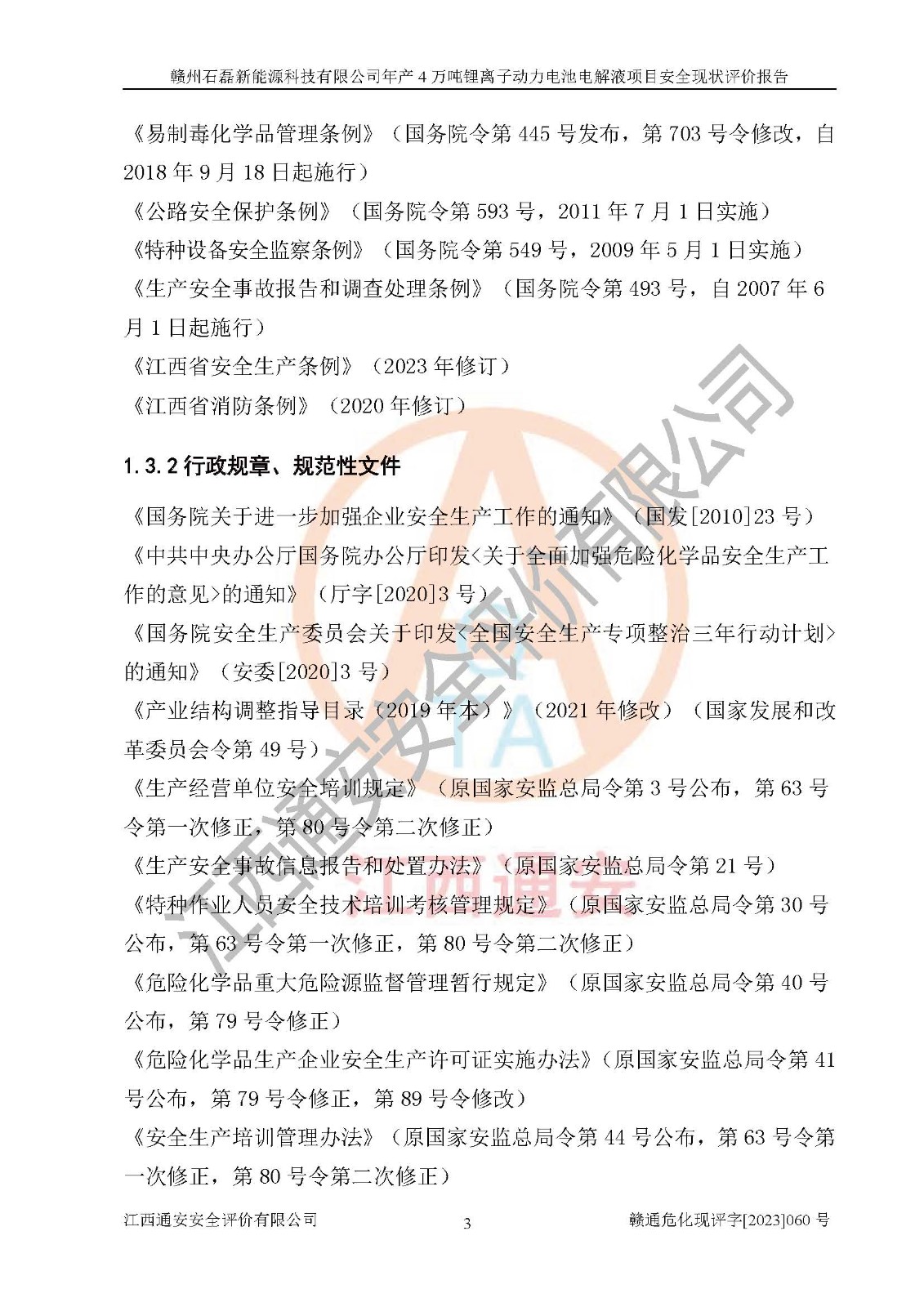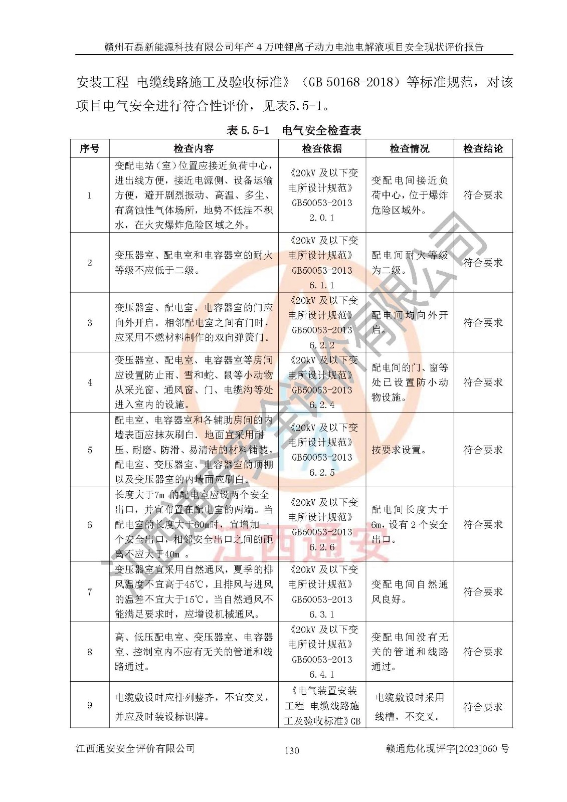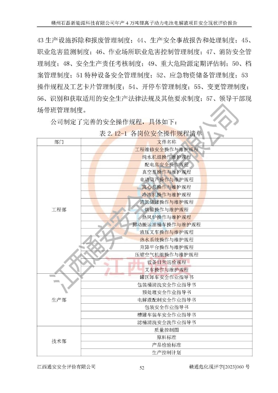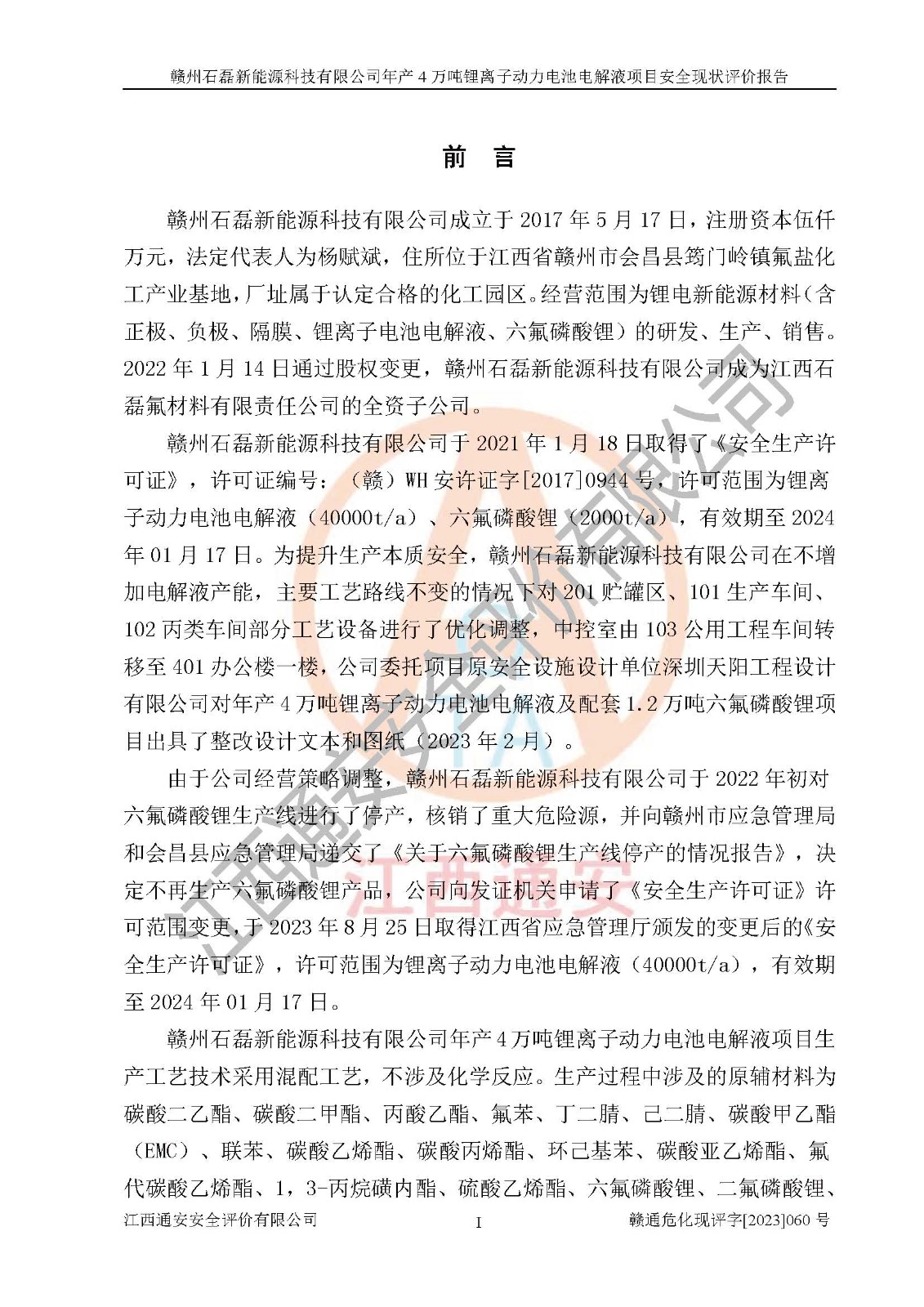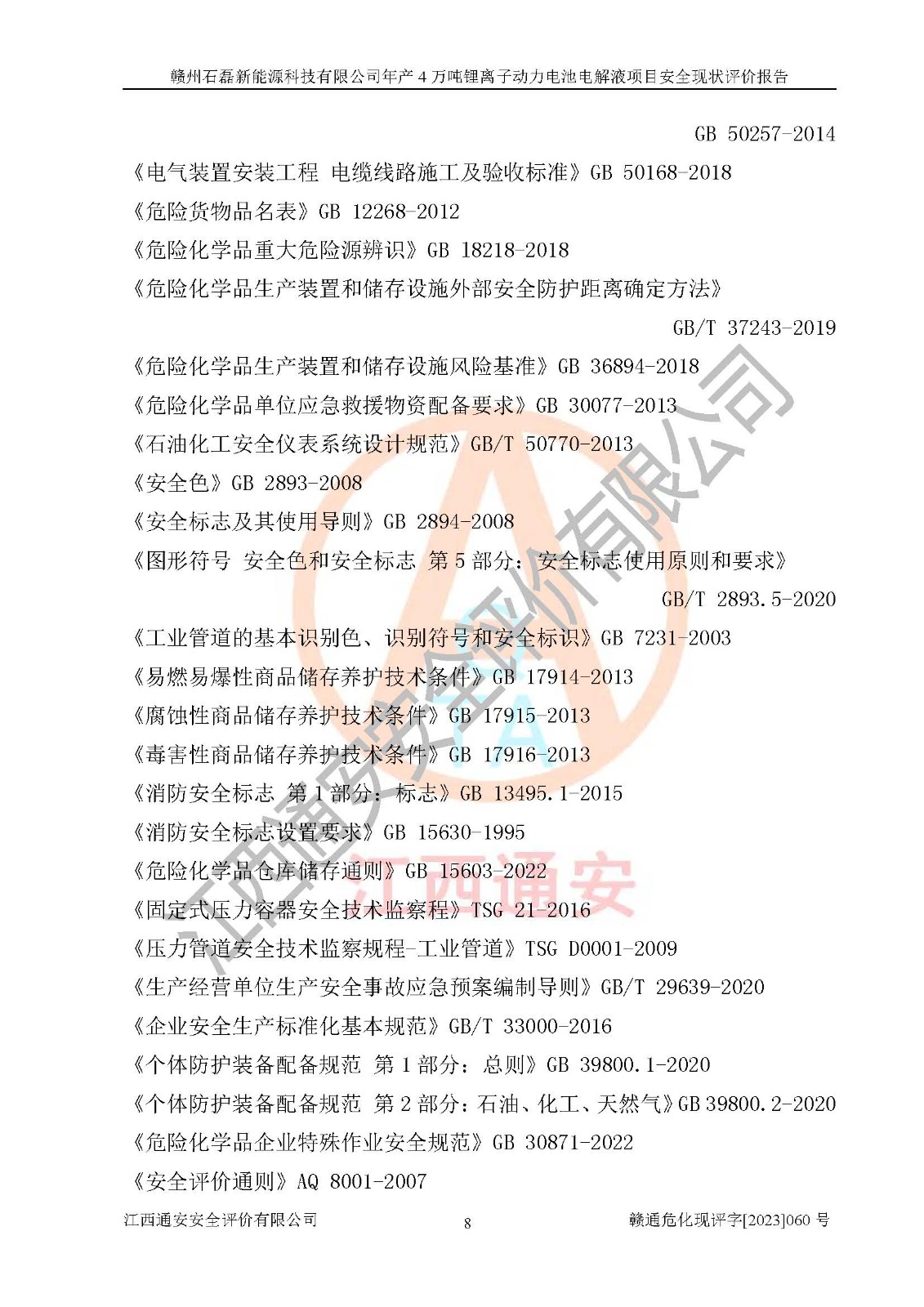 一、安全狀況綜合評(píng)述 1、該項(xiàng)目涉及的原輔材料中碳酸二乙酯、碳酸二甲酯、碳酸甲乙酯、丙酸乙酯、氟苯、丁二腈、己二腈、氮?dú)狻⒙?lián)苯及R22屬于危險(xiǎn)化學(xué)品,產(chǎn)品鋰離子電解液屬于危險(xiǎn)化學(xué)品。 2、該項(xiàng)目生產(chǎn)過(guò)程中存在的危險(xiǎn)、有害因素有:火災(zāi)與爆炸、觸電、中毒與窒息、灼燙、機(jī)械傷害、**傷害、高處墜落、物體打擊和其他傷害等危險(xiǎn)有害因素,其中*主要的危險(xiǎn)有害因素是火災(zāi)與爆炸、中毒與窒息。 3、該項(xiàng)目不涉及監(jiān)控化學(xué)品、易制毒化學(xué)品、易制爆危險(xiǎn)化學(xué)品、劇毒化學(xué)品、重點(diǎn)監(jiān)管危險(xiǎn)化學(xué)品和特別管控的危險(xiǎn)化學(xué)品。 4、該項(xiàng)目不涉及重點(diǎn)監(jiān)管的危險(xiǎn)化工工藝。 5、按照《危險(xiǎn)化學(xué)品重大危險(xiǎn)源辨識(shí)》(GB18218-2018)進(jìn)行辨識(shí),該項(xiàng)目生產(chǎn)單元和儲(chǔ)存單元均不構(gòu)成危險(xiǎn)化學(xué)品重大危險(xiǎn)源。 二、定量評(píng)價(jià)結(jié)果 1、作業(yè)條件危險(xiǎn)性評(píng)價(jià)結(jié)果:在選定的9個(gè)評(píng)價(jià)單元的作業(yè)危險(xiǎn)程度為“一般危險(xiǎn),需要注意”或以下,作業(yè)條件相對(duì)安全。 2、危險(xiǎn)度評(píng)價(jià)結(jié)果:101甲類車間、202甲類倉(cāng)庫(kù)、貯罐區(qū)的危險(xiǎn)程度均為**危險(xiǎn),甲類車間、甲類倉(cāng)庫(kù)和甲類貯罐區(qū)內(nèi)均設(shè)置了可燃?xì)怏w檢測(cè)報(bào)警裝置,并定期進(jìn)行校驗(yàn)**其正常工作。廠內(nèi)建構(gòu)筑物按設(shè)計(jì)要求設(shè)置了防雷防靜電接地裝置,并定期檢驗(yàn);爆炸危險(xiǎn)區(qū)域內(nèi)的電氣設(shè)備采用防爆電機(jī),消防設(shè)施通過(guò)了消防驗(yàn)收,車間生產(chǎn)裝置和儲(chǔ)罐采用密閉化、機(jī)械化和自動(dòng)化,設(shè)備本質(zhì)安全度高,并且應(yīng)在各作業(yè)場(chǎng)所為作業(yè)人員配置了勞動(dòng)保護(hù)用品和器具,作業(yè)人員經(jīng)過(guò)廠內(nèi)三級(jí)安全培訓(xùn),考核合格上崗。項(xiàng)目的安全設(shè)施和安全管理符合安全生產(chǎn)條件,能**降低火災(zāi)爆炸事故發(fā)生的可能性,使風(fēng)險(xiǎn)降低到可接受范圍內(nèi)。 3、個(gè)人風(fēng)險(xiǎn)和社會(huì)風(fēng)險(xiǎn)分析結(jié)果:根據(jù)個(gè)人風(fēng)險(xiǎn)分析效果圖,該項(xiàng)目不涉及高敏感防護(hù)目標(biāo)、重要防護(hù)目標(biāo)、一般防護(hù)目標(biāo)中的一類防護(hù)目標(biāo)(≤3×10-6)等值線、二類防護(hù)目標(biāo)(≤1×10-5)等值線和三類防護(hù)目標(biāo)(≤3×10-5)等值線,個(gè)人風(fēng)險(xiǎn)符合要求;根據(jù)社會(huì)風(fēng)險(xiǎn)分析效果圖可知,該項(xiàng)目社會(huì)風(fēng)險(xiǎn)在可接受范圍內(nèi)。 4、可能發(fā)生的危險(xiǎn)化學(xué)品事故的預(yù)測(cè)后果:該項(xiàng)目貯罐區(qū)和101生產(chǎn)車間災(zāi)害模式為池火,泄漏模式為容器中孔泄漏或容器整體破裂,事故預(yù)測(cè)后果*大的儲(chǔ)罐為碳酸二甲酯儲(chǔ)罐,發(fā)生事故的*大死亡半徑為9m;*大重傷半徑13m,*大輕傷半徑為19m。本項(xiàng)目液氮罐西北側(cè)設(shè)有一臺(tái)50m3液氮罐,液氮罐發(fā)生物理爆炸的*大死亡半徑為18m;*大重傷半徑32m,*大輕傷半徑為54m,多米諾半徑為25m。 5、多米諾效應(yīng)分析:該項(xiàng)目貯罐區(qū)和101車間災(zāi)害模式為池火,無(wú)多米諾半徑。液氮罐發(fā)生物理爆炸的多米諾半徑為25m,多米諾影響區(qū)局限在廠內(nèi)。201罐區(qū)有部分儲(chǔ)罐在多米諾影響區(qū)內(nèi),如液氮罐發(fā)生物理爆炸,會(huì)引發(fā)多米諾效應(yīng),導(dǎo)致罐區(qū)儲(chǔ)罐破裂,可燃液體泄漏發(fā)生池火災(zāi)的可能。因此應(yīng)重點(diǎn)關(guān)注液氮儲(chǔ)罐、201貯罐區(qū)等關(guān)鍵裝置安全設(shè)施的完整和**性,**運(yùn)行良好。 三、定性評(píng)價(jià)結(jié)果 1、依據(jù)相關(guān)法律、法規(guī)、標(biāo)準(zhǔn)等的規(guī)定,該項(xiàng)目外部安全條件、總平面布置、工藝及設(shè)備、防火防爆安全設(shè)施等符合**相關(guān)標(biāo)準(zhǔn)規(guī)范的要求,能滿足安全生產(chǎn)的要求。 2、該項(xiàng)目公用輔助設(shè)施能夠滿足安全生產(chǎn)的要求。 3、該項(xiàng)目按要求設(shè)置了安全生產(chǎn)管理機(jī)構(gòu),配備了專職安全生產(chǎn)管理人員,建立了安全生產(chǎn)責(zé)任制,制定了安全管理制度和崗位安全操作規(guī)程等。該公司修訂了生產(chǎn)安全事故應(yīng)急預(yù)案,配備了應(yīng)急救援器材,按要求定期進(jìn)行相關(guān)培訓(xùn)及演練。 4、該項(xiàng)目不涉及“兩重點(diǎn)一重大”,公司主要負(fù)責(zé)人、安全管理人員經(jīng)培訓(xùn)考核取得了相應(yīng)的安全資格證書。主要負(fù)責(zé)人的專業(yè)和學(xué)歷符合要求,公司任命了許惠彬和王佛金為專職安全管理人員,許惠彬的學(xué)歷和專業(yè)均符合要求,王佛金于2021年9月報(bào)名參加了大專應(yīng)用化工技術(shù)專業(yè)學(xué)歷提升,預(yù)計(jì)2024年1月畢業(yè),屆時(shí)可滿足危險(xiǎn)化學(xué)品企業(yè)重點(diǎn)人員安