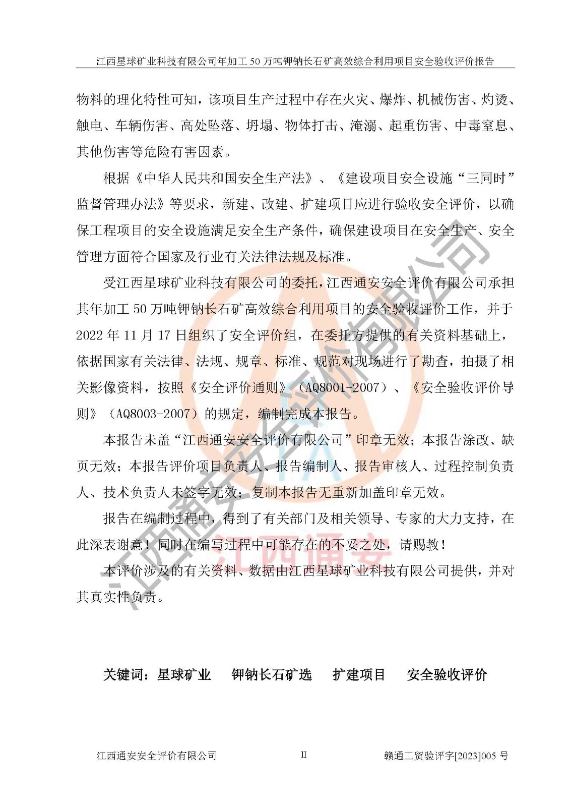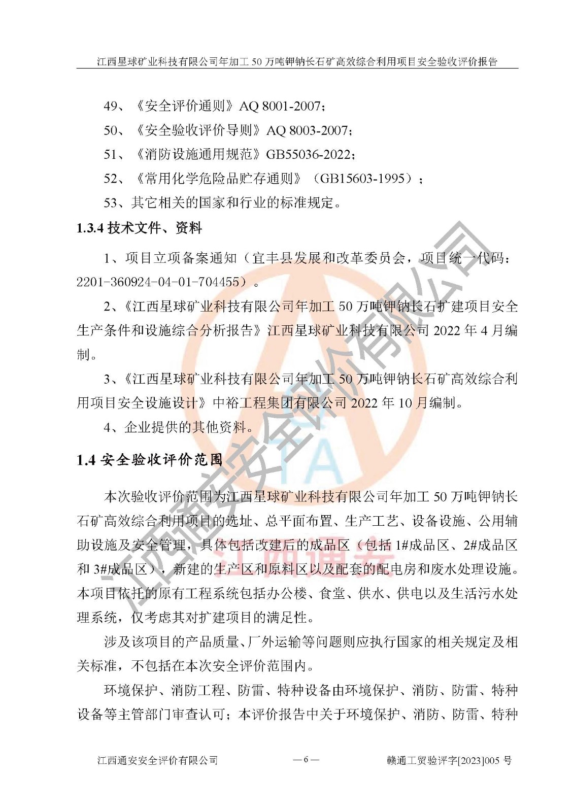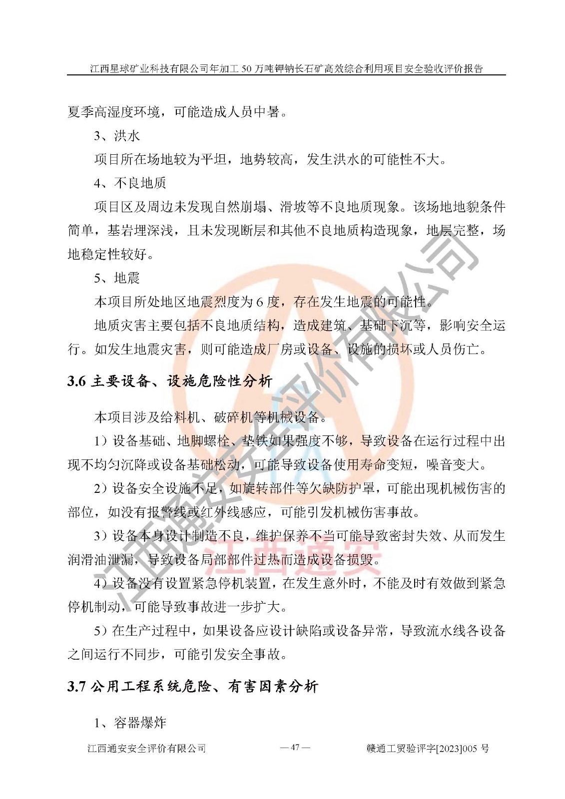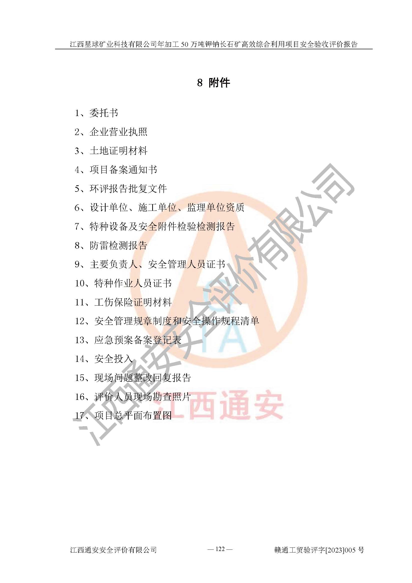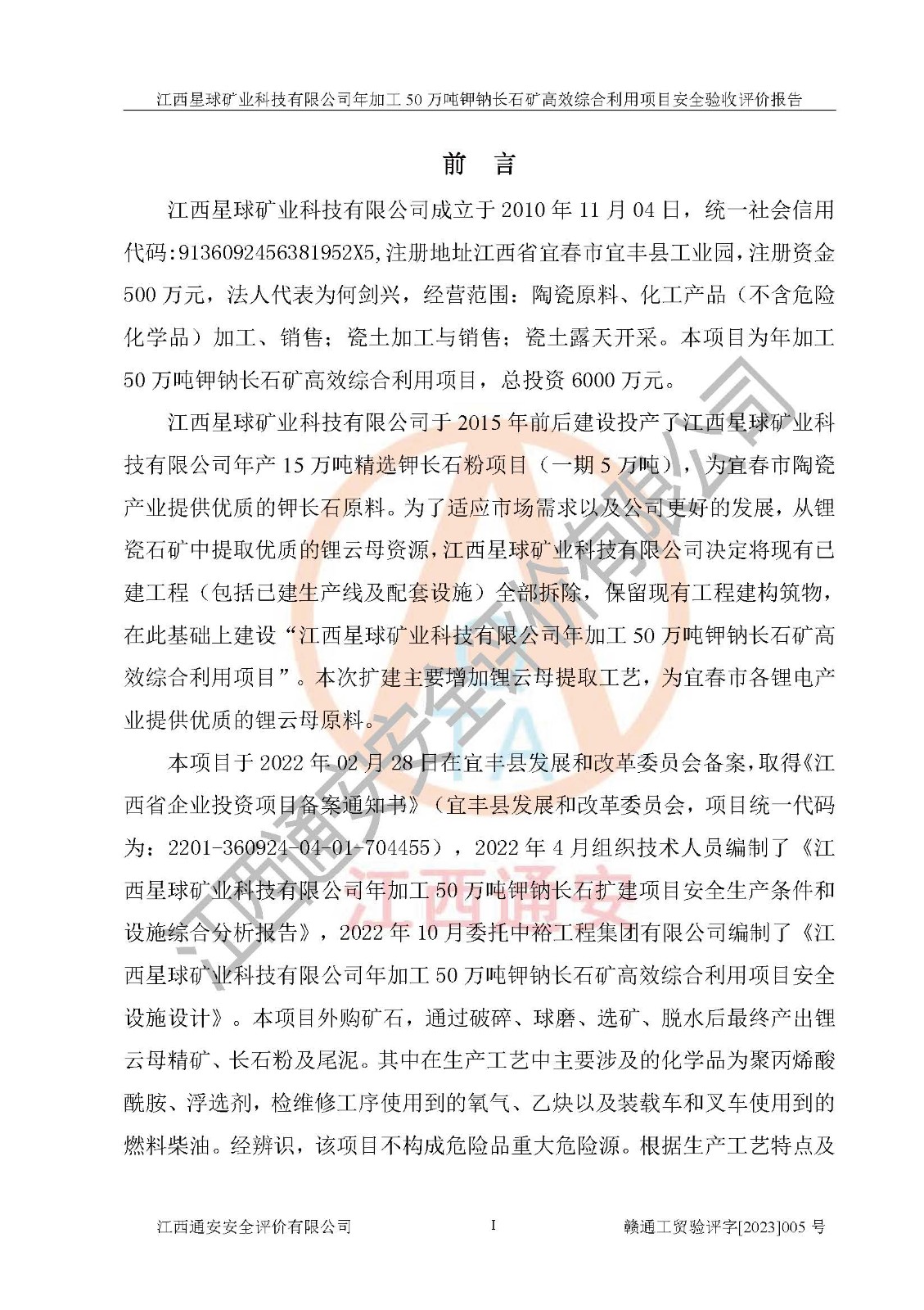 項(xiàng)目簡介 | 本報(bào)告為江西星球礦業(yè)科技有限公司年加工50萬噸鉀鈉長石礦**綜合利用項(xiàng)目安全驗(yàn)收評(píng)價(jià)報(bào)告。江西星球礦業(yè)科技有限公司成立于2010年11月04日,統(tǒng)一社會(huì)信用代碼:9136092456381952X5,注冊(cè)地址江西省宜春市宜豐縣工業(yè)園,注冊(cè)資金500萬元,法人**為何劍興,經(jīng)營范圍:陶瓷原料、化工產(chǎn)品(不含危險(xiǎn)化學(xué)品)加工、銷售;瓷土加工與銷售;瓷土露天開采。本項(xiàng)目為年加工50萬噸鉀鈉長石礦**綜合利用項(xiàng)目,總投資6000萬元。 江西星球礦業(yè)科技有限公司于2015年前后建設(shè)投產(chǎn)了江西星球礦業(yè)科技有限公司年產(chǎn)15萬噸精選鉀長石粉項(xiàng)目(一期5萬噸),為宜春市陶瓷產(chǎn)業(yè)提供優(yōu)質(zhì)的鉀長石原料。為了適應(yīng)市場(chǎng)需求以及公司更好的發(fā)展,從鋰瓷石礦中提取優(yōu)質(zhì)的鋰云母資源,江西星球礦業(yè)科技有限公司決定將現(xiàn)有已建工程(包括已建生產(chǎn)線及配套設(shè)施)**拆除,保留現(xiàn)有工程建構(gòu)筑物,在此基礎(chǔ)上建設(shè)“江西星球礦業(yè)科技有限公司年加工50萬噸鉀鈉長石礦**綜合利用項(xiàng)目”。本次擴(kuò)建主要增加鋰云母提取工藝,為宜春市各鋰電產(chǎn)業(yè)提供優(yōu)質(zhì)的鋰云母原料。 本項(xiàng)目于2022年02月28日在宜豐縣發(fā)展和改革委員會(huì)備案,取得《江西省企業(yè)投資項(xiàng)目備案通知書》(宜豐縣發(fā)展和改革委員會(huì),項(xiàng)目統(tǒng)一代碼為:2201-360924-04-01-704455),2022年4月組織技術(shù)人員編制了《江西星球礦業(yè)科技有限公司年加工50萬噸鉀鈉長石擴(kuò)建項(xiàng)目安全生產(chǎn)條件和設(shè)施綜合分析報(bào)告》,2022年10月委托中裕工程集團(tuán)有限公司編制了《江西星球礦業(yè)科技有限公司年加工50萬噸鉀鈉長石礦**綜合利用項(xiàng)目安全設(shè)施設(shè)計(jì)》。本項(xiàng)目外購礦石,通過破碎、球磨、選礦、脫水后*終產(chǎn)出鋰云母精礦、長石粉及尾泥。其中在生產(chǎn)工藝中主要涉及的化學(xué)品為聚丙烯酸酰胺、浮選劑,檢維修工序使用到的氧氣、乙炔以及裝載車和叉車使用到的燃料柴油。經(jīng)辨識(shí),該項(xiàng)目不構(gòu)成危險(xiǎn)品重大危險(xiǎn)源。根據(jù)生產(chǎn)工藝特點(diǎn)及物料的理化特性可知,該項(xiàng)目生產(chǎn)過程中存在火災(zāi)、爆炸、機(jī)械傷害、灼燙、觸電、**傷害、高處墜落、坍塌、物體打擊、淹溺、起重傷害、中毒窒息、其他傷害等危險(xiǎn)有害因素。