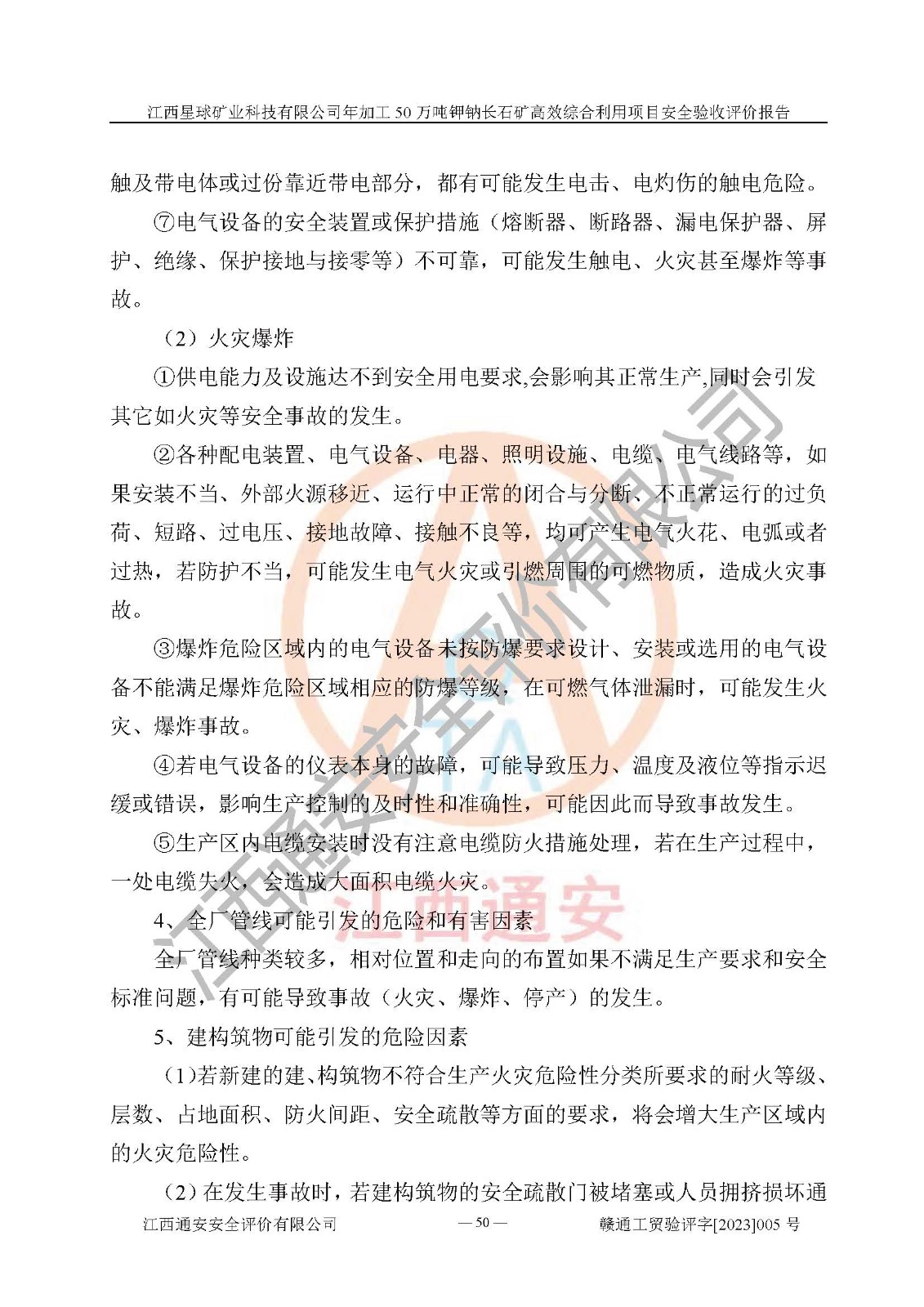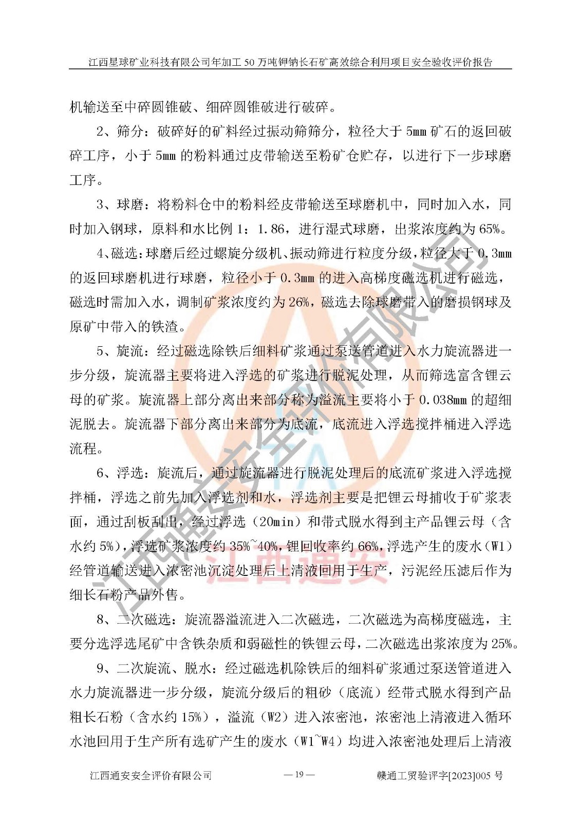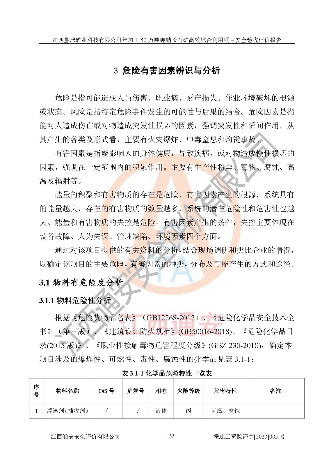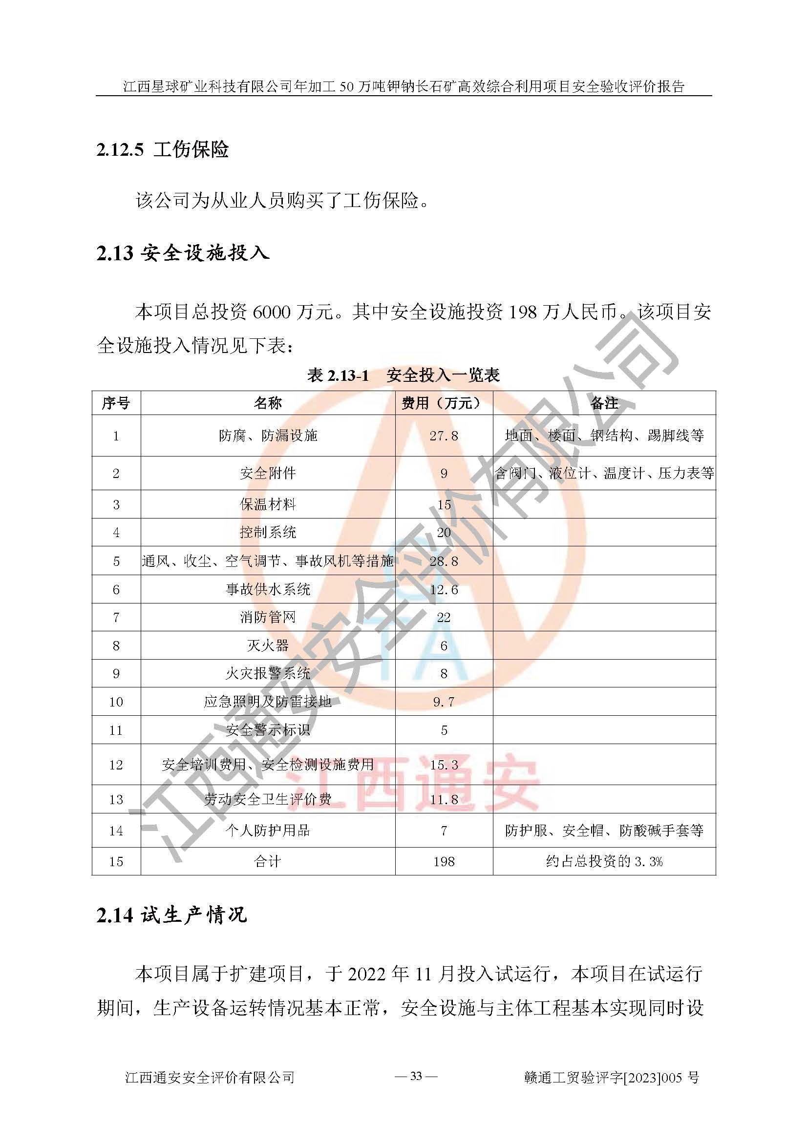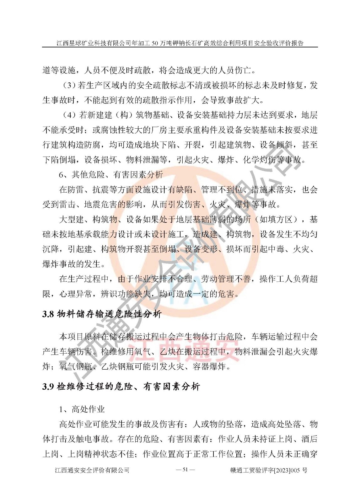 項(xiàng)目簡介 | 本報(bào)告為江西星球礦業(yè)科技有限公司年加工50萬噸鉀鈉長石礦**綜合利用項(xiàng)目安全驗(yàn)收評(píng)價(jià)報(bào)告。江西星球礦業(yè)科技有限公司成立于2010年11月04日,統(tǒng)一社會(huì)信用代碼:9136092456381952X5,注冊(cè)地址江西省宜春市宜豐縣工業(yè)園,注冊(cè)資金500萬元,法人**為何劍興,經(jīng)營范圍:陶瓷原料、化工產(chǎn)品(不含危險(xiǎn)化學(xué)品)加工、銷售;瓷土加工與銷售;瓷土露天開采。本項(xiàng)目為年加工50萬噸鉀鈉長石礦**綜合利用項(xiàng)目,總投資6000萬元。 江西星球礦業(yè)科技有限公司于2015年前后建設(shè)投產(chǎn)了江西星球礦業(yè)科技有限公司年產(chǎn)15萬噸精選鉀長石粉項(xiàng)目(一期5萬噸),為宜春市陶瓷產(chǎn)業(yè)提供優(yōu)質(zhì)的鉀長石原料。為了適應(yīng)市場(chǎng)需求以及公司更好的發(fā)展,從鋰瓷石礦中提取優(yōu)質(zhì)的鋰云母資源,江西星球礦業(yè)科技有限公司決定將現(xiàn)有已建工程(包括已建生產(chǎn)線及配套設(shè)施)**拆除,保留現(xiàn)有工程建構(gòu)筑物,在此基礎(chǔ)上建設(shè)“江西星球礦業(yè)科技有限公司年加工50萬噸鉀鈉長石礦**綜合利用項(xiàng)目”。本次擴(kuò)建主要增加鋰云母提取工藝,為宜春市各鋰電產(chǎn)業(yè)提供優(yōu)質(zhì)的鋰云母原料。 本項(xiàng)目于2022年02月28日在宜豐縣發(fā)展和改革委員會(huì)備案,取得《江西省企業(yè)投資項(xiàng)目備案通知書》(宜豐縣發(fā)展和改革委員會(huì),項(xiàng)目統(tǒng)一代碼為:2201-360924-04-01-704455),2022年4月組織技術(shù)人員編制了《江西星球礦業(yè)科技有限公司年加工50萬噸鉀鈉長石擴(kuò)建項(xiàng)目安全生產(chǎn)條件和設(shè)施綜合分析報(bào)告》,2022年10月委托中裕工程集團(tuán)有限公司編制了《江西星球礦業(yè)科技有限公司年加工50萬噸鉀鈉長石礦**綜合利用項(xiàng)目安全設(shè)施設(shè)計(jì)》。本項(xiàng)目外購礦石,通過破碎、球磨、選礦、脫水后*終產(chǎn)出鋰云母精礦、長石粉及尾泥。其中在生產(chǎn)工藝中主要涉及的化學(xué)品為聚丙烯酸酰胺、浮選劑,檢維修工序使用到的氧氣、乙炔以及裝載車和叉車使用到的燃料柴油。經(jīng)辨識(shí),該項(xiàng)目不構(gòu)成危險(xiǎn)品重大危險(xiǎn)源。根據(jù)生產(chǎn)工藝特點(diǎn)及物料的理化特性可知,該項(xiàng)目生產(chǎn)過程中存在火災(zāi)、爆炸、機(jī)械傷害、灼燙、觸電、**傷害、高處墜落、坍塌、物體打擊、淹溺、起重傷害、中毒窒息、其他傷害等危險(xiǎn)有害因素。